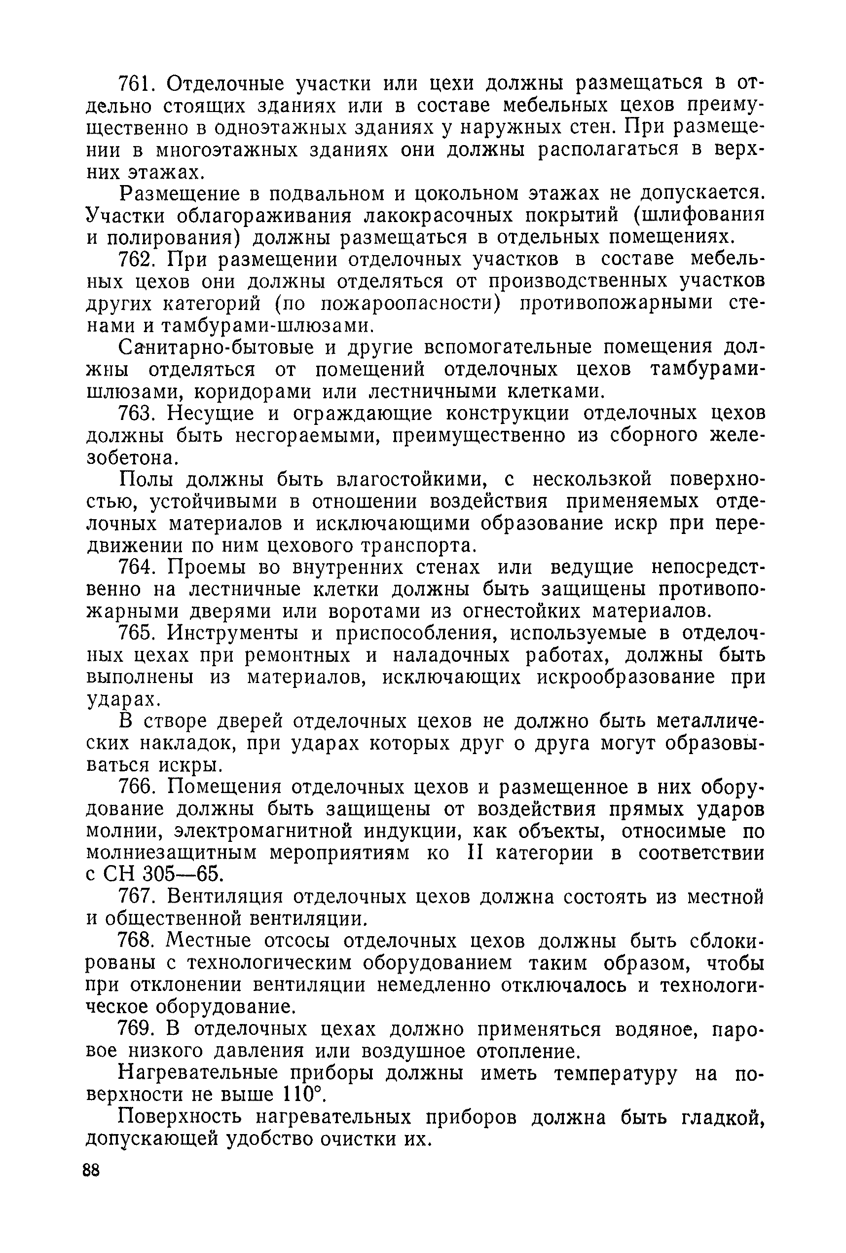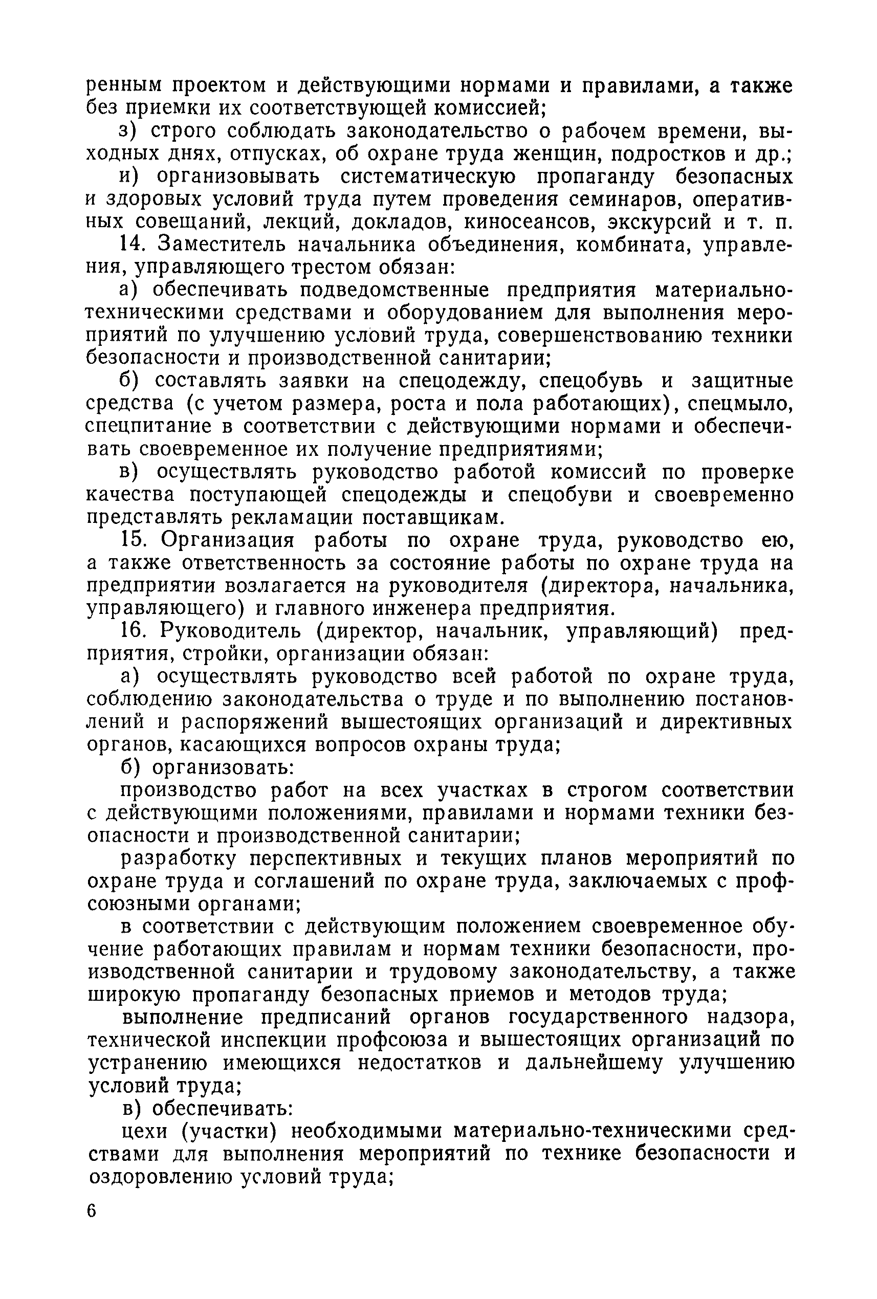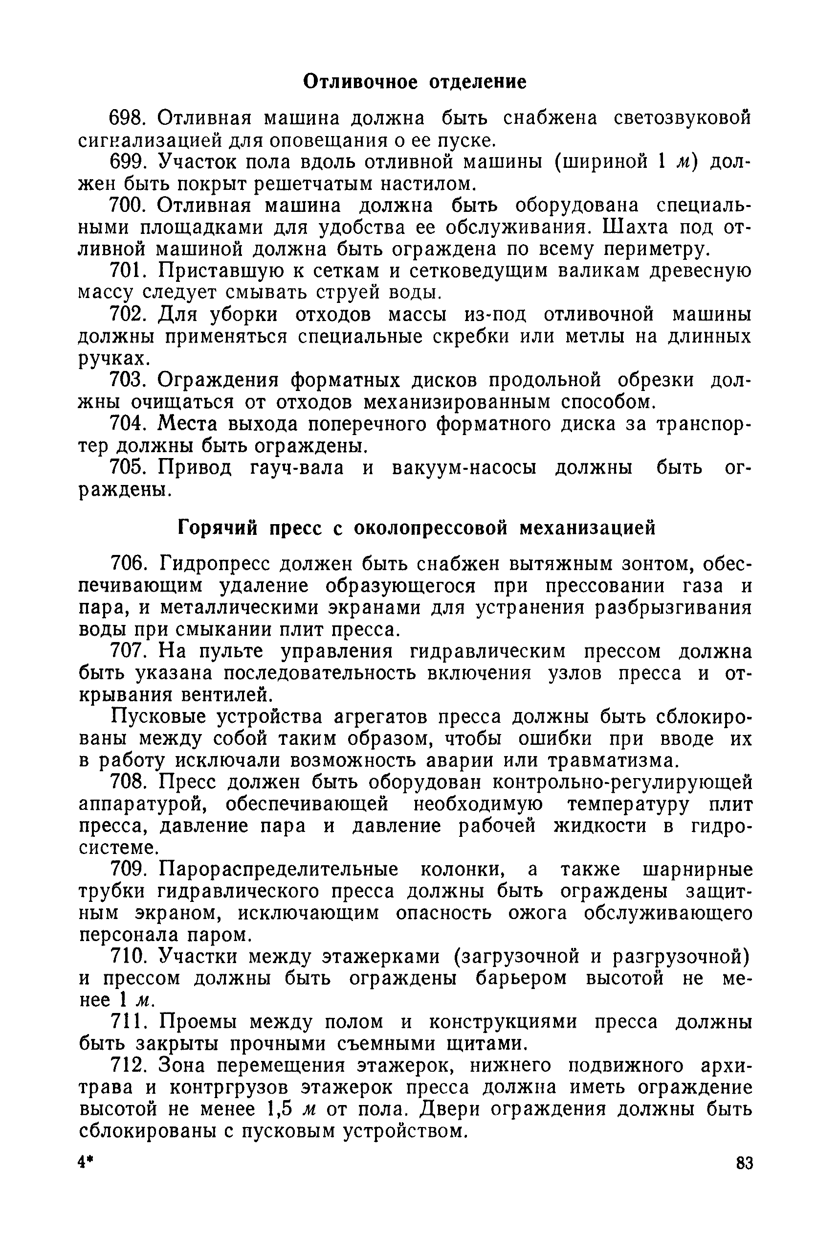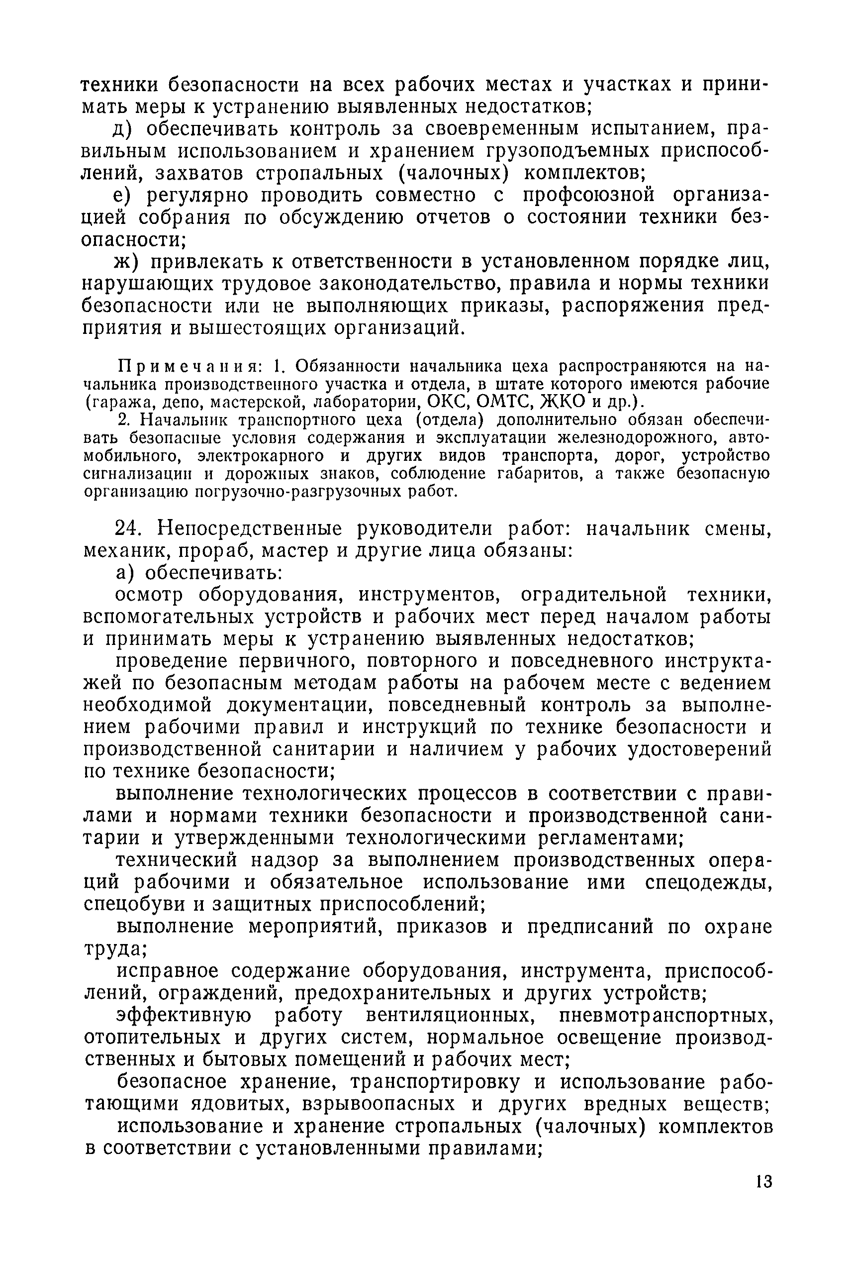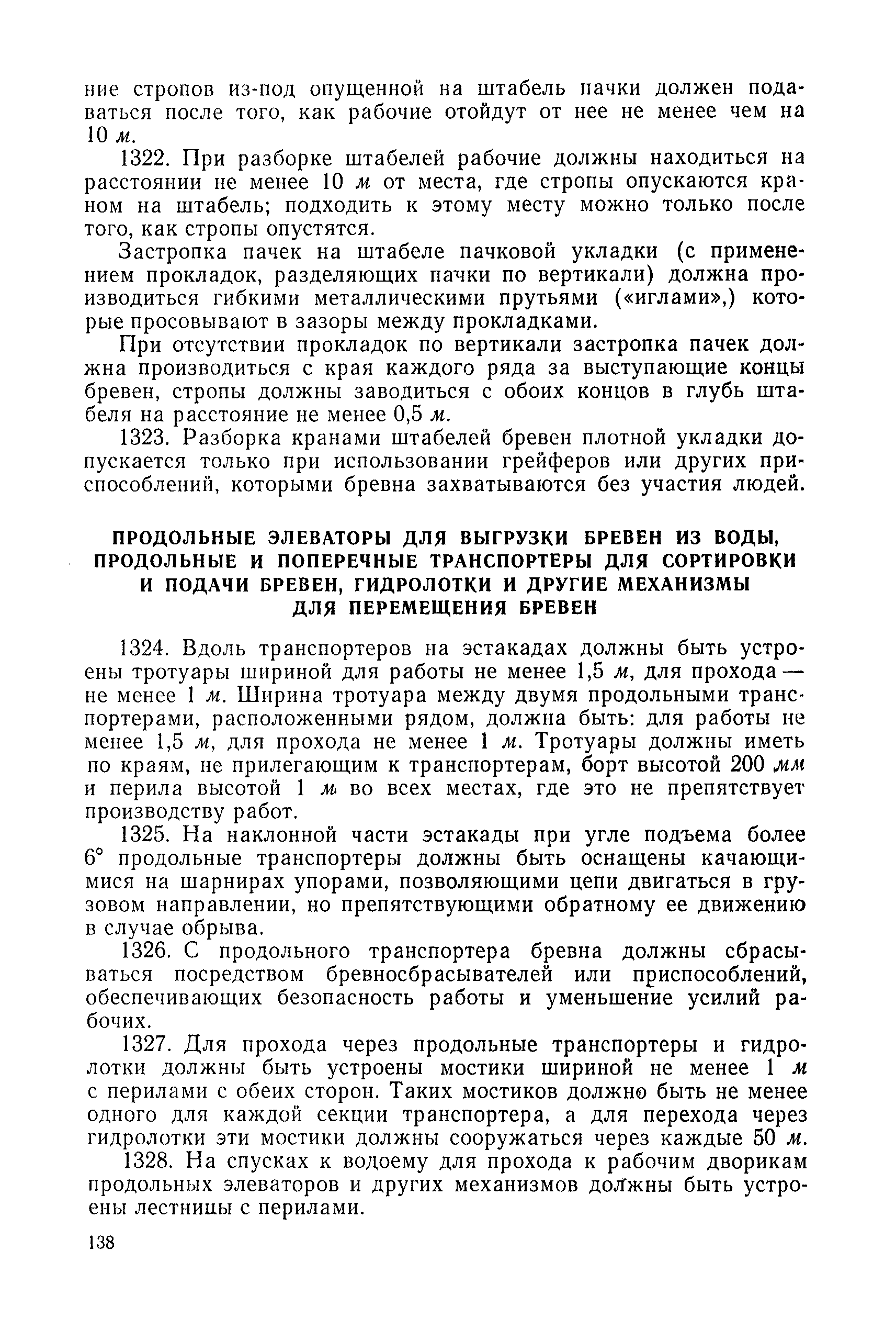 | Оглавление: | I. Общие положения II. Обязанности и ответственность административно-технического персонала III. Обучение и инструктирование рабочих, инженерно-технических работников и служащих IV. Требования к устройству и содержанию территории, зданий и сооружений предприятий V. Требования по устройству, расположению и содержанию оборудования и рабочих мест VI. Оборудование стационарного транспорта. Внутрицеховой и внутризаводской транспорт VII. Требования к оборудованию и технологическим процессам VIII. Инструменты IX. Рейды, бассейны и склады круглых лесоматериалов X. Склады готовой продукции Приложение 1 Перечень официальных руководящих нормативных и общетехнических материалов по технике безопасности и производственной санитарии, применение которых обязательно во всех отраслях промышленности Приложение 2 Методические указания к составлению инструкций по технике безопасности Приложение 3 Структура служб охраны труда в зависимости от числа рабочих Приложение 4 Предписание Приложение 5 Методические указания по созданию и организации работы кабинета охраны труда Приложение 6 Типовые программы инструктажей и курсового обучения рабочих Приложение 7 Журнал регистрации вводного инструктажа по технике безопасности Приложение 8 Удостоверение по технике безопасности Приложение 9 Протокол Приложение 10 Типовая программа для обучения административно-технического персонала Приложение 11 Положение о порядке проверки знаний правил, норм и инструкций по технике безопасности руководящими работниками подведомственных предприятий, организаций и объектов, подконтрольных органам Госгортехнадзора СССР в системе Министерства лесной и деревообрабатывающей промышленности СССР Приложение 12 Предельно допустимые концентрации вредных газов, паров, пыли и других аэрозолей в воздухе рабочей зоны производственных помещений Приложение 13 Состав и нормы санитарно-бытовых помещений Приложение 14 Нормы и сроки испытаний подъемных механизмов и приспособлений Приложение 15 Наименьших допустимый коэффициент запаса прочности канатов и цепей Приложение 16 Нормы и сроки электрических испытаний защитных средств Приложение 17 Классификация производственных помещений по степени взрыво- и пожароопасности с точки зрения применения электрооборудования Приложение 18 Временная инструкция по устройству расходных складов бертолетовой соли и о порядке ее хранения на спичечных фабриках Приложение 19 Нормы браковки стальных канатов Приложение 20 Шкала приближенного определения силы ветра и состояния водной поверхности |