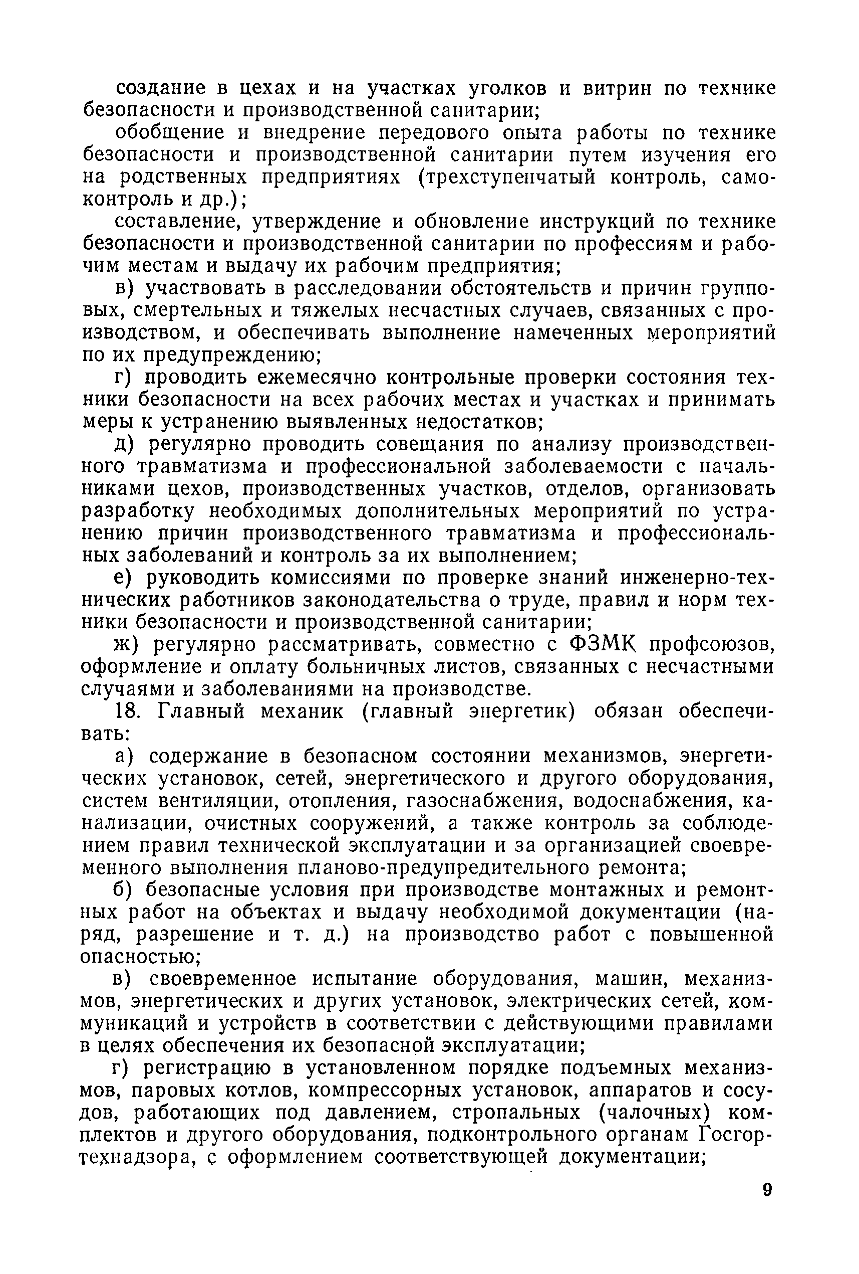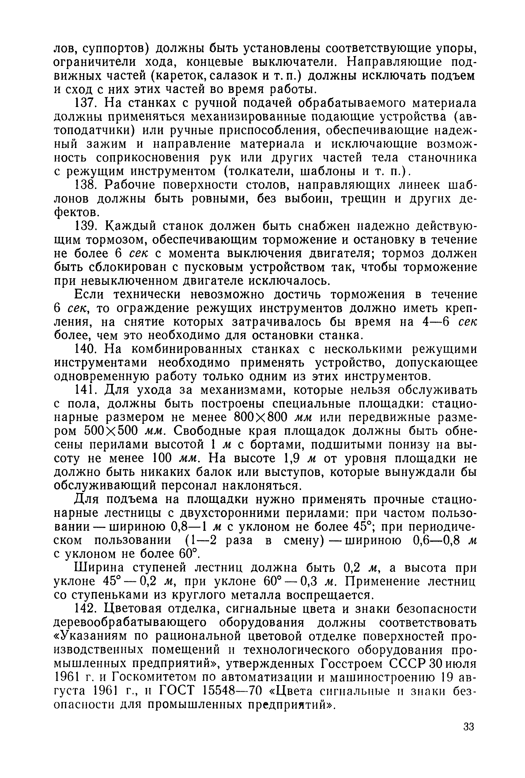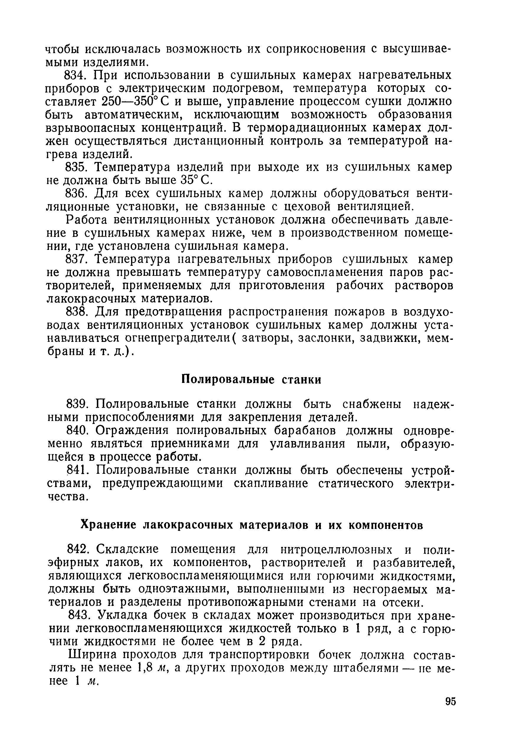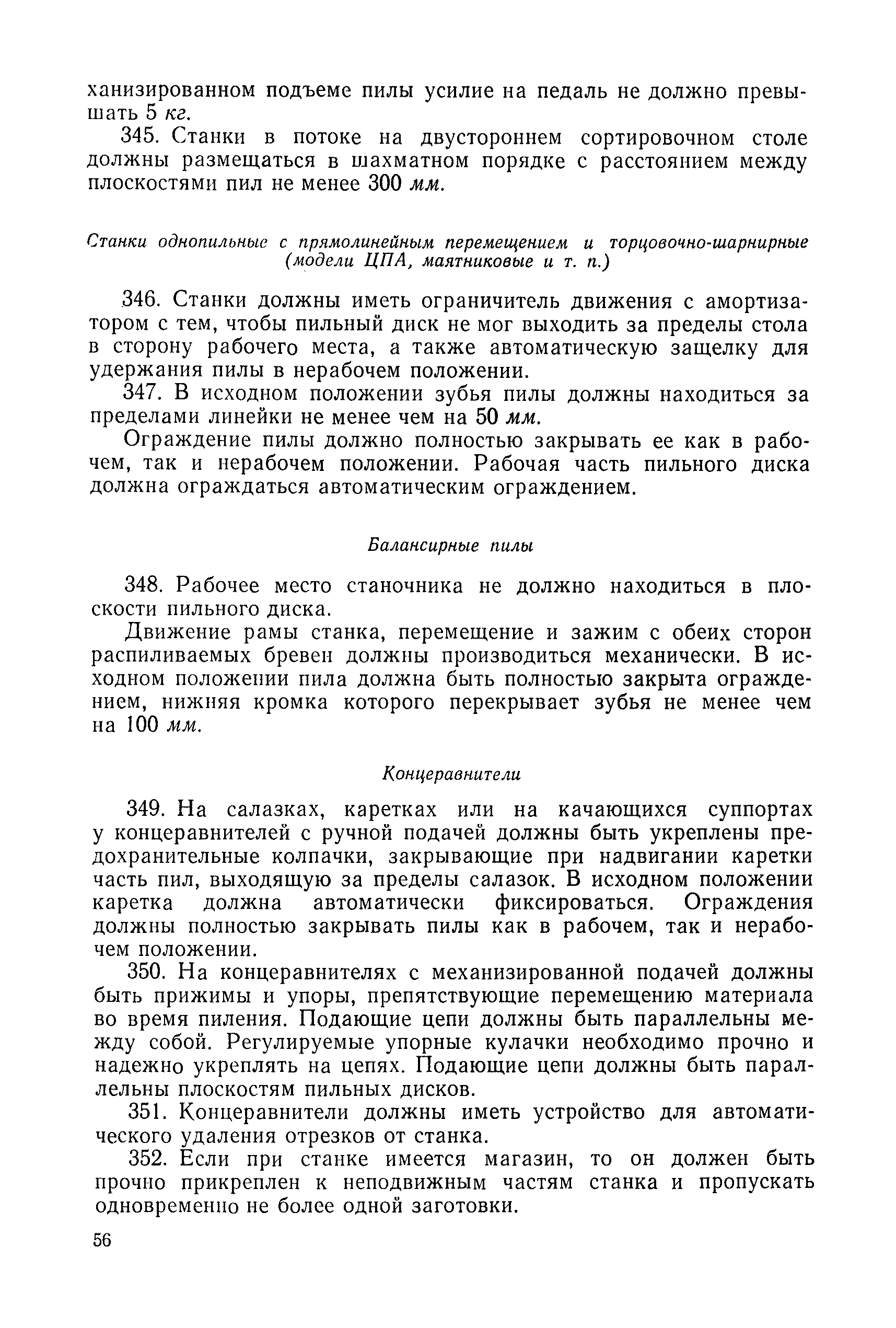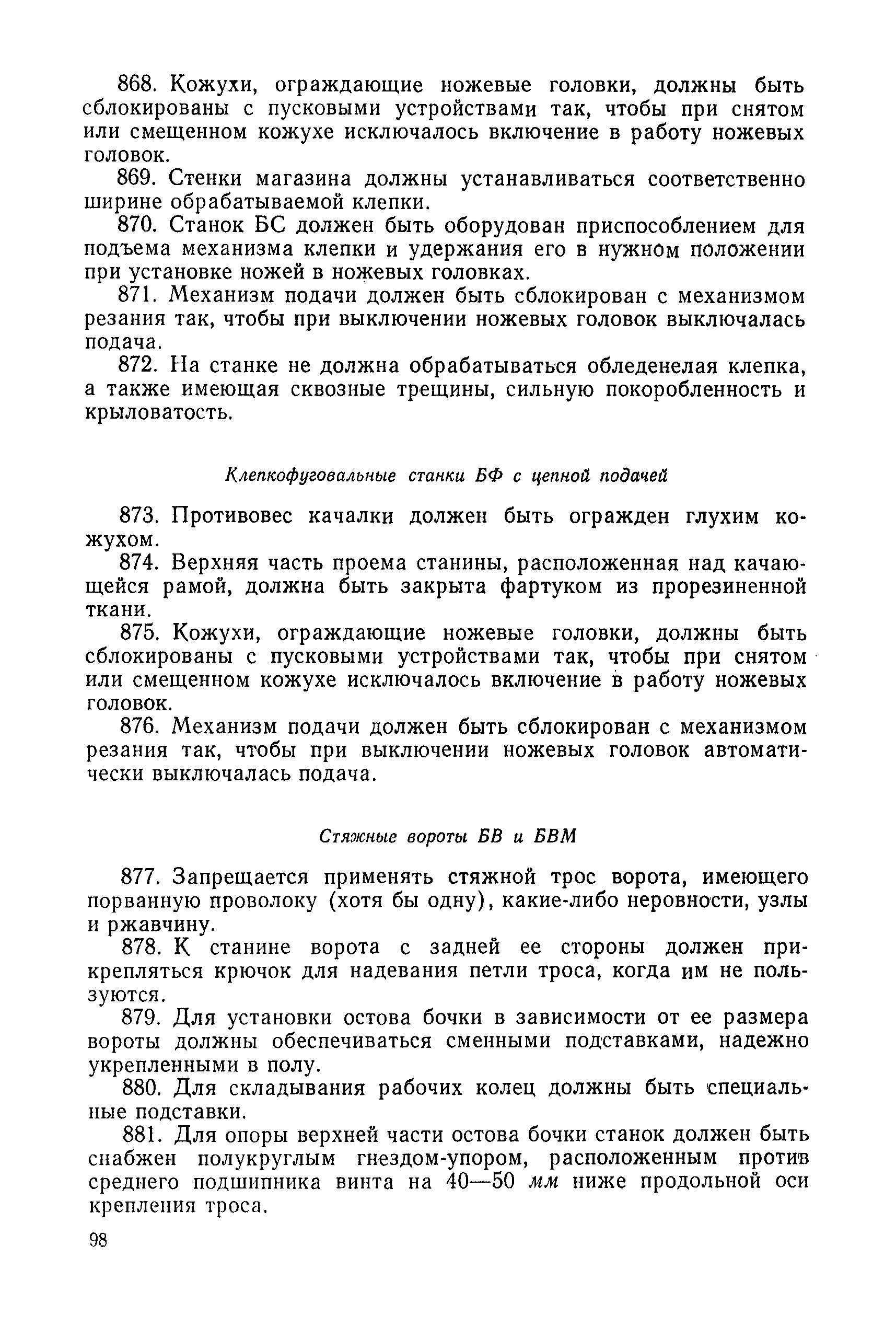 | Оглавление: | I. Общие положения II. Обязанности и ответственность административно-технического персонала III. Обучение и инструктирование рабочих, инженерно-технических работников и служащих IV. Требования к устройству и содержанию территории, зданий и сооружений предприятий V. Требования по устройству, расположению и содержанию оборудования и рабочих мест VI. Оборудование стационарного транспорта. Внутрицеховой и внутризаводской транспорт VII. Требования к оборудованию и технологическим процессам VIII. Инструменты IX. Рейды, бассейны и склады круглых лесоматериалов X. Склады готовой продукции Приложение 1 Перечень официальных руководящих нормативных и общетехнических материалов по технике безопасности и производственной санитарии, применение которых обязательно во всех отраслях промышленности Приложение 2 Методические указания к составлению инструкций по технике безопасности Приложение 3 Структура служб охраны труда в зависимости от числа рабочих Приложение 4 Предписание Приложение 5 Методические указания по созданию и организации работы кабинета охраны труда Приложение 6 Типовые программы инструктажей и курсового обучения рабочих Приложение 7 Журнал регистрации вводного инструктажа по технике безопасности Приложение 8 Удостоверение по технике безопасности Приложение 9 Протокол Приложение 10 Типовая программа для обучения административно-технического персонала Приложение 11 Положение о порядке проверки знаний правил, норм и инструкций по технике безопасности руководящими работниками подведомственных предприятий, организаций и объектов, подконтрольных органам Госгортехнадзора СССР в системе Министерства лесной и деревообрабатывающей промышленности СССР Приложение 12 Предельно допустимые концентрации вредных газов, паров, пыли и других аэрозолей в воздухе рабочей зоны производственных помещений Приложение 13 Состав и нормы санитарно-бытовых помещений Приложение 14 Нормы и сроки испытаний подъемных механизмов и приспособлений Приложение 15 Наименьших допустимый коэффициент запаса прочности канатов и цепей Приложение 16 Нормы и сроки электрических испытаний защитных средств Приложение 17 Классификация производственных помещений по степени взрыво- и пожароопасности с точки зрения применения электрооборудования Приложение 18 Временная инструкция по устройству расходных складов бертолетовой соли и о порядке ее хранения на спичечных фабриках Приложение 19 Нормы браковки стальных канатов Приложение 20 Шкала приближенного определения силы ветра и состояния водной поверхности |