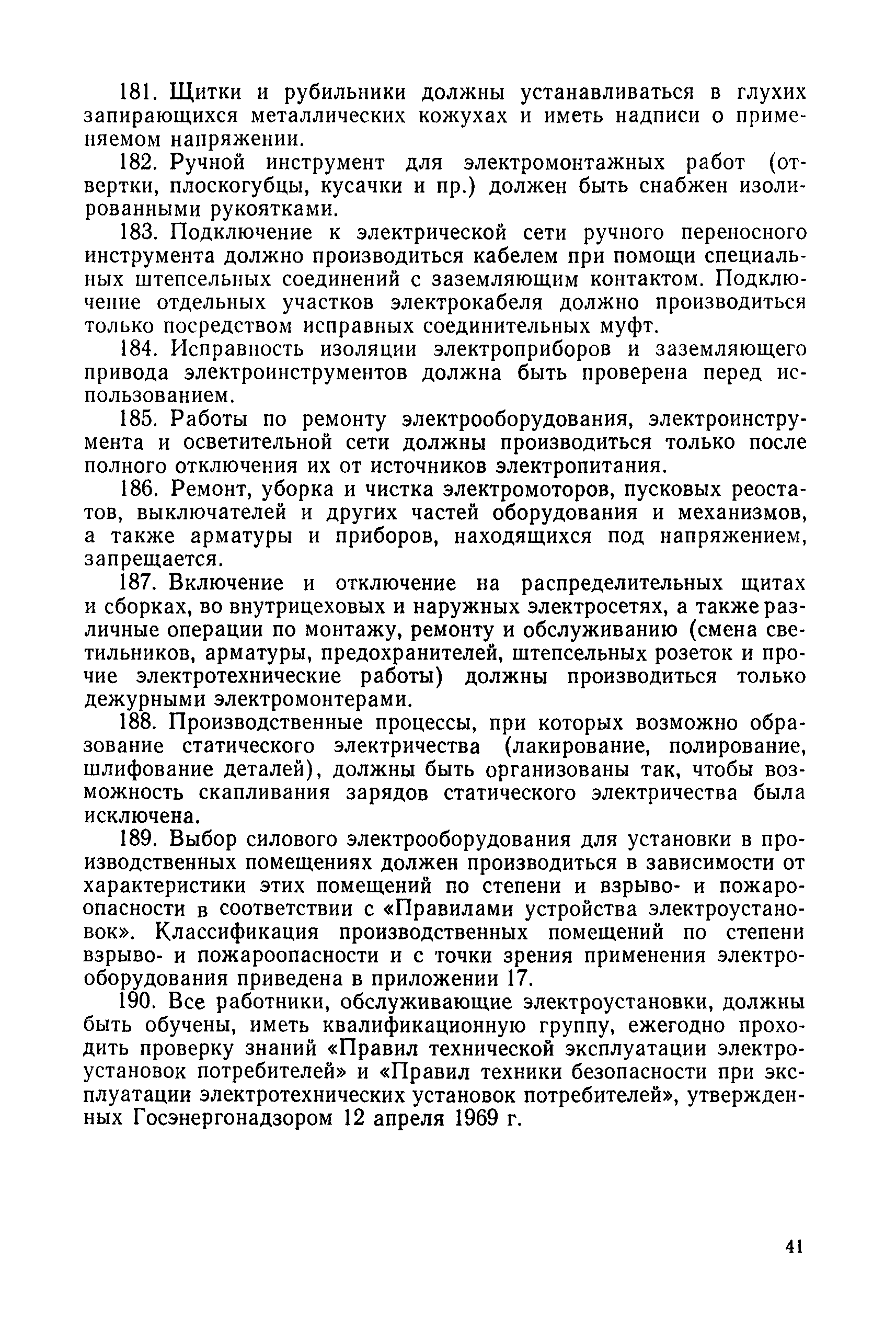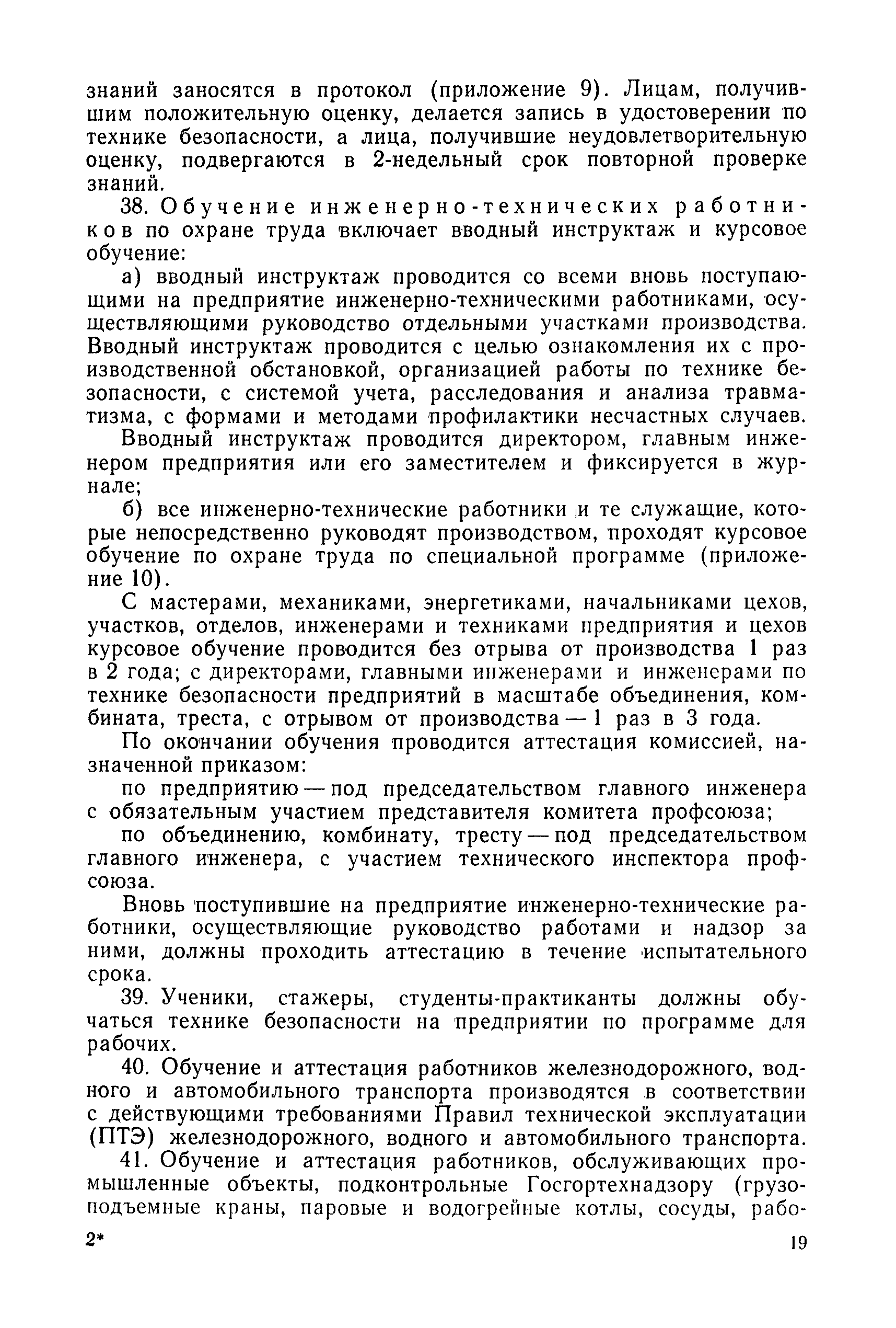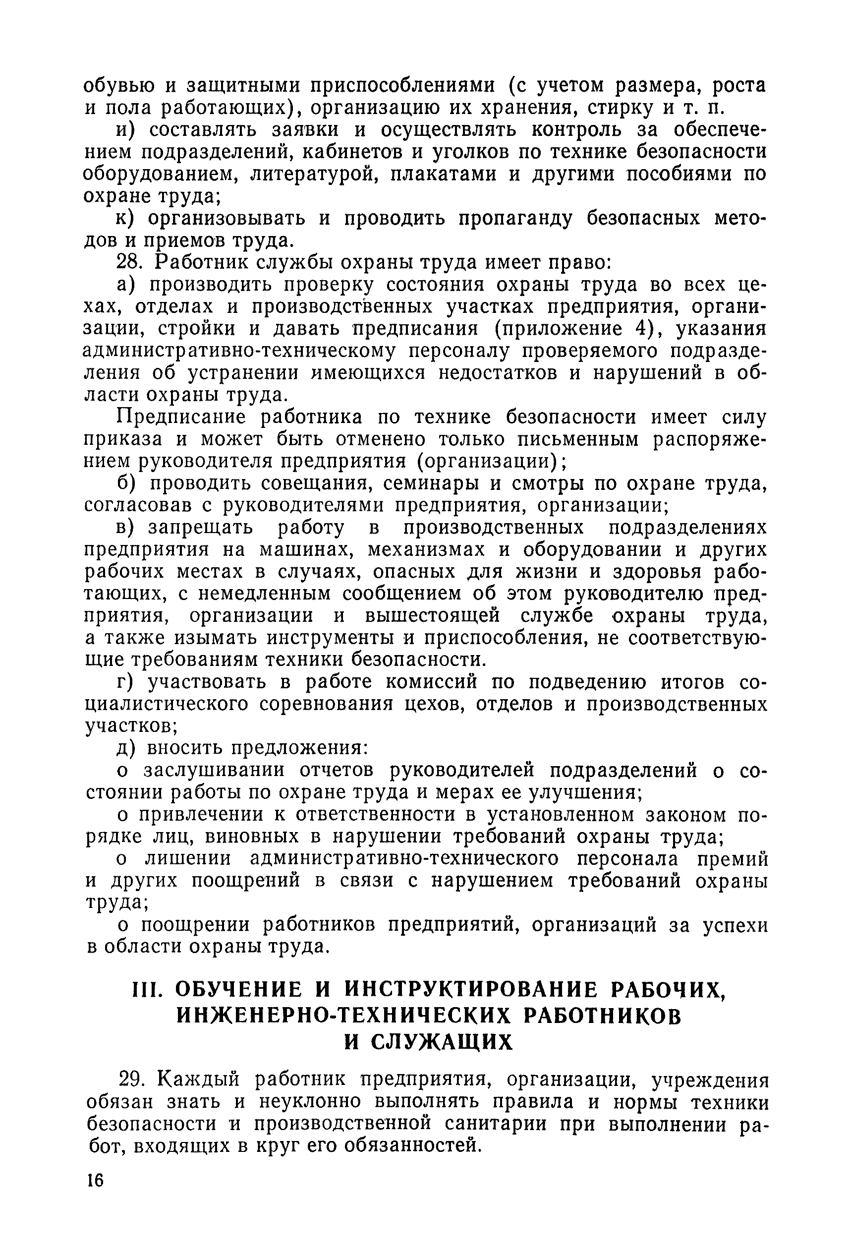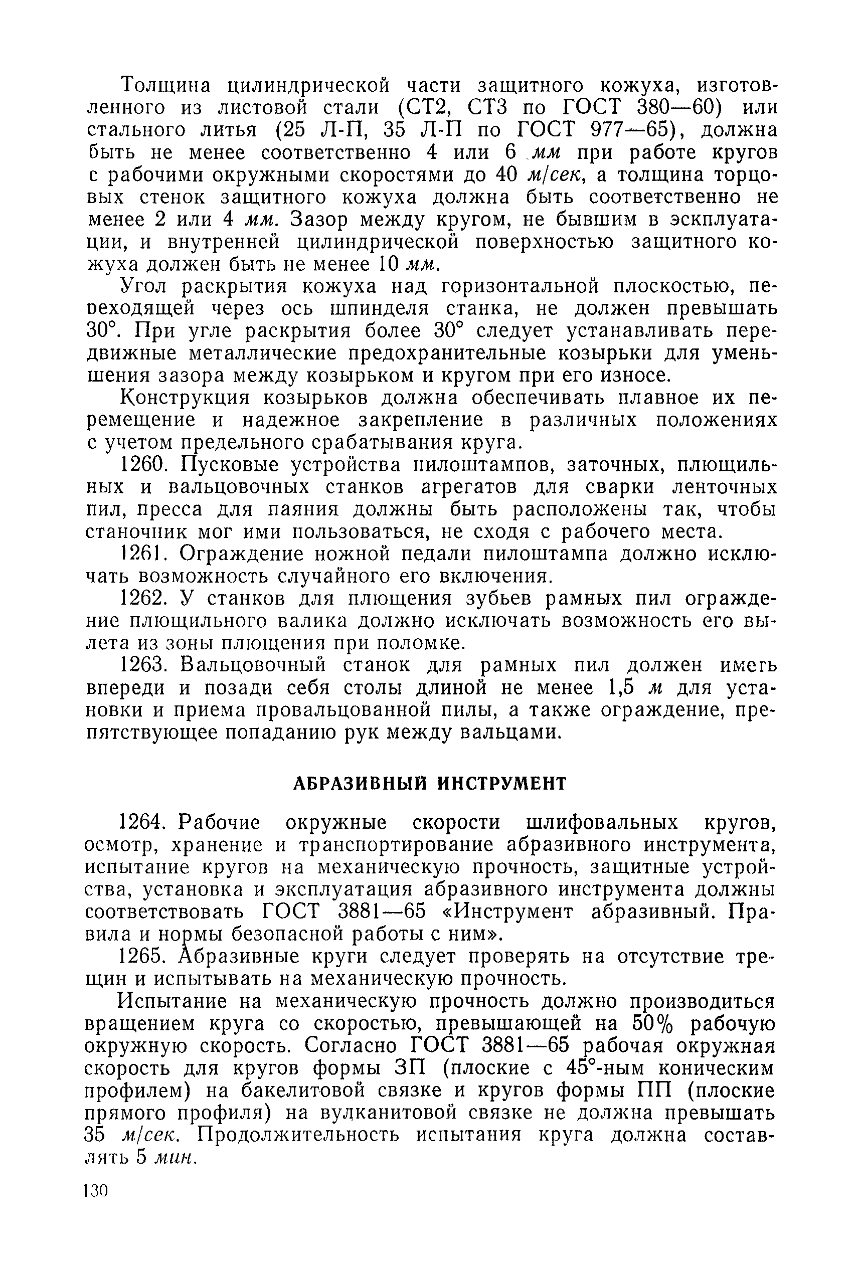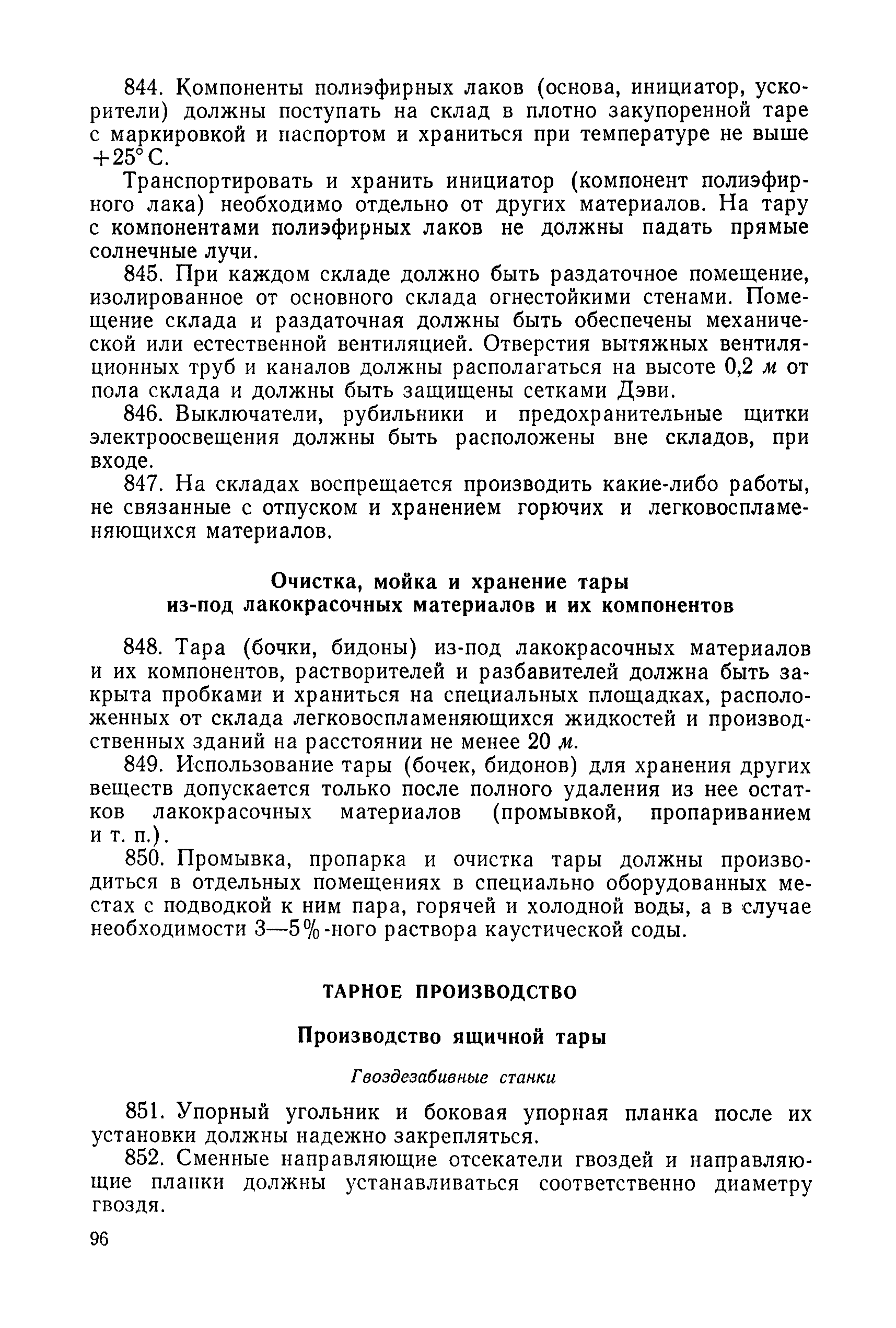 | Оглавление: | I. Общие положения II. Обязанности и ответственность административно-технического персонала III. Обучение и инструктирование рабочих, инженерно-технических работников и служащих IV. Требования к устройству и содержанию территории, зданий и сооружений предприятий V. Требования по устройству, расположению и содержанию оборудования и рабочих мест VI. Оборудование стационарного транспорта. Внутрицеховой и внутризаводской транспорт VII. Требования к оборудованию и технологическим процессам VIII. Инструменты IX. Рейды, бассейны и склады круглых лесоматериалов X. Склады готовой продукции Приложение 1 Перечень официальных руководящих нормативных и общетехнических материалов по технике безопасности и производственной санитарии, применение которых обязательно во всех отраслях промышленности Приложение 2 Методические указания к составлению инструкций по технике безопасности Приложение 3 Структура служб охраны труда в зависимости от числа рабочих Приложение 4 Предписание Приложение 5 Методические указания по созданию и организации работы кабинета охраны труда Приложение 6 Типовые программы инструктажей и курсового обучения рабочих Приложение 7 Журнал регистрации вводного инструктажа по технике безопасности Приложение 8 Удостоверение по технике безопасности Приложение 9 Протокол Приложение 10 Типовая программа для обучения административно-технического персонала Приложение 11 Положение о порядке проверки знаний правил, норм и инструкций по технике безопасности руководящими работниками подведомственных предприятий, организаций и объектов, подконтрольных органам Госгортехнадзора СССР в системе Министерства лесной и деревообрабатывающей промышленности СССР Приложение 12 Предельно допустимые концентрации вредных газов, паров, пыли и других аэрозолей в воздухе рабочей зоны производственных помещений Приложение 13 Состав и нормы санитарно-бытовых помещений Приложение 14 Нормы и сроки испытаний подъемных механизмов и приспособлений Приложение 15 Наименьших допустимый коэффициент запаса прочности канатов и цепей Приложение 16 Нормы и сроки электрических испытаний защитных средств Приложение 17 Классификация производственных помещений по степени взрыво- и пожароопасности с точки зрения применения электрооборудования Приложение 18 Временная инструкция по устройству расходных складов бертолетовой соли и о порядке ее хранения на спичечных фабриках Приложение 19 Нормы браковки стальных канатов Приложение 20 Шкала приближенного определения силы ветра и состояния водной поверхности |