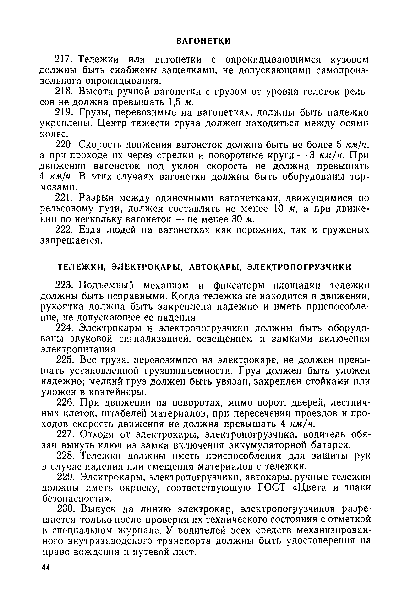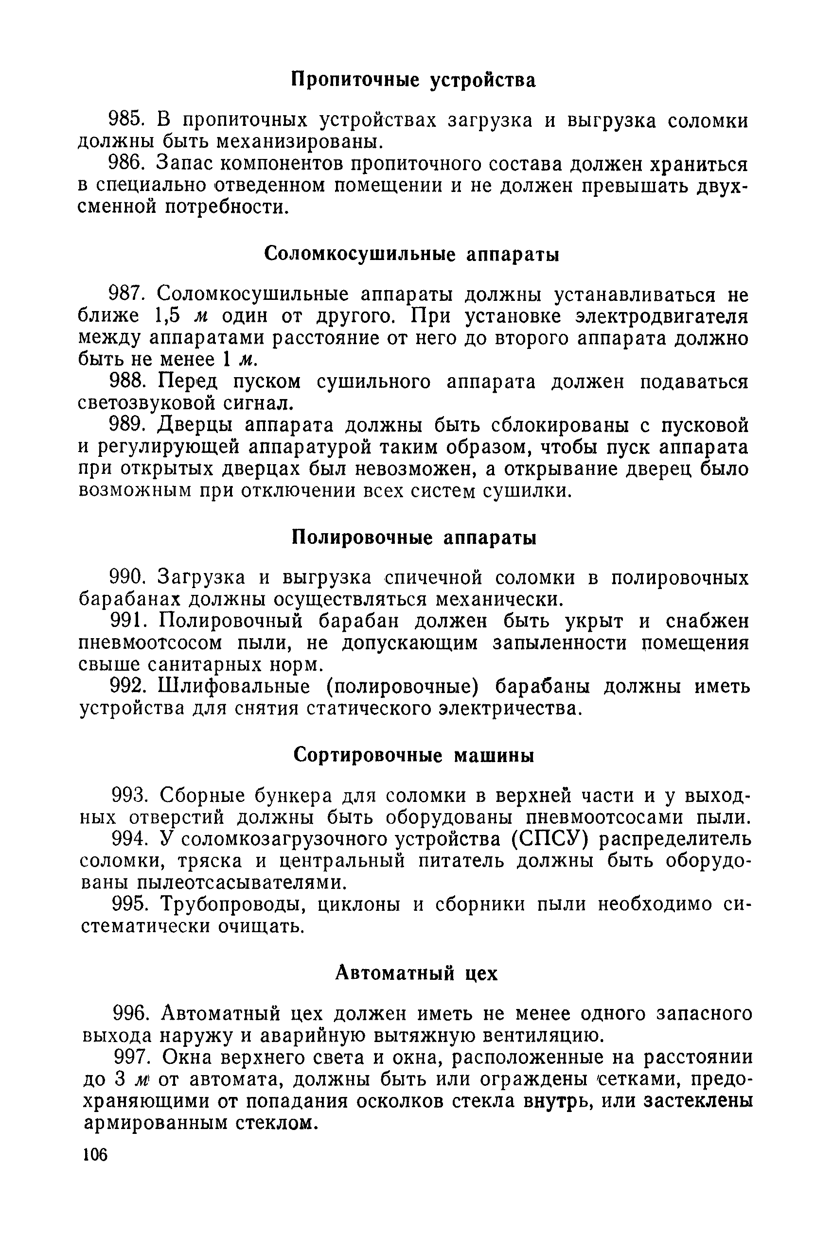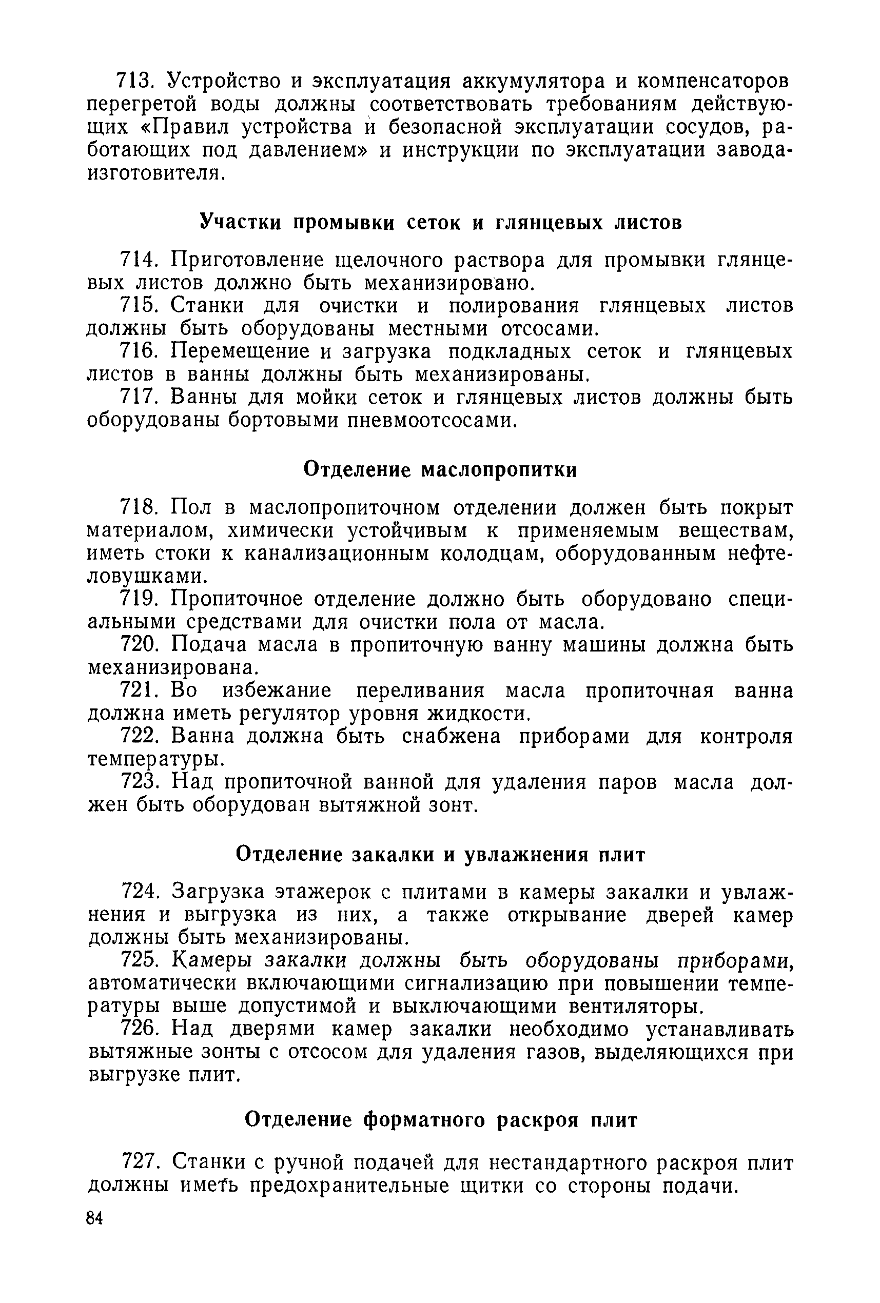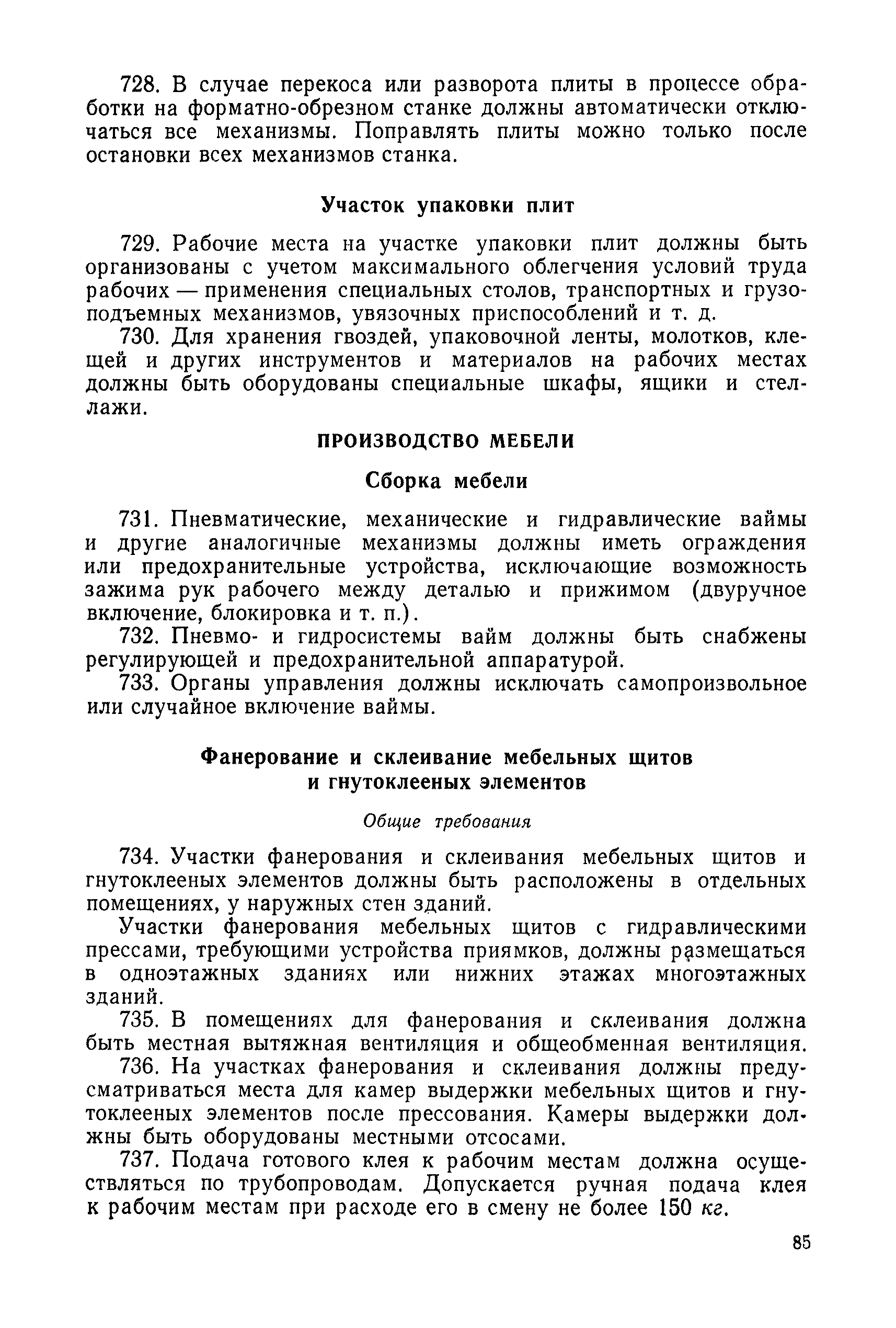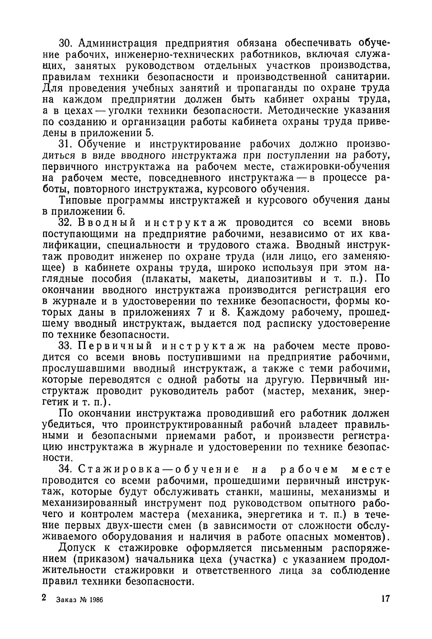 | Оглавление: | I. Общие положения II. Обязанности и ответственность административно-технического персонала III. Обучение и инструктирование рабочих, инженерно-технических работников и служащих IV. Требования к устройству и содержанию территории, зданий и сооружений предприятий V. Требования по устройству, расположению и содержанию оборудования и рабочих мест VI. Оборудование стационарного транспорта. Внутрицеховой и внутризаводской транспорт VII. Требования к оборудованию и технологическим процессам VIII. Инструменты IX. Рейды, бассейны и склады круглых лесоматериалов X. Склады готовой продукции Приложение 1 Перечень официальных руководящих нормативных и общетехнических материалов по технике безопасности и производственной санитарии, применение которых обязательно во всех отраслях промышленности Приложение 2 Методические указания к составлению инструкций по технике безопасности Приложение 3 Структура служб охраны труда в зависимости от числа рабочих Приложение 4 Предписание Приложение 5 Методические указания по созданию и организации работы кабинета охраны труда Приложение 6 Типовые программы инструктажей и курсового обучения рабочих Приложение 7 Журнал регистрации вводного инструктажа по технике безопасности Приложение 8 Удостоверение по технике безопасности Приложение 9 Протокол Приложение 10 Типовая программа для обучения административно-технического персонала Приложение 11 Положение о порядке проверки знаний правил, норм и инструкций по технике безопасности руководящими работниками подведомственных предприятий, организаций и объектов, подконтрольных органам Госгортехнадзора СССР в системе Министерства лесной и деревообрабатывающей промышленности СССР Приложение 12 Предельно допустимые концентрации вредных газов, паров, пыли и других аэрозолей в воздухе рабочей зоны производственных помещений Приложение 13 Состав и нормы санитарно-бытовых помещений Приложение 14 Нормы и сроки испытаний подъемных механизмов и приспособлений Приложение 15 Наименьших допустимый коэффициент запаса прочности канатов и цепей Приложение 16 Нормы и сроки электрических испытаний защитных средств Приложение 17 Классификация производственных помещений по степени взрыво- и пожароопасности с точки зрения применения электрооборудования Приложение 18 Временная инструкция по устройству расходных складов бертолетовой соли и о порядке ее хранения на спичечных фабриках Приложение 19 Нормы браковки стальных канатов Приложение 20 Шкала приближенного определения силы ветра и состояния водной поверхности |