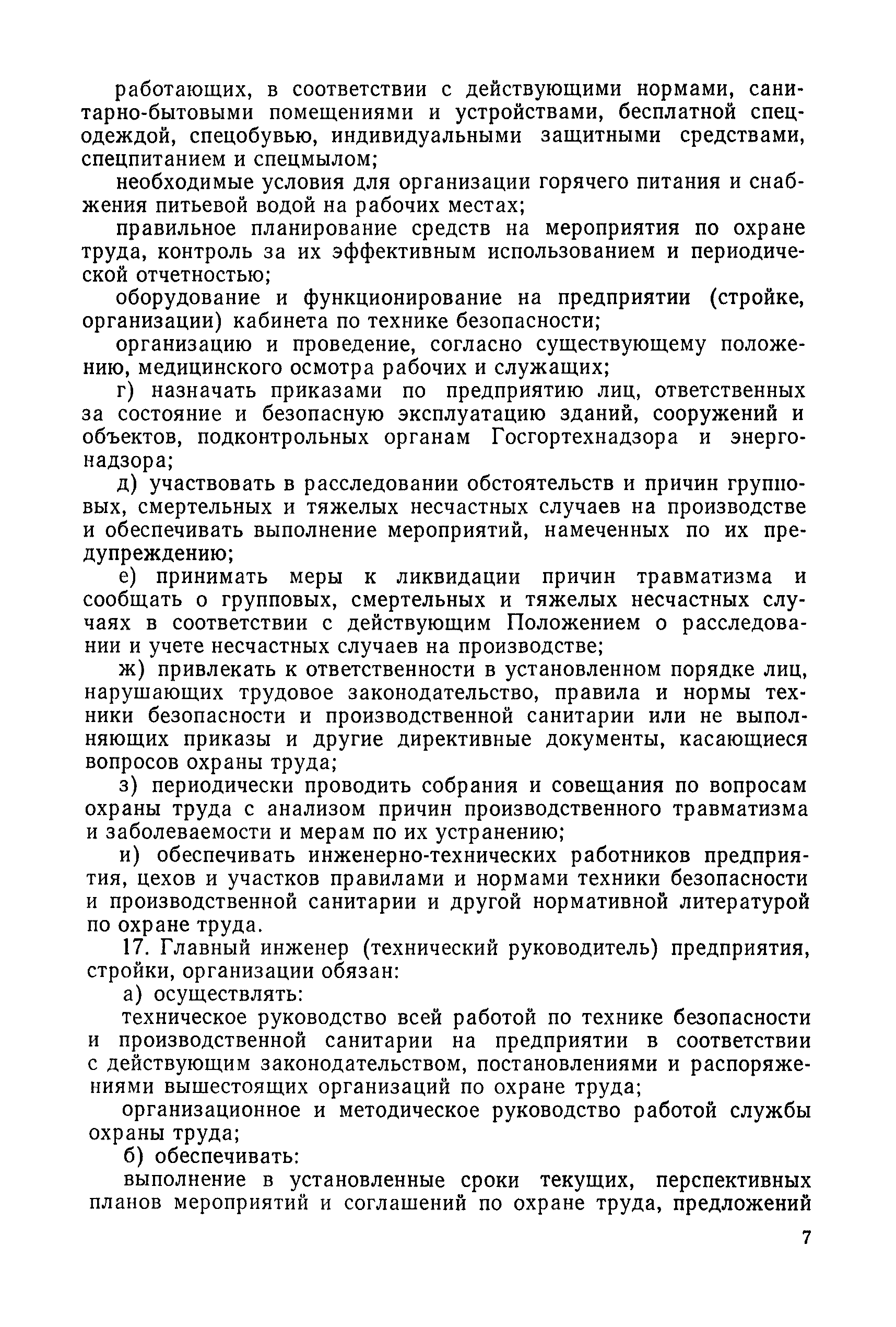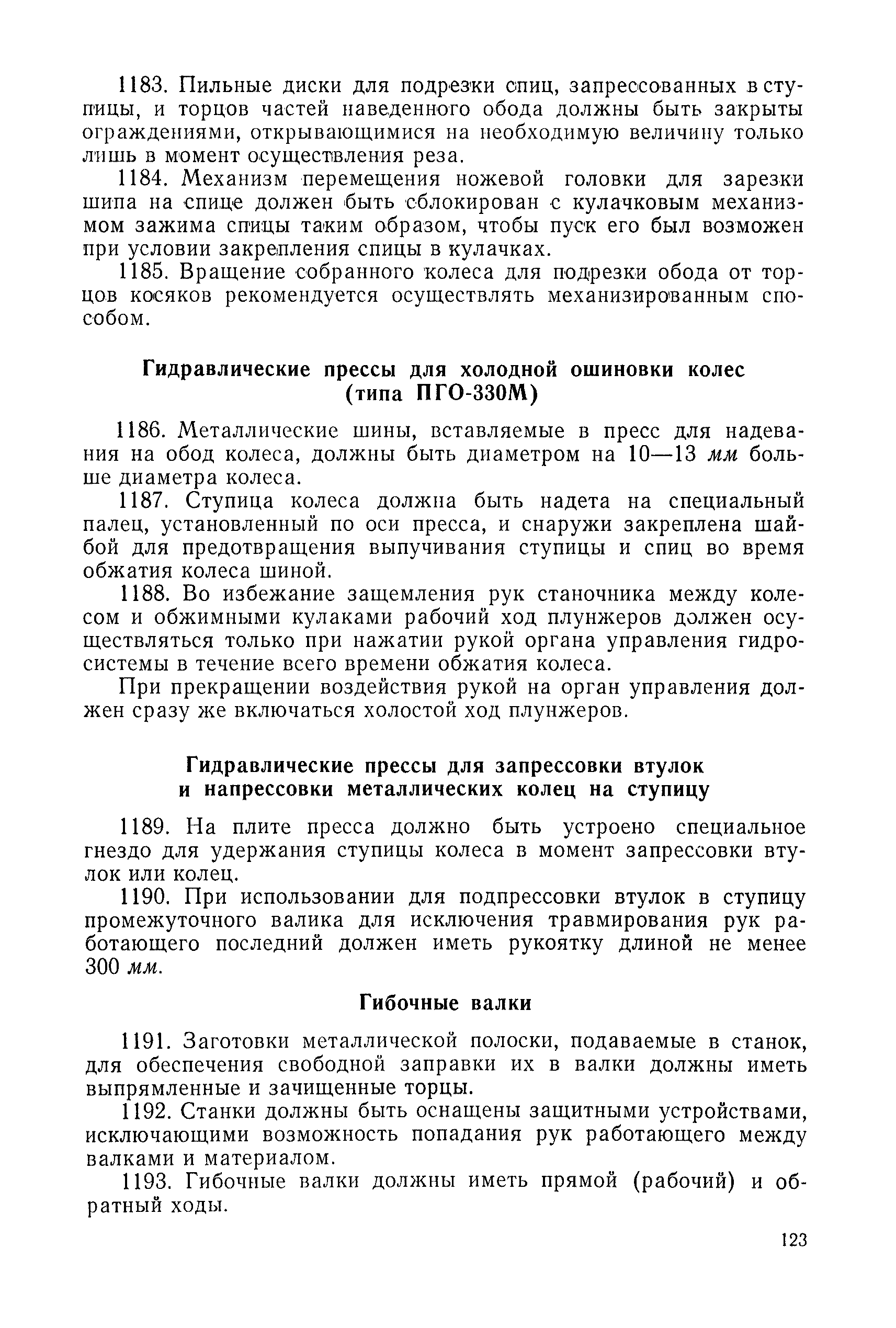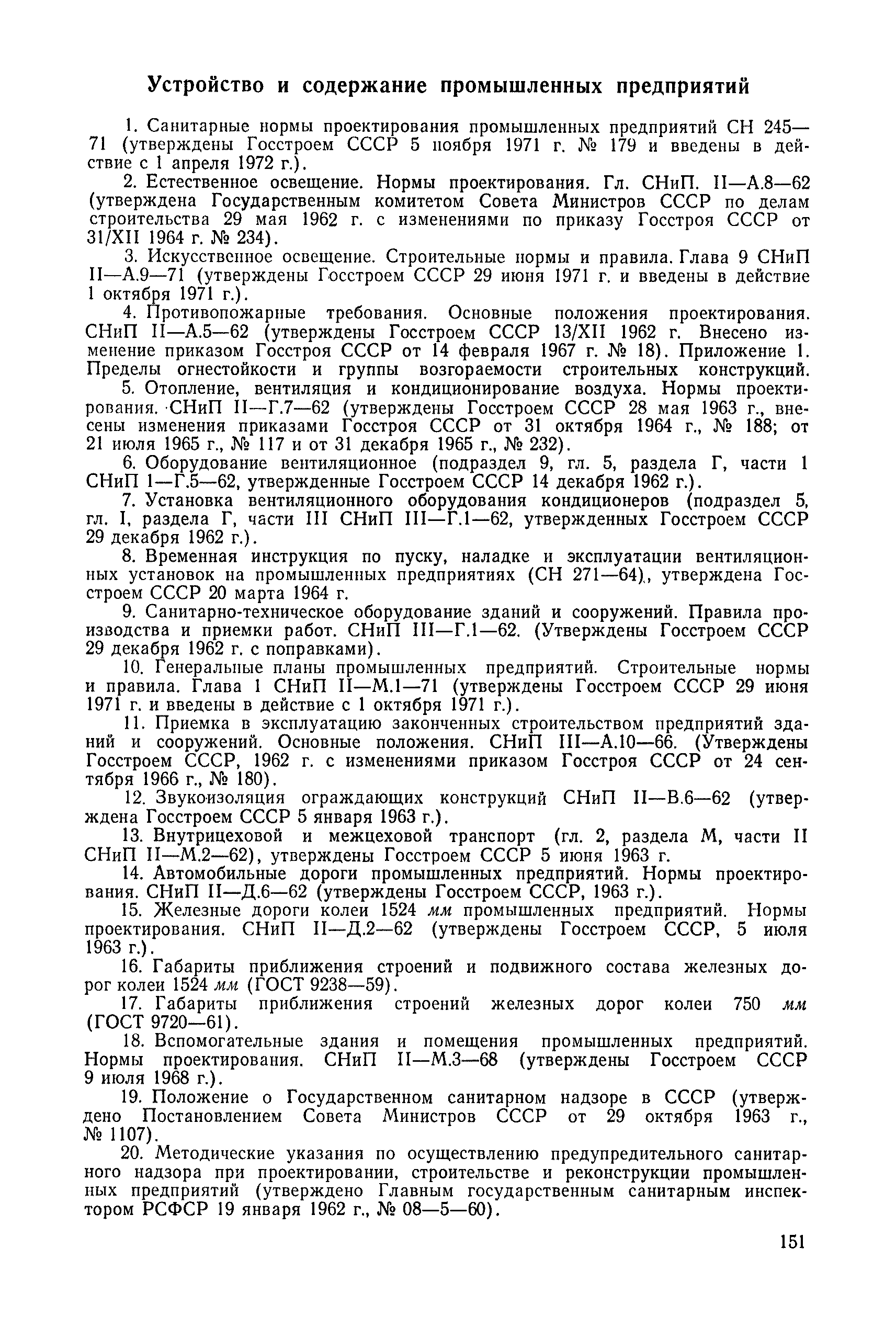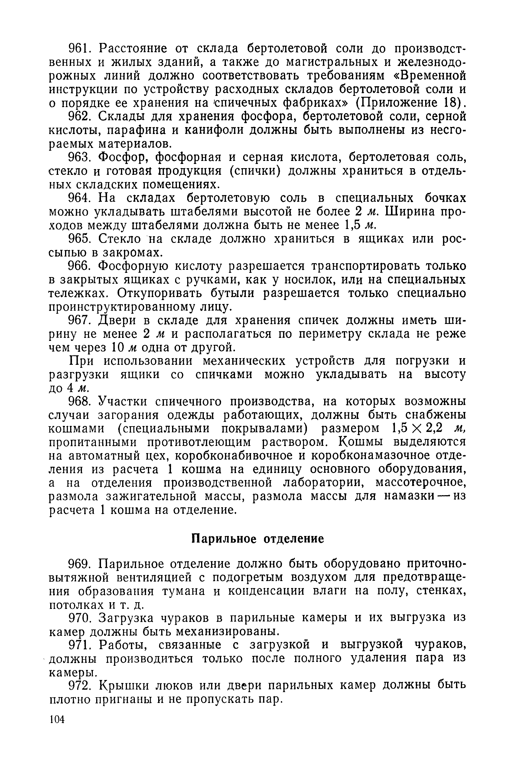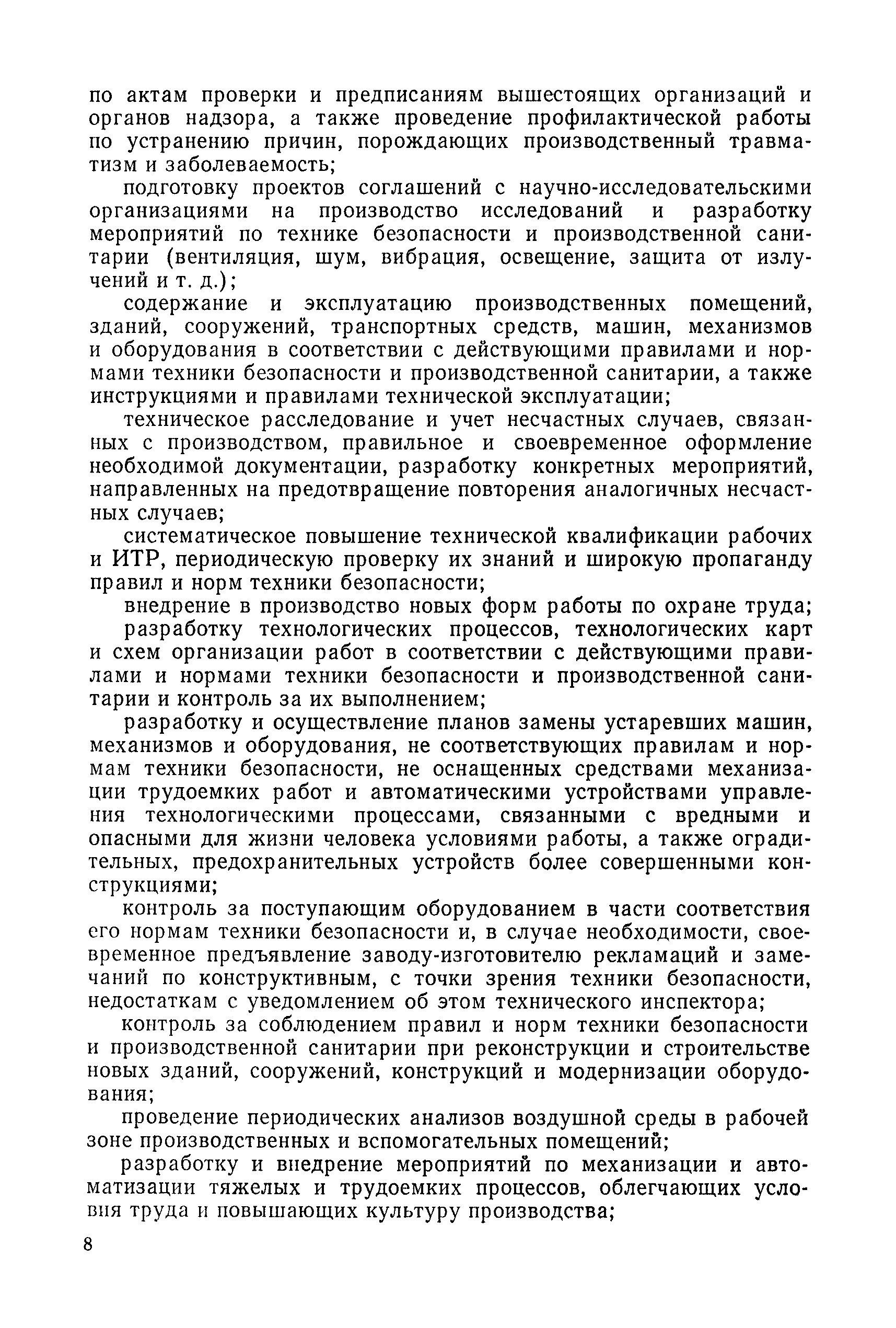 | Оглавление: | I. Общие положения II. Обязанности и ответственность административно-технического персонала III. Обучение и инструктирование рабочих, инженерно-технических работников и служащих IV. Требования к устройству и содержанию территории, зданий и сооружений предприятий V. Требования по устройству, расположению и содержанию оборудования и рабочих мест VI. Оборудование стационарного транспорта. Внутрицеховой и внутризаводской транспорт VII. Требования к оборудованию и технологическим процессам VIII. Инструменты IX. Рейды, бассейны и склады круглых лесоматериалов X. Склады готовой продукции Приложение 1 Перечень официальных руководящих нормативных и общетехнических материалов по технике безопасности и производственной санитарии, применение которых обязательно во всех отраслях промышленности Приложение 2 Методические указания к составлению инструкций по технике безопасности Приложение 3 Структура служб охраны труда в зависимости от числа рабочих Приложение 4 Предписание Приложение 5 Методические указания по созданию и организации работы кабинета охраны труда Приложение 6 Типовые программы инструктажей и курсового обучения рабочих Приложение 7 Журнал регистрации вводного инструктажа по технике безопасности Приложение 8 Удостоверение по технике безопасности Приложение 9 Протокол Приложение 10 Типовая программа для обучения административно-технического персонала Приложение 11 Положение о порядке проверки знаний правил, норм и инструкций по технике безопасности руководящими работниками подведомственных предприятий, организаций и объектов, подконтрольных органам Госгортехнадзора СССР в системе Министерства лесной и деревообрабатывающей промышленности СССР Приложение 12 Предельно допустимые концентрации вредных газов, паров, пыли и других аэрозолей в воздухе рабочей зоны производственных помещений Приложение 13 Состав и нормы санитарно-бытовых помещений Приложение 14 Нормы и сроки испытаний подъемных механизмов и приспособлений Приложение 15 Наименьших допустимый коэффициент запаса прочности канатов и цепей Приложение 16 Нормы и сроки электрических испытаний защитных средств Приложение 17 Классификация производственных помещений по степени взрыво- и пожароопасности с точки зрения применения электрооборудования Приложение 18 Временная инструкция по устройству расходных складов бертолетовой соли и о порядке ее хранения на спичечных фабриках Приложение 19 Нормы браковки стальных канатов Приложение 20 Шкала приближенного определения силы ветра и состояния водной поверхности |