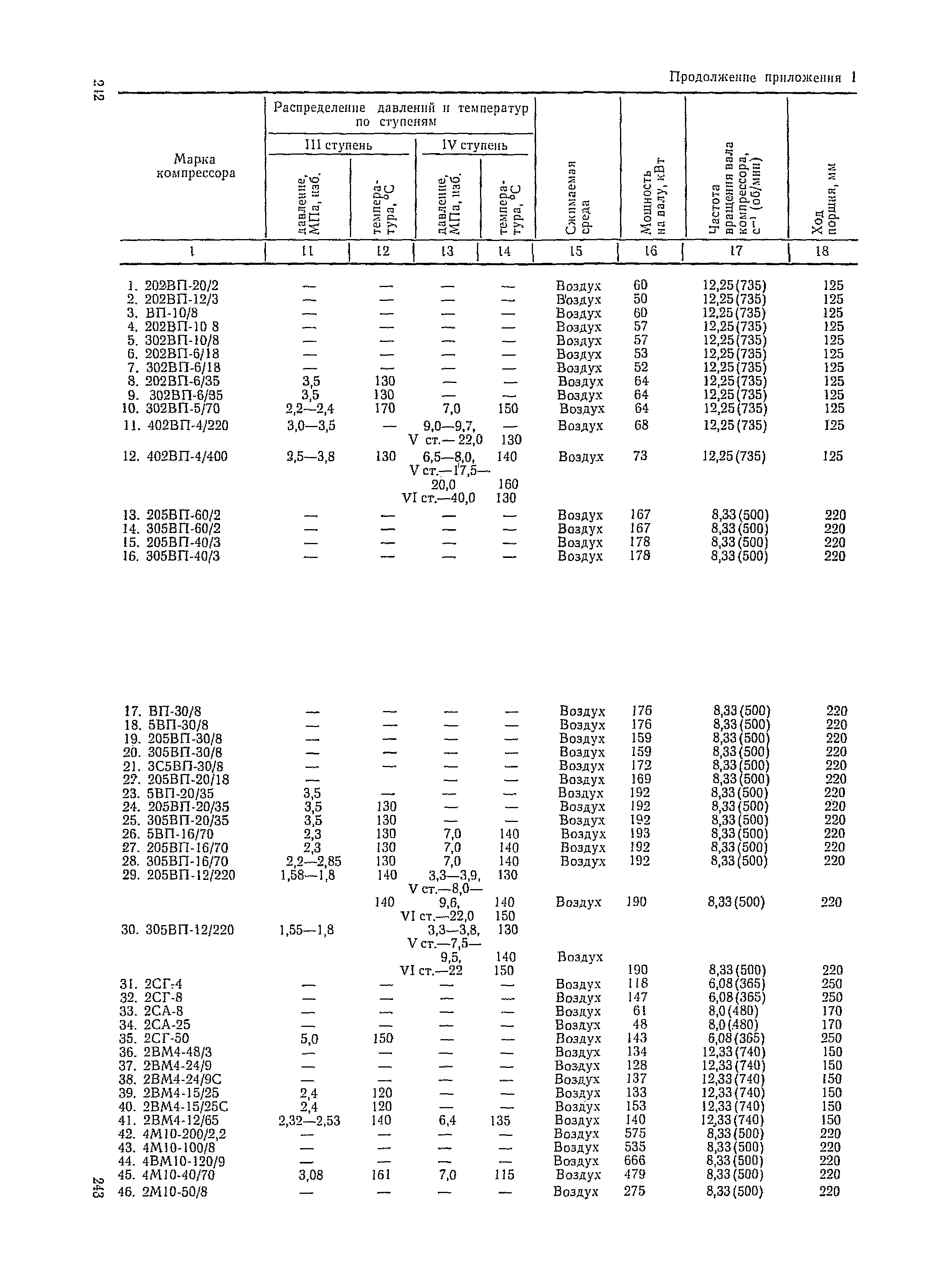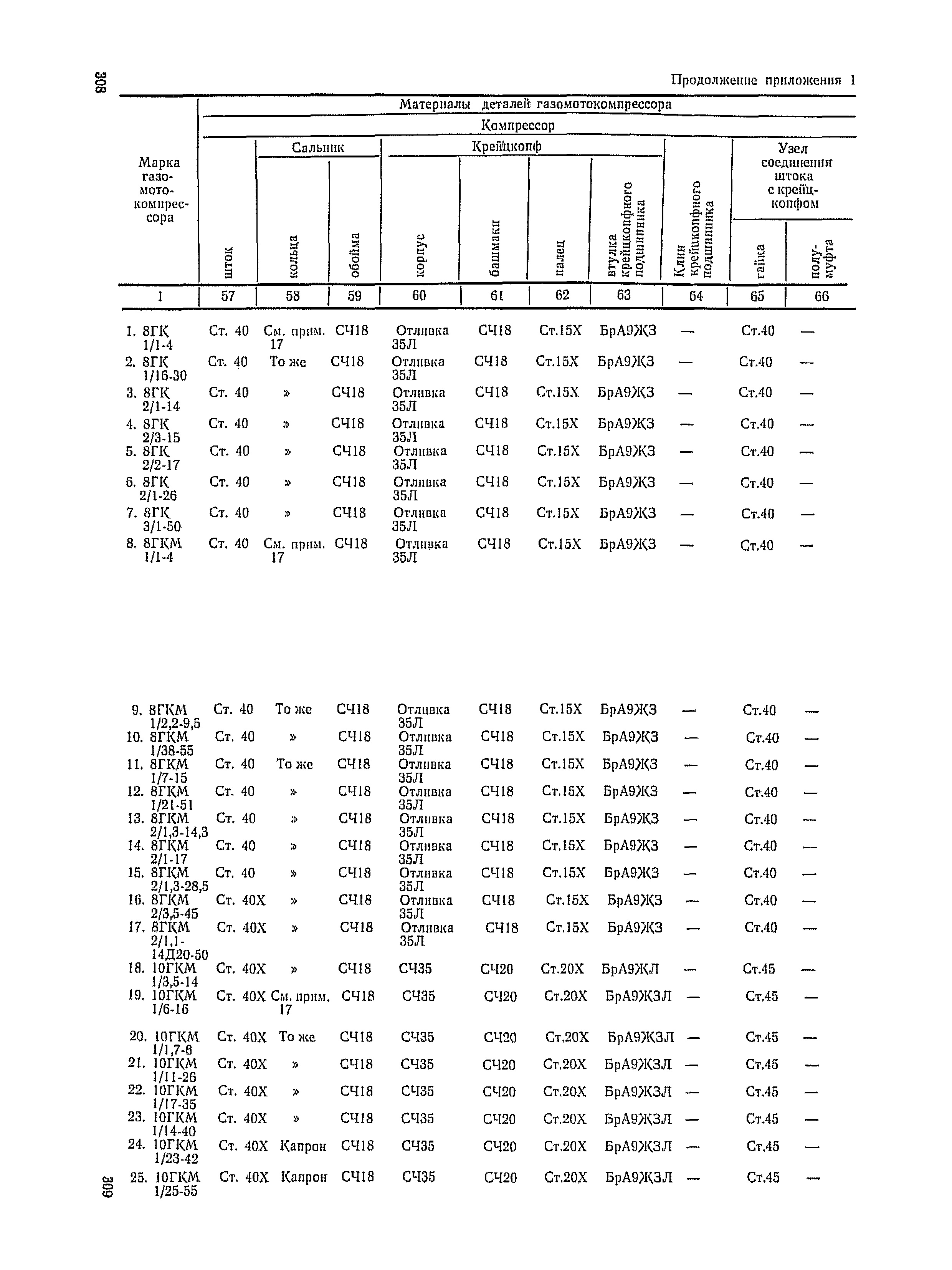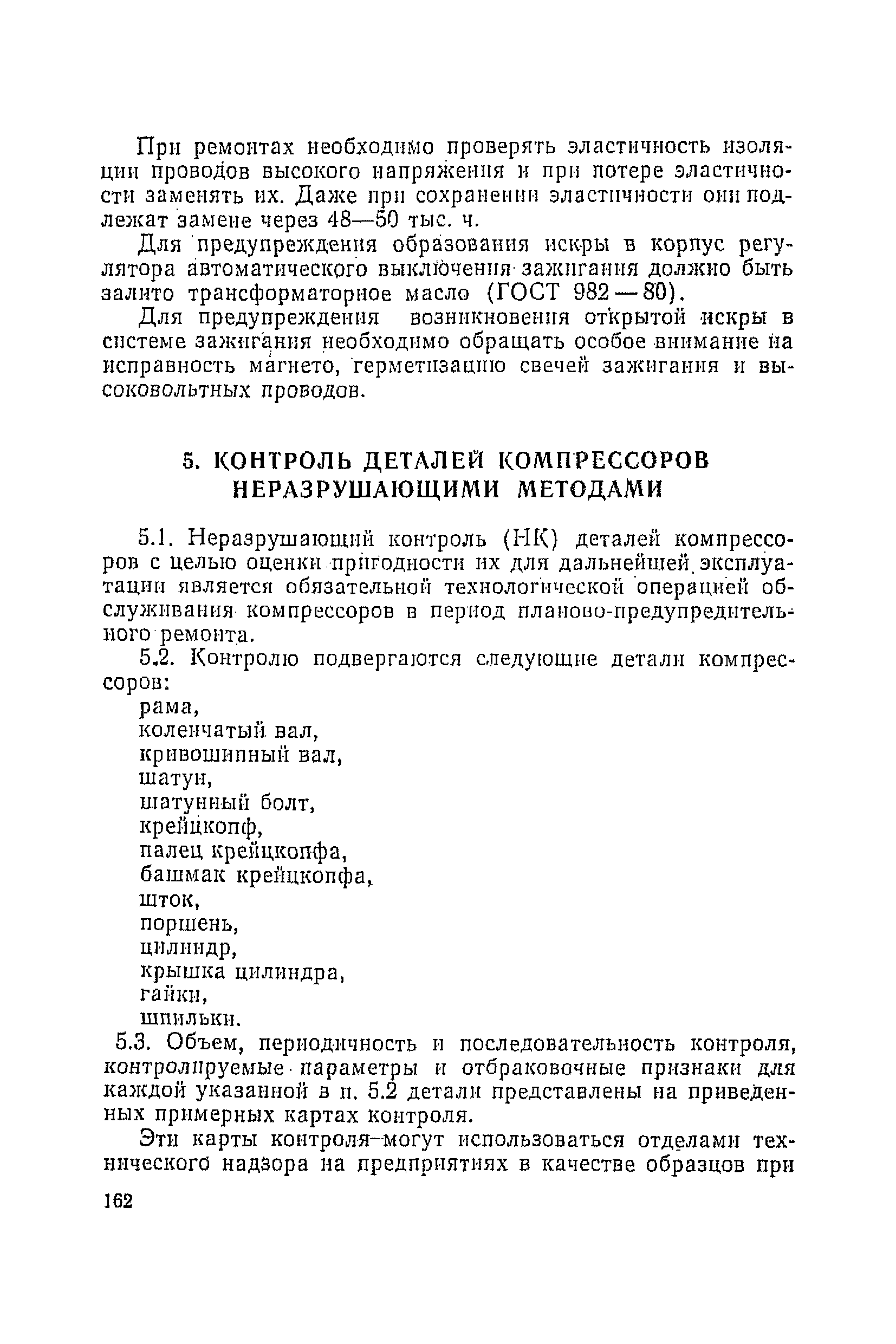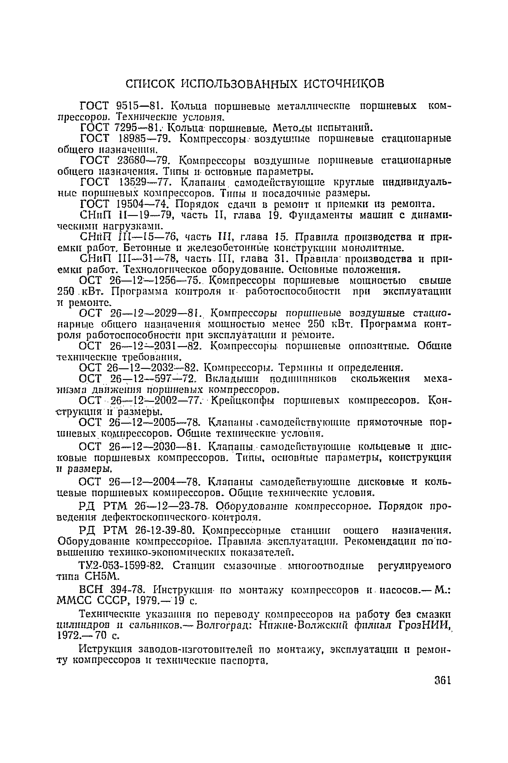 | | Нормативные ссылки: |  «Правила устройства и безопасной эксплуатации стационарных компрессорных установок, воздухопроводов и газопроводов» «Правила устройства и безопасной эксплуатации сосудов, работающих под давлением»  «Типовая инструкция по организации безопасного проведения огневых работ на взрывоопасных и взрывопожароопасных объектах»  ГОСТ 5632-72 «Стали высоколегированные и сплавы коррозионно-стойкие, жаростойкие и жаропрочные. Марки»  ГОСТ 15150-69 «Машины, приборы и другие технические изделия. Исполнения для различных климатических районов. Категории, условия эксплуатации, хранения и транспортирования в части воздействия климатических факторов внешней среды»  ГОСТ 12503-75 «Сталь. Методы ультразвукового контроля. Общие требования»  ГОСТ 8479-70 «Поковки из конструкционной углеродистой и легированной стали. Общие технические условия»  ГОСТ 4543-71 «Прокат из легированной конструкционной стали. Технические условия»  ГОСТ 481-80 «Паронит и прокладки из него. Технические условия»  ГОСТ 2789-73 «Шероховатость поверхности. Параметры и характеристики»  ГОСТ 14959-79 «Прокат из рессорно-пружинной углеродистой и легированной стали. Технические условия» Инструкция «Инструкция по выбору сосудов и аппаратов, работающих под давлением до 100 кгс/см2 и защите их от превышения давления»  ГОСТ 13489-79 «Герметики марок У-30М и УТ-31. Технические условия»  ГОСТ 21121-75 «Лазурь железная. Технические условия»  ГОСТ 9347-74 «Картон прокладочный и уплотнительные прокладки из него. Технические условия»  ГОСТ 12613-79 «Краны металлургические для раздевания слитков. Основные параметры»  ГОСТ 1320-74 «Баббиты оловянные и свинцовые. Технические условия»  ГОСТ 1861-73 «Масла компрессорные. Технические условия»  ГОСТ 20415-82 «Контроль неразрушающий. Методы акустические. Общие положения» ГОСТ 20799-75 «Масла индустриальные общего назначения. Технические условия» ГОСТ 21104-75 «Контроль неразрушающий. Феррозондовый метод»  ГОСТ 21743-76 «Масла авиационные. Технические условия»  ГОСТ 24289-80 «Контроль неразрушающий вихретоковый. Термины и определения»  ГОСТ 24507-80 «Контроль неразрушающий. Поковки из черных и цветных металлов. Методы ультразвуковой дефектоскопии» ГОСТ 3778-77 «Свинец. Технические условия» ГОСТ 40-80 «Гуанид Ф. Технические условия» ГОСТ 4832-80 «Чугун литейный. Технические условия» ГОСТ 5539-73 «Глет свинцовый. Технические условия» ГОСТ 613-79 «Бронзы оловянные литейные. Марки»  ГОСТ 6411-76 «Масла цилиндровые тяжелые. Технические условия» ГОСТ 6990-75 «Масло касторовое сульфированное. Технические условия» ГОСТ 8295-73 «Графит смазочный. Технические условия»  ГОСТ 8581-78 «Масла моторные для автотракторных дизелей. Технические условия» ГОСТ 8981-78 «Эфиры этиловый и нормальный бутиловый уксусной кислоты технические. Технические условия»  ГОСТ 9243-75 «Масло компрессорное из сернистых нефтей КС-19. Технические условия»  ГОСТ 9389-75 «Проволока стальная углеродистая пружинная. Технические условия» ГОСТ 9515-81 «Кольца поршневые металлические поршневых компрессоров. Технические условия»  ГОСТ 982-80 «Масла трансформаторные. Технические условия» ГОСТ 1050-74 «Сталь углеродистая качественная конструкционная. Технические условия» ГОСТ 3443-77 «Отливки из чугуна с различной формой графита. Методы определения структуры» ГОСТ 23702-79 «Контроль неразрушающий. Преобразователи ультразвуковые. Основные параметры и метод