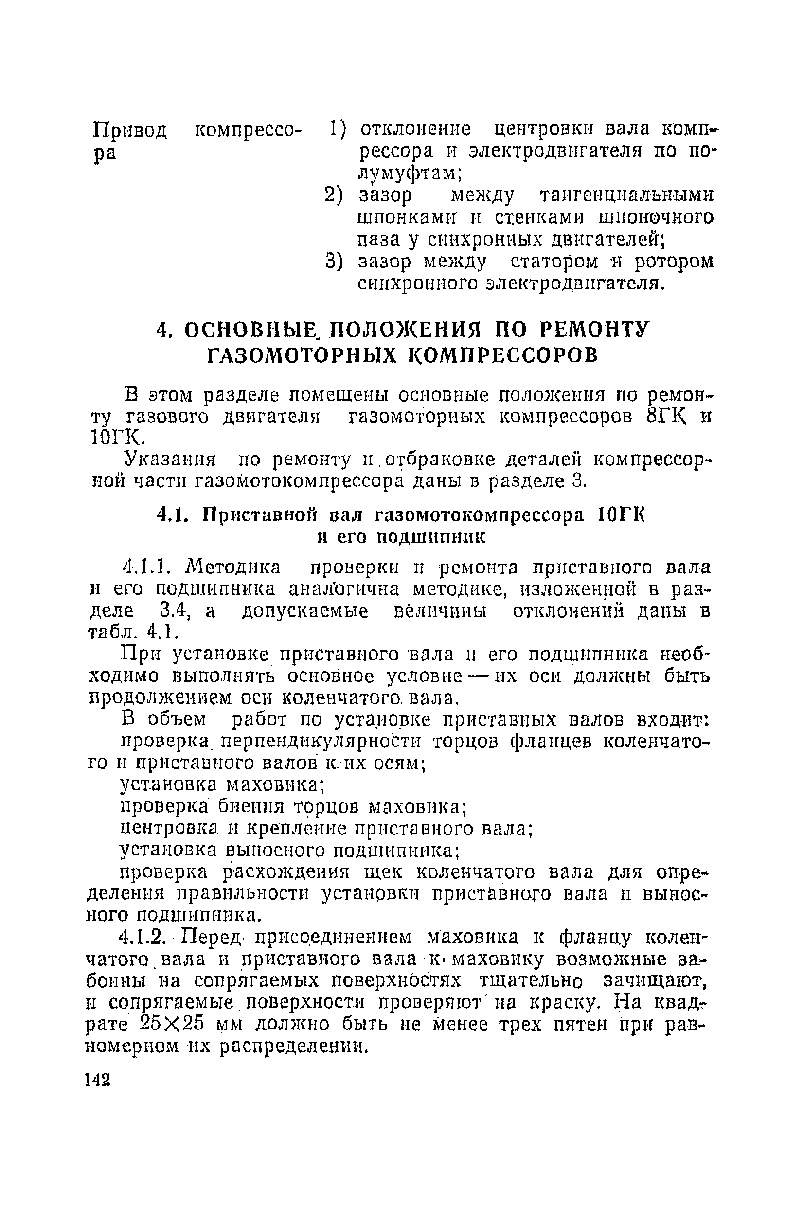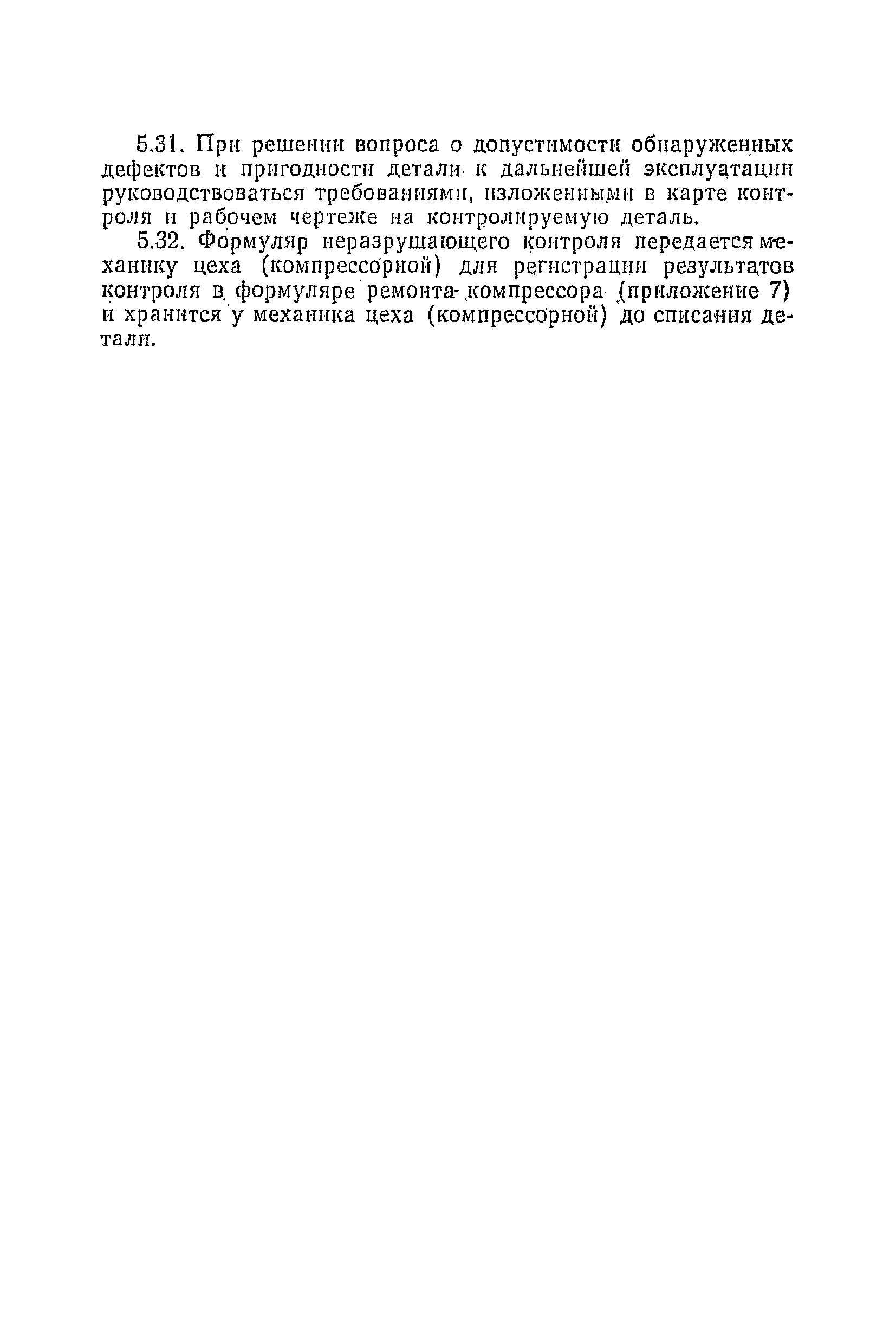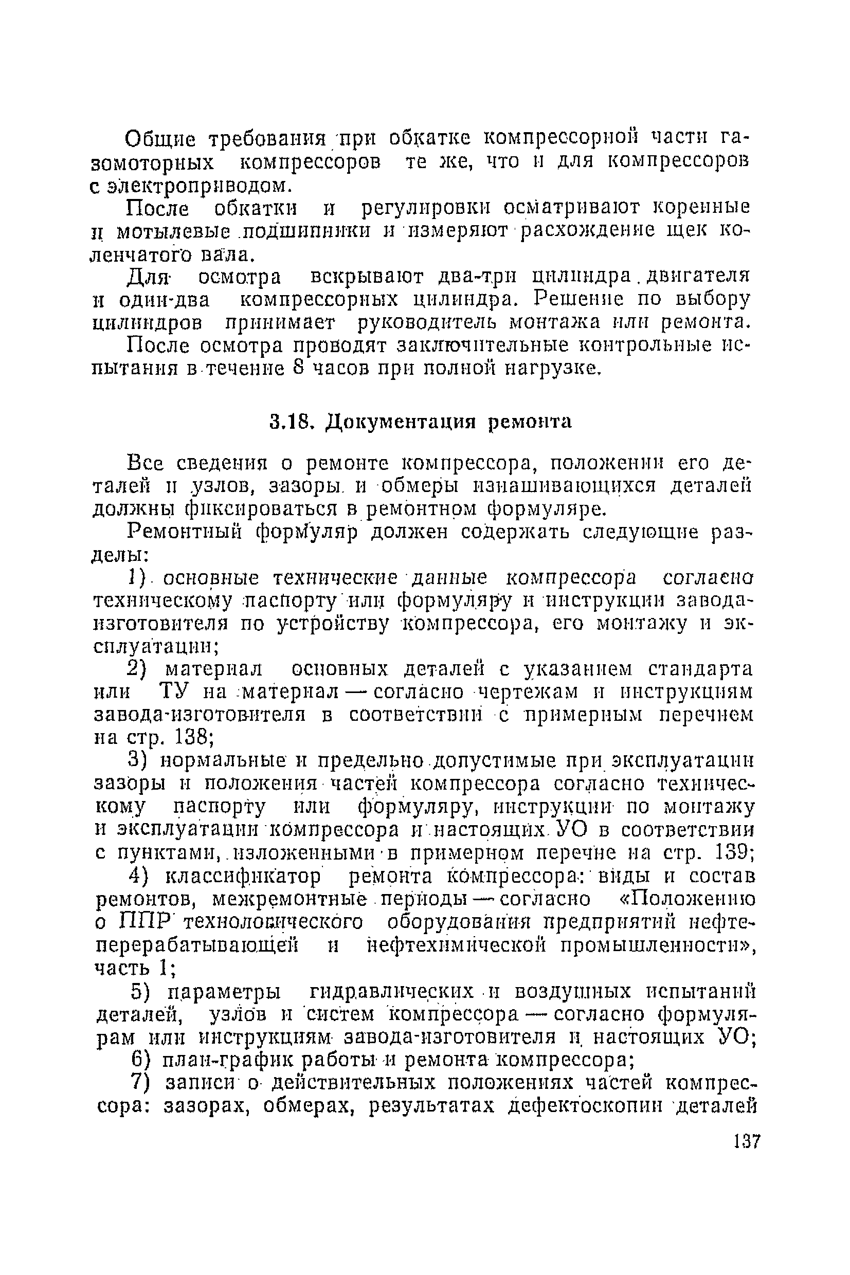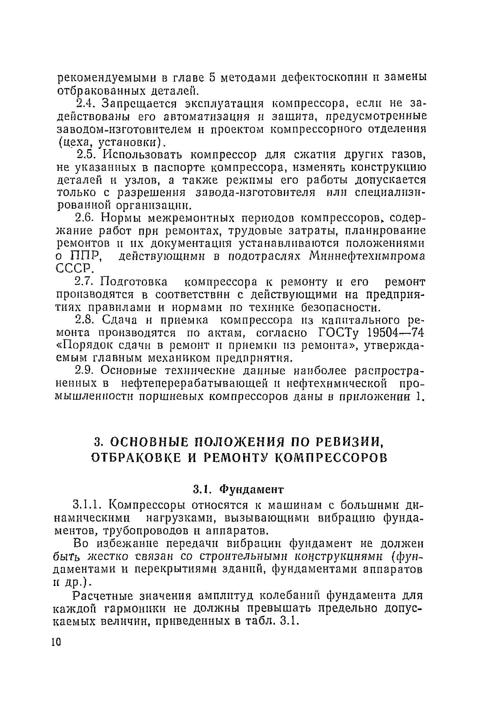 Общие технические условия по ремонту поршневых компрессоров| Статус: | справочные материалы, мп, тпр | | Название рус.: | Общие технические условия по ремонту поршневых компрессоров | | Дата добавления в базу: | 01.02.2020 | | Дата актуализации: | 01.01.2021 | | Область применения: | Технические условия являются нормативным документом для предприятий Миннефтехимпрома СССР и предназначены для работников, занятых эксплуатацией и ремонтом поршневых компрессоров. Наряду с нормативно-технической документацией заводов изготовителей и проектных организаций, технические условия являются основным документом при составлении предприятиями инструкций по эксплуатации и ремонту поршневых компрессоров. Документ устанавливает основные требования при ремонте поршневых компрессоров и распространяется на газовые, воздушные и холодильные стационарные поршневые компрессоры, выполненные на оппозитных, горизонтальных, вертикальных, прямоугольных, V и W-образных базах с конечным давлением до 50 МПа (500 кгс/см2) | | Оглавление: | Предисловие 1. Введение 2. Основные положения по эксплуатации поршневых компрессоров 3. Основные положения по ревизии, отбраковке и ремонту компрессоров 3.1. Фундамент 3.2. Рама 3.3. Коленчатый (кривошипный) вал. Подшипники вала 3.4. Выносной подшипник. Маховик 3.5. Цилиндры и цилиндровые втулки. Крышки цилиндров 3.6. Шатуны. Подшипники шатуна 3.7. Шатунные болты 3.8. Крейцкопф и детали его соединения со штоком 3.9. Штоки. Поршни и поршневые кольца 3.10. Сальниковые уплотнения 3.11. Клапаны 3.12. Система смазки 3.13. Система охлаждения 3.14. Предохранительные устройства 3.15. Сосуды, аппараты и трубопроводы компрессорного отделения (цеха, установки) 3.16. Привод компрессора 3.17. Обкатка компрессора и приемка его в эксплуатацию после капитального ремонта 3.18. Документация ремонта 4. Основные положения по ремонту газомоторных компрессоров 4.1. Приставной вал газомотокомпрессора 10ГК и его подшипник 4.2. Цилиндры и крышки газовых двигателей газомотокомпрессоров 4.3. Шатуны силовой части 4.4. Поршни газового двигателя 4.5. Распределительный вал газомотокомпрессора 8ГК, вспомогательный вал газомотокомпрессора 10ГК и их передаточный механизм 4.6, Воздухораспределители, пусковые и декомпрессионные клапаны 4.7. Топливная система 4.8. Регулятор числа оборотов 4.9. Система зажигания 5. Контроль деталей компрессоров неразрушающими методами Приложение 1. Основные технические данные компрессоров Приложение 2. Акт готовности фундамента к установке оборудования Приложение 3. Акт проверки правильности установки оборудования на фундаменте Приложение 4. Приготовление и пользование пастой "Герметик" Приложение 5. Приготовление и пользование герметиком У-30М Приложение 6. Формуляр контроля неразрушающими методами Приложение 7. Образец формуляра ремонта компрессора АДК-73/40 Список использованных источников | | Разработан: | ВНИКТИнефтехимоборудование