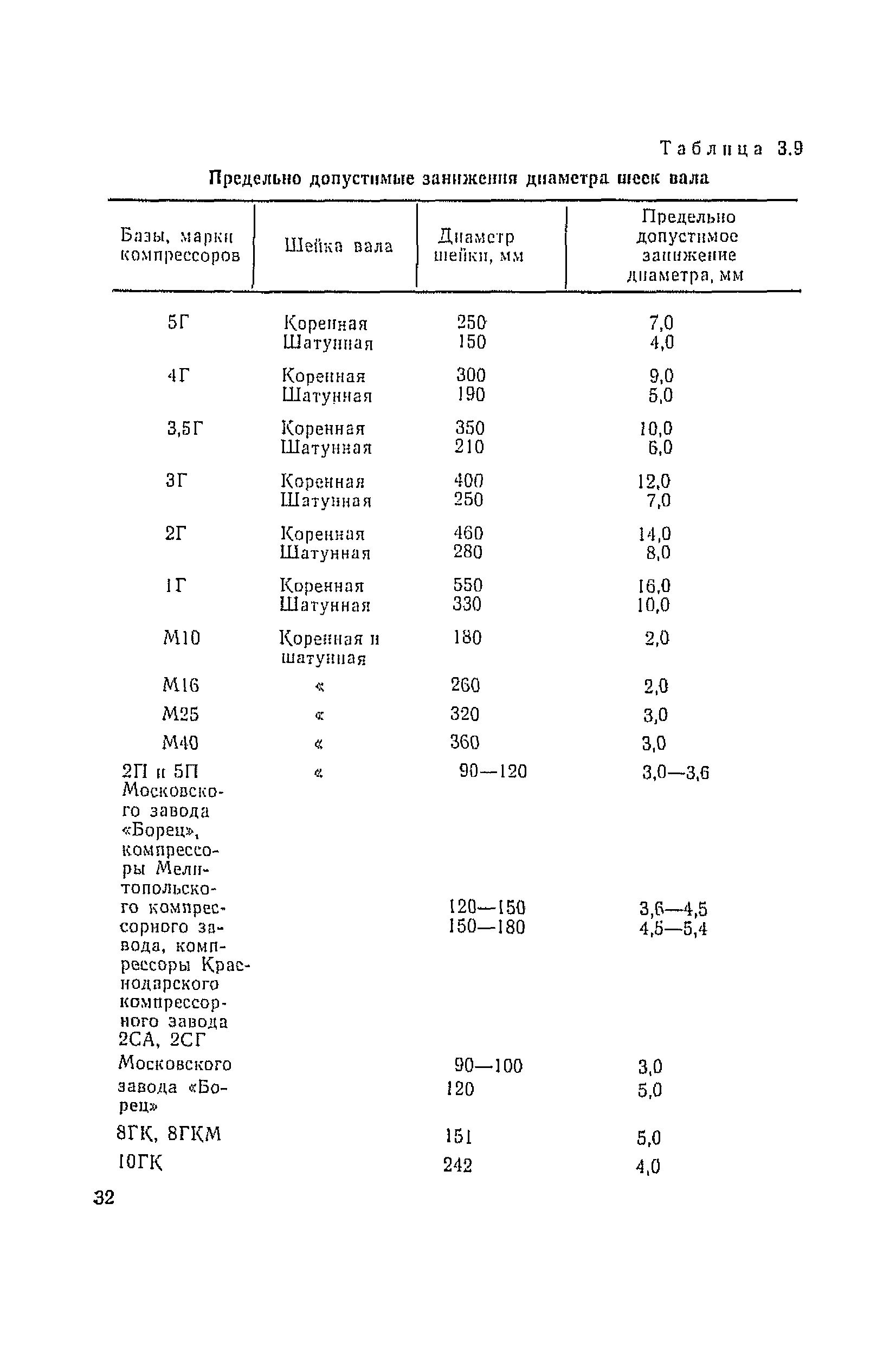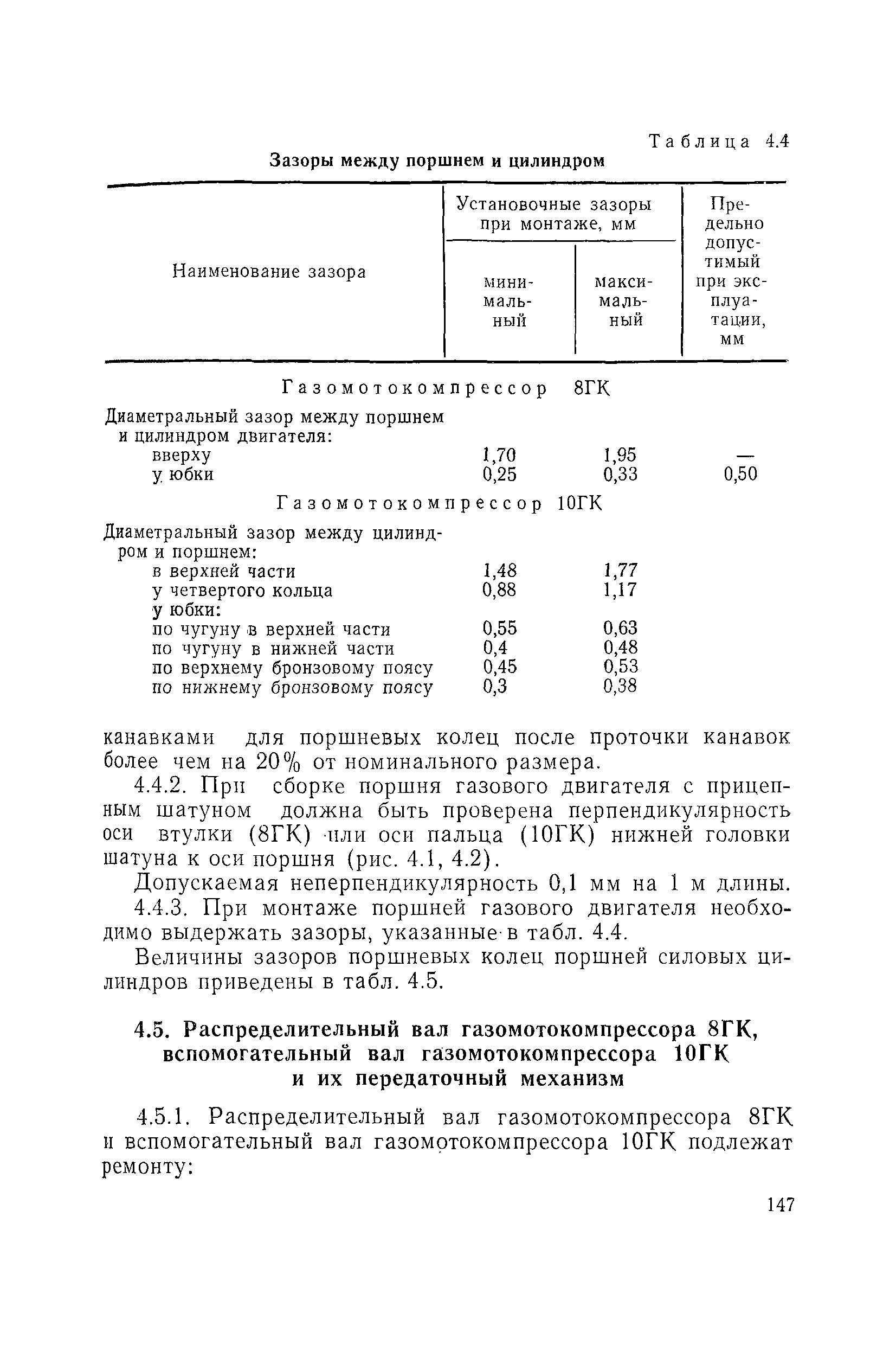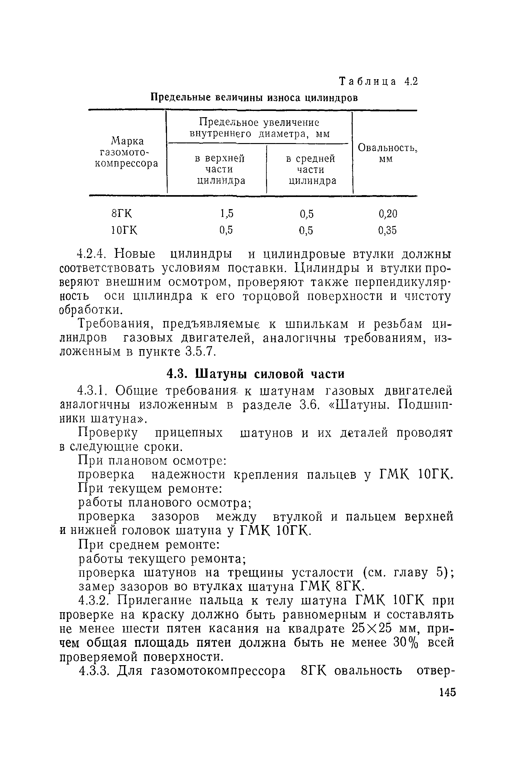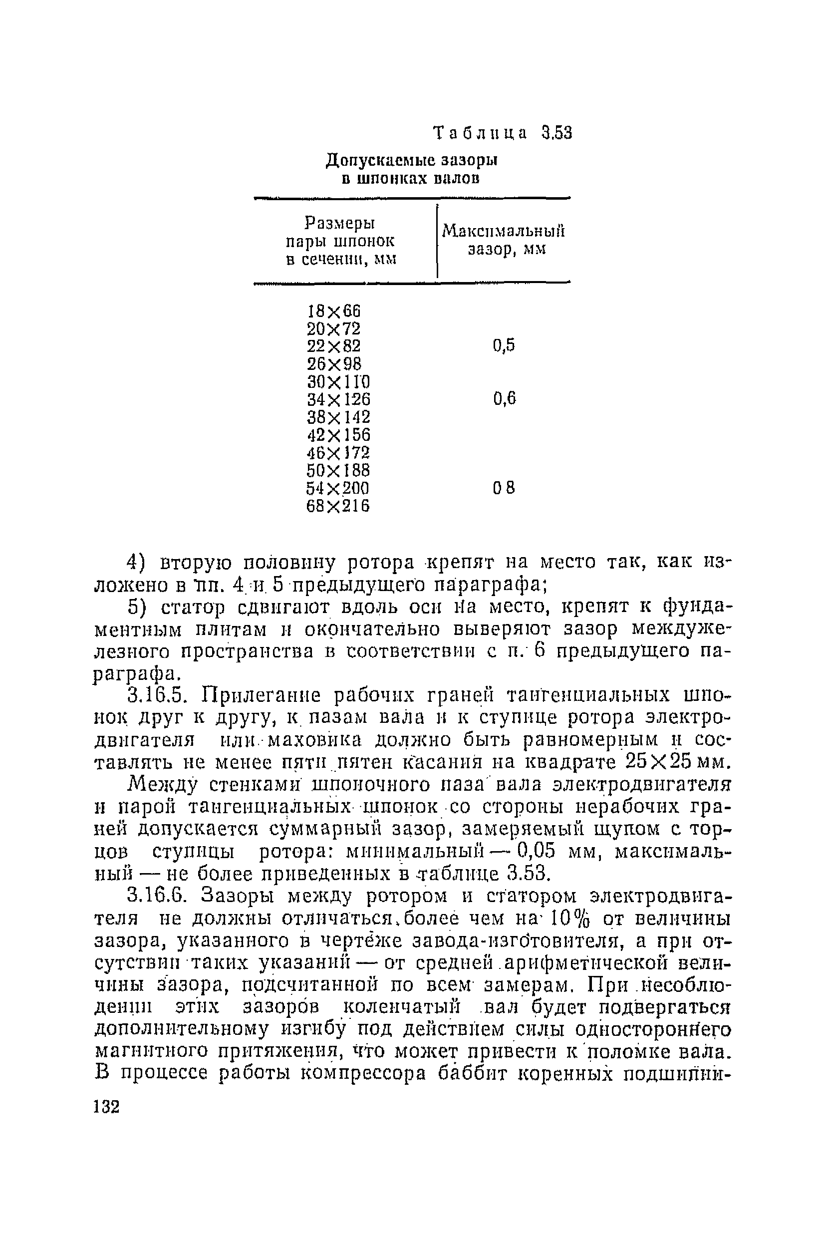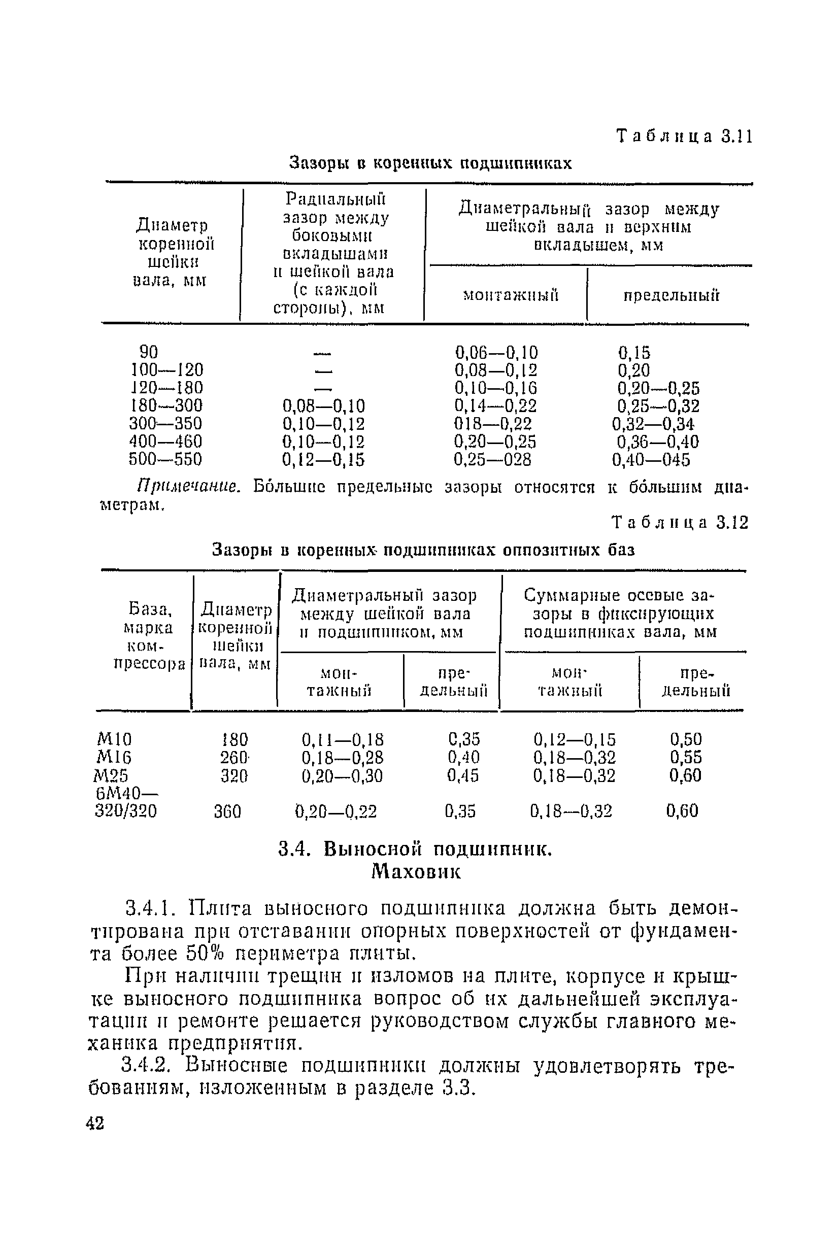 Общие технические условия по ремонту поршневых компрессоров| Статус: | справочные материалы, мп, тпр | | Название рус.: | Общие технические условия по ремонту поршневых компрессоров | | Дата добавления в базу: | 01.02.2020 | | Дата актуализации: | 01.01.2021 | | Область применения: | Технические условия являются нормативным документом для предприятий Миннефтехимпрома СССР и предназначены для работников, занятых эксплуатацией и ремонтом поршневых компрессоров. Наряду с нормативно-технической документацией заводов изготовителей и проектных организаций, технические условия являются основным документом при составлении предприятиями инструкций по эксплуатации и ремонту поршневых компрессоров. Документ устанавливает основные требования при ремонте поршневых компрессоров и распространяется на газовые, воздушные и холодильные стационарные поршневые компрессоры, выполненные на оппозитных, горизонтальных, вертикальных, прямоугольных, V и W-образных базах с конечным давлением до 50 МПа (500 кгс/см2) | | Оглавление: | Предисловие 1. Введение 2. Основные положения по эксплуатации поршневых компрессоров 3. Основные положения по ревизии, отбраковке и ремонту компрессоров 3.1. Фундамент 3.2. Рама 3.3. Коленчатый (кривошипный) вал. Подшипники вала 3.4. Выносной подшипник. Маховик 3.5. Цилиндры и цилиндровые втулки. Крышки цилиндров 3.6. Шатуны. Подшипники шатуна 3.7. Шатунные болты 3.8. Крейцкопф и детали его соединения со штоком 3.9. Штоки. Поршни и поршневые кольца 3.10. Сальниковые уплотнения 3.11. Клапаны 3.12. Система смазки 3.13. Система охлаждения 3.14. Предохранительные устройства 3.15. Сосуды, аппараты и трубопроводы компрессорного отделения (цеха, установки) 3.16. Привод компрессора 3.17. Обкатка компрессора и приемка его в эксплуатацию после капитального ремонта 3.18. Документация ремонта 4. Основные положения по ремонту газомоторных компрессоров 4.1. Приставной вал газомотокомпрессора 10ГК и его подшипник 4.2. Цилиндры и крышки газовых двигателей газомотокомпрессоров 4.3. Шатуны силовой части 4.4. Поршни газового двигателя 4.5. Распределительный вал газомотокомпрессора 8ГК, вспомогательный вал газомотокомпрессора 10ГК и их передаточный механизм 4.6, Воздухораспределители, пусковые и декомпрессионные клапаны 4.7. Топливная система 4.8. Регулятор числа оборотов 4.9. Система зажигания 5. Контроль деталей компрессоров неразрушающими методами Приложение 1. Основные технические данные компрессоров Приложение 2. Акт готовности фундамента к установке оборудования Приложение 3. Акт проверки правильности установки оборудования на фундаменте Приложение 4. Приготовление и пользование пастой "Герметик" Приложение 5. Приготовление и пользование герметиком У-30М Приложение 6. Формуляр контроля неразрушающими методами Приложение 7. Образец формуляра ремонта компрессора АДК-73/40 Список использованных источников | | Разработан: | ВНИКТИнефтехимоборудование