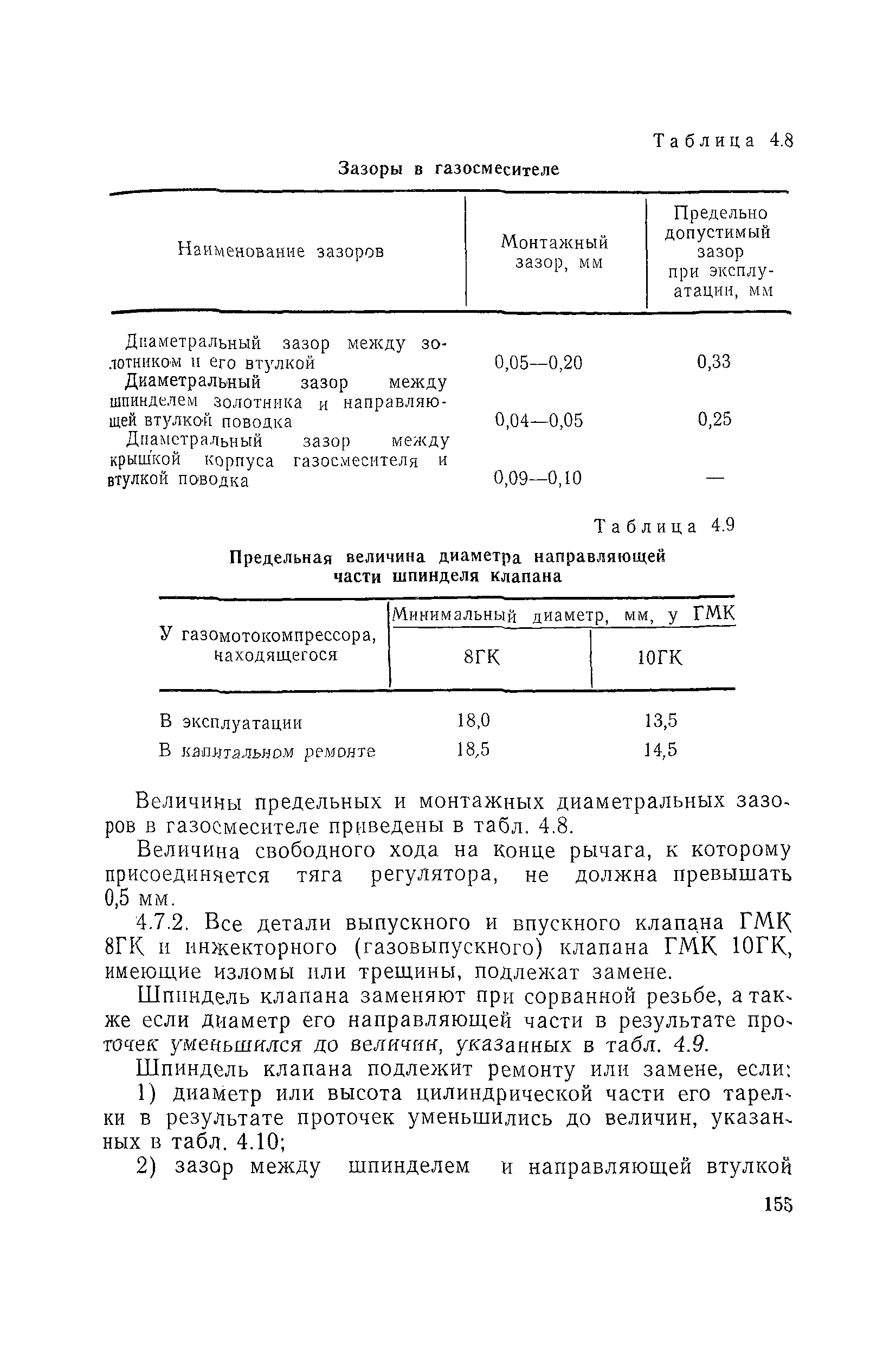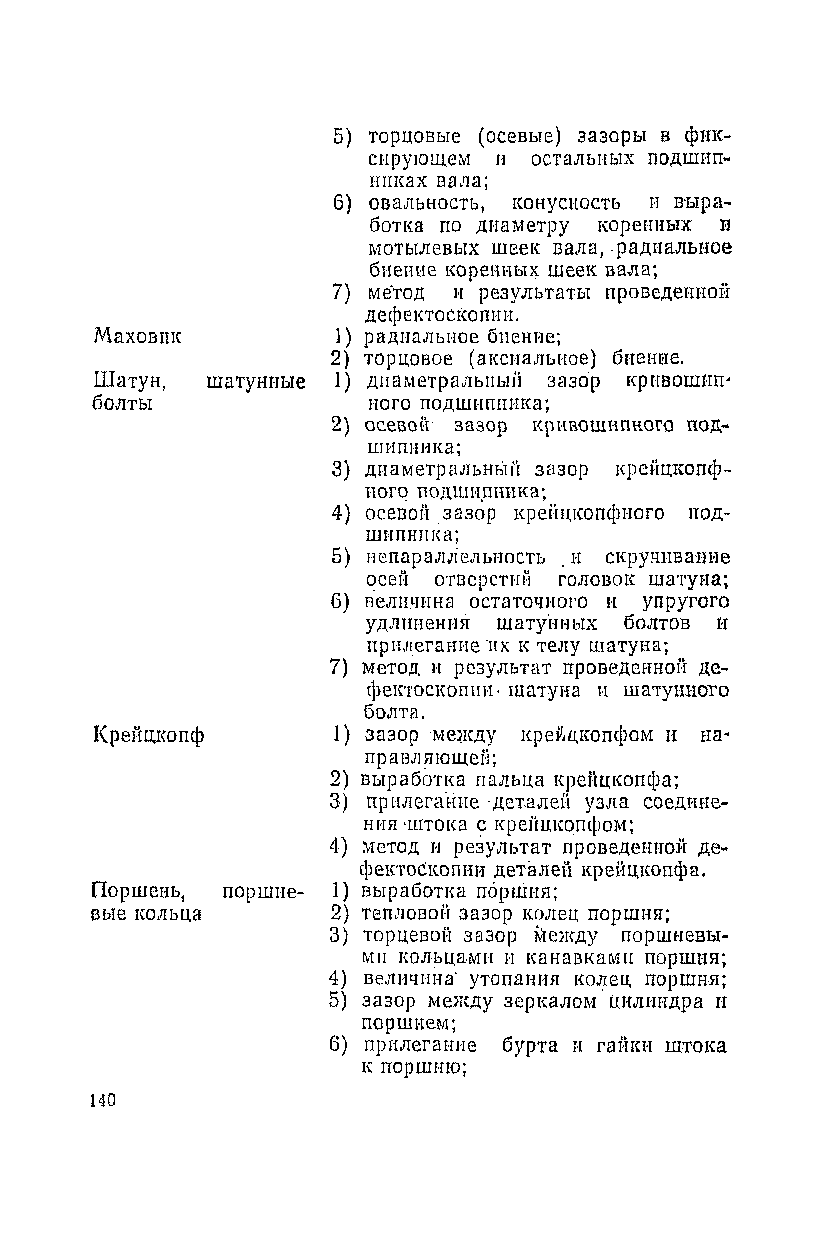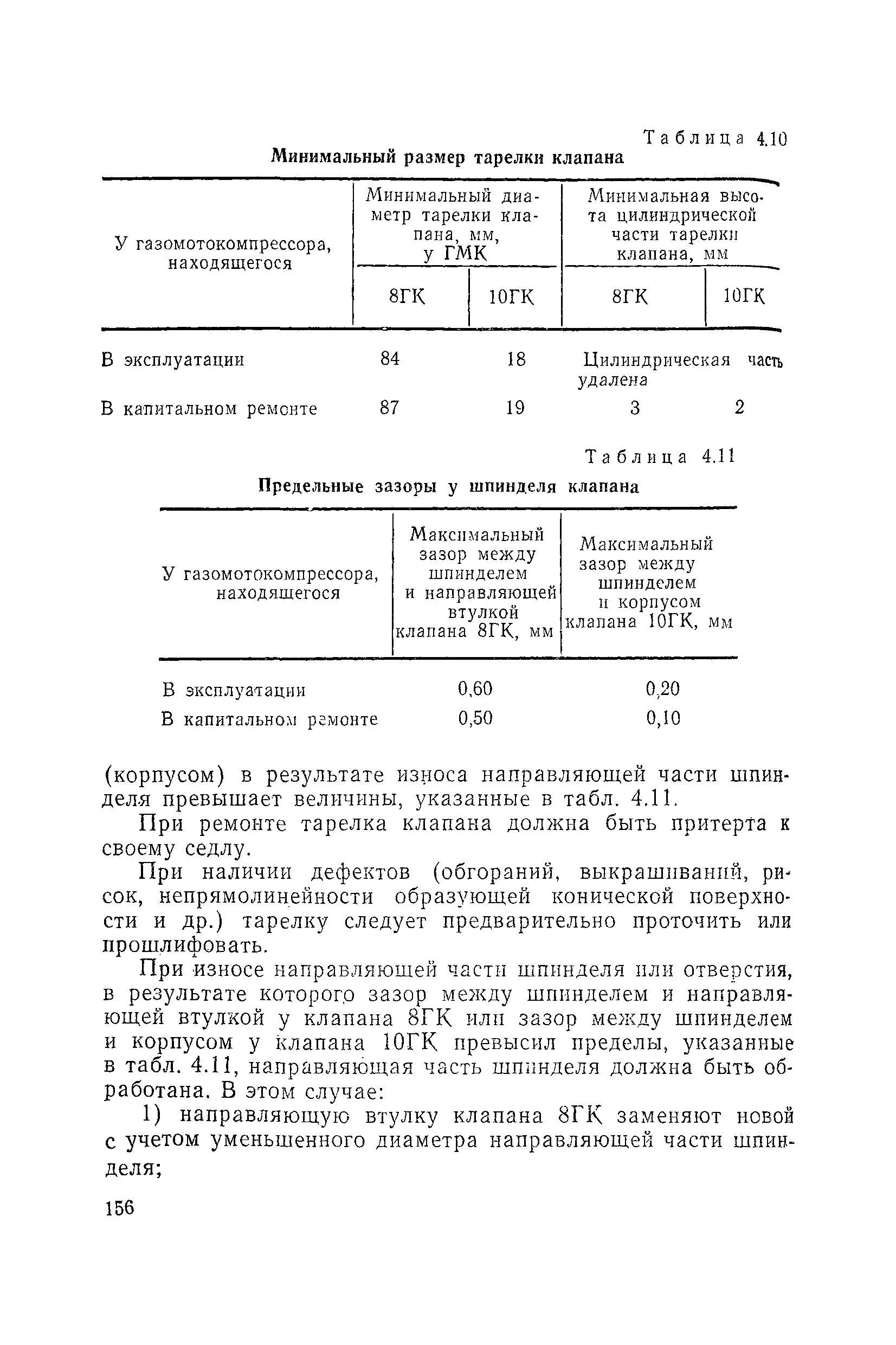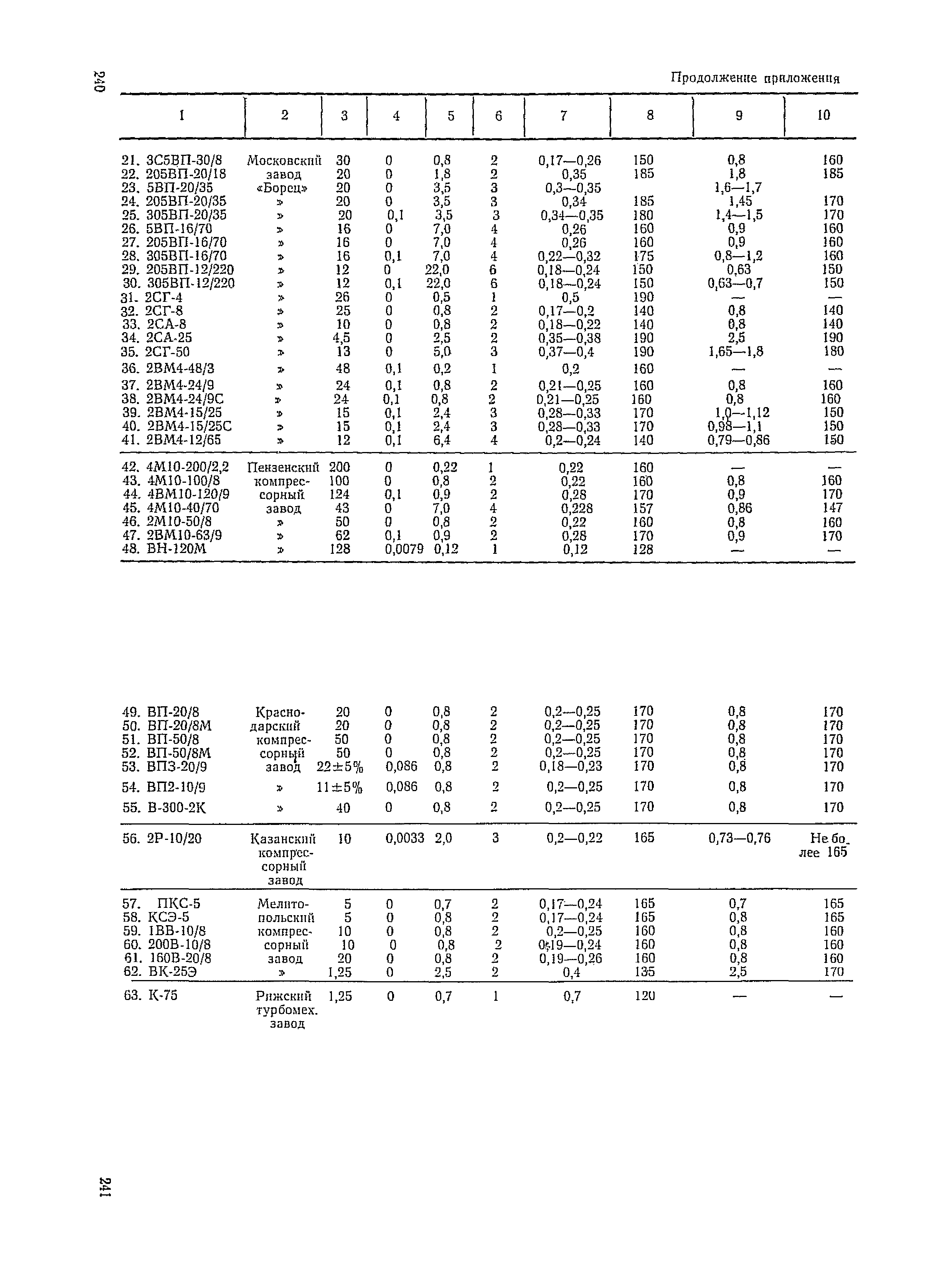 Общие технические условия по ремонту поршневых компрессоров| Статус: | справочные материалы, мп, тпр | | Название рус.: | Общие технические условия по ремонту поршневых компрессоров | | Дата добавления в базу: | 01.02.2020 | | Дата актуализации: | 01.01.2021 | | Область применения: | Технические условия являются нормативным документом для предприятий Миннефтехимпрома СССР и предназначены для работников, занятых эксплуатацией и ремонтом поршневых компрессоров. Наряду с нормативно-технической документацией заводов изготовителей и проектных организаций, технические условия являются основным документом при составлении предприятиями инструкций по эксплуатации и ремонту поршневых компрессоров. Документ устанавливает основные требования при ремонте поршневых компрессоров и распространяется на газовые, воздушные и холодильные стационарные поршневые компрессоры, выполненные на оппозитных, горизонтальных, вертикальных, прямоугольных, V и W-образных базах с конечным давлением до 50 МПа (500 кгс/см2) | | Оглавление: | Предисловие 1. Введение 2. Основные положения по эксплуатации поршневых компрессоров 3. Основные положения по ревизии, отбраковке и ремонту компрессоров 3.1. Фундамент 3.2. Рама 3.3. Коленчатый (кривошипный) вал. Подшипники вала 3.4. Выносной подшипник. Маховик 3.5. Цилиндры и цилиндровые втулки. Крышки цилиндров 3.6. Шатуны. Подшипники шатуна 3.7. Шатунные болты 3.8. Крейцкопф и детали его соединения со штоком 3.9. Штоки. Поршни и поршневые кольца 3.10. Сальниковые уплотнения 3.11. Клапаны 3.12. Система смазки 3.13. Система охлаждения 3.14. Предохранительные устройства 3.15. Сосуды, аппараты и трубопроводы компрессорного отделения (цеха, установки) 3.16. Привод компрессора 3.17. Обкатка компрессора и приемка его в эксплуатацию после капитального ремонта 3.18. Документация ремонта 4. Основные положения по ремонту газомоторных компрессоров 4.1. Приставной вал газомотокомпрессора 10ГК и его подшипник 4.2. Цилиндры и крышки газовых двигателей газомотокомпрессоров 4.3. Шатуны силовой части 4.4. Поршни газового двигателя 4.5. Распределительный вал газомотокомпрессора 8ГК, вспомогательный вал газомотокомпрессора 10ГК и их передаточный механизм 4.6, Воздухораспределители, пусковые и декомпрессионные клапаны 4.7. Топливная система 4.8. Регулятор числа оборотов 4.9. Система зажигания 5. Контроль деталей компрессоров неразрушающими методами Приложение 1. Основные технические данные компрессоров Приложение 2. Акт готовности фундамента к установке оборудования Приложение 3. Акт проверки правильности установки оборудования на фундаменте Приложение 4. Приготовление и пользование пастой "Герметик" Приложение 5. Приготовление и пользование герметиком У-30М Приложение 6. Формуляр контроля неразрушающими методами Приложение 7. Образец формуляра ремонта компрессора АДК-73/40 Список использованных источников | | Разработан: | ВНИКТИнефтехимоборудование