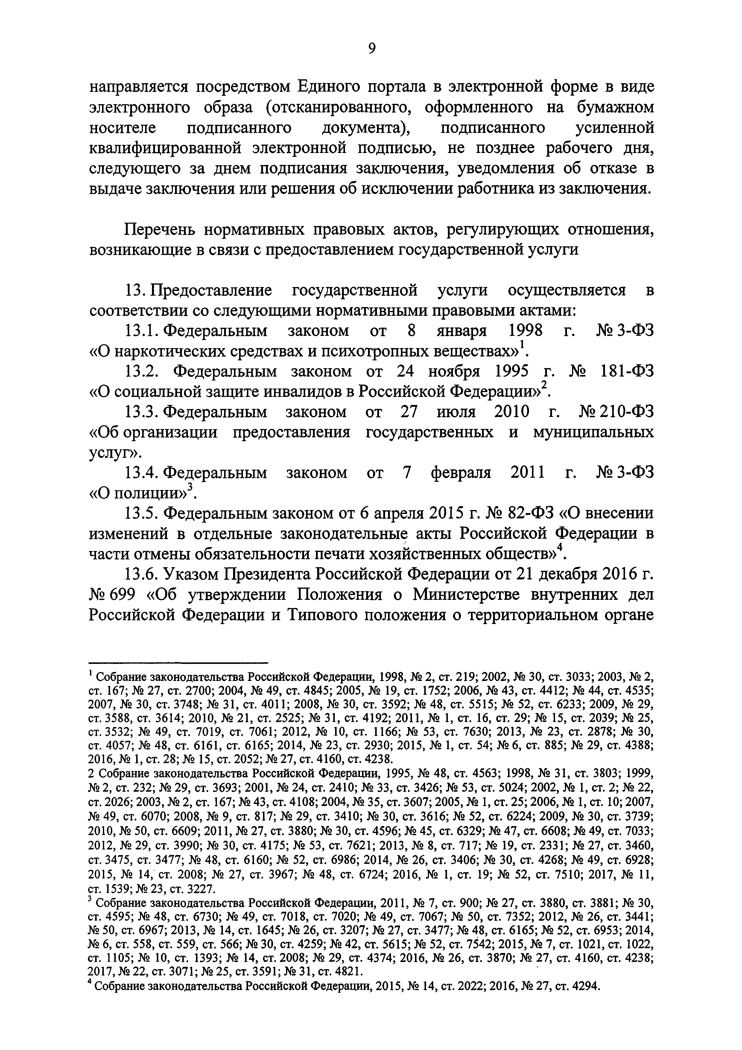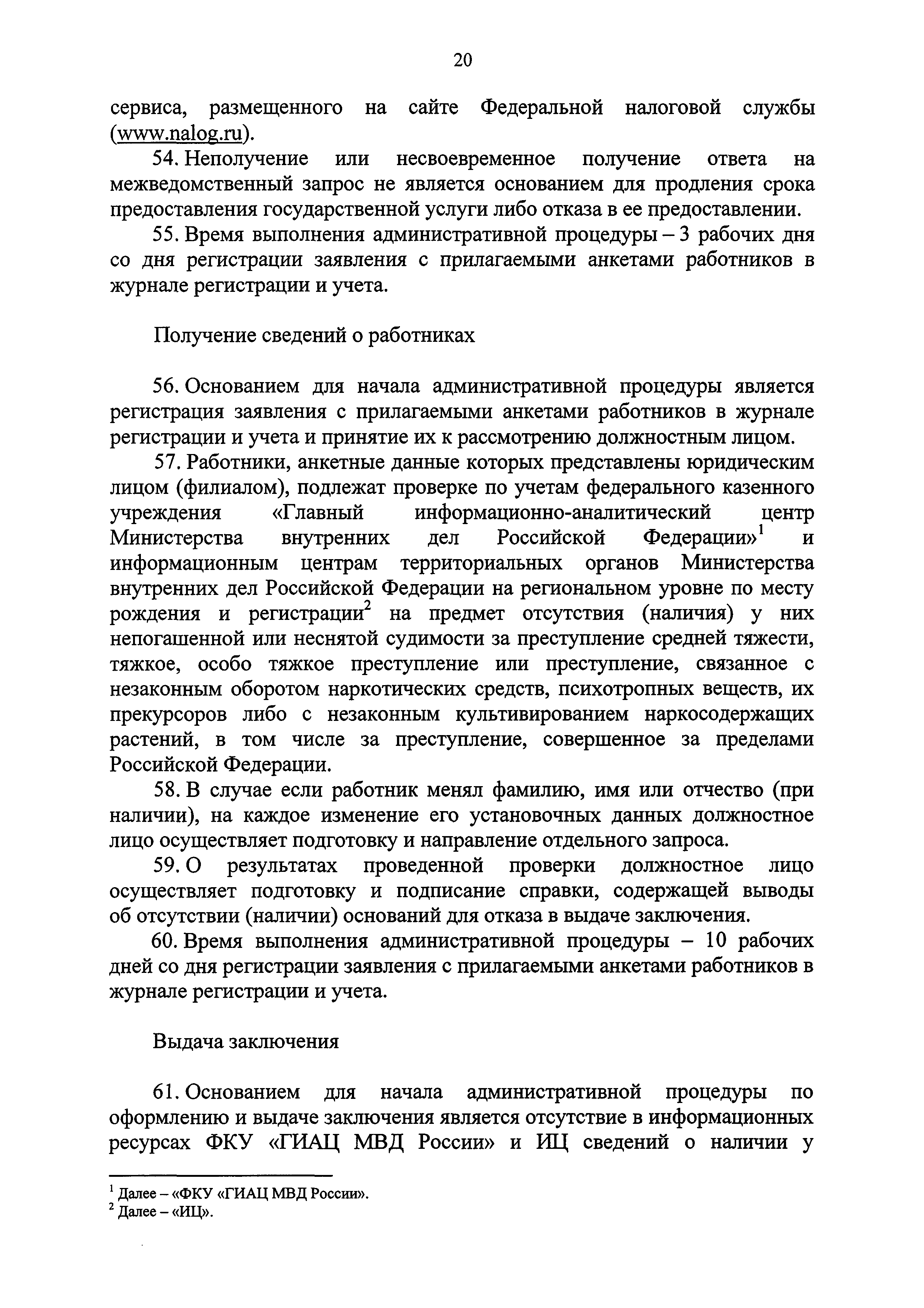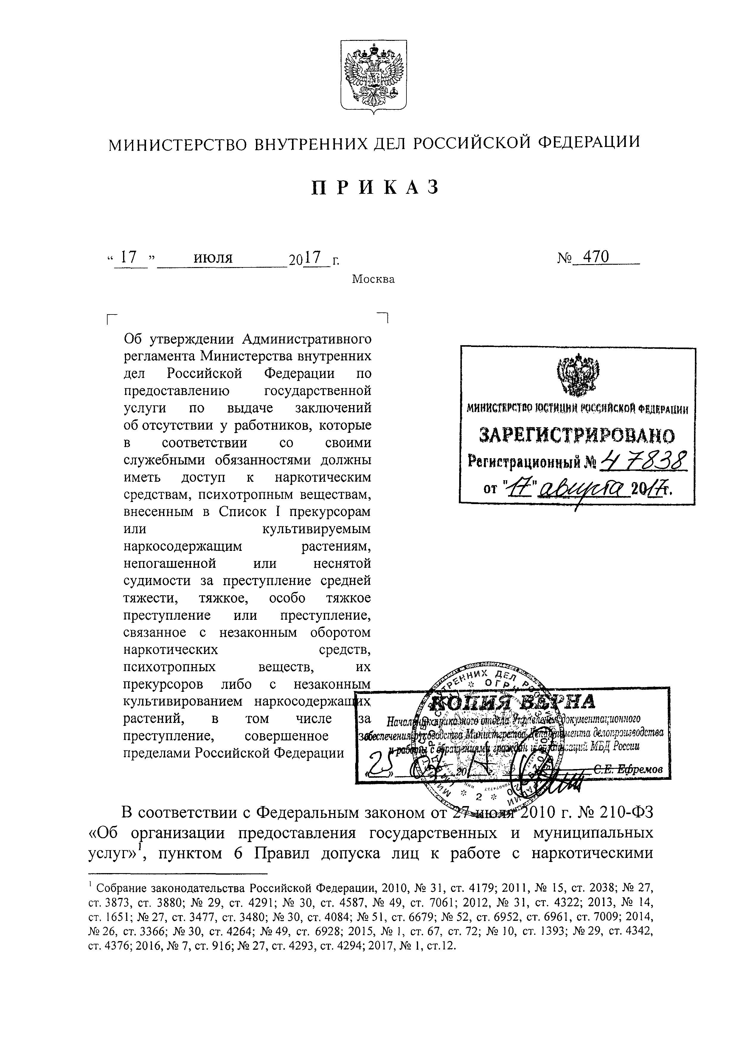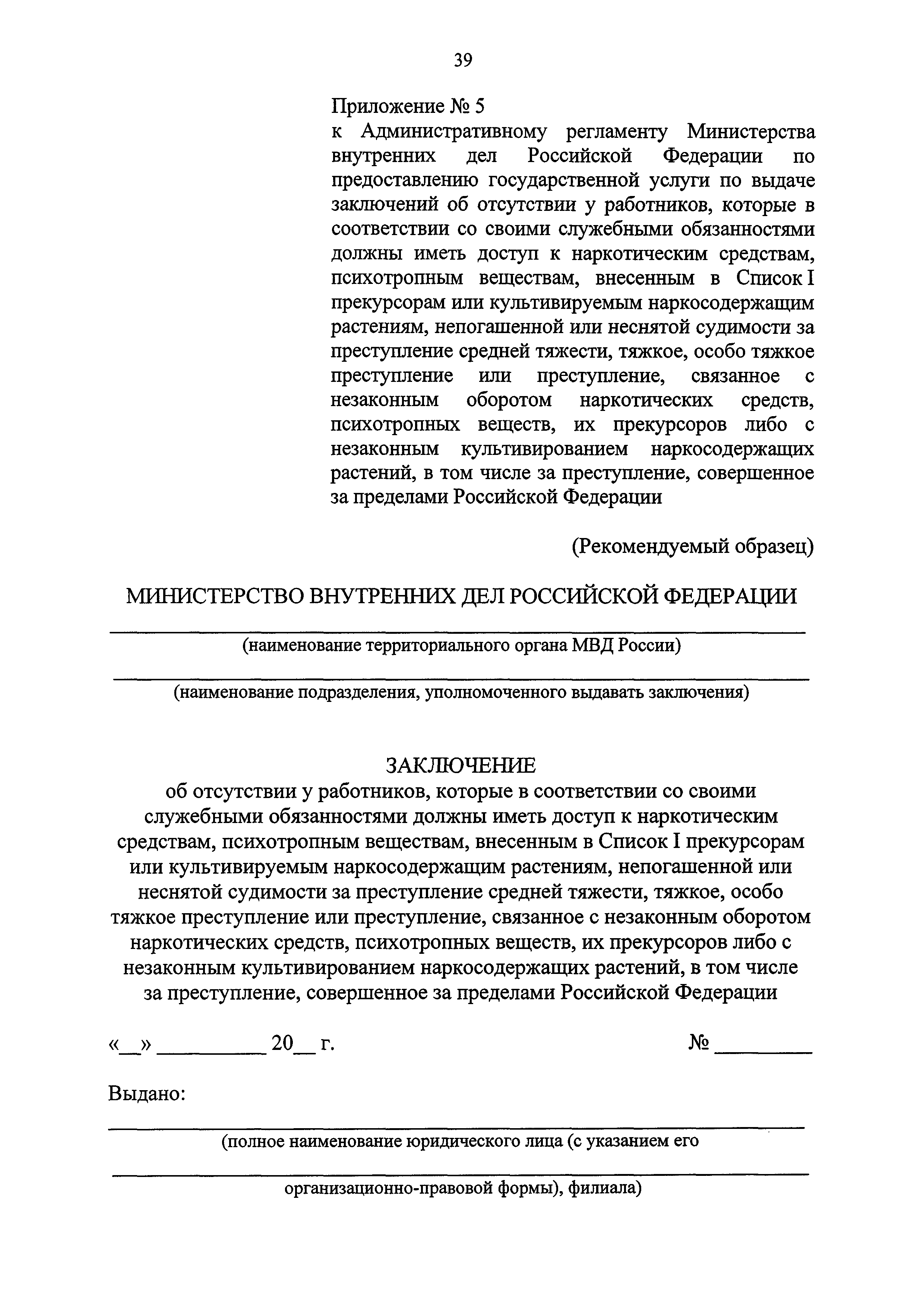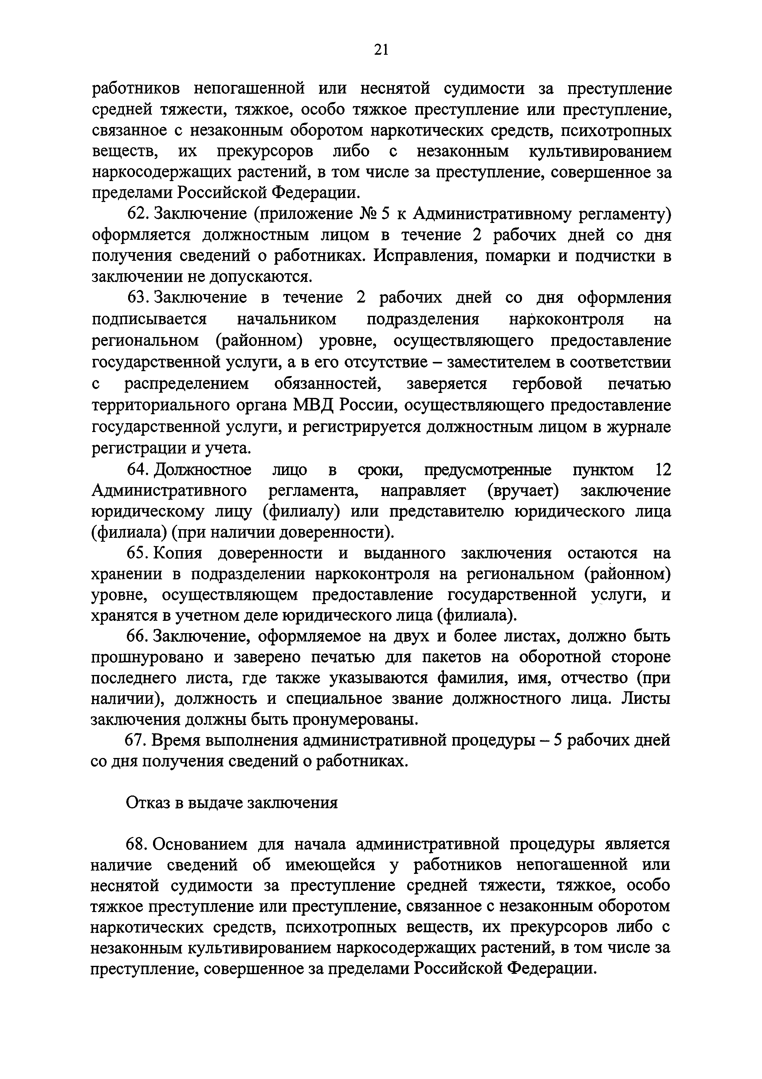 | Название рус.: | Административный регламент Министерства внутренних дел Российской Федерации по предоставлению государственной услуги по выдаче заключений об отсутствии у работников, которые в соответствии со своими служебными обязанностями должны иметь доступ к наркотическим средствам, психотропным веществам, внесенным в Список 1 прекурсорам или культивируемым наркосодержащим растениям, непогашенной или неснятой судимости за преступление средней тяжести, тяжкое, особо тяжкое преступление или преступление, связанное с незаконным оборотом наркотических средств, психотропных веществ, их прекурсоров либо с незаконным культивированием наркосодержащих растений, в том числе преступление, совершенное за пределами Российской Федерации |