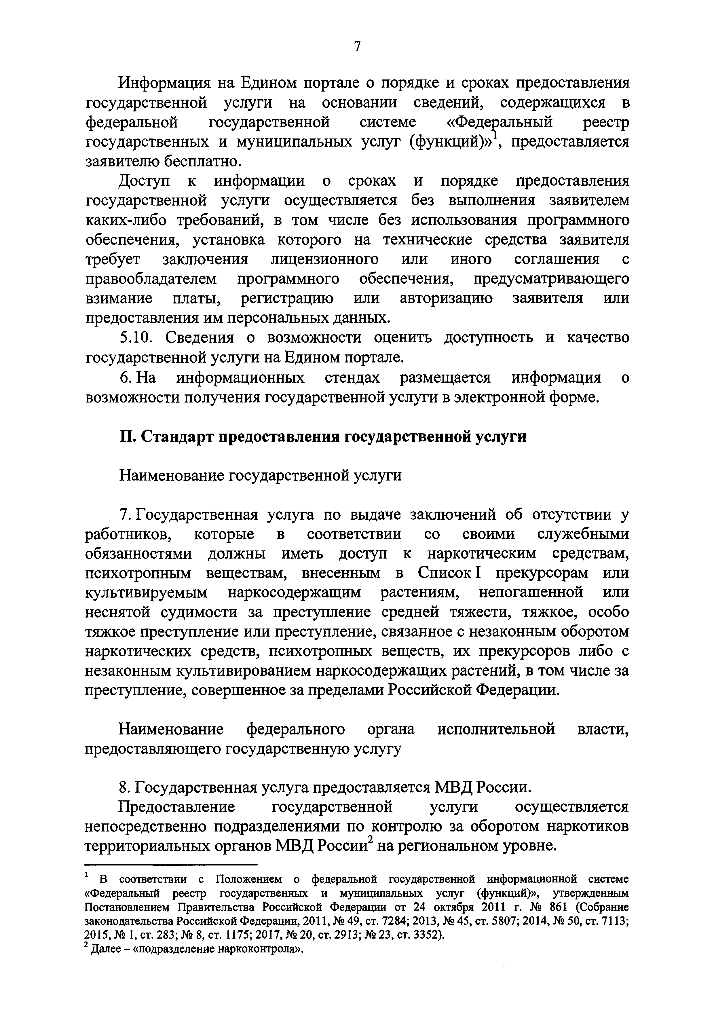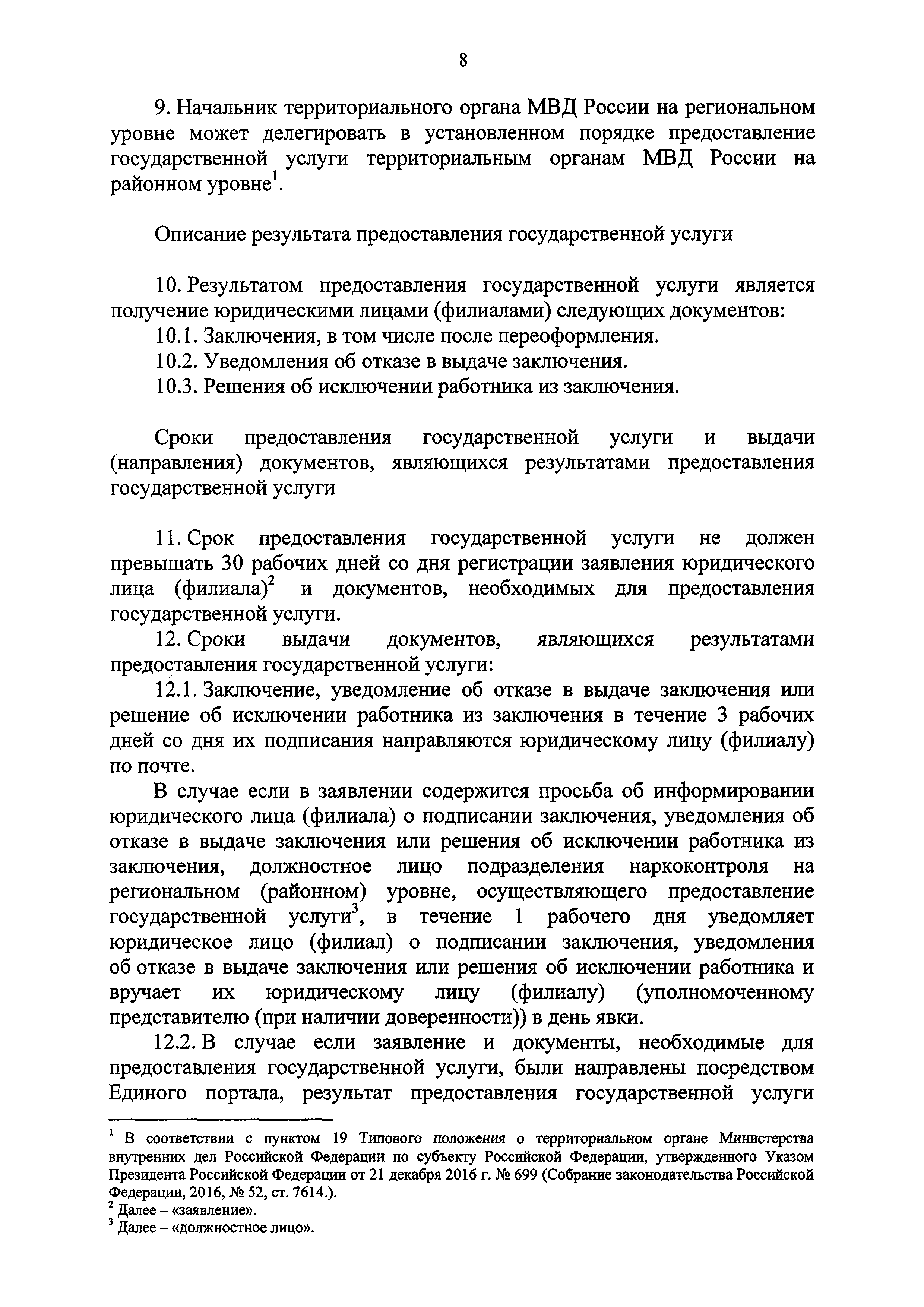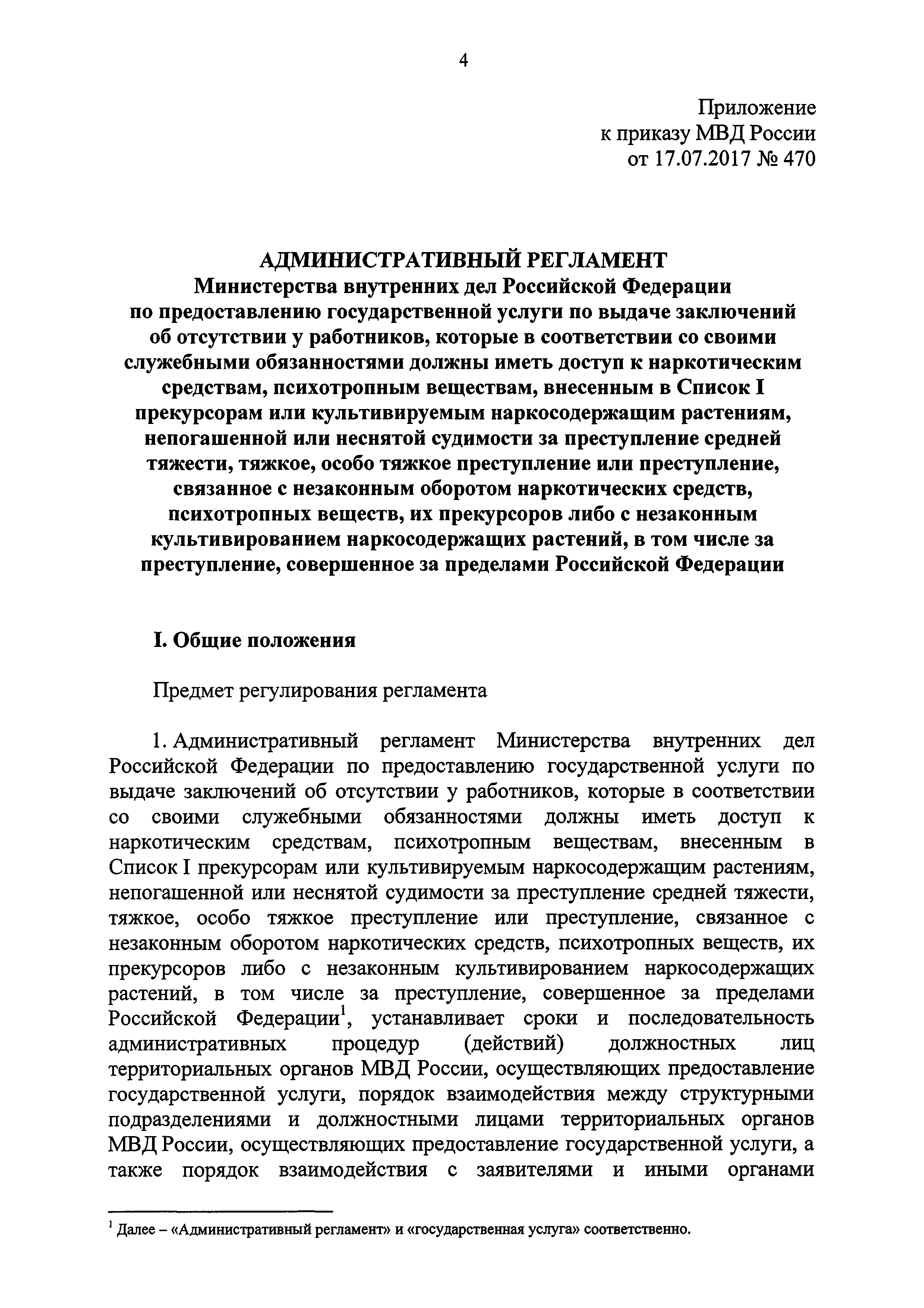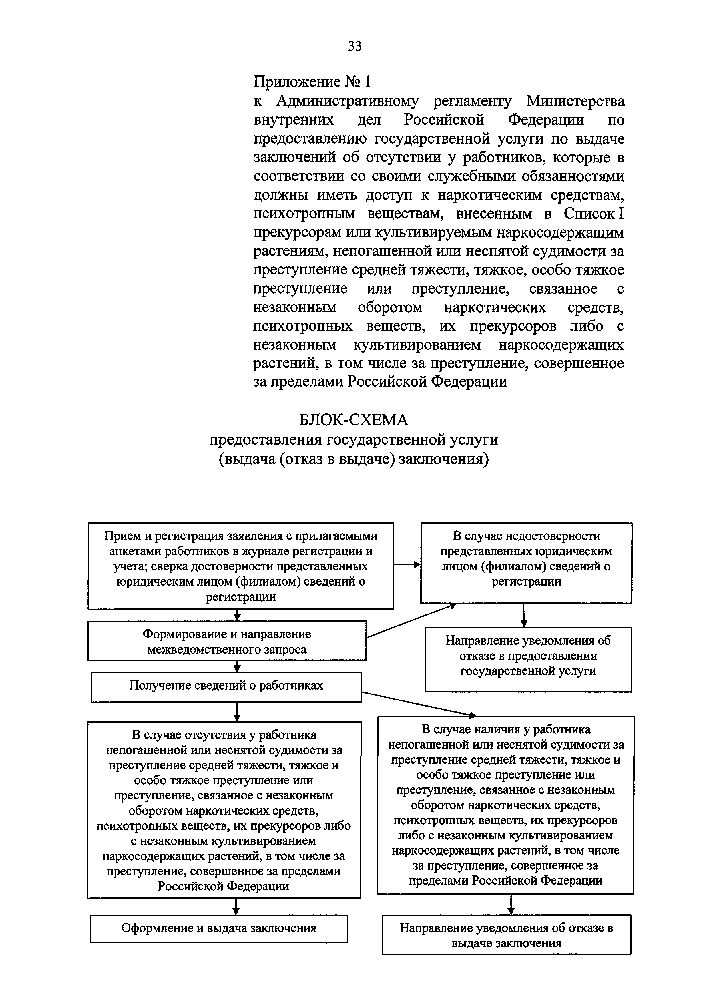 | Область применения: | Административный регламент Министерства внутренних дел Российской Федерации по предоставлению государственной услуги по выдаче заключений об отсутствии у работников, которые в соответствии со своими служебными обязанностями должны иметь доступ к наркотическим средствам, психотропным веществам, внесенным в Список I прекурсорам или культивируемым наркосодержащим растениям, непогашенной или неснятой судимости за преступление средней тяжести, тяжкое, особо тяжкое преступление или преступление, связанное с незаконным оборотом наркотических средств, психотропных веществ, их прекурсоров либо с незаконным культивированием наркосодержащих растений, в том числе за преступление, совершенное за пределами Российской Федерации, устанавливает сроки и последовательность административных процедур (действий) должностных лиц территориальных органов МВД России, осуществляющих предоставление государственной услуги, порядок взаимодействия между структурными подразделениями и должностными лицами территориальных органов МВД России, осуществляющих предоставление государственной услуги, а также порядок взаимодействия с заявителями и иными органами государственной власти, участвующими в предоставлении государственной услуги по выдаче заключений об отсутствии у работников, которые в соответствии со своими служебными обязанностями должны иметь доступ к наркотическим средствам, психотропным веществам, внесенным в Список I прекурсорам или культивируемым наркосодержащим растениям, непогашенной или неснятой судимости за преступление средней тяжести, тяжкое, особо тяжкое преступление или преступление, связанное с незаконным оборотом наркотических средств, психотропных веществ, их прекурсоров либо с незаконным культивированием наркосодержащих растений, в том числе за преступление, совершенное за пределами Российской Федерации |
