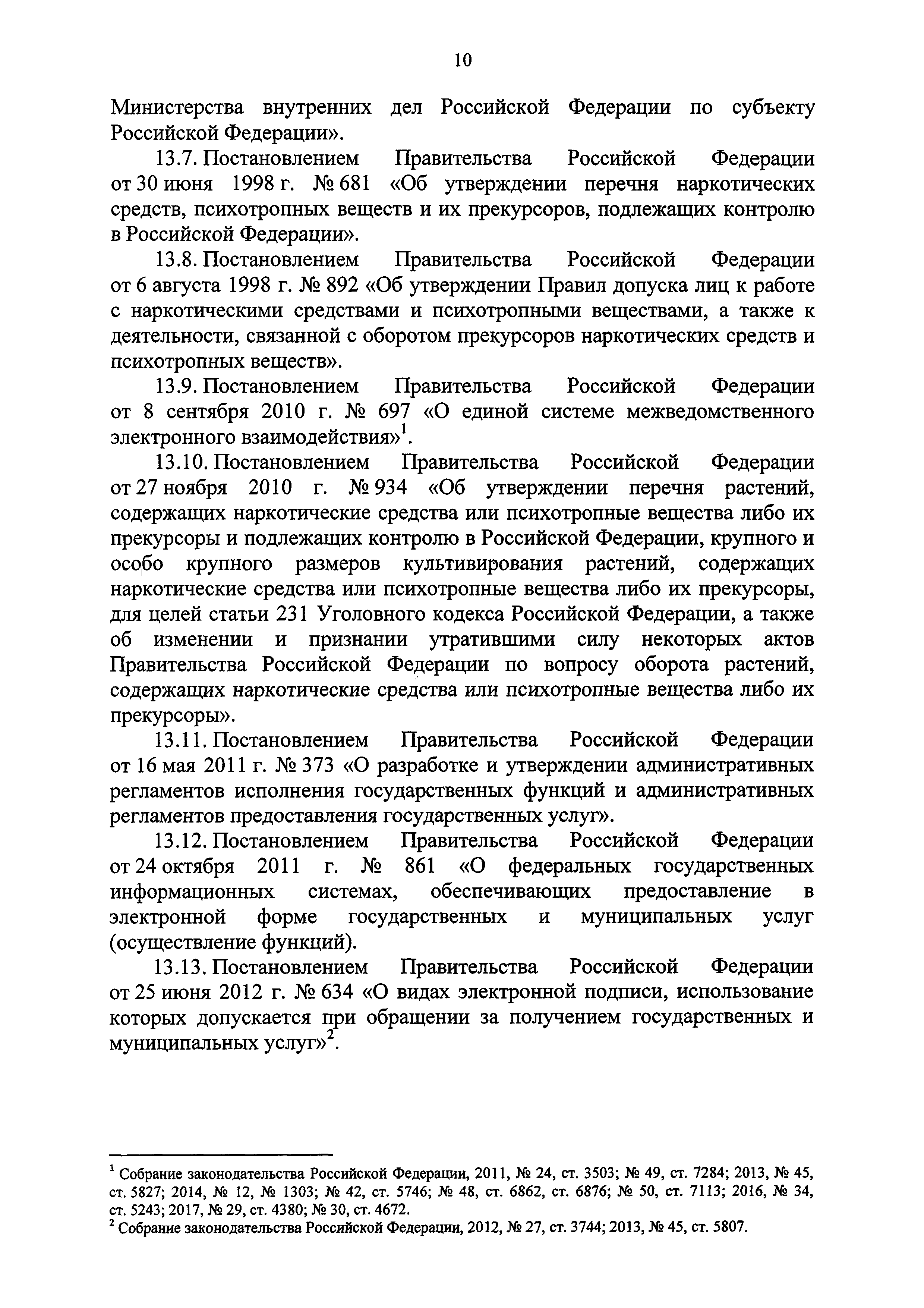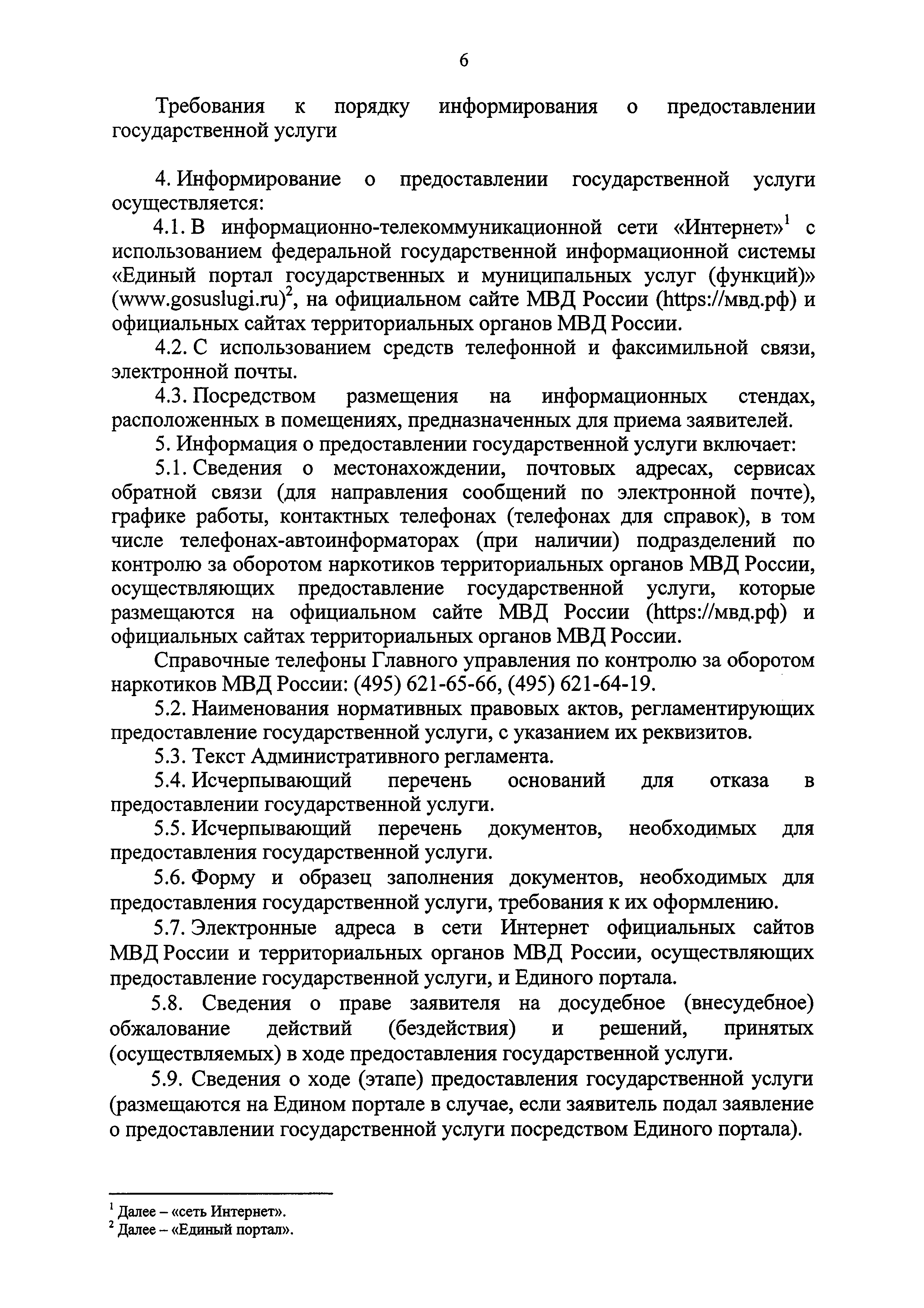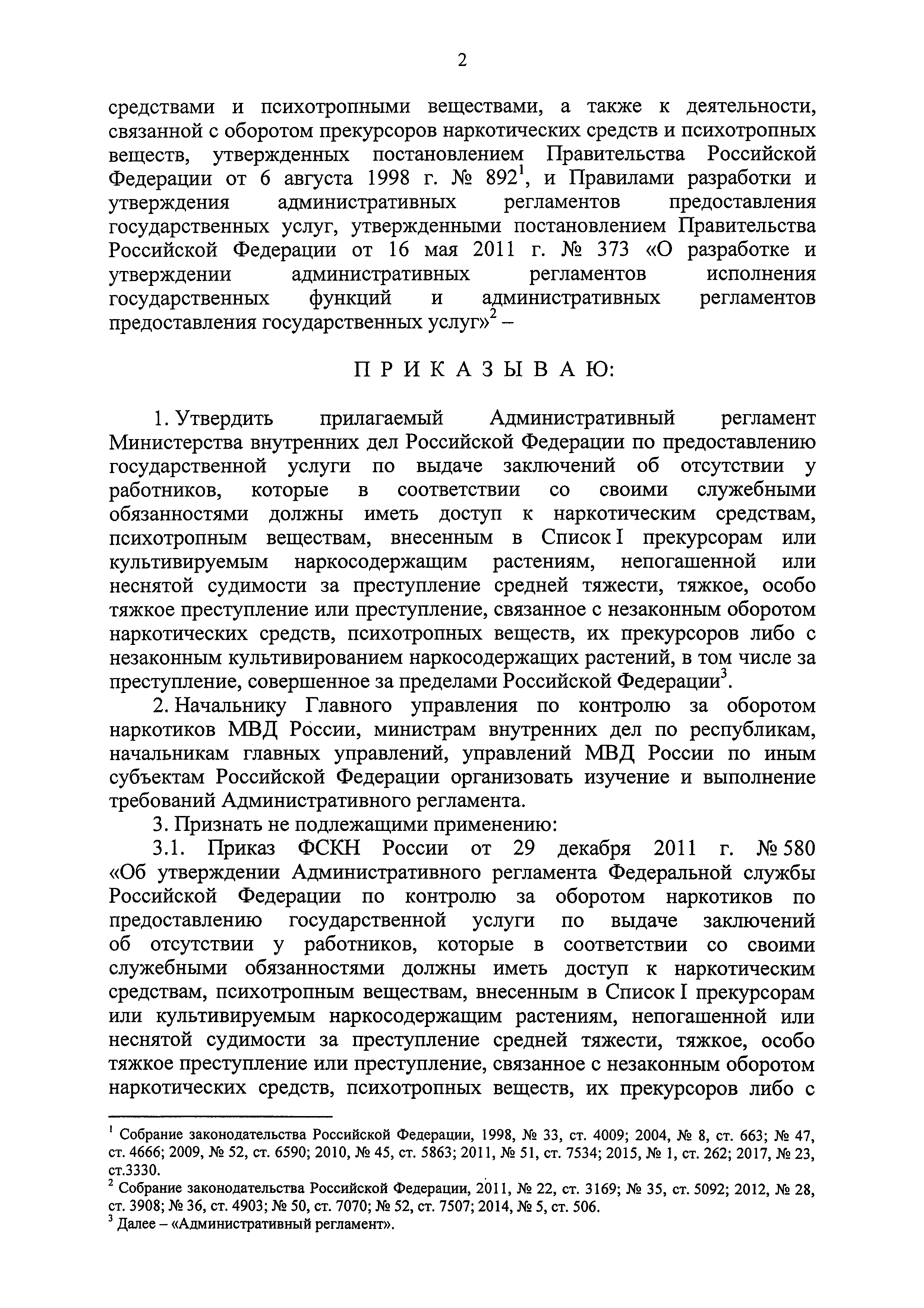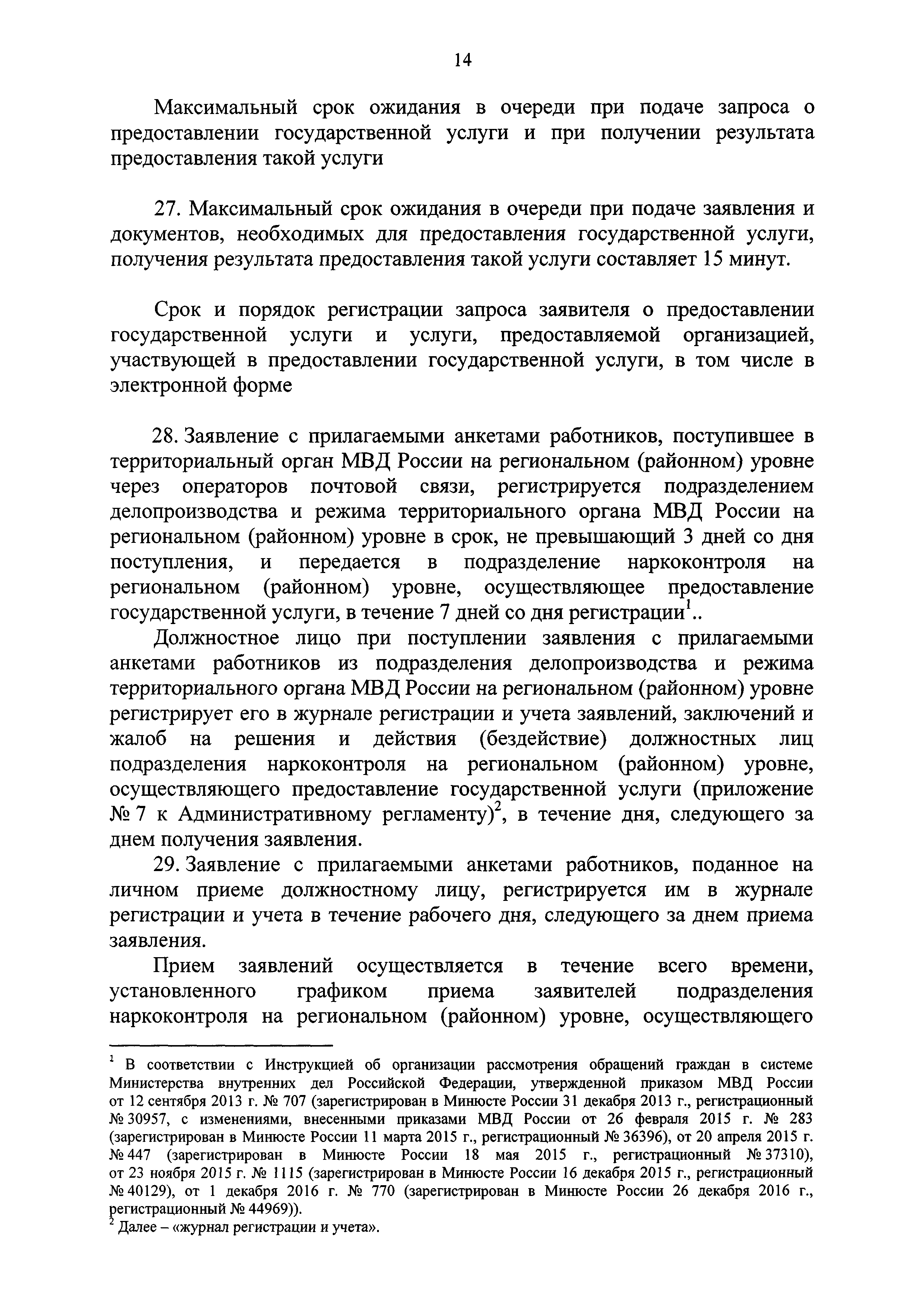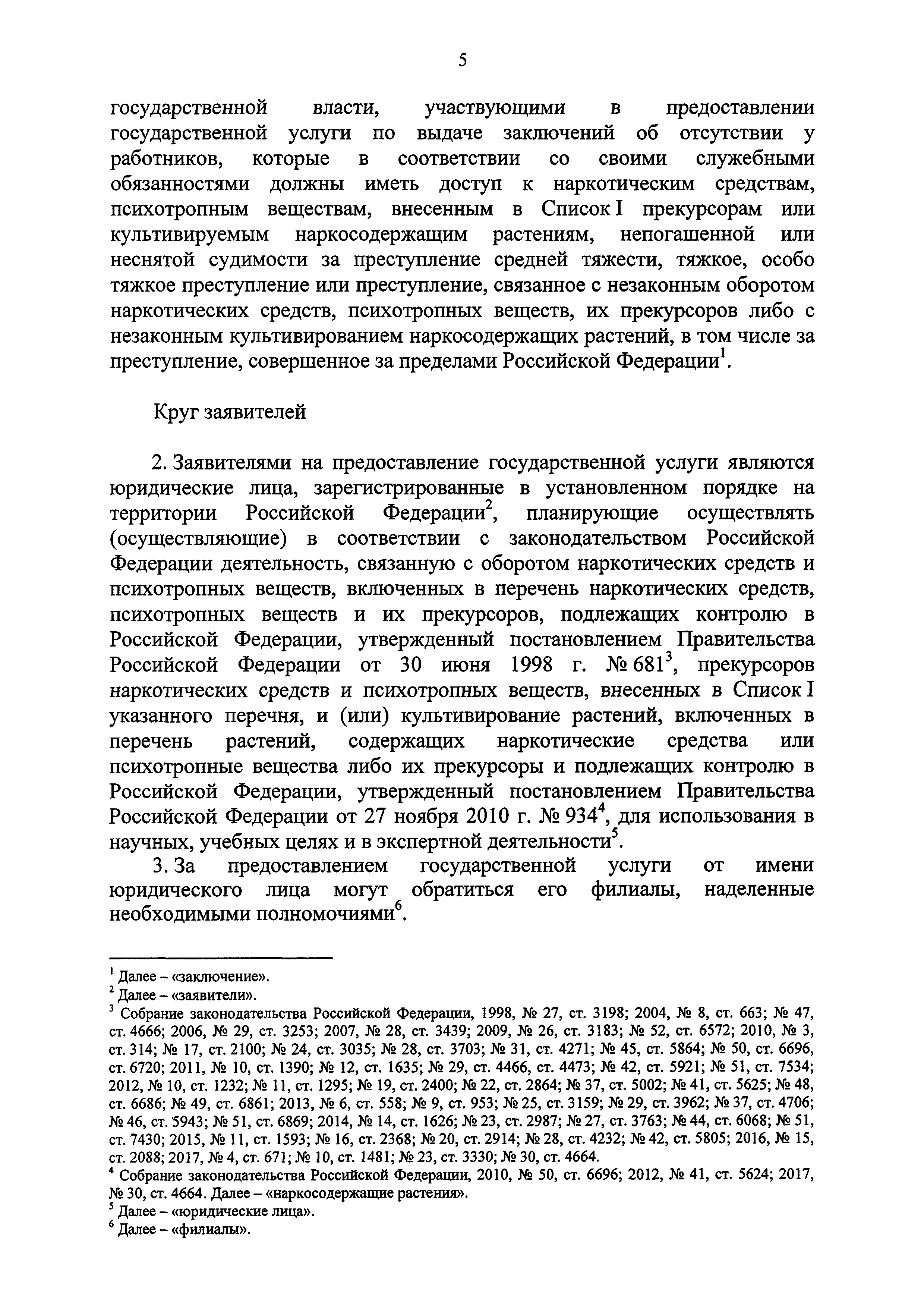 | Область применения: | Административный регламент Министерства внутренних дел Российской Федерации по предоставлению государственной услуги по выдаче заключений об отсутствии у работников, которые в соответствии со своими служебными обязанностями должны иметь доступ к наркотическим средствам, психотропным веществам, внесенным в Список I прекурсорам или культивируемым наркосодержащим растениям, непогашенной или неснятой судимости за преступление средней тяжести, тяжкое, особо тяжкое преступление или преступление, связанное с незаконным оборотом наркотических средств, психотропных веществ, их прекурсоров либо с незаконным культивированием наркосодержащих растений, в том числе за преступление, совершенное за пределами Российской Федерации, устанавливает сроки и последовательность административных процедур (действий) должностных лиц территориальных органов МВД России, осуществляющих предоставление государственной услуги, порядок взаимодействия между структурными подразделениями и должностными лицами территориальных органов МВД России, осуществляющих предоставление государственной услуги, а также порядок взаимодействия с заявителями и иными органами государственной власти, участвующими в предоставлении государственной услуги по выдаче заключений об отсутствии у работников, которые в соответствии со своими служебными обязанностями должны иметь доступ к наркотическим средствам, психотропным веществам, внесенным в Список I прекурсорам или культивируемым наркосодержащим растениям, непогашенной или неснятой судимости за преступление средней тяжести, тяжкое, особо тяжкое преступление или преступление, связанное с незаконным оборотом наркотических средств, психотропных веществ, их прекурсоров либо с незаконным культивированием наркосодержащих растений, в том числе за преступление, совершенное за пределами Российской Федерации |