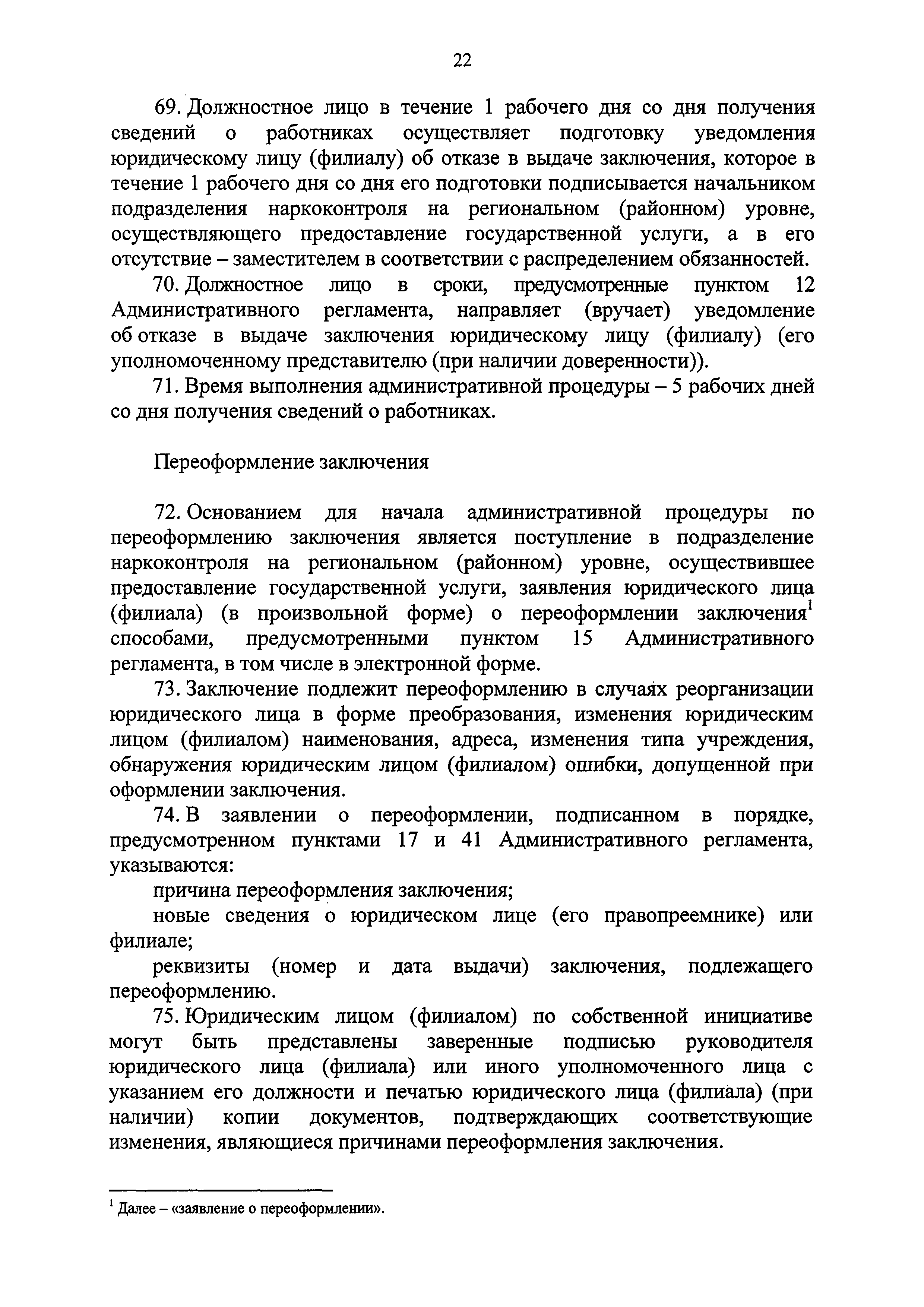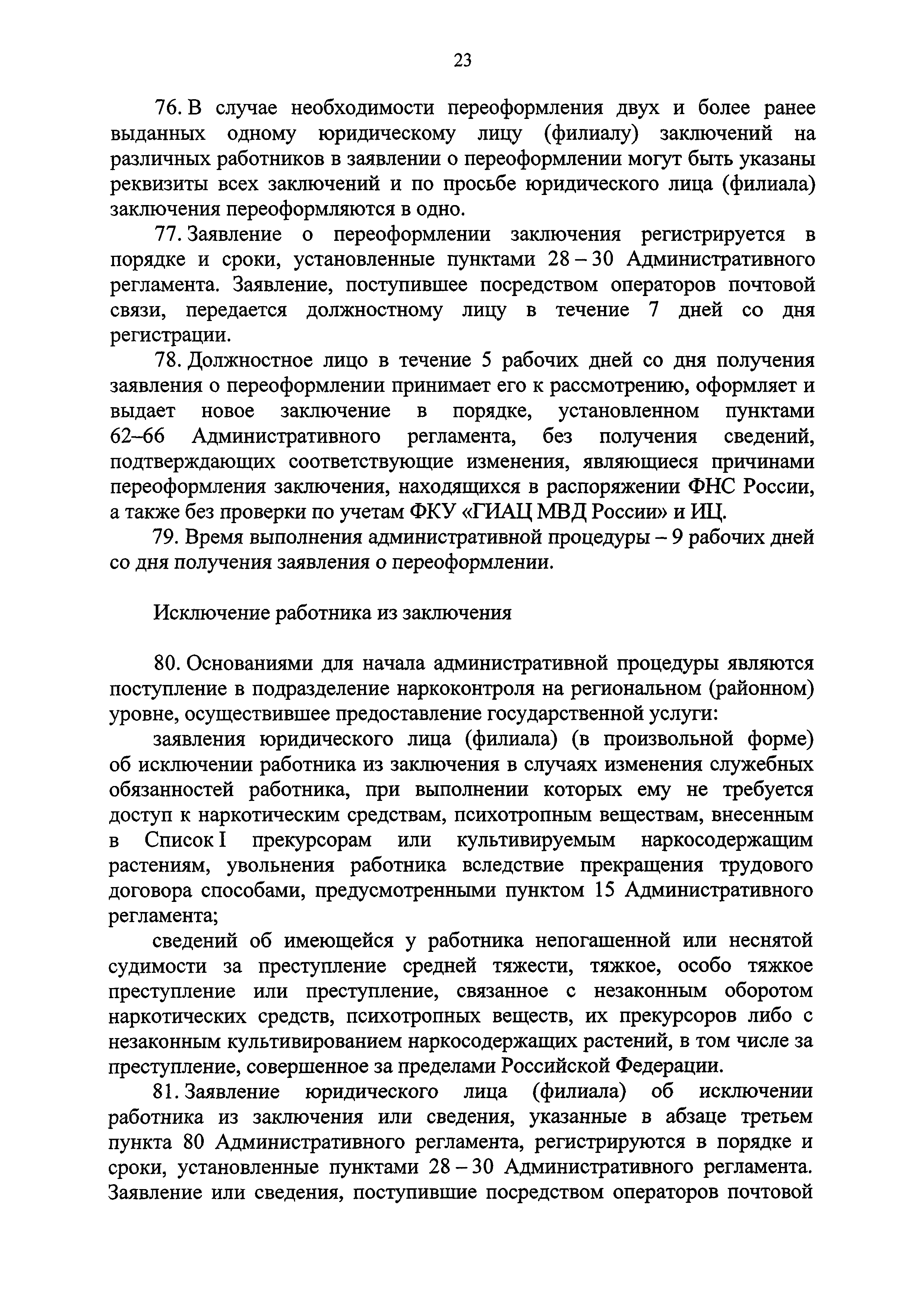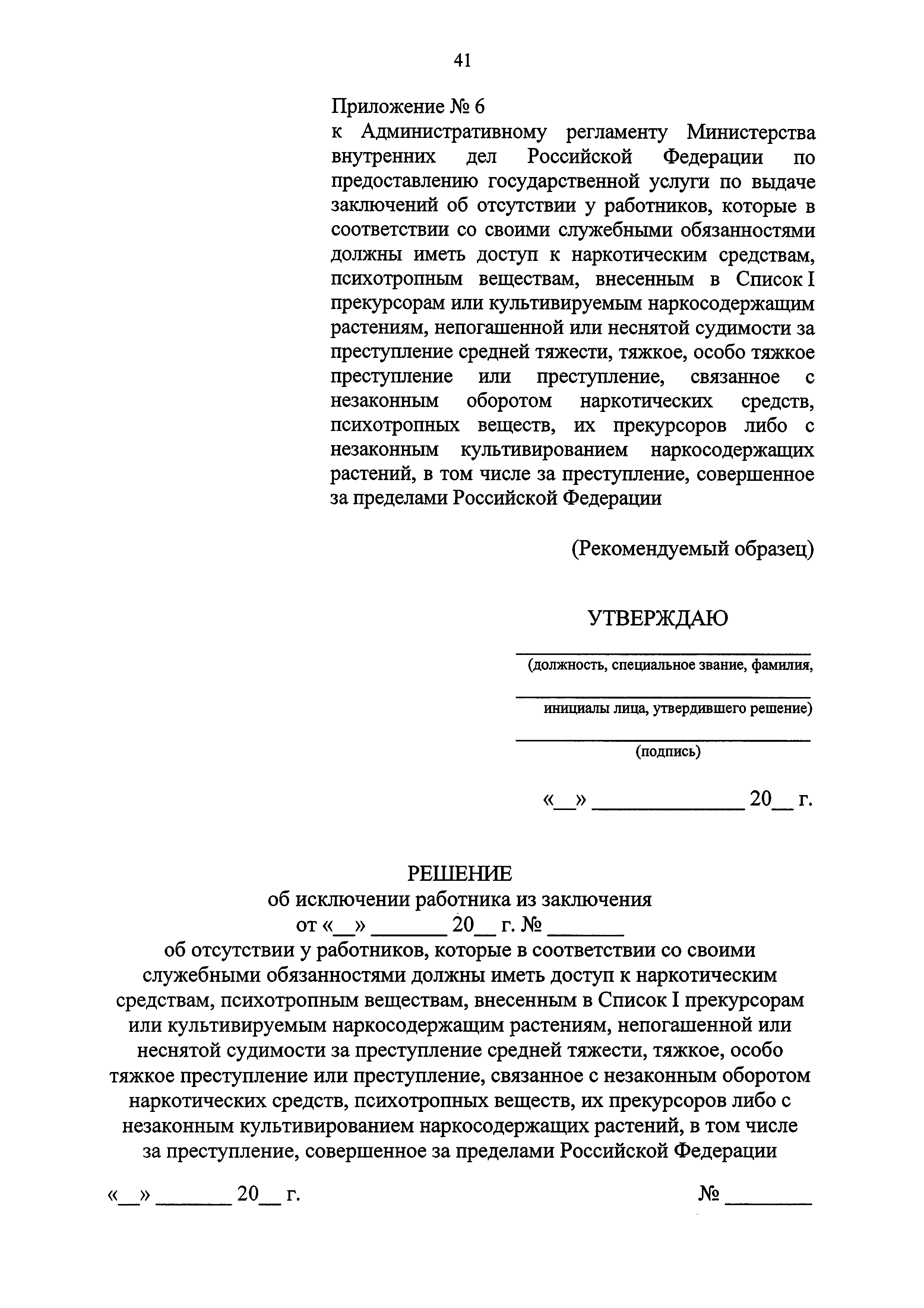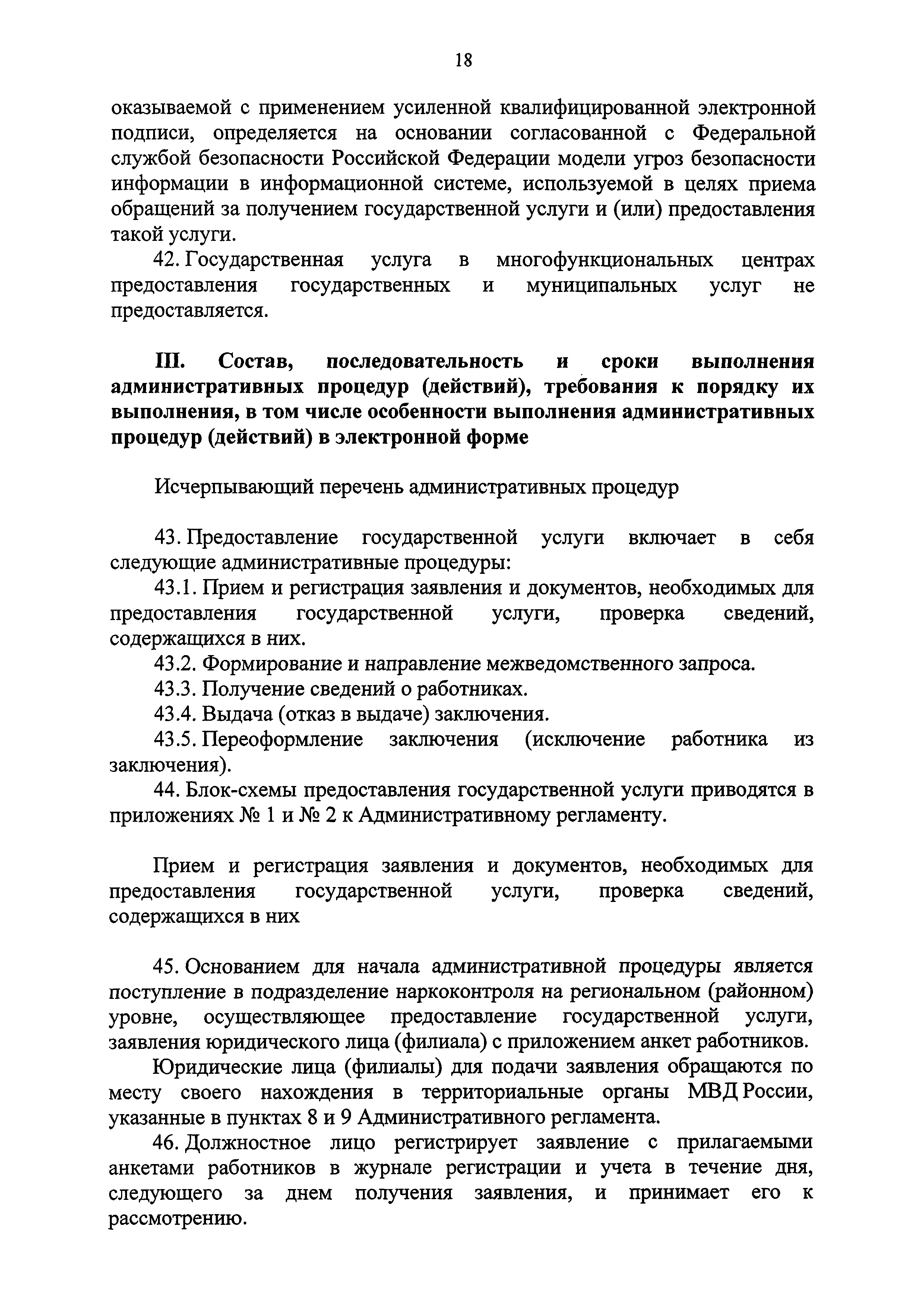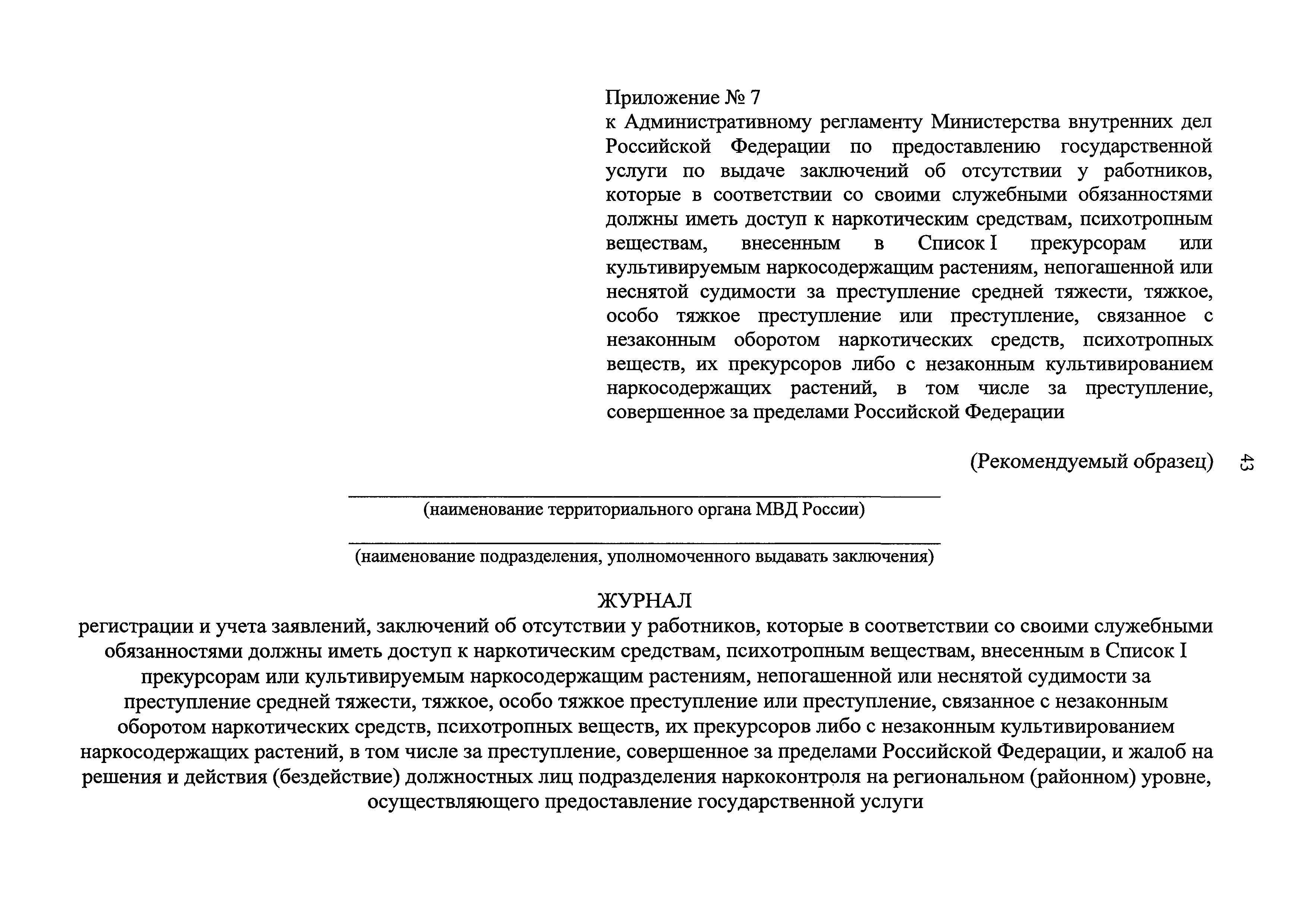 | Оглавление: | I. Общие положения II. Стандарт предоставления государственной услуги III. Состав, последовательность и сроки выполнения административных процедур (действий), требования к порядку их выполнения, в том числе особенности выполнения административных процедур (действий) в электронной форме IV. Формы контроля за предоставлением государственной услуги V. Досудебный (внесудебный) порядок обжалования решений и действий (бездействия) органаисполнительной власти, предоставляющего государственную услугу, а также их должностных лиц Приложение № 1. Блок-схема предоставления государственной услуги (выдача (отказ в выдаче) заключения) Приложение № 2. Блок-схема предоставления государственной услуги (переоформление заключения (исключение работника из заключения)) Приложение № 3. Форма заявления о выдаче заключения об отсутствии у работников, которые в соответствии со своими служебными обязанностями должны иметь доступ к наркотическим средствам, психотропным веществам, внесенным в Список I прекурсорам или культивируемым наркосодержащим растениям, непогашенной или неснятой судимости за преступление средней тяжести, тяжкое, особо тяжкое преступление или преступление, связанное с незаконным оборотом наркотических средств, психотропных веществ, их прекурсоров либо с незаконным культивированием наркосодержащих растений, в том числе за преступление, совершенное за пределами Российской Федерации Приложение № 4. Форма анкеты работника, который в соответствии со своими служебными обязанностями должен иметь доступ к наркотическим средствам, психотропным веществам, внесенным в Список I прекурсорам или культивируемым наркосодержащим растениям Приложение № 5. Рекомендуемый образец заключения об отсутствии у работников, которые в соответствии со своими служебными обязанностями должны иметь доступ к наркотическим средствам, психотропным веществам, внесенным в Список I прекурсорам или культивируемым наркосодержащим растениям, непогашенной или неснятой судимости за преступление средней тяжести, тяжкое, особо тяжкое преступление или преступление, связанное с незаконным оборотом наркотических средств, психотропных веществ, их прекурсоров либо с незаконным культивированием наркосодержащих растений, в том числе за преступление, совершенное за пределами Российской Федерации Приложение № 6. Рекомендуемый образец решения об исключении работника из заключения об отсутствии у работников, которые в соответствии со своими служебными обязанностями должны иметь доступ к наркотическим средствам, психотропным веществам, внесенным в Список I прекурсорам или культивируемым наркосодержащим растениям, непогашенной или неснятой судимости за преступление средней тяжести, тяжкое, особо тяжкое преступление или преступление, связанное с незаконным оборотом наркотических средств, психотропных веществ, их прекурсоров либо с незаконным культивированием наркосодержащих растений, в том числе за преступление, совершенное за пределами Российской Федерации Приложение № 7. Рекомендуемый образец журнала регистрации и учета заявлений, заключений об отсутствии у работников, которые в соответствии со своими служебными обязанностями должны иметь доступ к наркотическим средствам, психотропным веществам, внесенным в Список I прекурсор