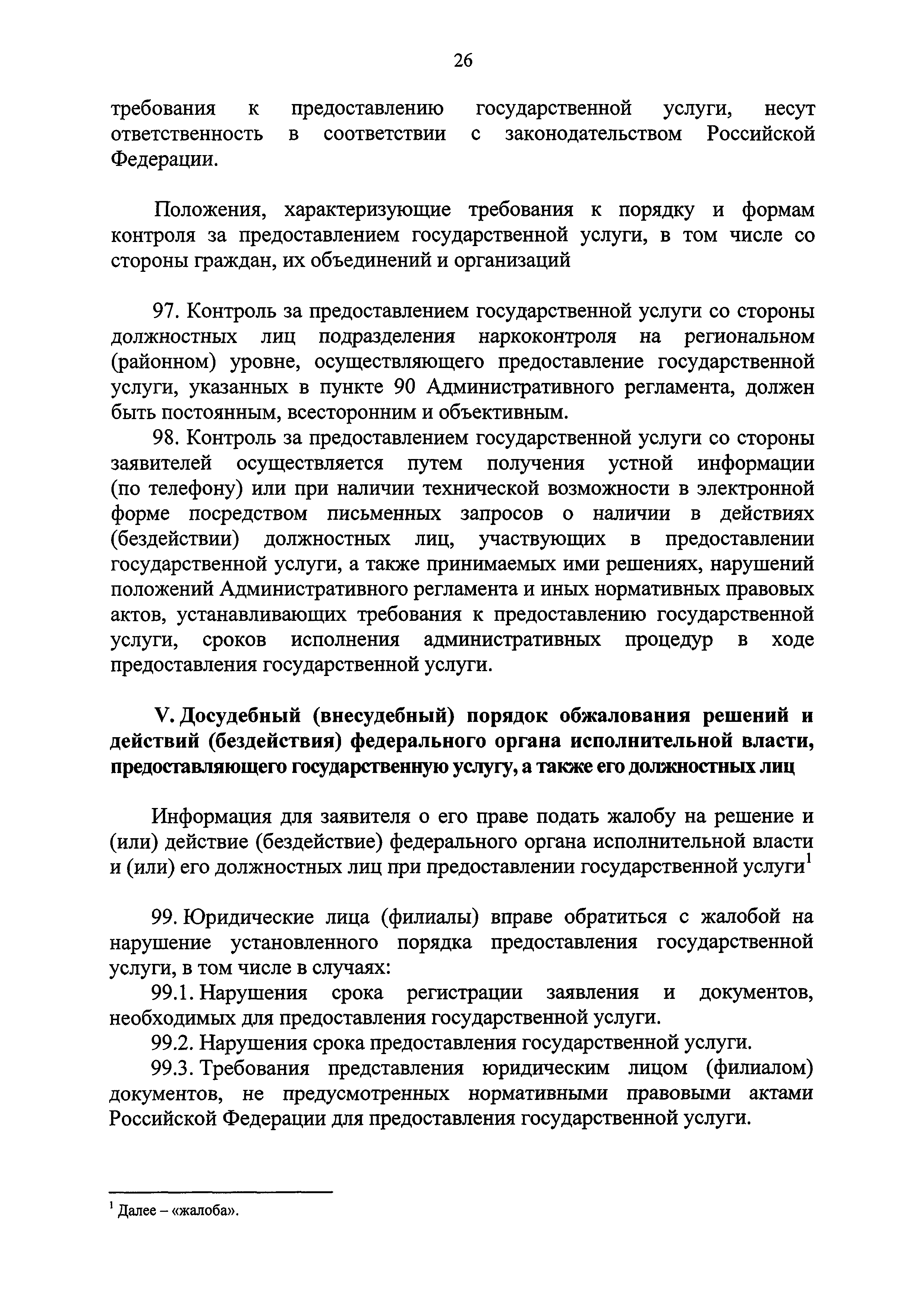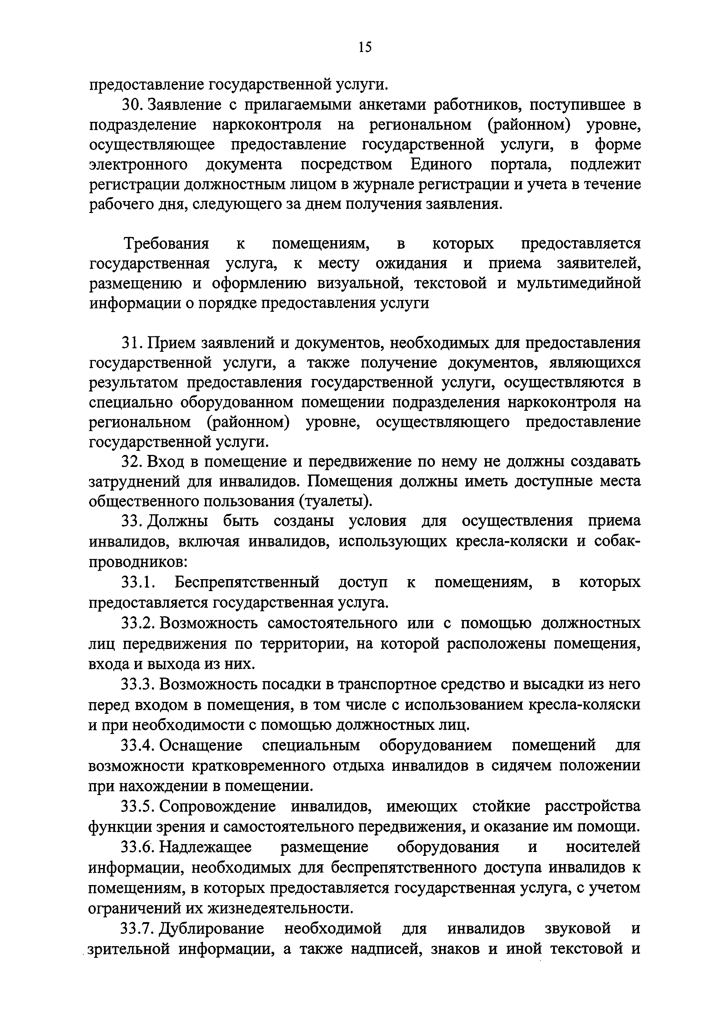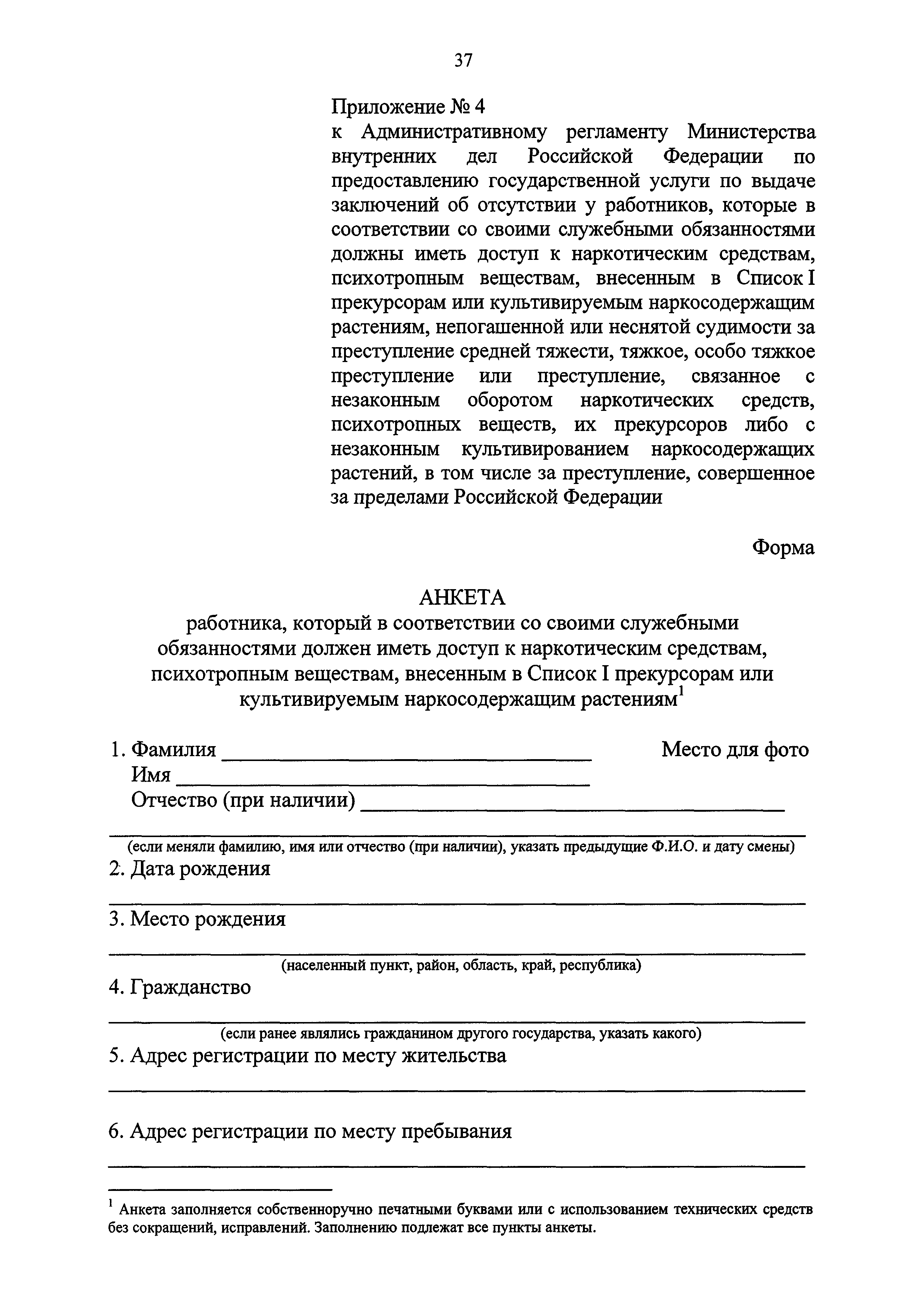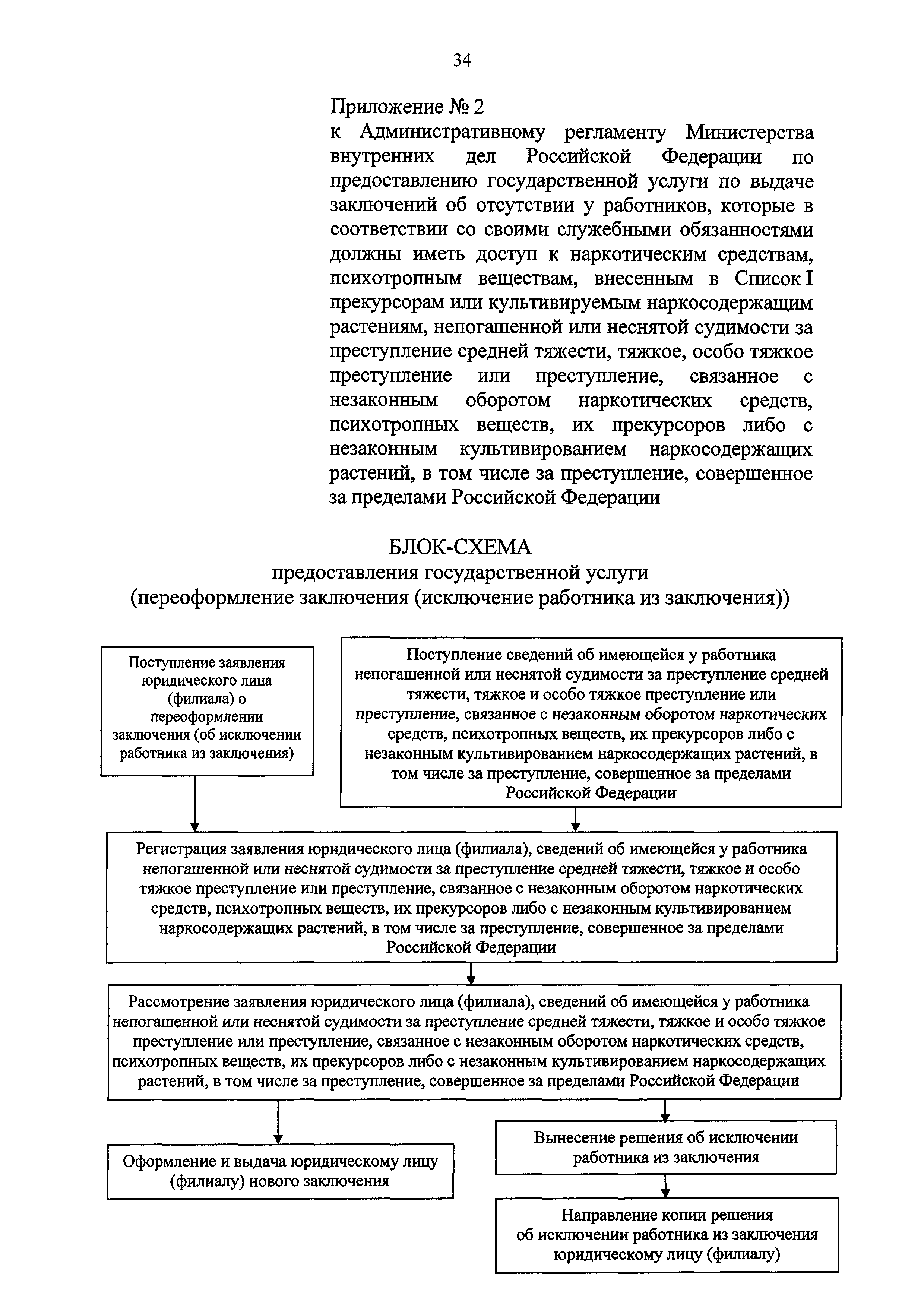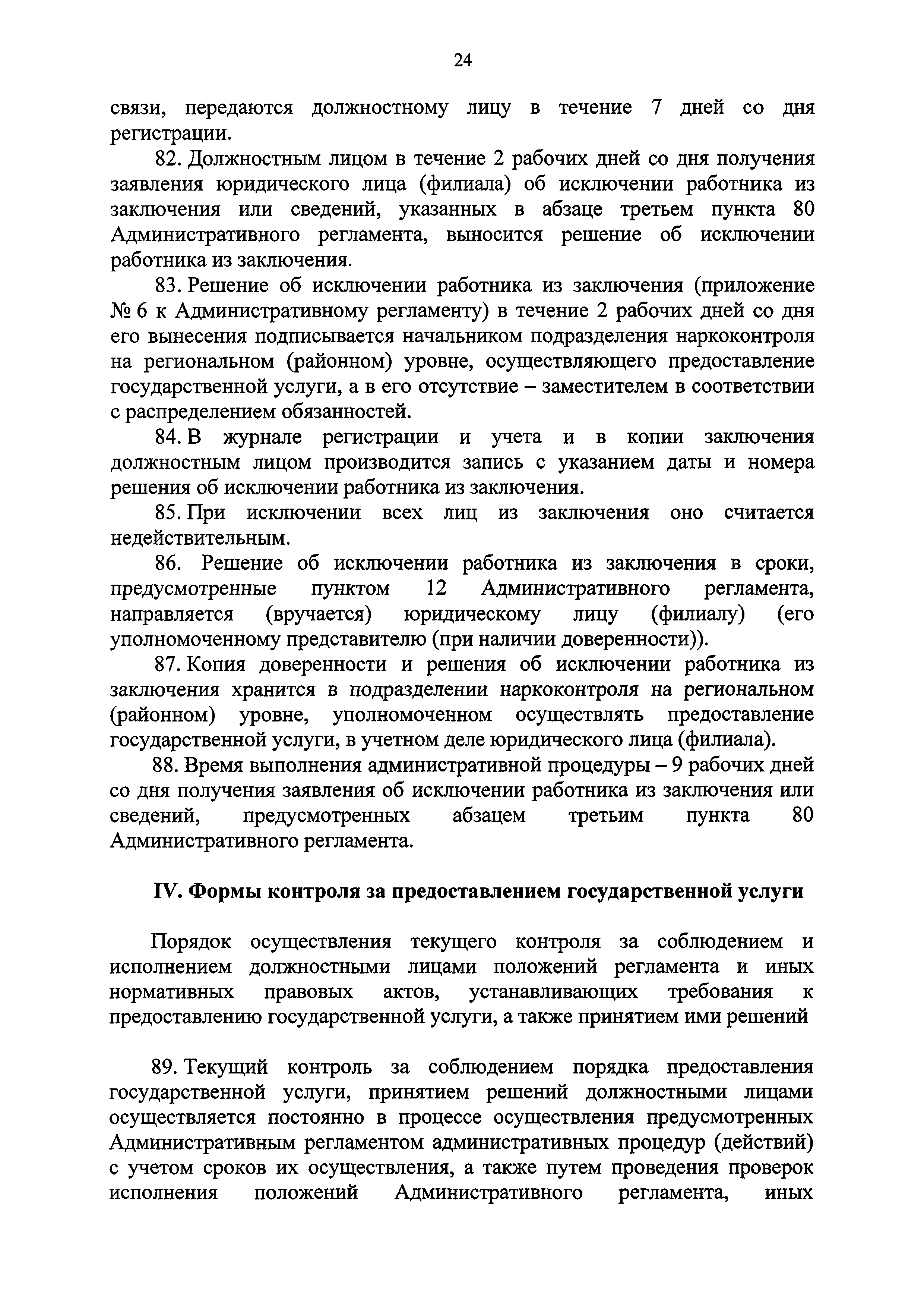 | Оглавление: | I. Общие положения II. Стандарт предоставления государственной услуги III. Состав, последовательность и сроки выполнения административных процедур (действий), требования к порядку их выполнения, в том числе особенности выполнения административных процедур (действий) в электронной форме IV. Формы контроля за предоставлением государственной услуги V. Досудебный (внесудебный) порядок обжалования решений и действий (бездействия) органаисполнительной власти, предоставляющего государственную услугу, а также их должностных лиц Приложение № 1. Блок-схема предоставления государственной услуги (выдача (отказ в выдаче) заключения) Приложение № 2. Блок-схема предоставления государственной услуги (переоформление заключения (исключение работника из заключения)) Приложение № 3. Форма заявления о выдаче заключения об отсутствии у работников, которые в соответствии со своими служебными обязанностями должны иметь доступ к наркотическим средствам, психотропным веществам, внесенным в Список I прекурсорам или культивируемым наркосодержащим растениям, непогашенной или неснятой судимости за преступление средней тяжести, тяжкое, особо тяжкое преступление или преступление, связанное с незаконным оборотом наркотических средств, психотропных веществ, их прекурсоров либо с незаконным культивированием наркосодержащих растений, в том числе за преступление, совершенное за пределами Российской Федерации Приложение № 4. Форма анкеты работника, который в соответствии со своими служебными обязанностями должен иметь доступ к наркотическим средствам, психотропным веществам, внесенным в Список I прекурсорам или культивируемым наркосодержащим растениям Приложение № 5. Рекомендуемый образец заключения об отсутствии у работников, которые в соответствии со своими служебными обязанностями должны иметь доступ к наркотическим средствам, психотропным веществам, внесенным в Список I прекурсорам или культивируемым наркосодержащим растениям, непогашенной или неснятой судимости за преступление средней тяжести, тяжкое, особо тяжкое преступление или преступление, связанное с незаконным оборотом наркотических средств, психотропных веществ, их прекурсоров либо с незаконным культивированием наркосодержащих растений, в том числе за преступление, совершенное за пределами Российской Федерации Приложение № 6. Рекомендуемый образец решения об исключении работника из заключения об отсутствии у работников, которые в соответствии со своими служебными обязанностями должны иметь доступ к наркотическим средствам, психотропным веществам, внесенным в Список I прекурсорам или культивируемым наркосодержащим растениям, непогашенной или неснятой судимости за преступление средней тяжести, тяжкое, особо тяжкое преступление или преступление, связанное с незаконным оборотом наркотических средств, психотропных веществ, их прекурсоров либо с незаконным культивированием наркосодержащих растений, в том числе за преступление, совершенное за пределами Российской Федерации Приложение № 7. Рекомендуемый образец журнала регистрации и учета заявлений, заключений об отсутствии у работников, которые в соответствии со своими служебными обязанностями должны иметь доступ к наркотическим средствам, психотропным веществам, внесенным в Список I прекурсор