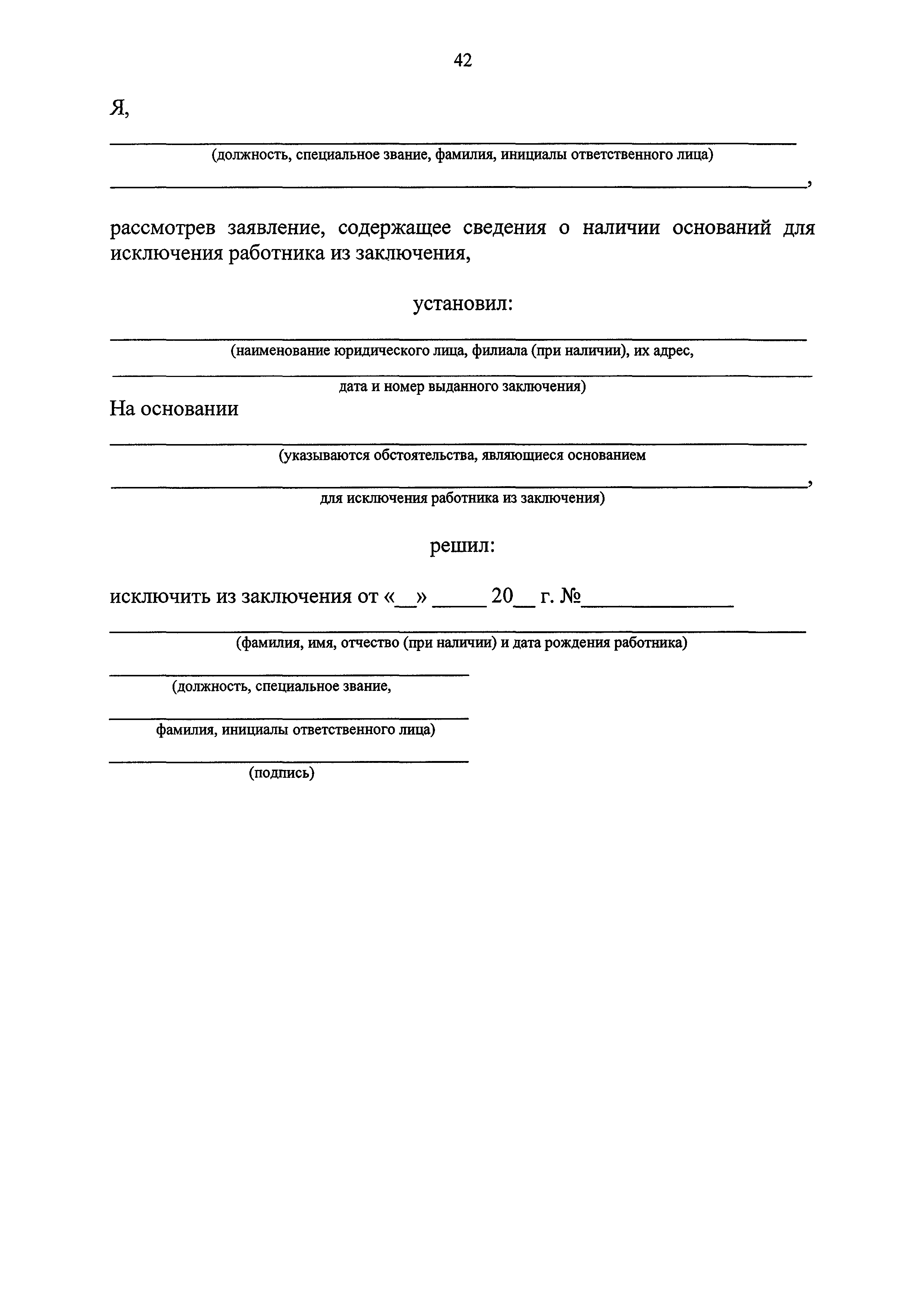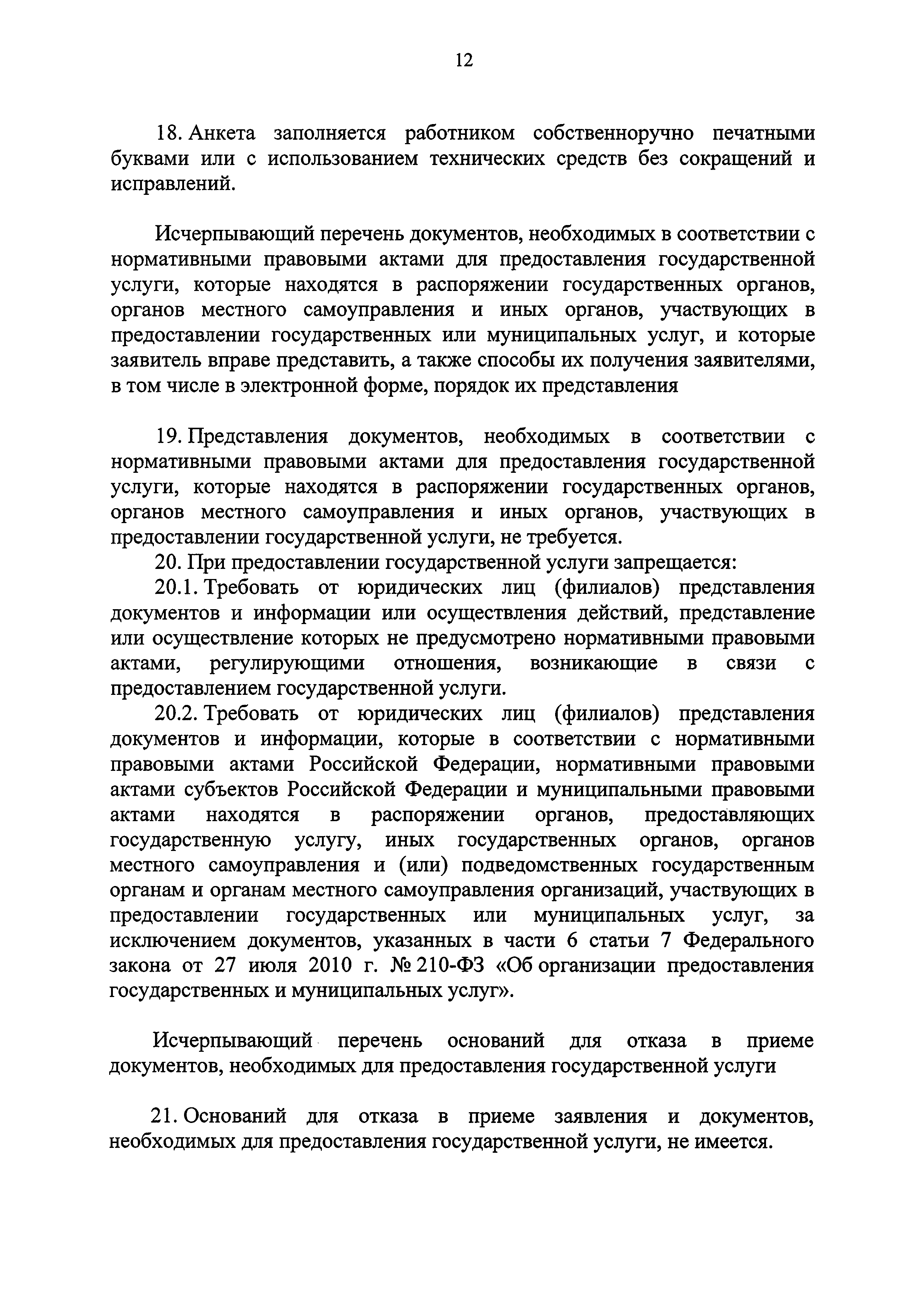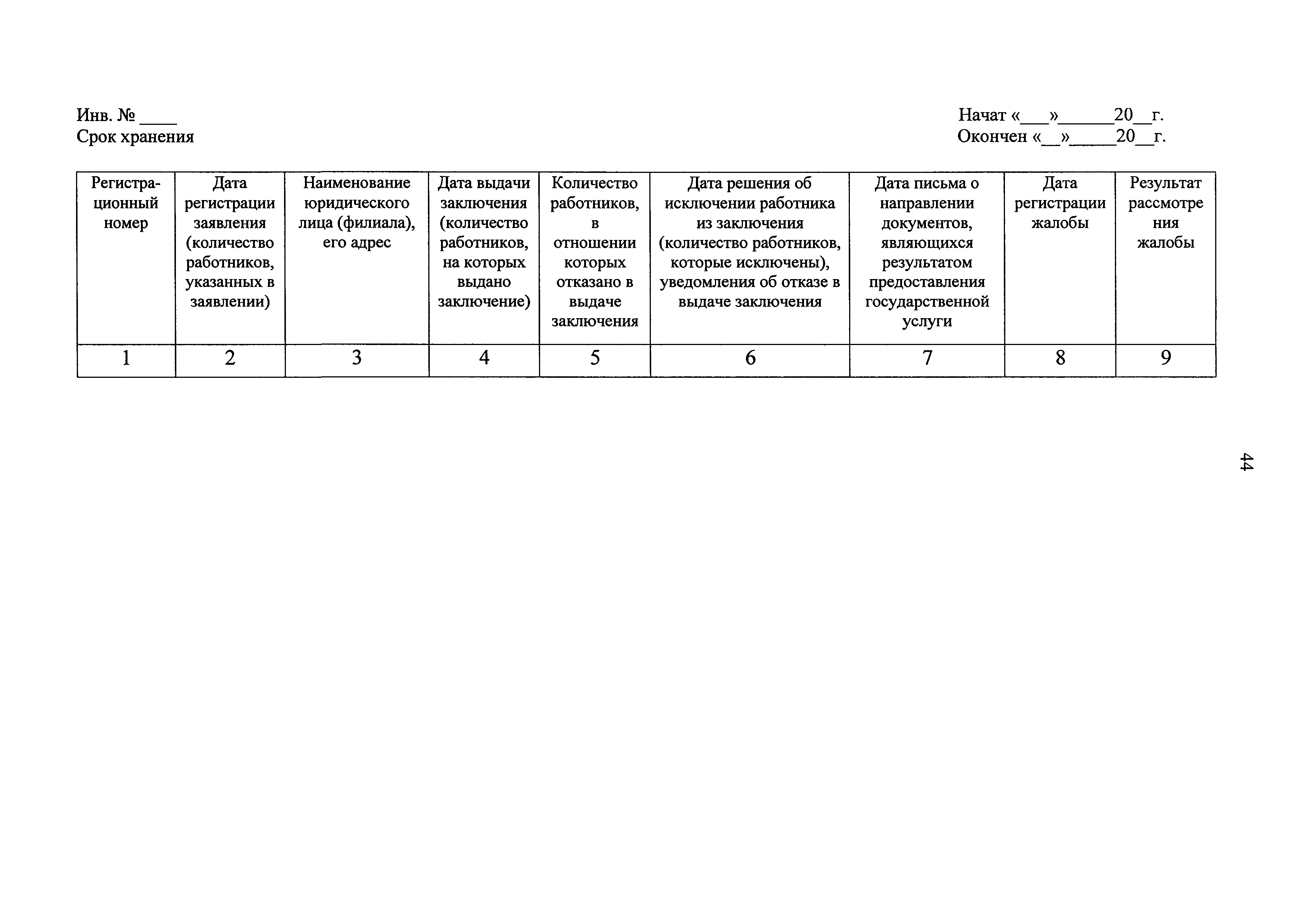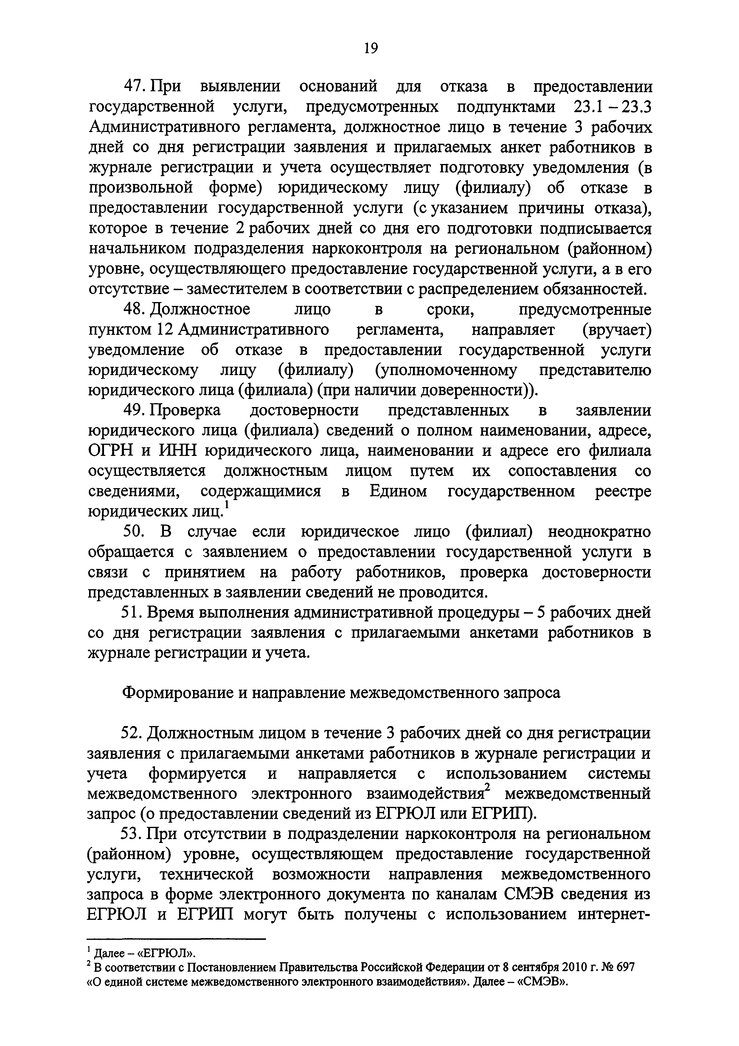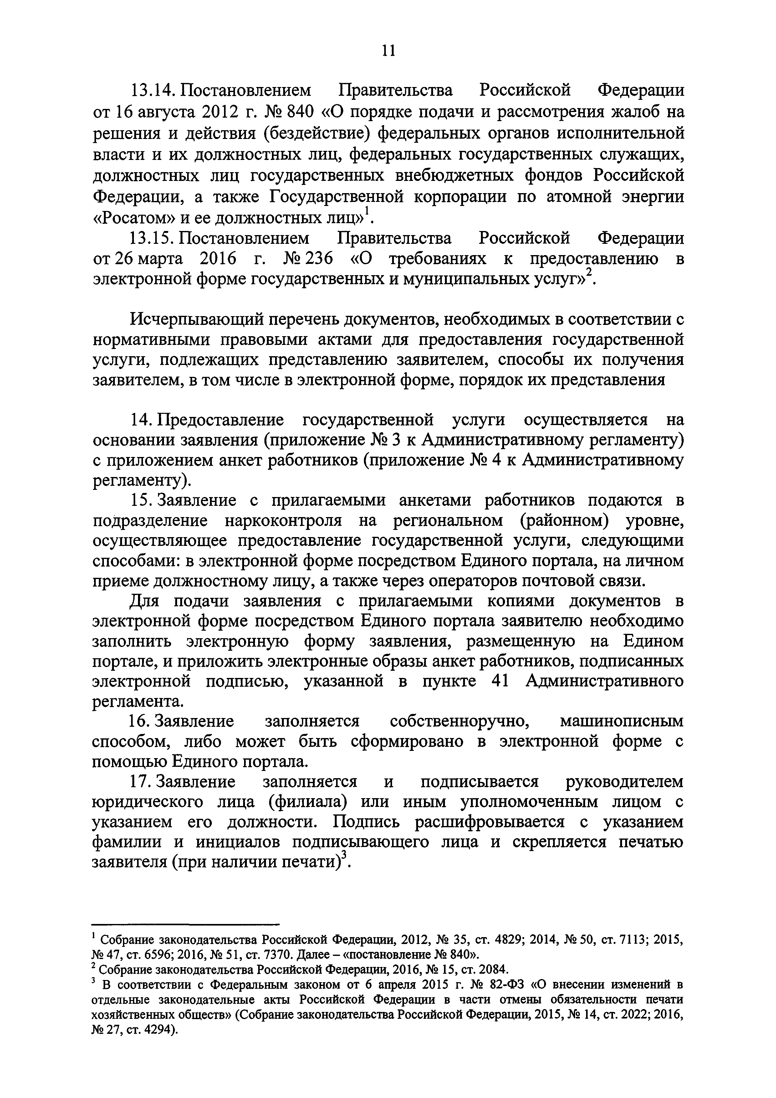 | Оглавление: | I. Общие положения II. Стандарт предоставления государственной услуги III. Состав, последовательность и сроки выполнения административных процедур (действий), требования к порядку их выполнения, в том числе особенности выполнения административных процедур (действий) в электронной форме IV. Формы контроля за предоставлением государственной услуги V. Досудебный (внесудебный) порядок обжалования решений и действий (бездействия) органаисполнительной власти, предоставляющего государственную услугу, а также их должностных лиц Приложение № 1. Блок-схема предоставления государственной услуги (выдача (отказ в выдаче) заключения) Приложение № 2. Блок-схема предоставления государственной услуги (переоформление заключения (исключение работника из заключения)) Приложение № 3. Форма заявления о выдаче заключения об отсутствии у работников, которые в соответствии со своими служебными обязанностями должны иметь доступ к наркотическим средствам, психотропным веществам, внесенным в Список I прекурсорам или культивируемым наркосодержащим растениям, непогашенной или неснятой судимости за преступление средней тяжести, тяжкое, особо тяжкое преступление или преступление, связанное с незаконным оборотом наркотических средств, психотропных веществ, их прекурсоров либо с незаконным культивированием наркосодержащих растений, в том числе за преступление, совершенное за пределами Российской Федерации Приложение № 4. Форма анкеты работника, который в соответствии со своими служебными обязанностями должен иметь доступ к наркотическим средствам, психотропным веществам, внесенным в Список I прекурсорам или культивируемым наркосодержащим растениям Приложение № 5. Рекомендуемый образец заключения об отсутствии у работников, которые в соответствии со своими служебными обязанностями должны иметь доступ к наркотическим средствам, психотропным веществам, внесенным в Список I прекурсорам или культивируемым наркосодержащим растениям, непогашенной или неснятой судимости за преступление средней тяжести, тяжкое, особо тяжкое преступление или преступление, связанное с незаконным оборотом наркотических средств, психотропных веществ, их прекурсоров либо с незаконным культивированием наркосодержащих растений, в том числе за преступление, совершенное за пределами Российской Федерации Приложение № 6. Рекомендуемый образец решения об исключении работника из заключения об отсутствии у работников, которые в соответствии со своими служебными обязанностями должны иметь доступ к наркотическим средствам, психотропным веществам, внесенным в Список I прекурсорам или культивируемым наркосодержащим растениям, непогашенной или неснятой судимости за преступление средней тяжести, тяжкое, особо тяжкое преступление или преступление, связанное с незаконным оборотом наркотических средств, психотропных веществ, их прекурсоров либо с незаконным культивированием наркосодержащих растений, в том числе за преступление, совершенное за пределами Российской Федерации Приложение № 7. Рекомендуемый образец журнала регистрации и учета заявлений, заключений об отсутствии у работников, которые в соответствии со своими служебными обязанностями должны иметь доступ к наркотическим средствам, психотропным веществам, внесенным в Список I прекурсор