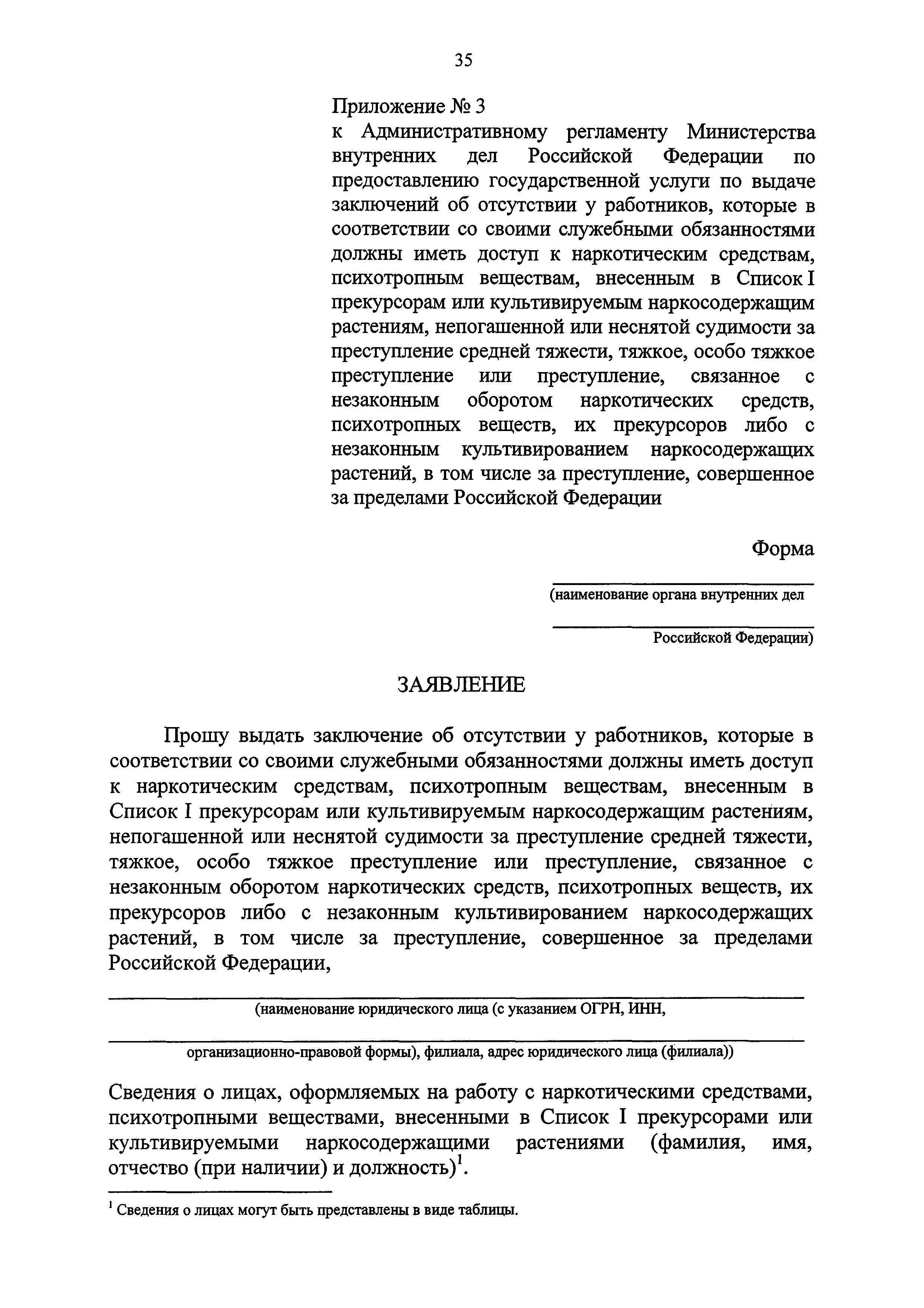 Скачать Административный регламент Министерства внутренних дел Российской Федерации по предоставлению государственной услуги по выдаче заключений об отсутствии у работников, которые в соответствии со своими служебными обязанностями должны иметь доступ к наркотическим средствам, психотропным веществам, внесенным в Список 1 прекурсорам или культивируемым наркосодержащим растениям, непогашенной или неснятой судимости за преступление средней тяжести, тяжкое, особо тяжкое преступление или преступление, связанное с незаконным оборотом наркотических средств, психотропных веществ, их прекурсоров либо с незаконным культивированием наркосодержащих растений, в том числе преступление, совершенное за пределами Российской ФедерацииДата актуализации: 01.01.2021 |