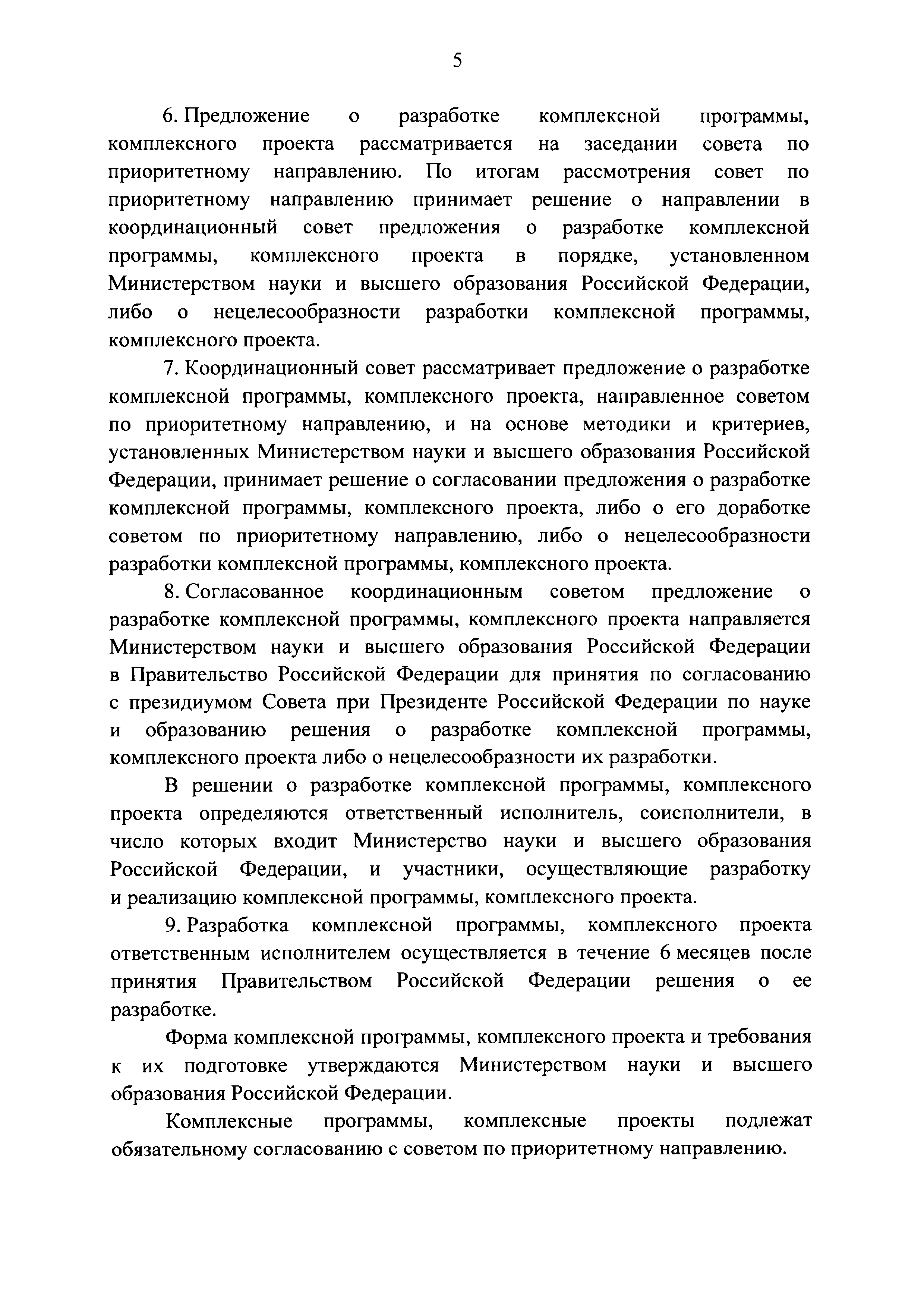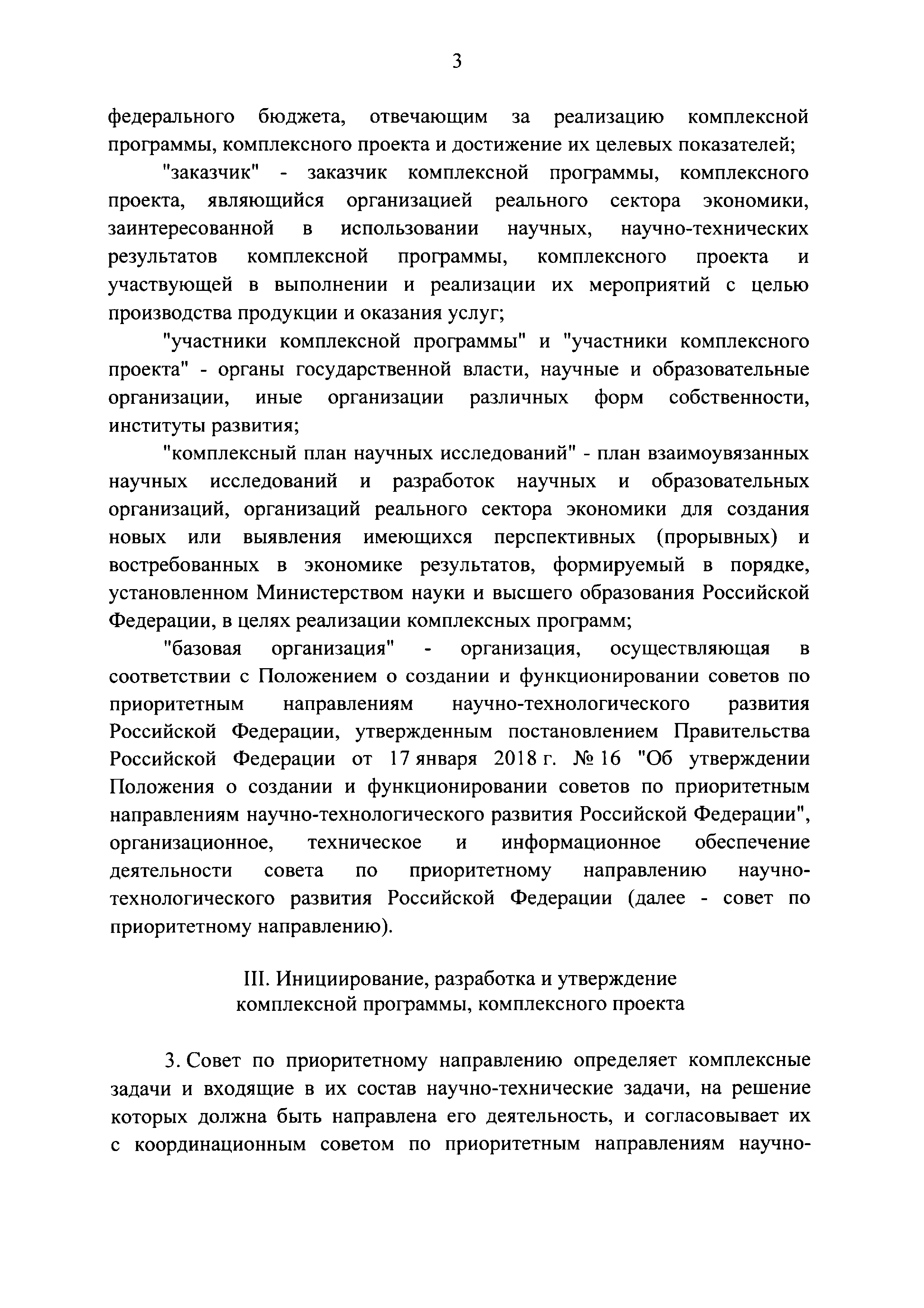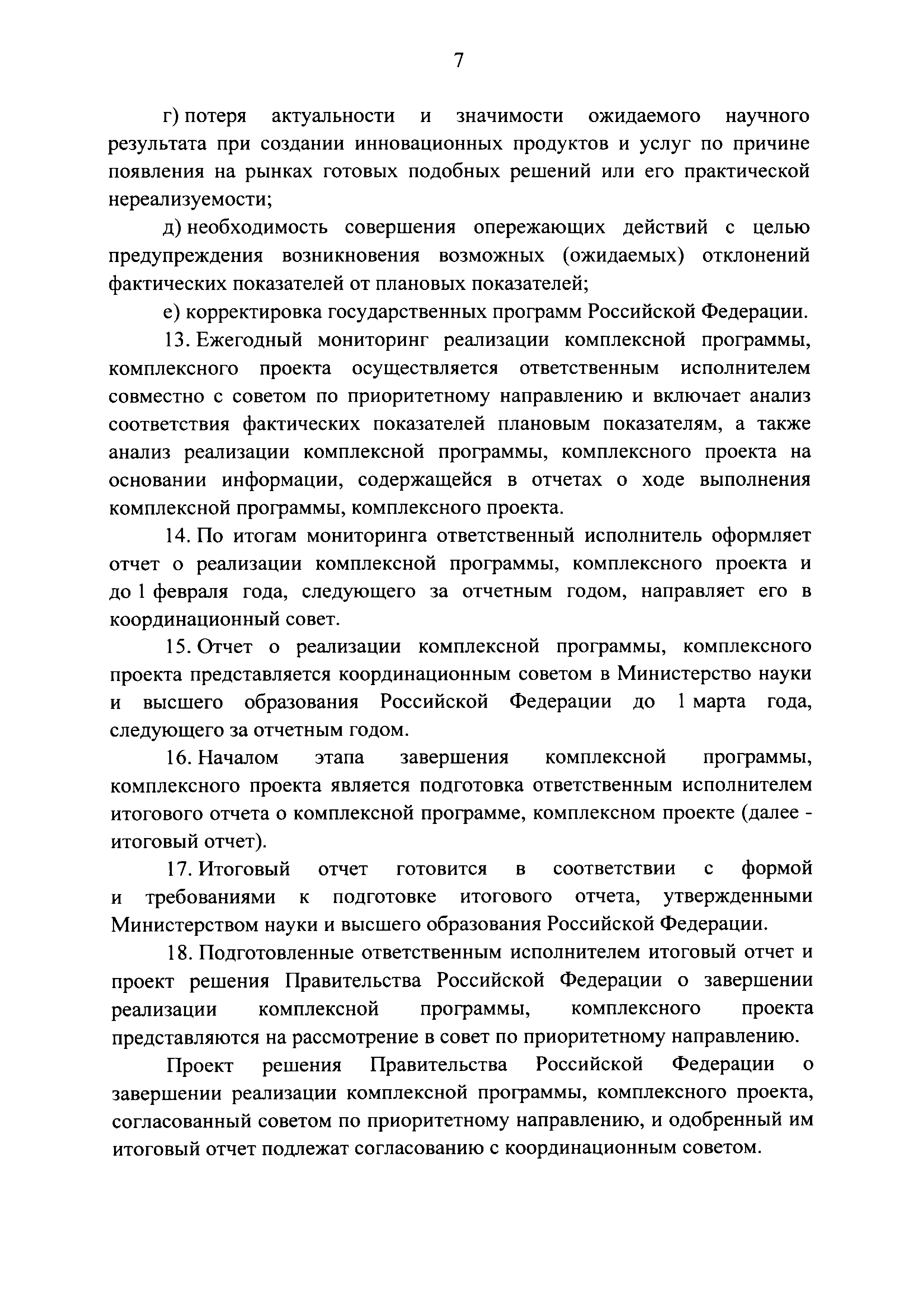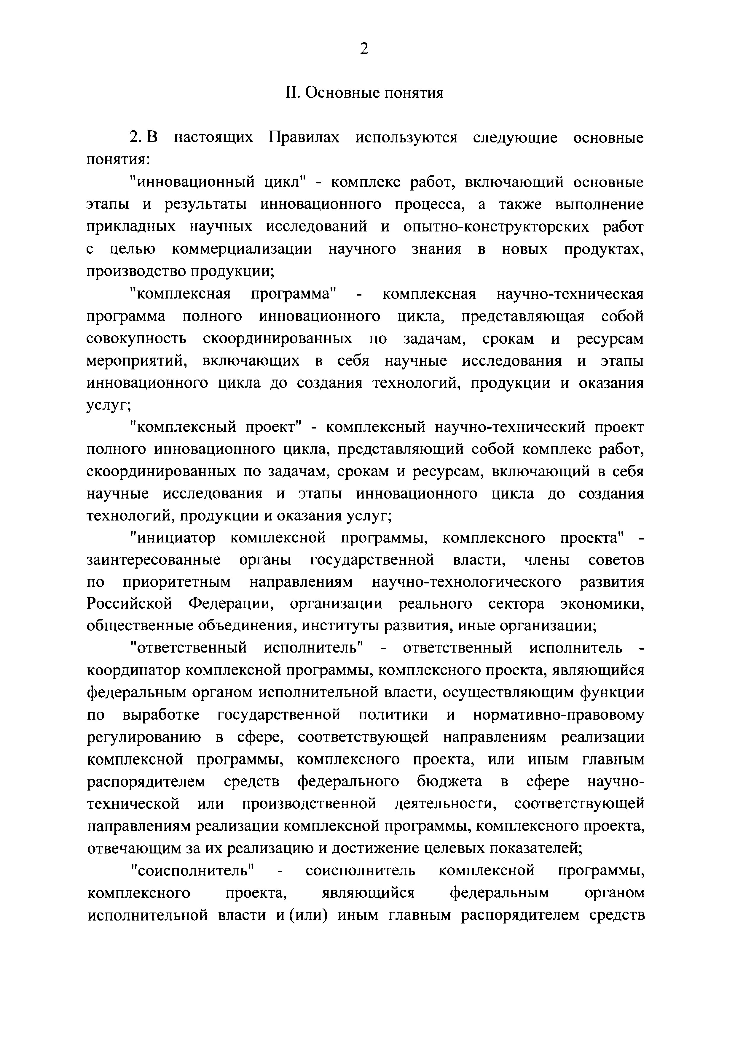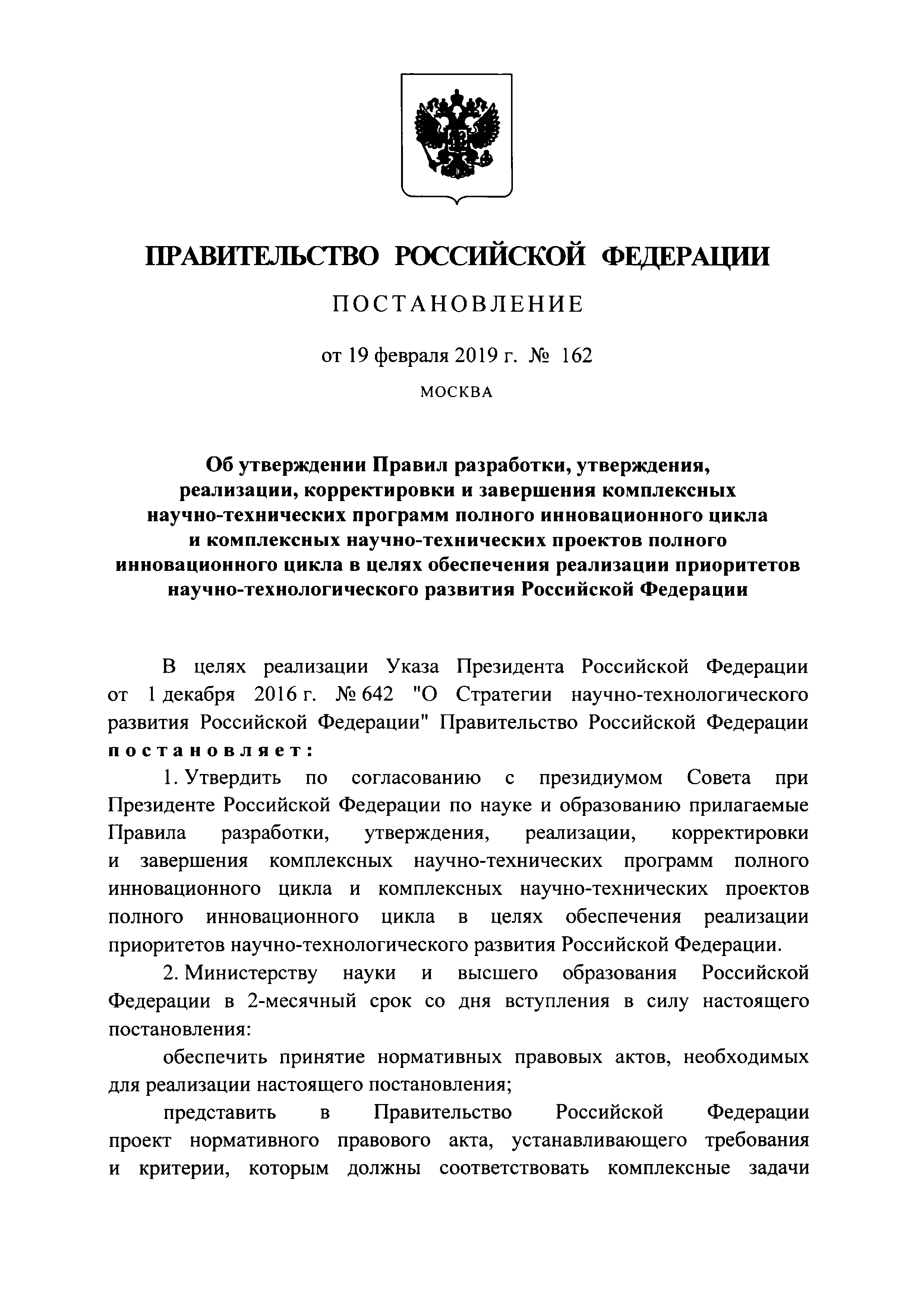 Правила разработки, утверждения, реализации, корректировки и завершения комплексных научно-технических программ полного инновационного цикла и комплексных научно-технических проектов полного инновационного цикла в целях обеспечения реализации приоритетов научно-технологического развития Российской Федерации| Статус: | действует | | Название рус.: | Правила разработки, утверждения, реализации, корректировки и завершения комплексных научно-технических программ полного инновационного цикла и комплексных научно-технических проектов полного инновационного цикла в целях обеспечения реализации приоритетов научно-технологического развития Российской Федерации | | Дата добавления в базу: | 01.02.2020 | | Дата актуализации: | 01.01.2021 | | Дата введения: | 06.03.2019 | | Область применения: | Правила определяют порядок разработки, утверждения, реализации, корректировки и завершения комплексных научно-технических программ полного инновационного цикла и комплексных научно-технических проектов полного инновационного цикла в целях обеспечения реализации приоритетов научно-технологического развития Российской Федерации | | Оглавление: | I. Общие положения II. Основные понятия III. Инициирование, разработка и утверждение комплексной программы, комплексного проекта IV. Реализация, мониторинг, корректировка и завершение реализации комплексных программ, комплексных проектов V. Финансовое обеспечение реализации комплексной программы, комплексного проекта | | Утверждён: | 19.02.2019 Правительство Российской Федерации (162)