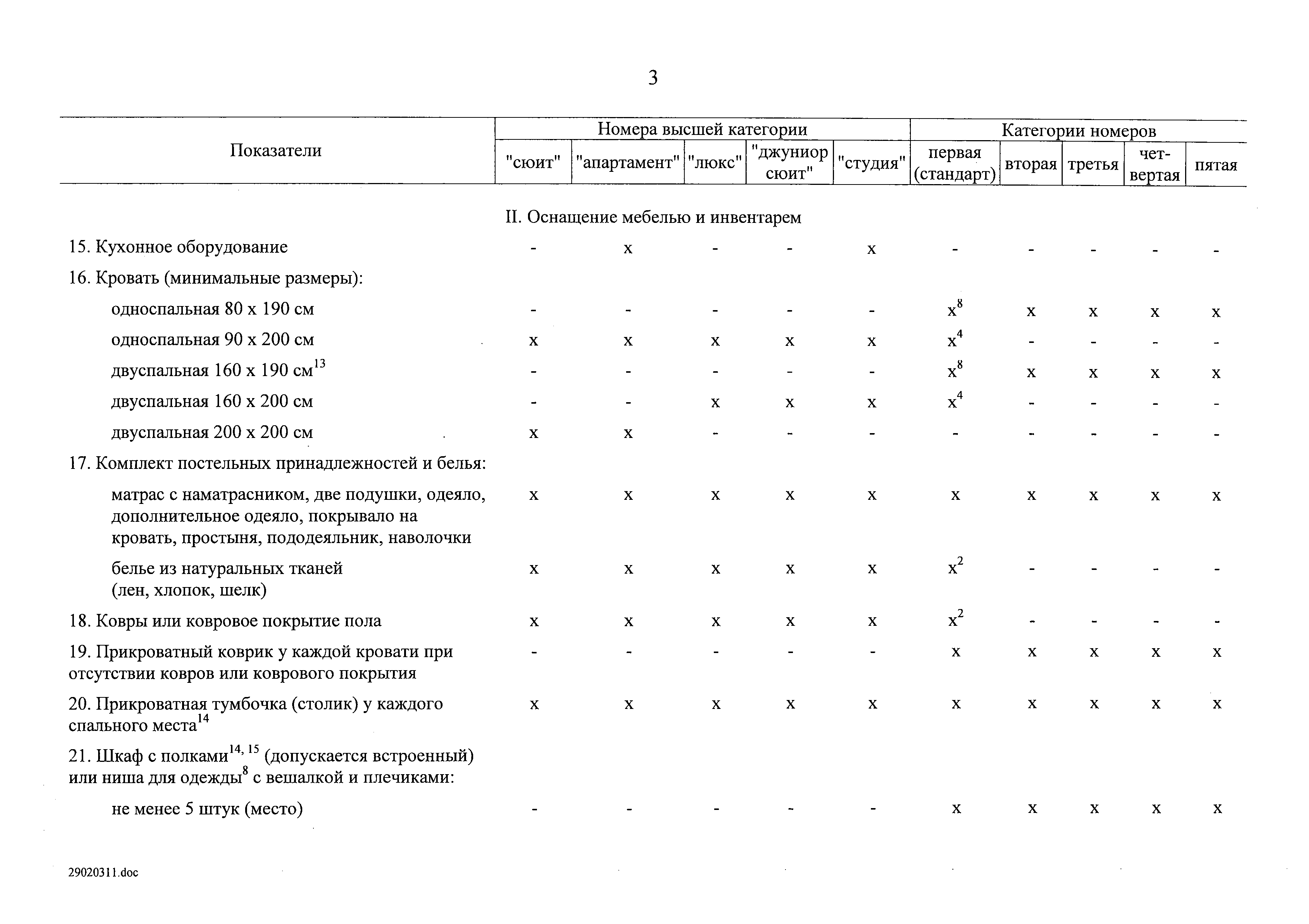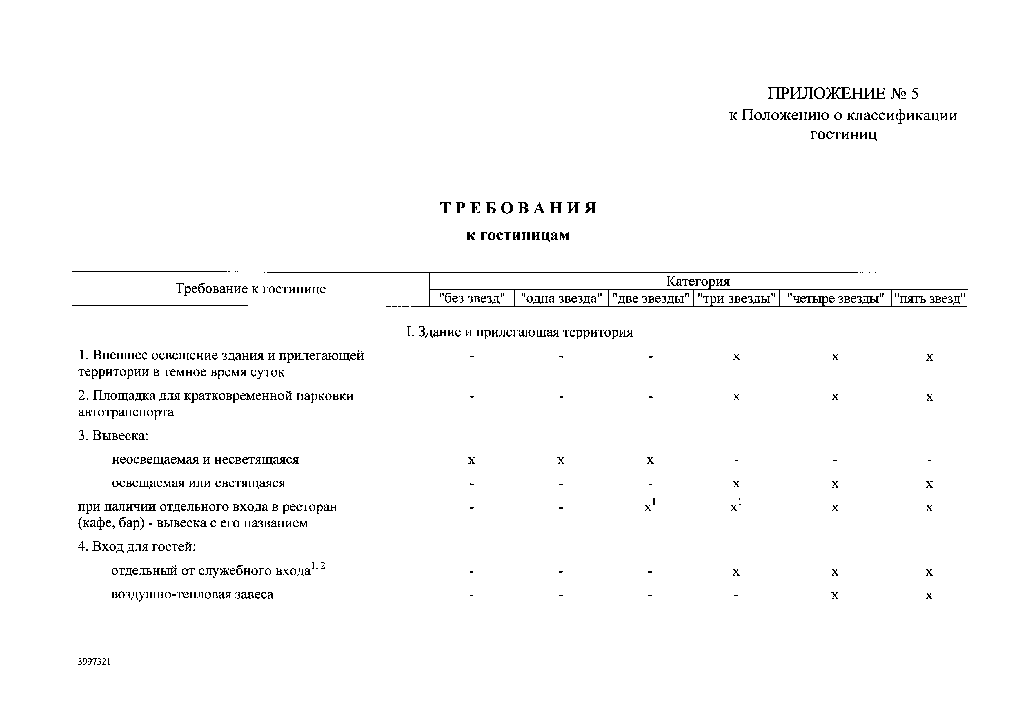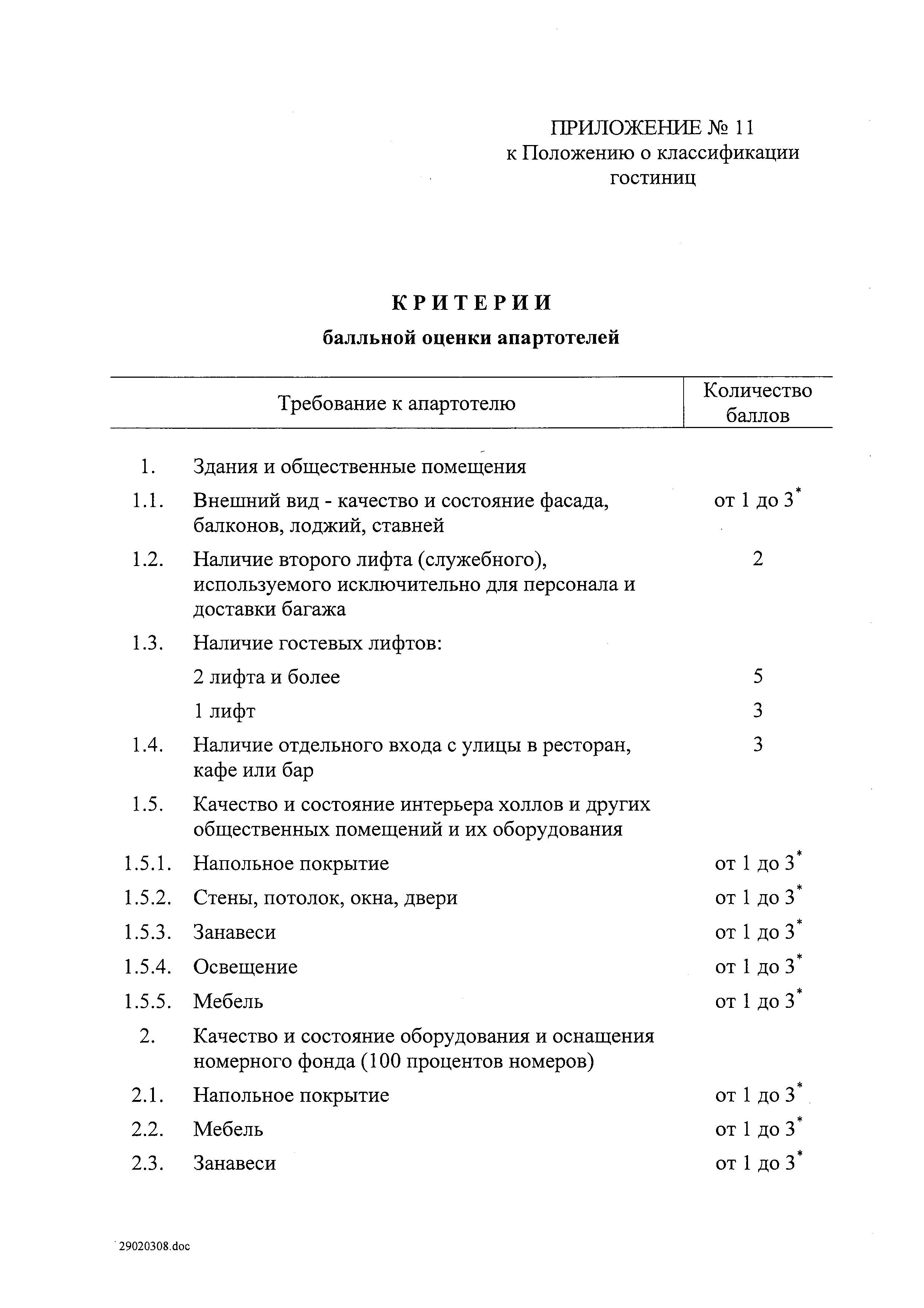 | Оглавление: | I. Общие положения II. Виды гостиниц III. Участники классификации гостиниц IV. Порядок классификации гостиниц Приложение № 1. Форма свидетельства о присвоении гостинице определенной категории Приложение № 2. Категории номеров гостиниц Приложение № 3. Требования к номерам гостиниц Приложение № 4. Критерии балльной оценки номеров гостиниц Приложение № 5. Требования к гостиницам Приложение № 6. Критерии балльной оценки персонала гостиниц Приложение № 7. Критерии балльной оценки гостиниц с количеством номеров более 50 Приложение № 8. Критерии балльной оценки гостиниц с количеством номеров 50 и менее Приложение № 9. Критерии балльной оценки курортных отелей Приложение № 10. Критерии балльной оценки гостиниц, находящихся в зданиях, являющихся объектами культурного наследия или находящихся на территории исторического поселения Приложение № 11. Критерии балльной оценки апартотелей Приложение № 12. Критерии балльной оценки домов отдыха, пансионатов и других аналогичных средств размещения |