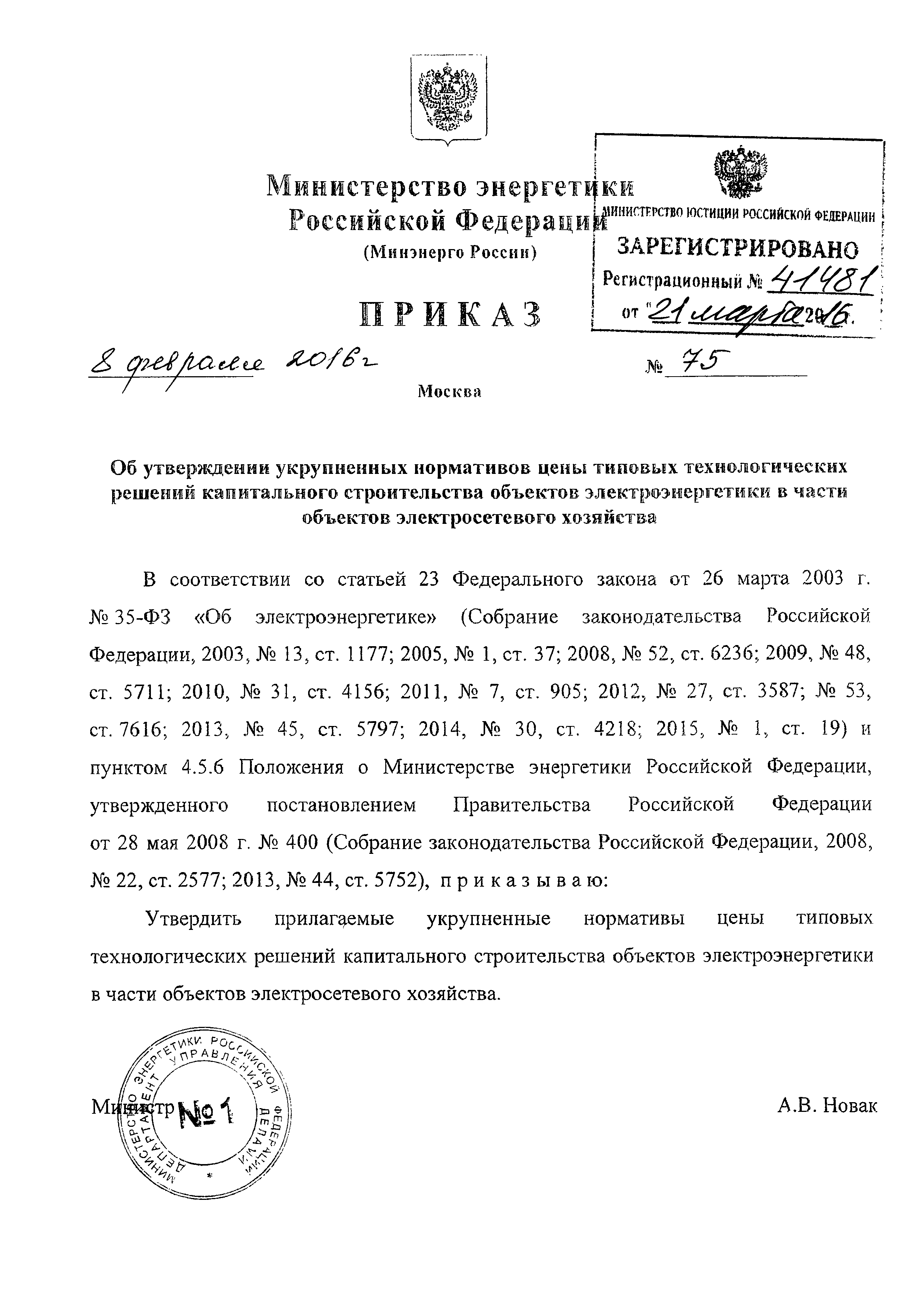 | Утверждён: | 08.02.2016 Министерство энергетики РФ (Russian Federation Ministry of Energy 75)
