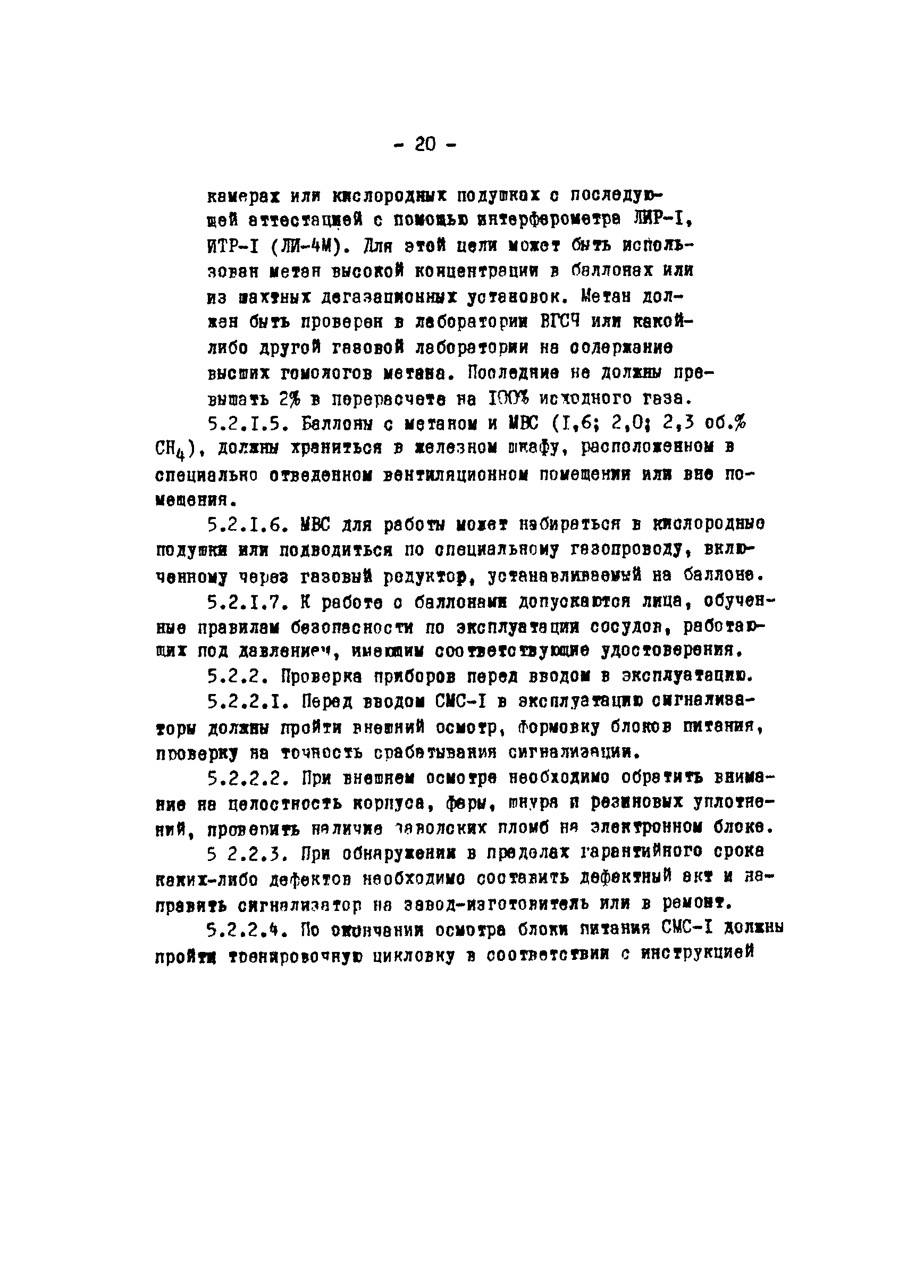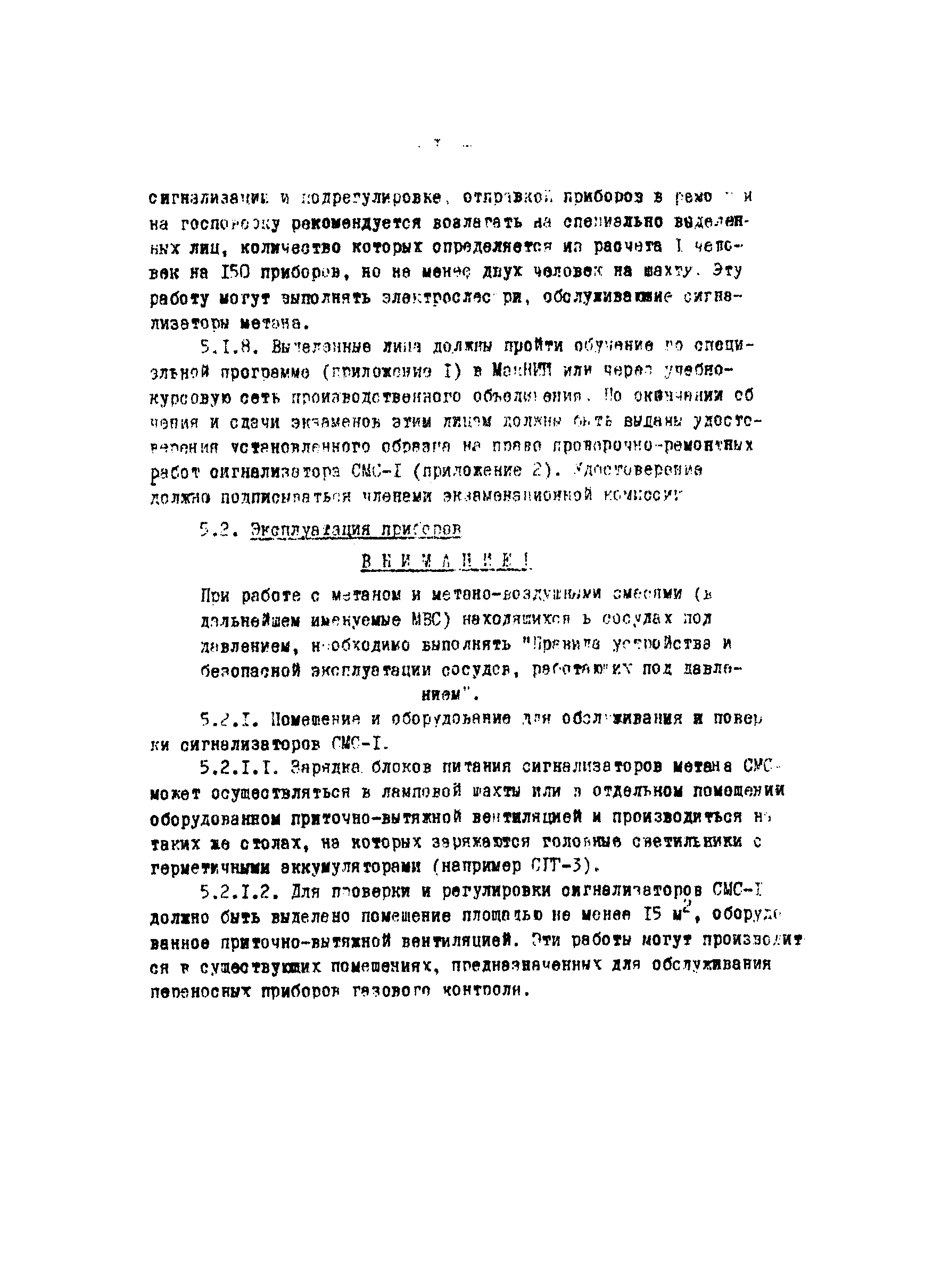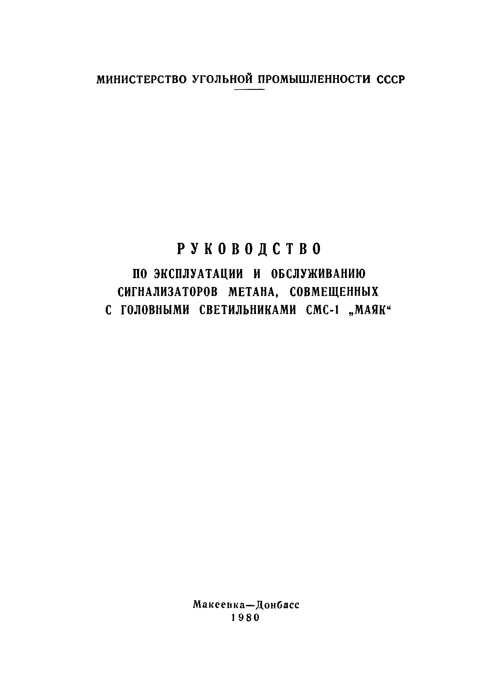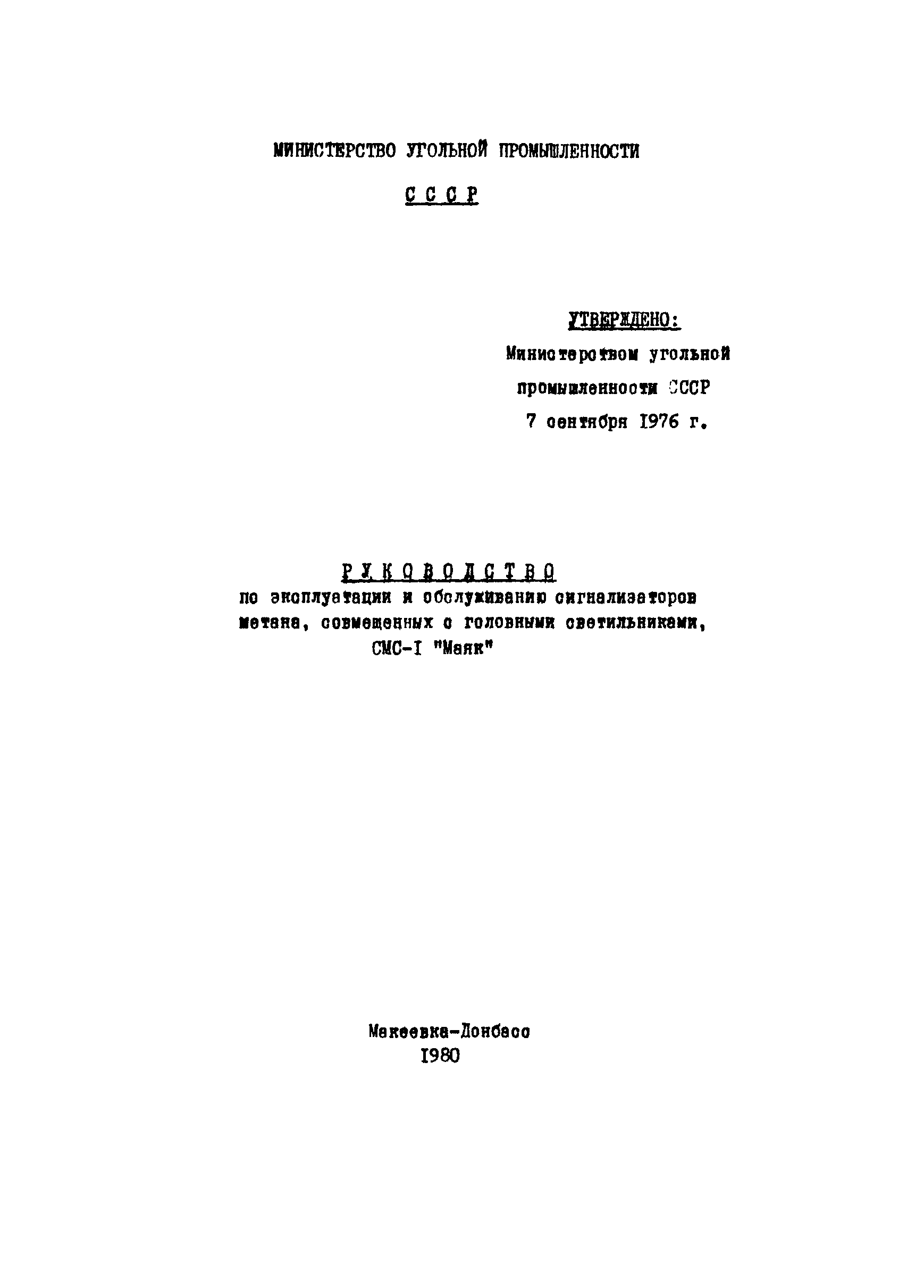 Руководство по эксплуатации и обслуживанию сигнализаторов метана, совмещенных с головными светильниками СМС-1 "Маяк"| Статус: | справочные материалы, мп, тпр | | Название рус.: | Руководство по эксплуатации и обслуживанию сигнализаторов метана, совмещенных с головными светильниками СМС-1 "Маяк" | | Дата добавления в базу: | 01.02.2020 | | Дата актуализации: | 01.01.2021 | | Область применения: | Руководство является обязательным для всех предприятий и организаций Минуглепрома СССР, эксплуатирующих СМС-1 | | Оглавление: | 1. Назначение 2. Техническая характеристика СМС-1 3. Устройство и принцип действия сигнализатора метана 4. Конструкция СМС-1 5. Организация обслуживания и эксплуатации 5.1. Общие положения 5.2. Эксплуатация приборов 5.3. Подготовка сигнализаторов метана СМС-1 к выдаче в шахту 5.4. Правила обращения горнорабочего с СМС-1 5.5. Обязанности слесаря по обслуживанию и эксплуатации СМС-1 5.6. Обязанности зарядчика, обслуживающего метаносигнализаторы СМС-1 5.7. Периодическая поверка приборов 5.8. Хранение приборов 5.9. Документация Приложение 1. Программа обучения специалистов по эксплуатации, поверке и регулировке сигнализаторов метана СМС-1 Приложение 2. Бланк удостоверения Приложение 3. Перечень оборудования, приборов и инструментов для обслуживания сигнализатора метана СМС-1 Приложение 4. Характерные неисправности и меры их устранения Приложение 5. Методика приготовления МВС в кислородных подушках Приложение 6. Перечень элементов | | Разработан: | МакНИИ