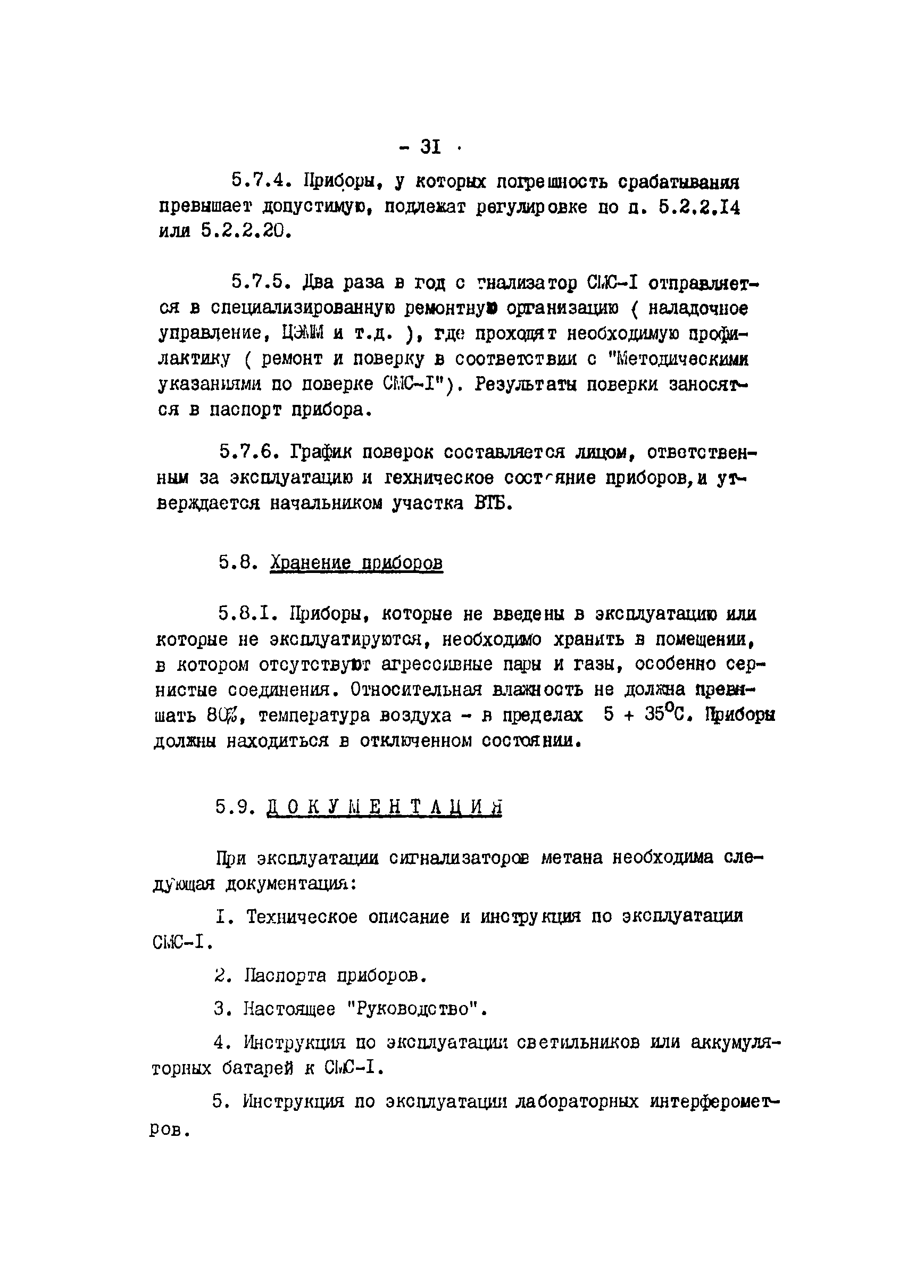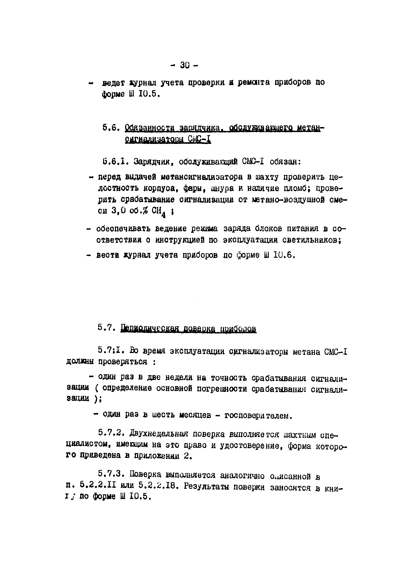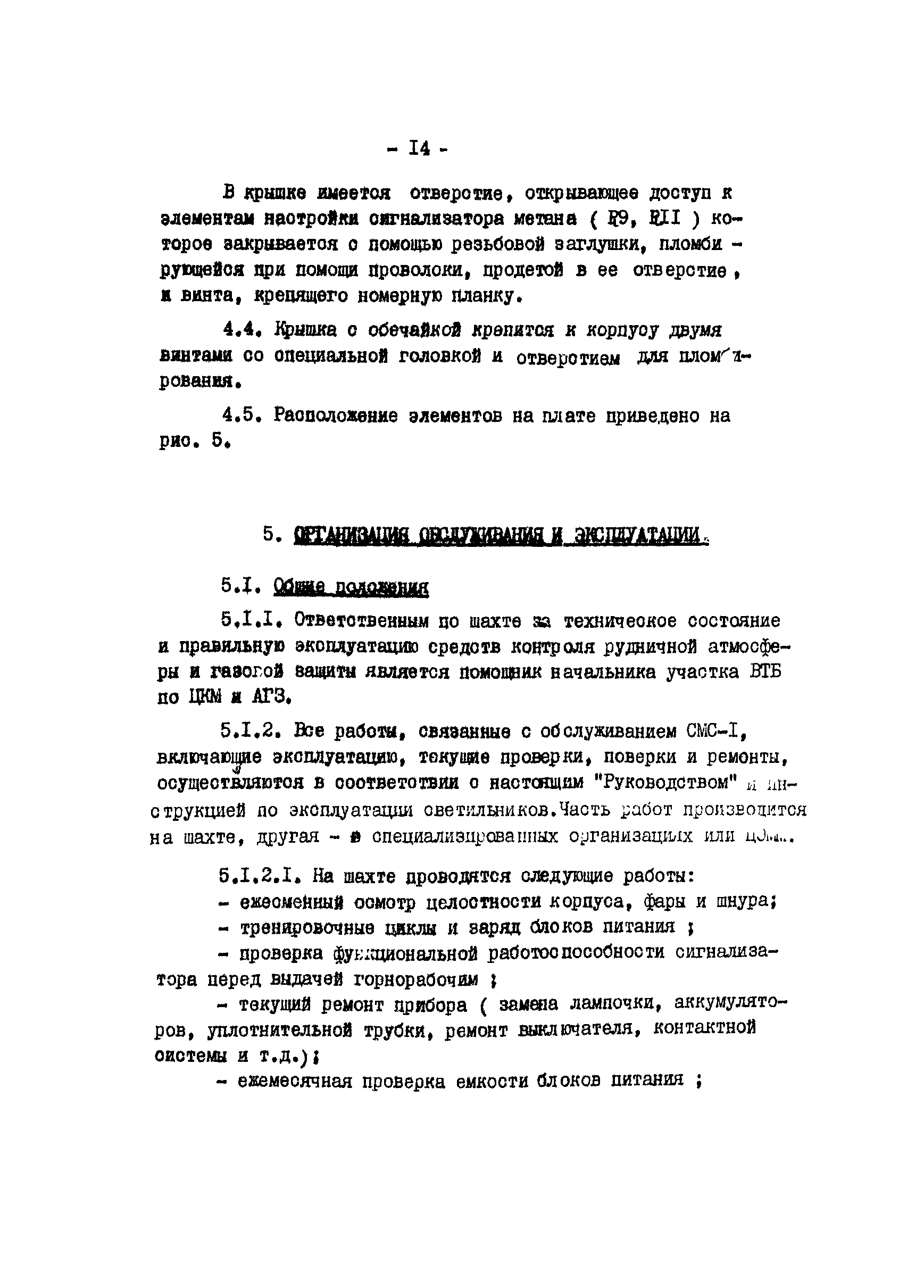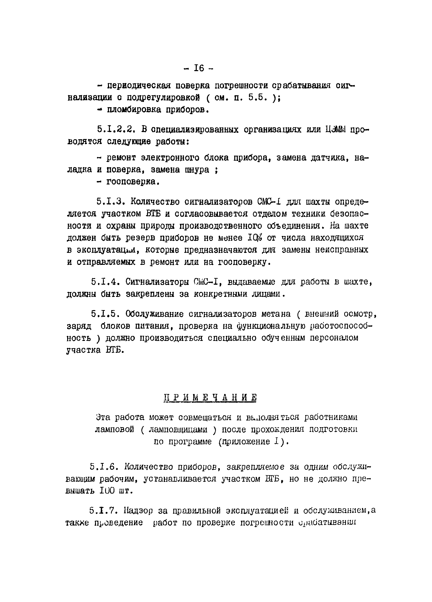 Руководство по эксплуатации и обслуживанию сигнализаторов метана, совмещенных с головными светильниками СМС-1 "Маяк"| Статус: | справочные материалы, мп, тпр | | Название рус.: | Руководство по эксплуатации и обслуживанию сигнализаторов метана, совмещенных с головными светильниками СМС-1 "Маяк" | | Дата добавления в базу: | 01.02.2020 | | Дата актуализации: | 01.01.2021 | | Область применения: | Руководство является обязательным для всех предприятий и организаций Минуглепрома СССР, эксплуатирующих СМС-1 | | Оглавление: | 1. Назначение 2. Техническая характеристика СМС-1 3. Устройство и принцип действия сигнализатора метана 4. Конструкция СМС-1 5. Организация обслуживания и эксплуатации 5.1. Общие положения 5.2. Эксплуатация приборов 5.3. Подготовка сигнализаторов метана СМС-1 к выдаче в шахту 5.4. Правила обращения горнорабочего с СМС-1 5.5. Обязанности слесаря по обслуживанию и эксплуатации СМС-1 5.6. Обязанности зарядчика, обслуживающего метаносигнализаторы СМС-1 5.7. Периодическая поверка приборов 5.8. Хранение приборов 5.9. Документация Приложение 1. Программа обучения специалистов по эксплуатации, поверке и регулировке сигнализаторов метана СМС-1 Приложение 2. Бланк удостоверения Приложение 3. Перечень оборудования, приборов и инструментов для обслуживания сигнализатора метана СМС-1 Приложение 4. Характерные неисправности и меры их устранения Приложение 5. Методика приготовления МВС в кислородных подушках Приложение 6. Перечень элементов | | Разработан: | МакНИИ