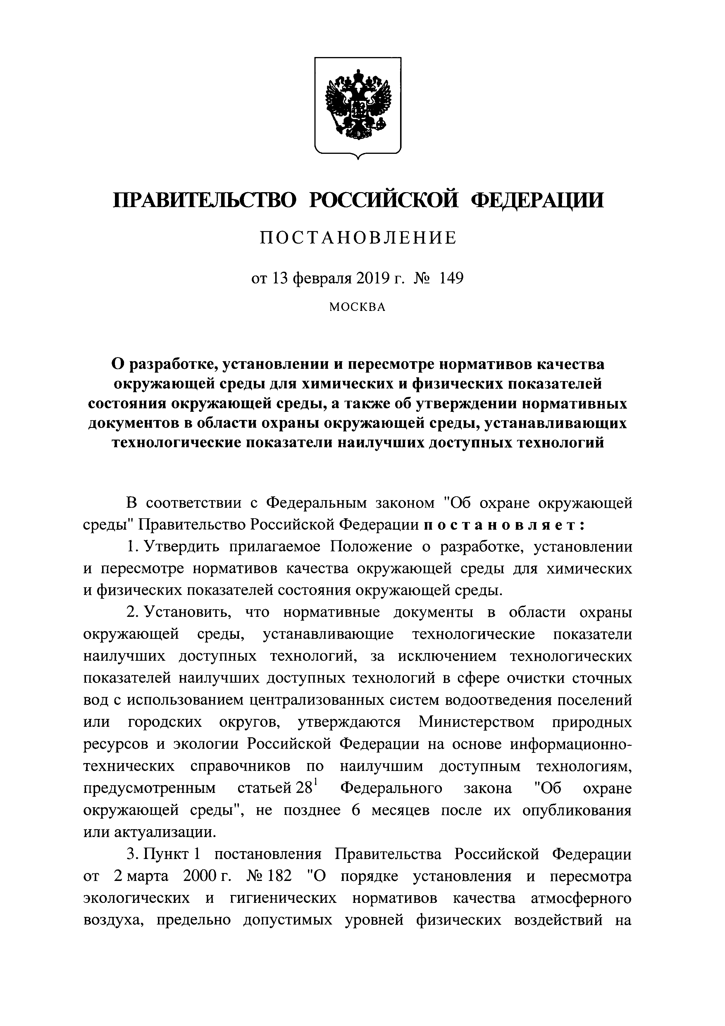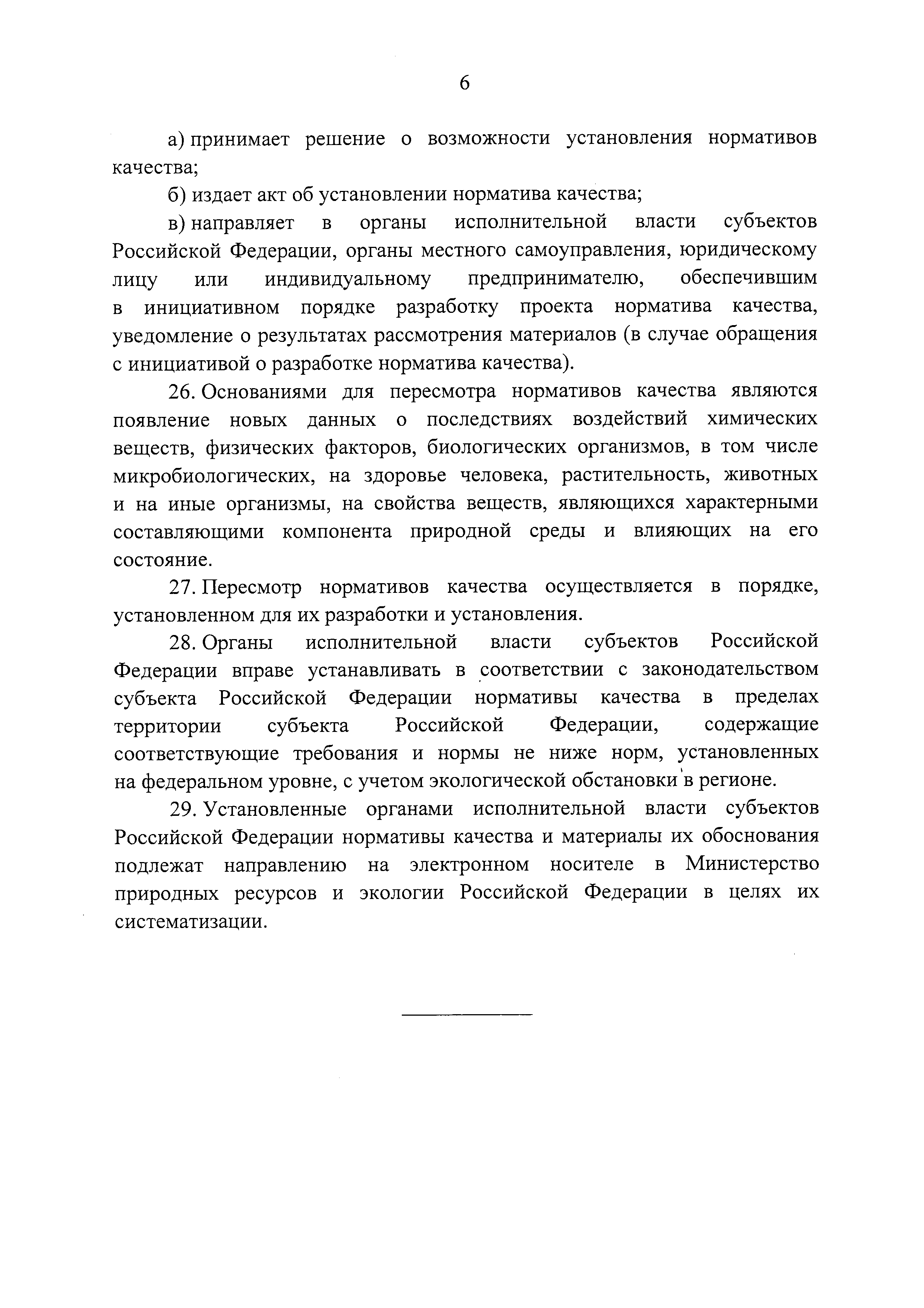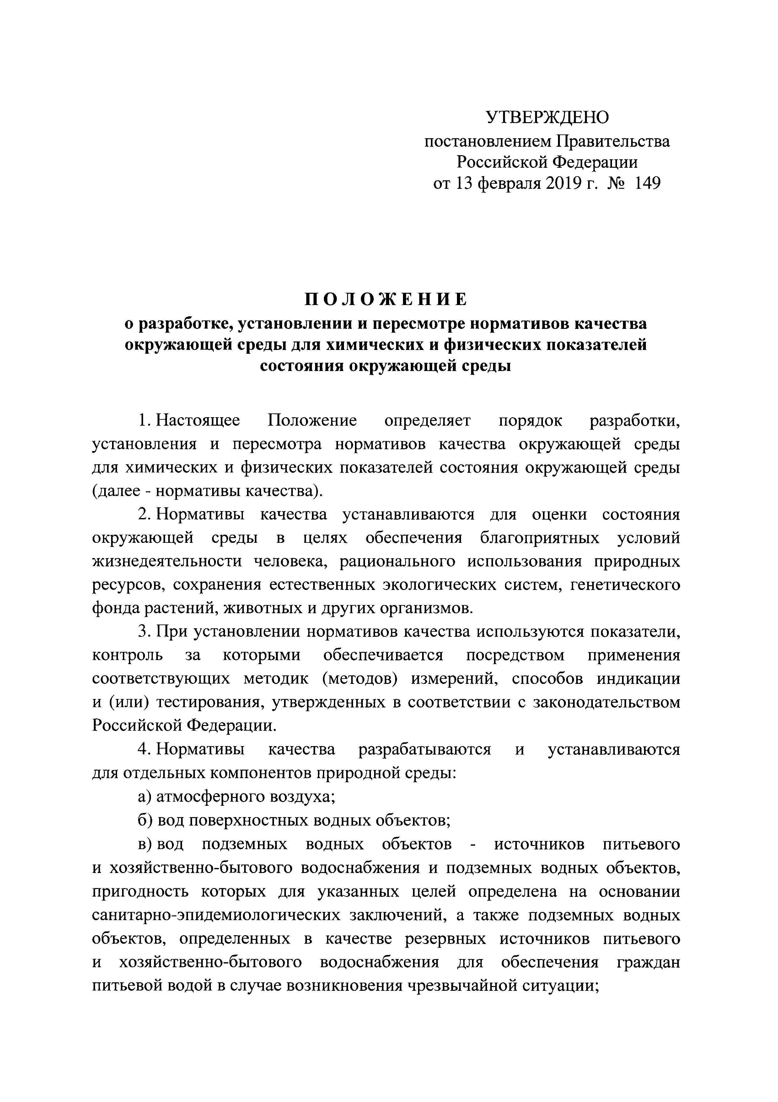 Положение о разработке, установлении и пересмотре нормативов качества окружающей среды для химических и физических показателей состояния окружающей среды| Статус: | действует | | Название рус.: | Положение о разработке, установлении и пересмотре нормативов качества окружающей среды для химических и физических показателей состояния окружающей среды | | Дата добавления в базу: | 01.02.2020 | | Дата актуализации: | 01.01.2021 | | Дата введения: | 27.02.2019 | | Область применения: | Положение определяет порядок разработки, установления и пересмотра нормативов качества окружающей среды для химических и физических показателей состояния окружающей среды | | Утверждён: | 13.02.2019 Правительство Российской Федерации (149)