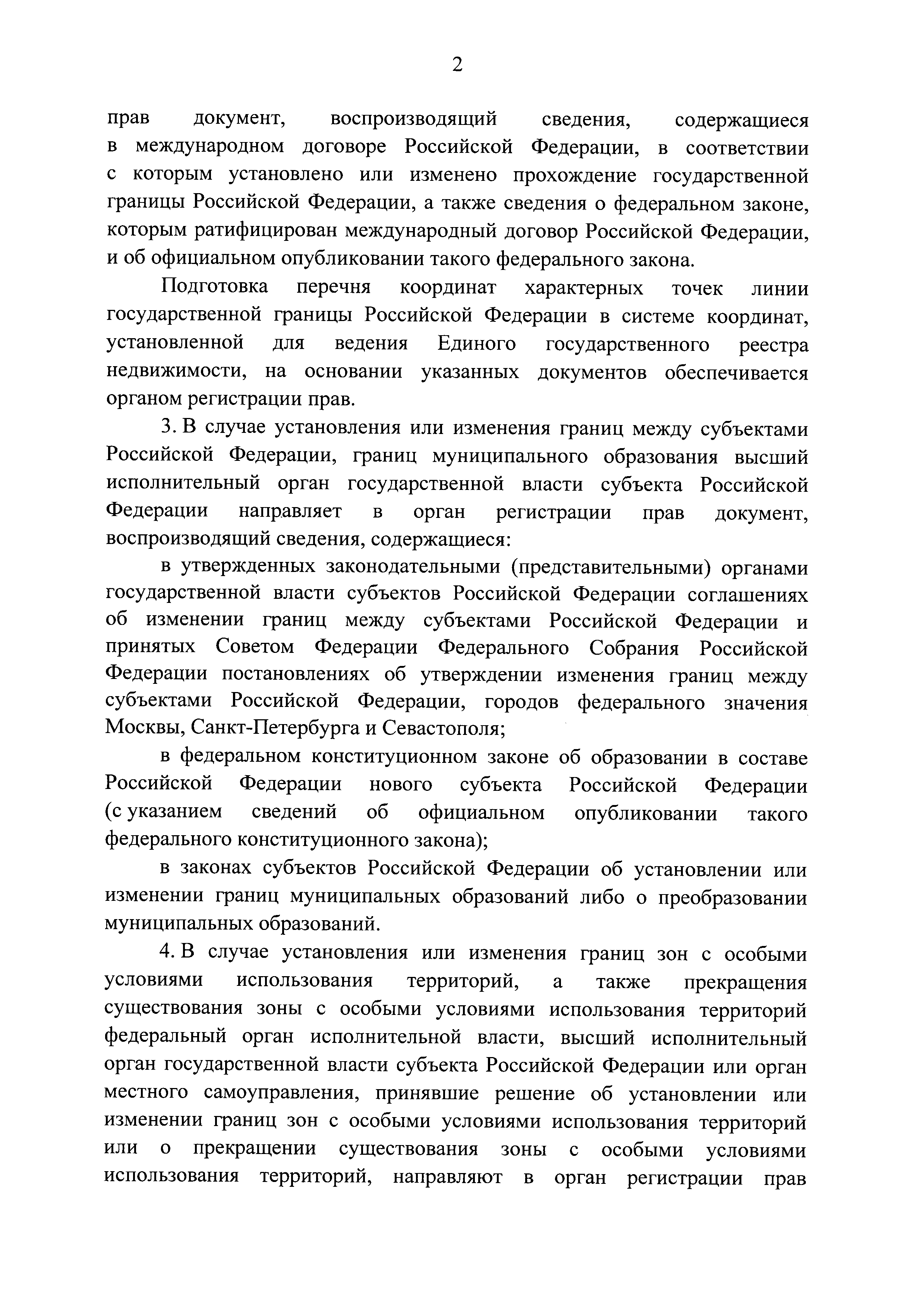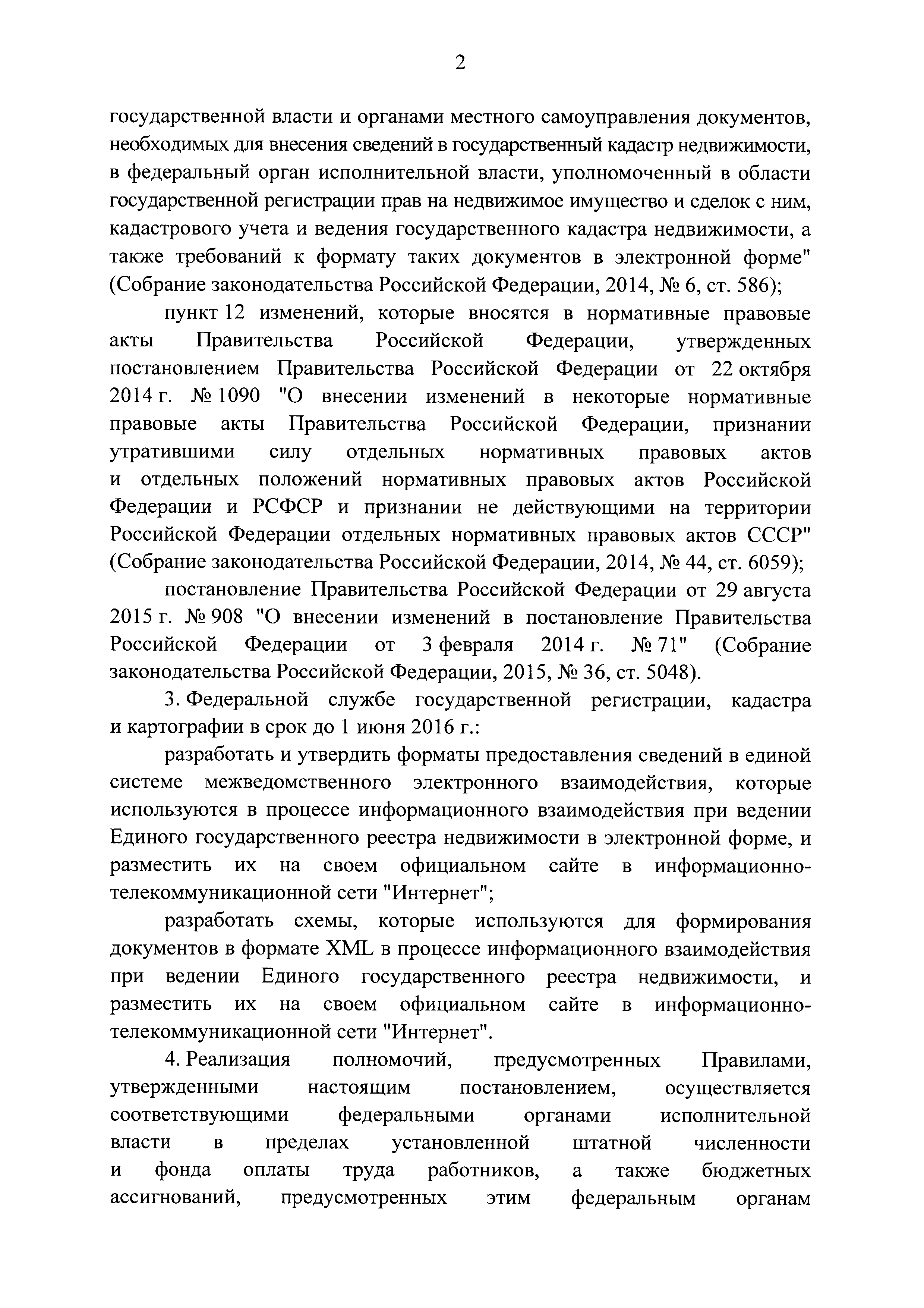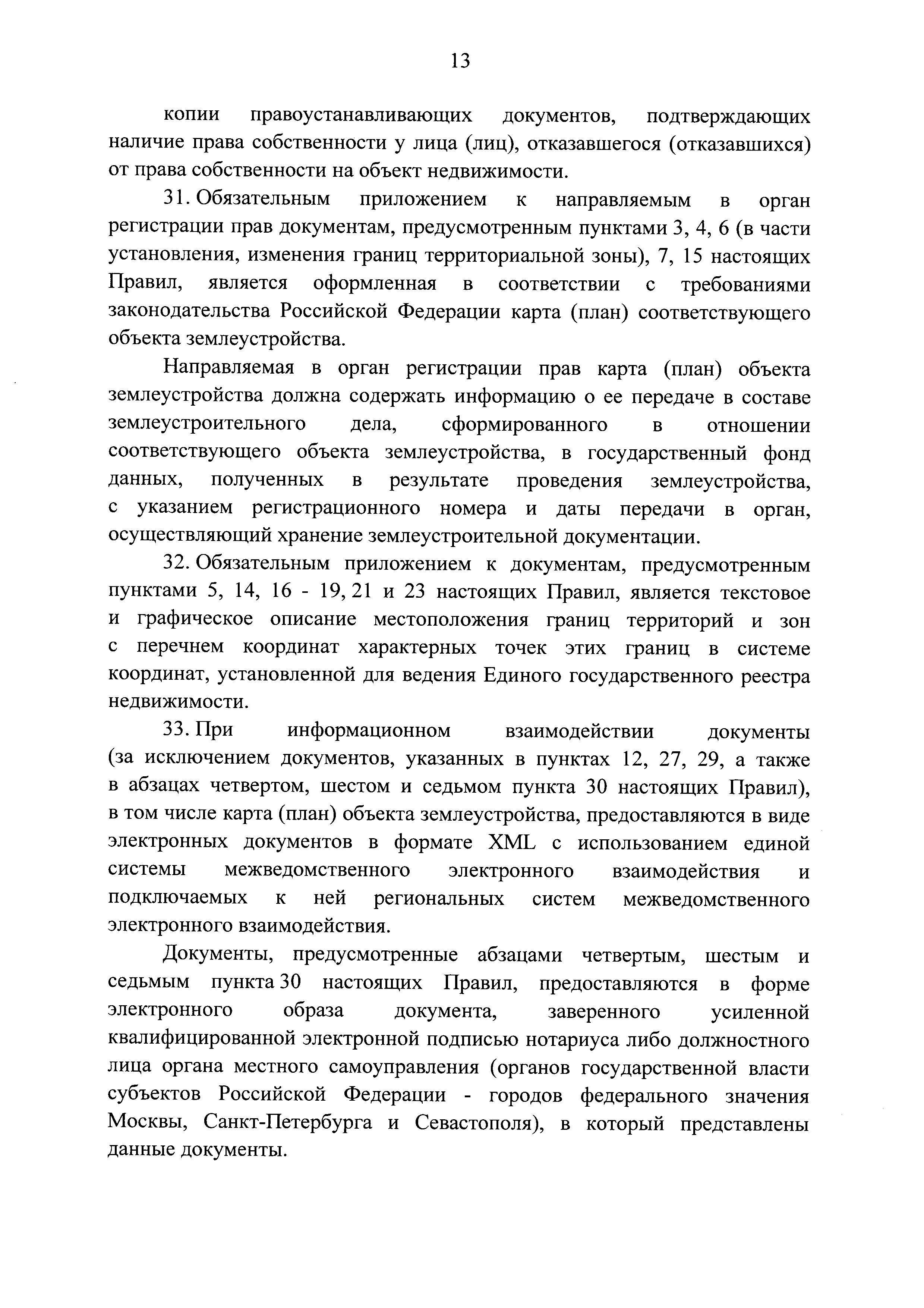 Правила предоставления документов, направляемых или предоставляемых в соответствии с частями 1, 3 - 13, 15, 15.1, 15.2 статьи 32 Федерального закона "О государственной регистрации недвижимости" в федеральный орган исполнительной власти (его территориальные органы), уполномоченный Правительством Российской Федерации на осуществление государственного кадастрового учета, государственной регистрации прав, ведение Единого государственного реестра недвижимости и предоставление сведений, содержащихся в Едином государственном реестре недвижимости| Статус: | действует | | Название рус.: | Правила предоставления документов, направляемых или предоставляемых в соответствии с частями 1, 3 - 13, 15, 15.1, 15.2 статьи 32 Федерального закона "О государственной регистрации недвижимости" в федеральный орган исполнительной власти (его территориальные органы), уполномоченный Правительством Российской Федерации на осуществление государственного кадастрового учета, государственной регистрации прав, ведение Единого государственного реестра недвижимости и предоставление сведений, содержащихся в Едином государственном реестре недвижимости | | Дата добавления в базу: | 01.02.2020 | | Дата актуализации: | 01.01.2021 | | Дата введения: | 01.01.2017 | | Область применения: | Правила устанавливают перечень документов и состав содержащихся в них сведений, направляемых или предоставляемых в соответствии с частями 1, 3 - 13, 15, 15.1 статьи 32 Федерального закона "О государственной регистрации недвижимости" в федеральный орган исполнительной власти (его территориальные органы), уполномоченный Правительством Российской Федерации на осуществление государственного кадастрового учета, государственной регистрации прав, ведение Единого государственного реестра недвижимости и предоставление сведений, содержащихся в Едином государственном реестре недвижимости, порядок их направления или предоставления органами государственной власти, органами местного самоуправления, судами в орган регистрации прав, в том числе с использованием единой системы межведомственного электронного взаимодействия и подключаемых к ней региональных систем межведомственного электронного взаимодействия, а также требования к формату таких документов в электронной форме | | Утверждён: | 31.12.2015 Правительство Российской Федерации (1532)