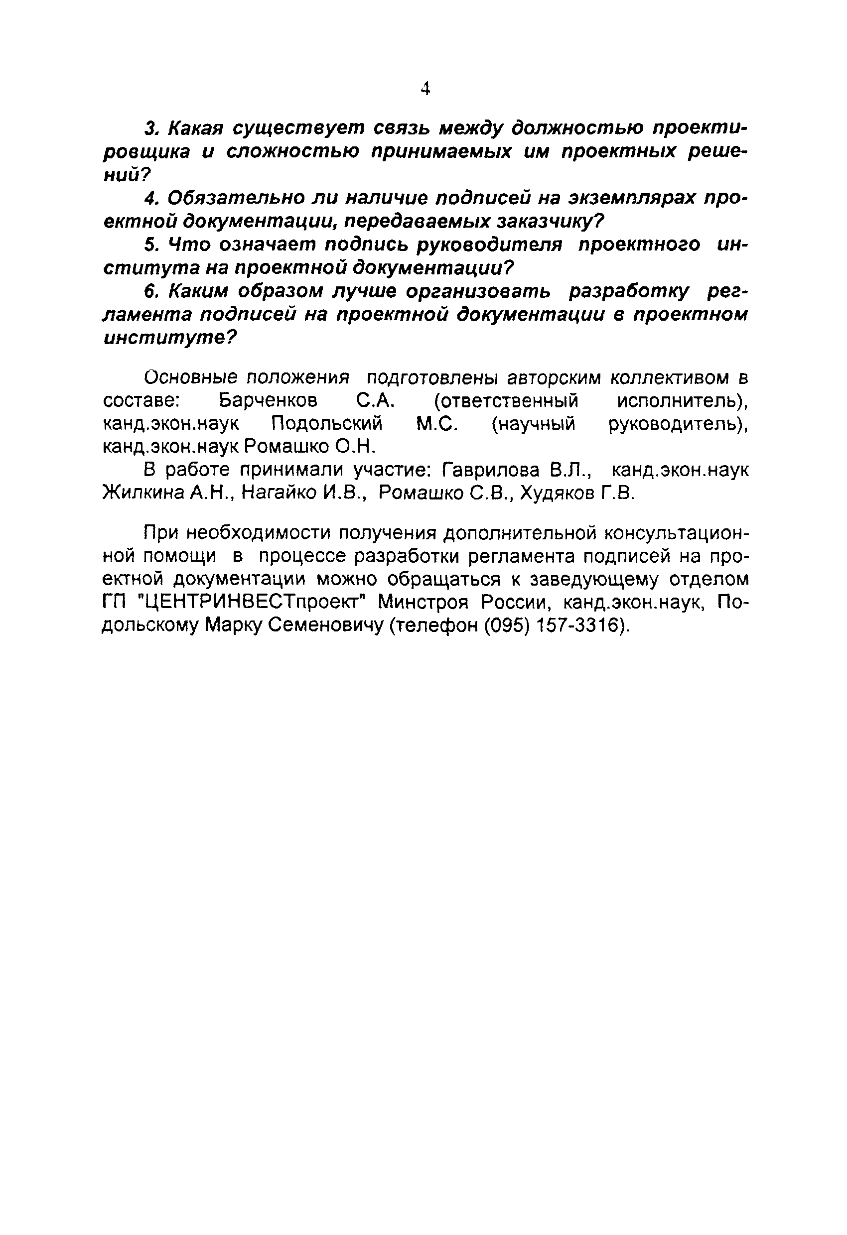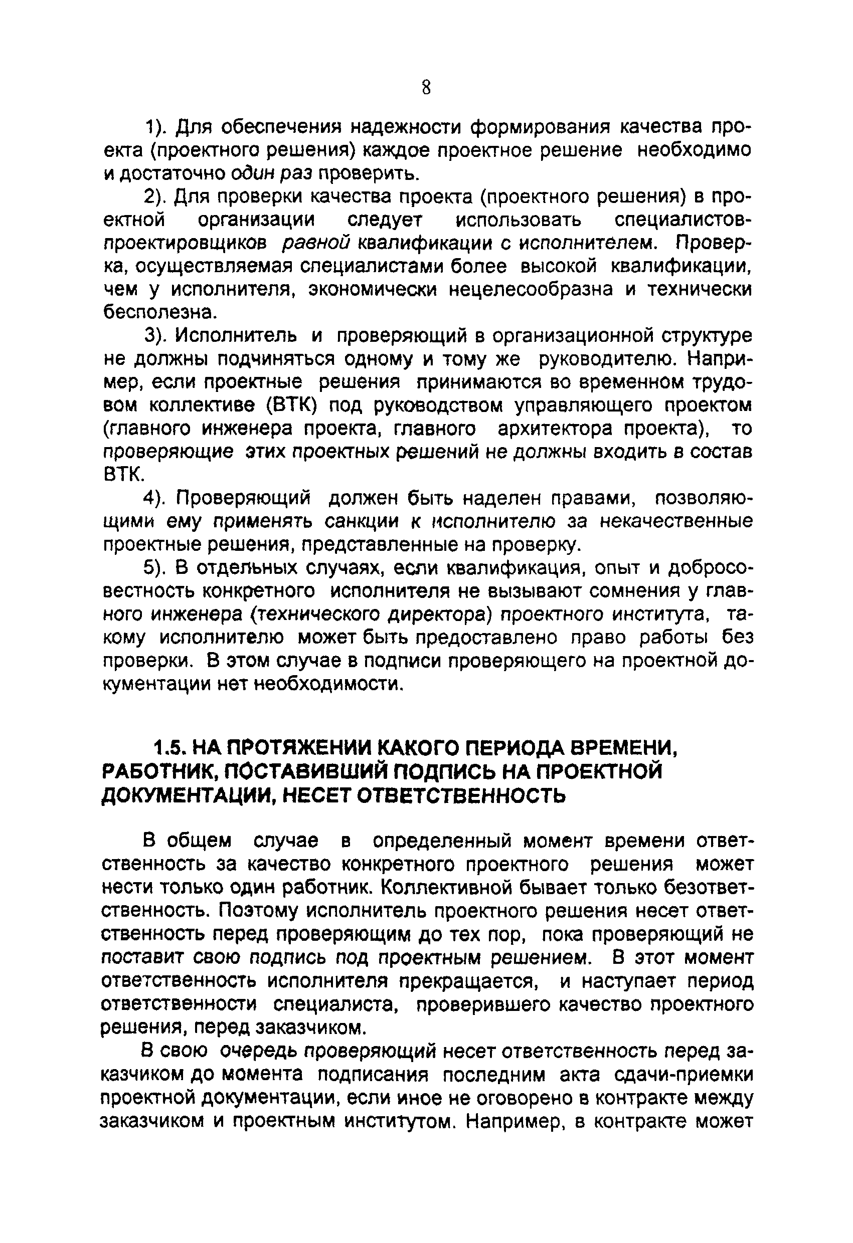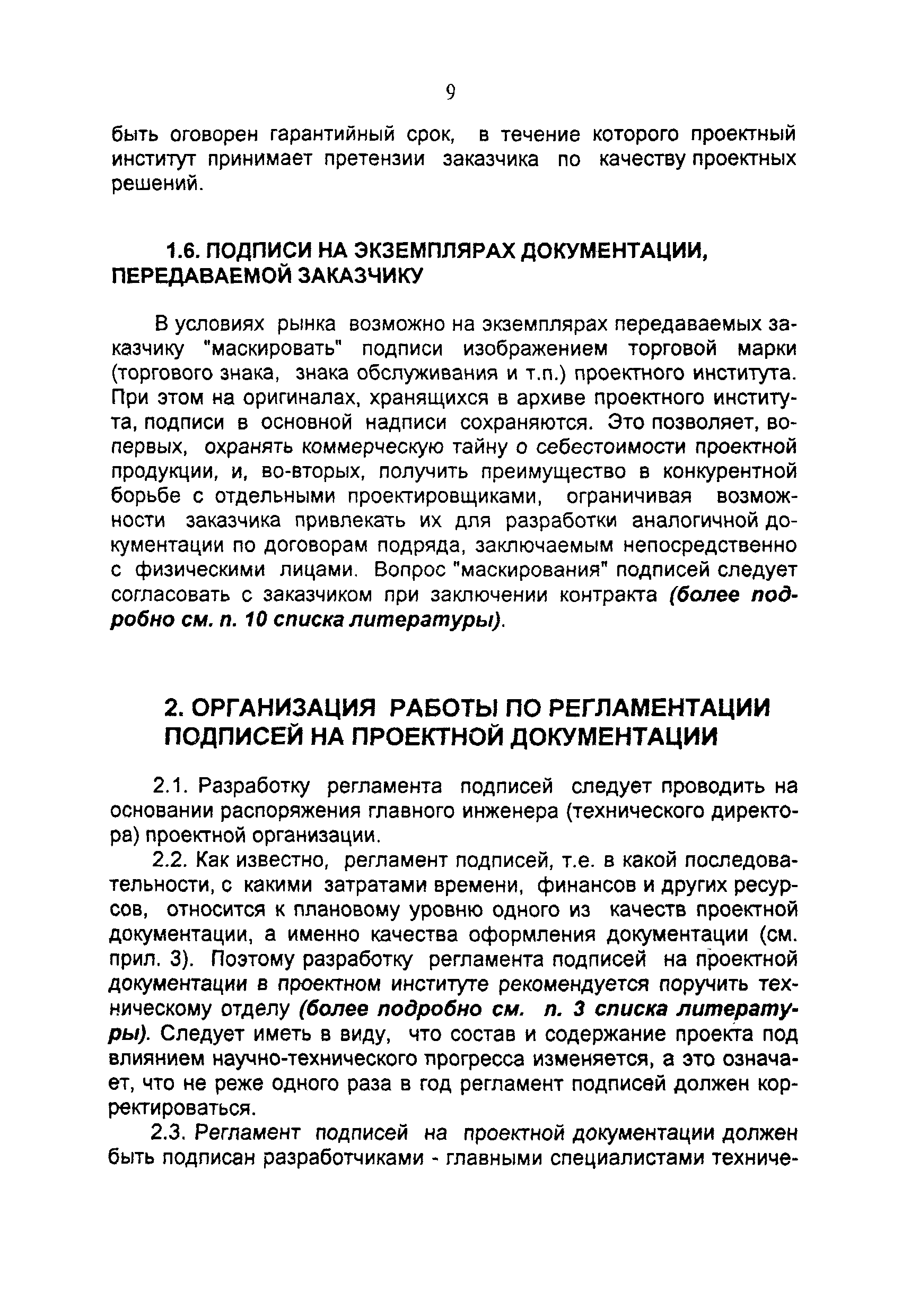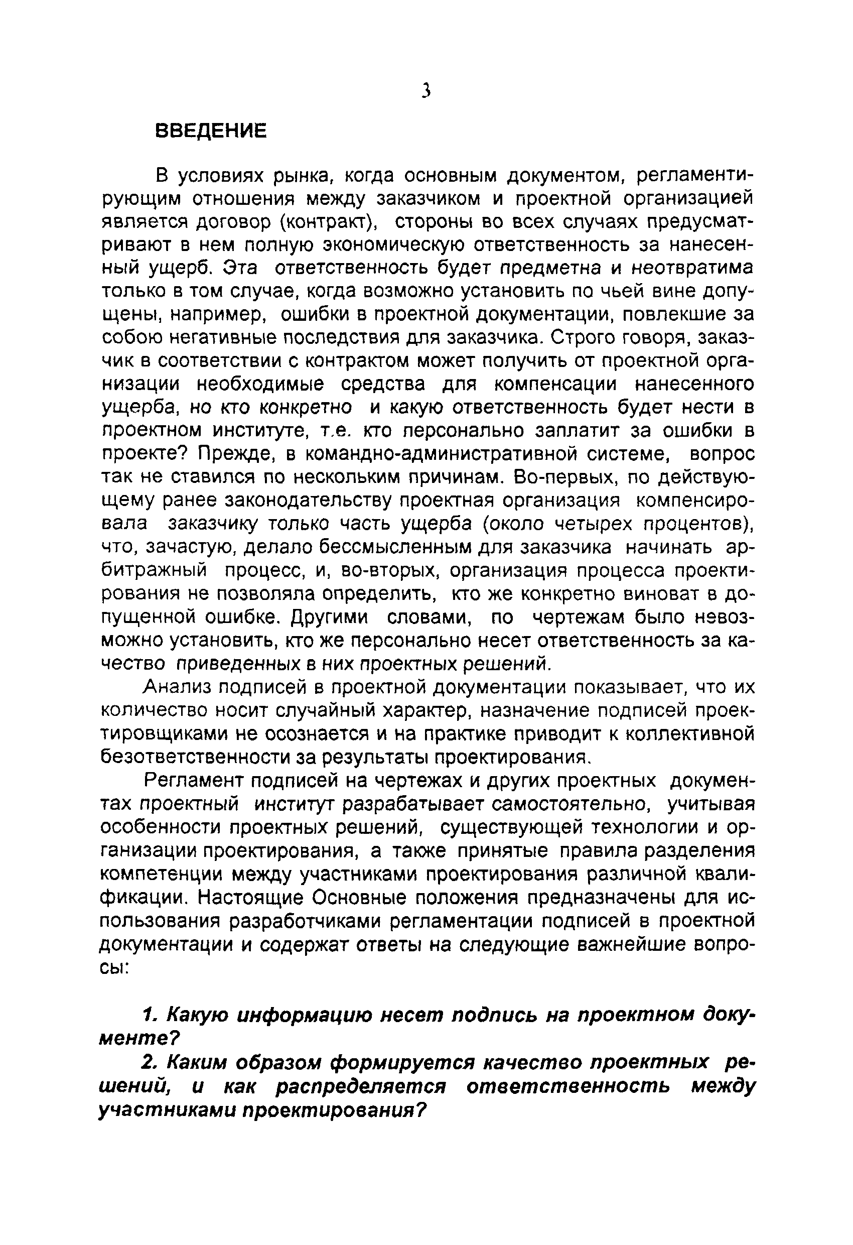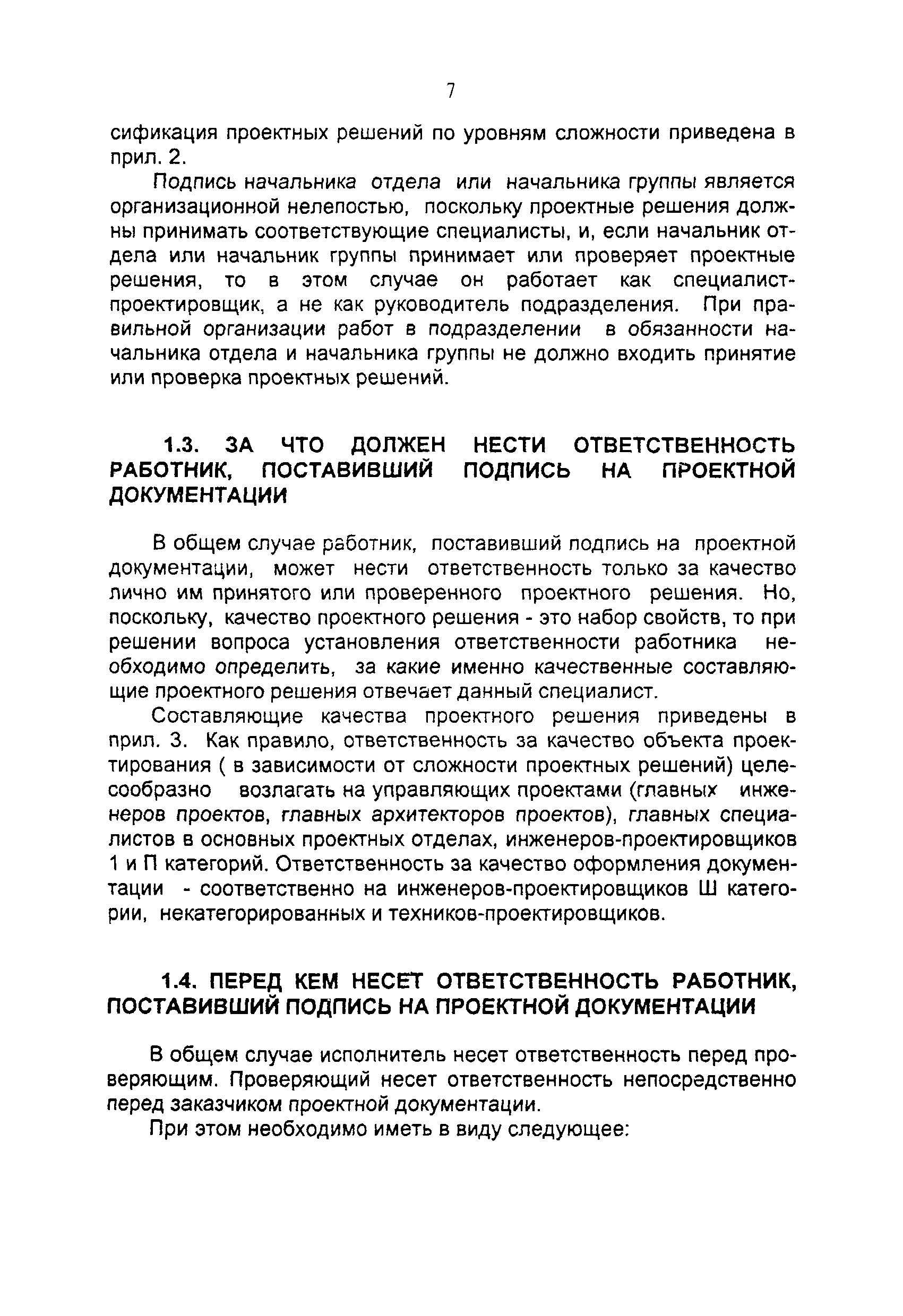 Регламентация подписей на проектной документации. Основные положения (издание 2)| Статус: | справочные материалы, мп, тпр | | Название рус.: | Регламентация подписей на проектной документации. Основные положения (издание 2) | | Дата добавления в базу: | 01.02.2020 | | Дата актуализации: | 01.01.2021 | | Область применения: | Регламент подписей на чертежах и других проектных документах проектный институт разрабатывает самостоятельно, учитывая особенности проектных решений, существующей технологии и организации проектирования, а также принятые правила разделения компетенции между участниками проектирования различной квалификации. Настоящие Основные положения предназначены для использования разработчиками регламентации подписей в проектной документации | | Оглавление: | Введение 1. Особенности регламентации подписей на проектной документации 1.1. Основные понятия 1.2. Кому должна принадлежать подпись на проектной документации 1.3. За что должен нести ответственность работник, поставивший подпись на проектной документации 1.4. Перед кем несет ответственность работник, поставивший подпись на проектной документации 1.5. На протяжении какого периода времени, работник, поставивший подпись на проектной документации, несет ответственность 1.6. Подписи на экземплярах документации, передаваемой заказчику 2. Организация работы по регламентации подписей на проектной документации Список литературы Приложение 1. Правила изложения должностных обязанностей работников проектной организации Приложение 2. Примерная классификация проектных решений по уровням сложности Приложение 3. Составляющие качества проектного решения | | Разработан: | ЦЕНТРИНВЕСТпроект при Минстрое России