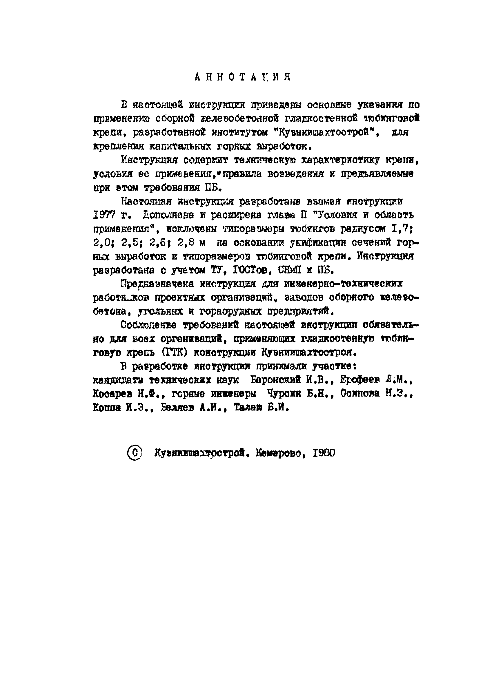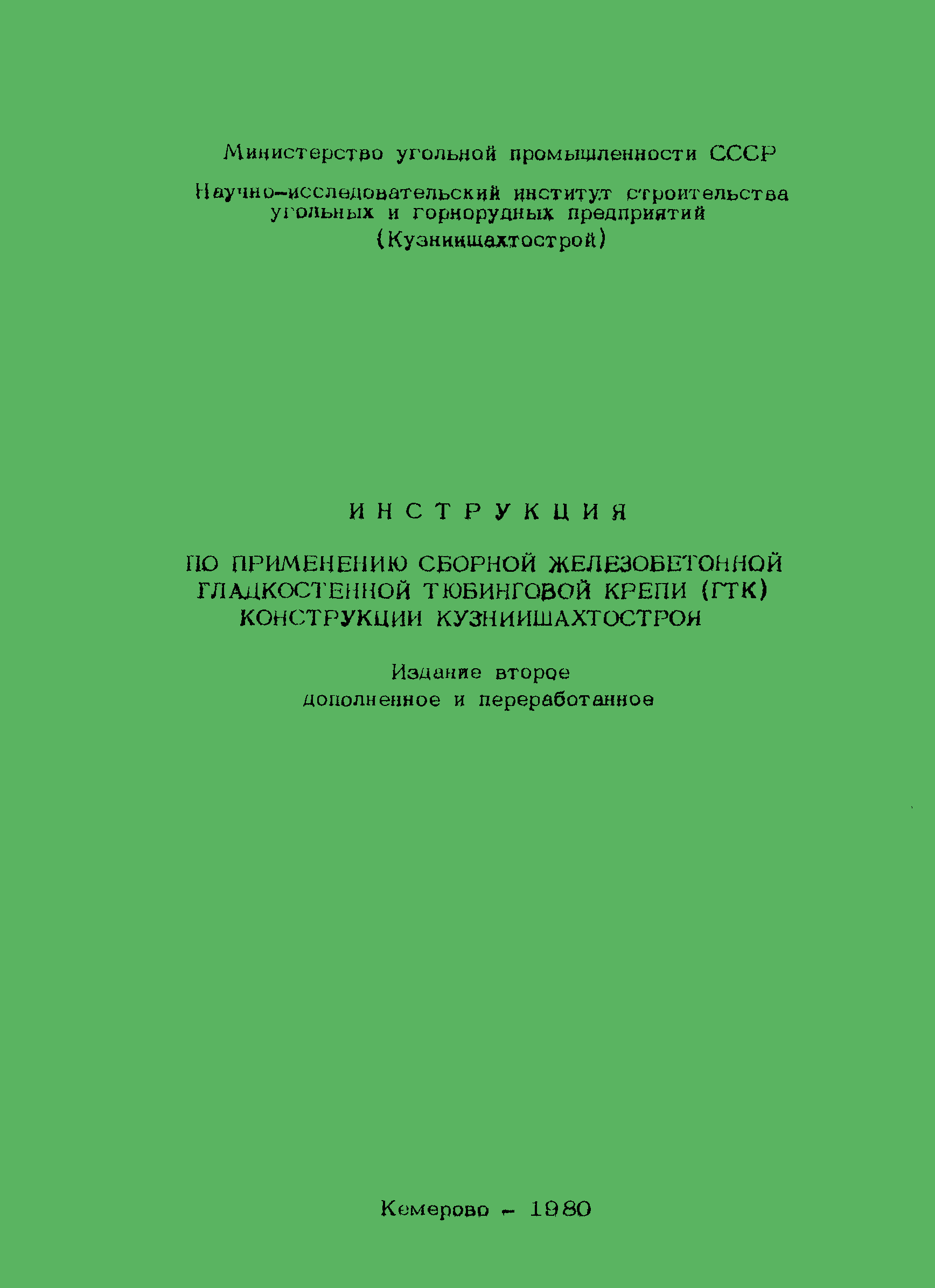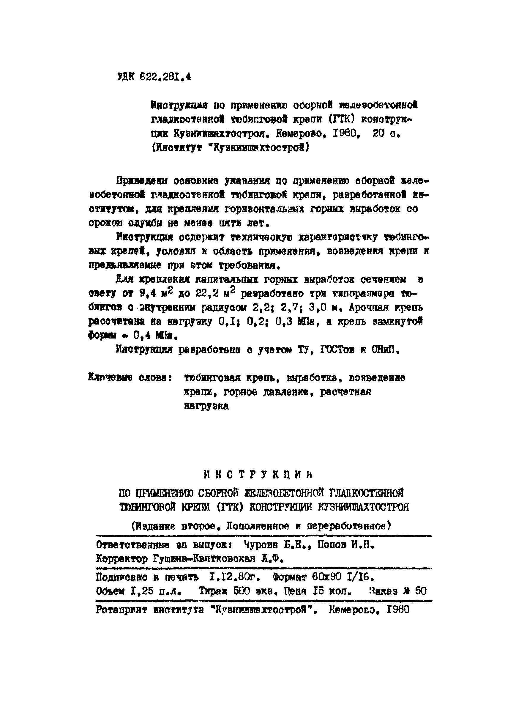 | Название рус.: | Инструкция по применению сборной железобетонной гладкостенной тюбинговой крепи (ГТК) конструкции Кузниишахтостроя |