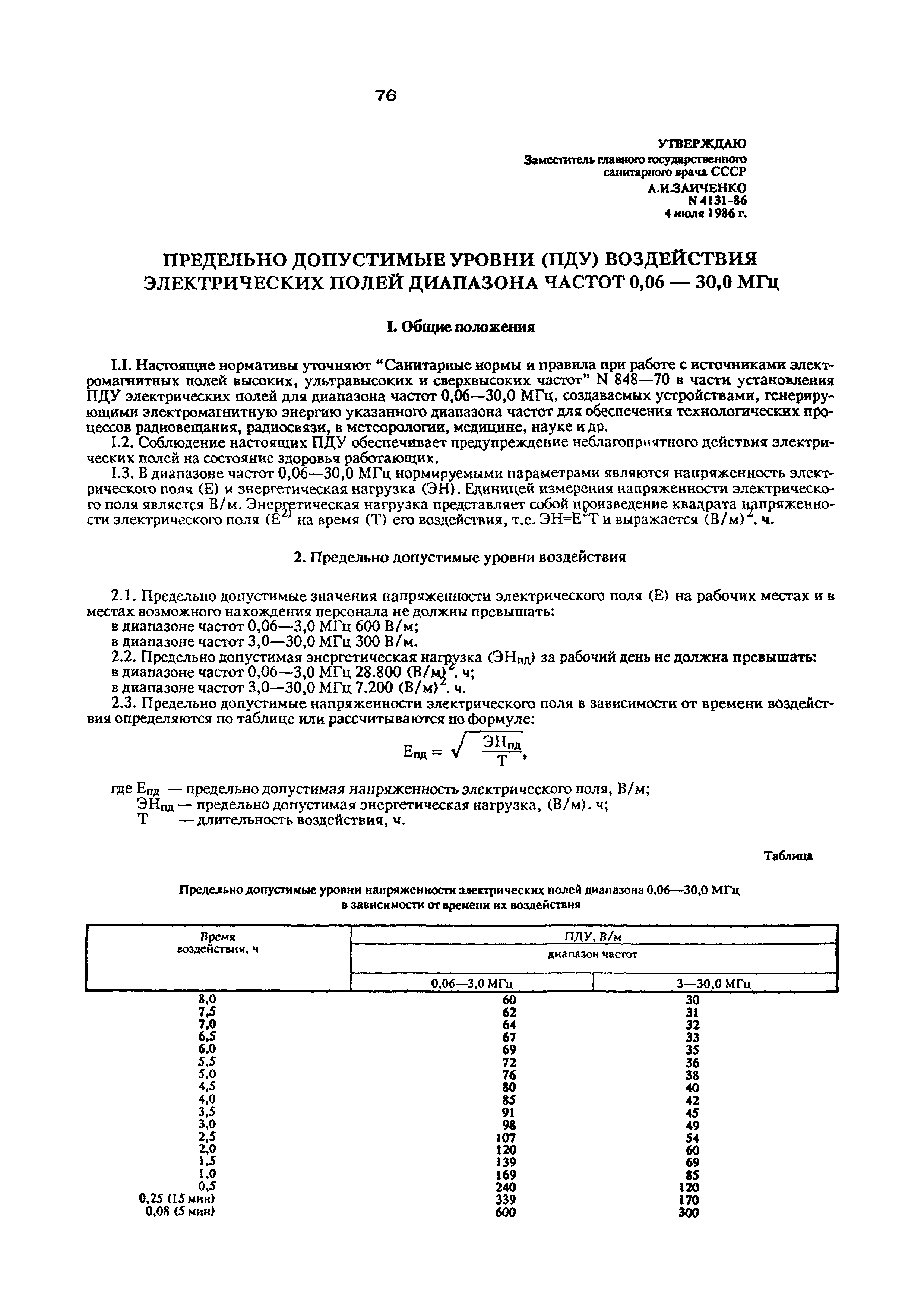 Соблюдение настоящих ПДУ обеспечивает предупреждение неблагоприятного действия электрических полей на состояние здоровья работающих | | Оглавление: | 1. Общие положения 2. Предельно допустимые уровни воздействия | | Утверждён: | 04.07.1986 Зам. Главного Государственного санитарного врача СССР (USSR Deputy Chief Public Health Officer 4131-86)