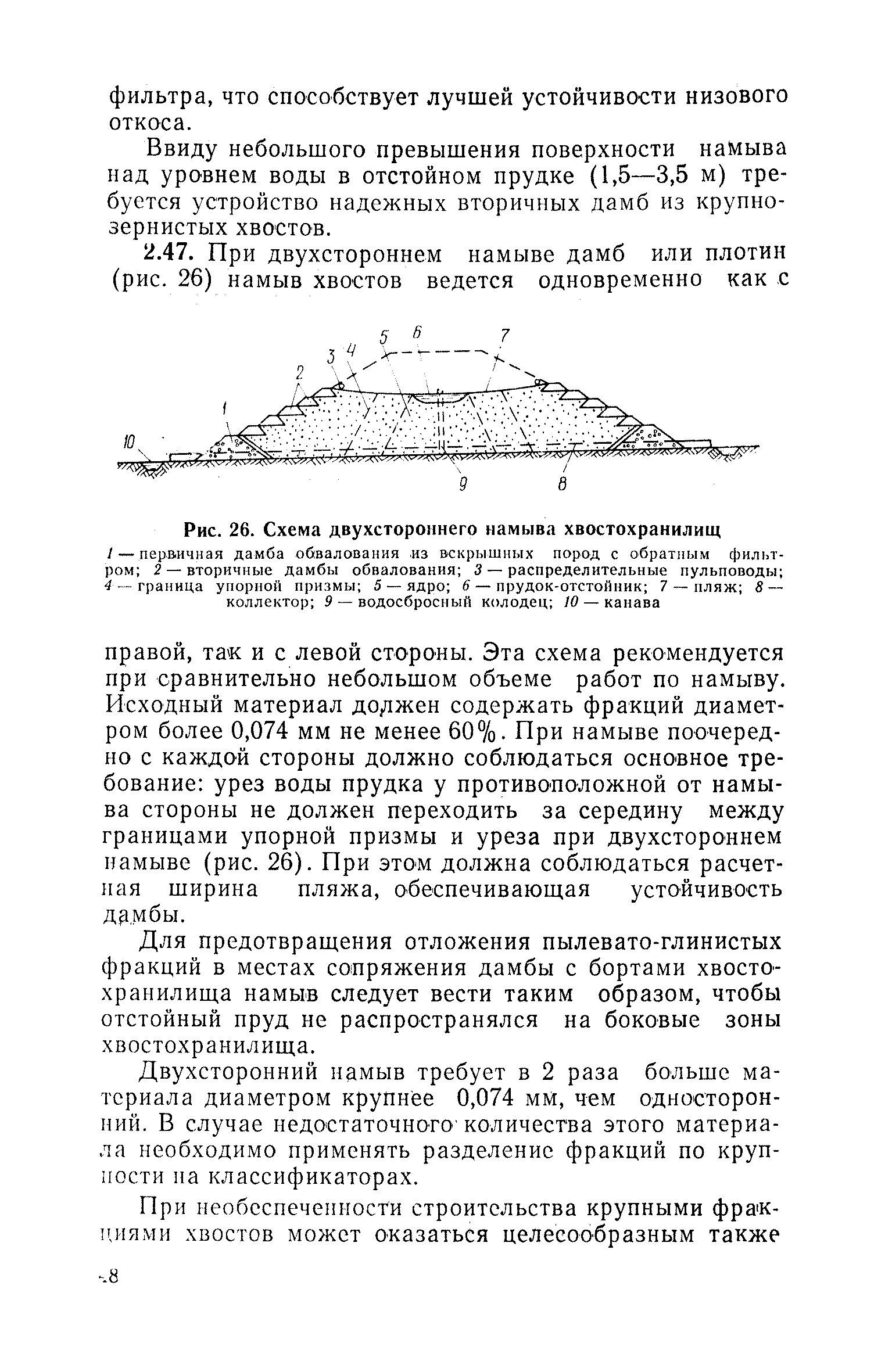 | Оглавление: | Предисловие 1. Общие положения 2. Хвостохранилище Выбор площадки хвостохранилища и объем согласований Выбор класса капитальности хвостохранилища Физико-механические характеристики хвостов и грунта Схемы заполнения и намыва хвостохранилища Расчет емкости хвостохранилища Допускаемые разрывы между сооружениями хвостового хозяйства и населенными пунктами, водоемами и др. Защита от подтопления и заболачивания территории за пределами хвостохранилища 3. Проектирование и возведение гидротехнических сооружений хвостохранилищ Выбор типа плотин и ограждающих дамб Дренажные устройства Проектирование ограждающих дамб 4. Гидротранспорт хвостов Общие положения Исходные и расчетные данные по хвостам и пульпе Трасса пульповодов Гидравлические расчеты пульповодов Теплотехнические и статические расчеты по пульповодам Гидравлический удар и борьба с ним Пульпонасосные станции 5. Водосбросные сооружения, водный баланс хвостохранилища и оборотное водоснабжение Общие положения Расчет коллекторов Водный баланс хвостохранилища Оборотное водоснабжение Расчет прудка-отстойника 6. Эксплуатация хвостохранилищ 7. Технико-экономические расчеты и показатели Расчет капиталовложений Расчет эксплуатационных расходов Приложение 1. Данные для расчета гидротранспорта хвостов Приложение 2. Примеры расчетов технико-экономических показателей хвостового хозяйства Список литературы |