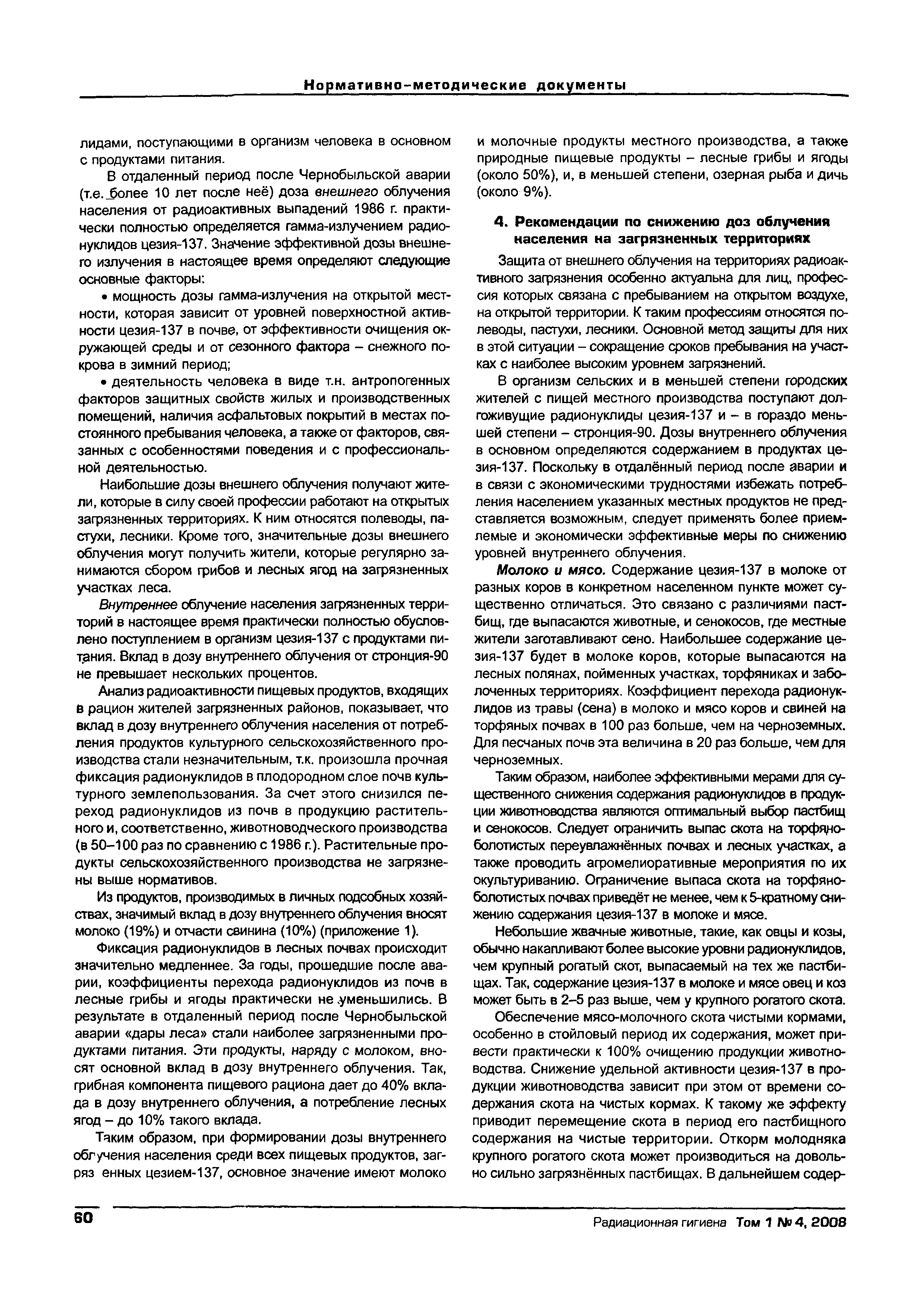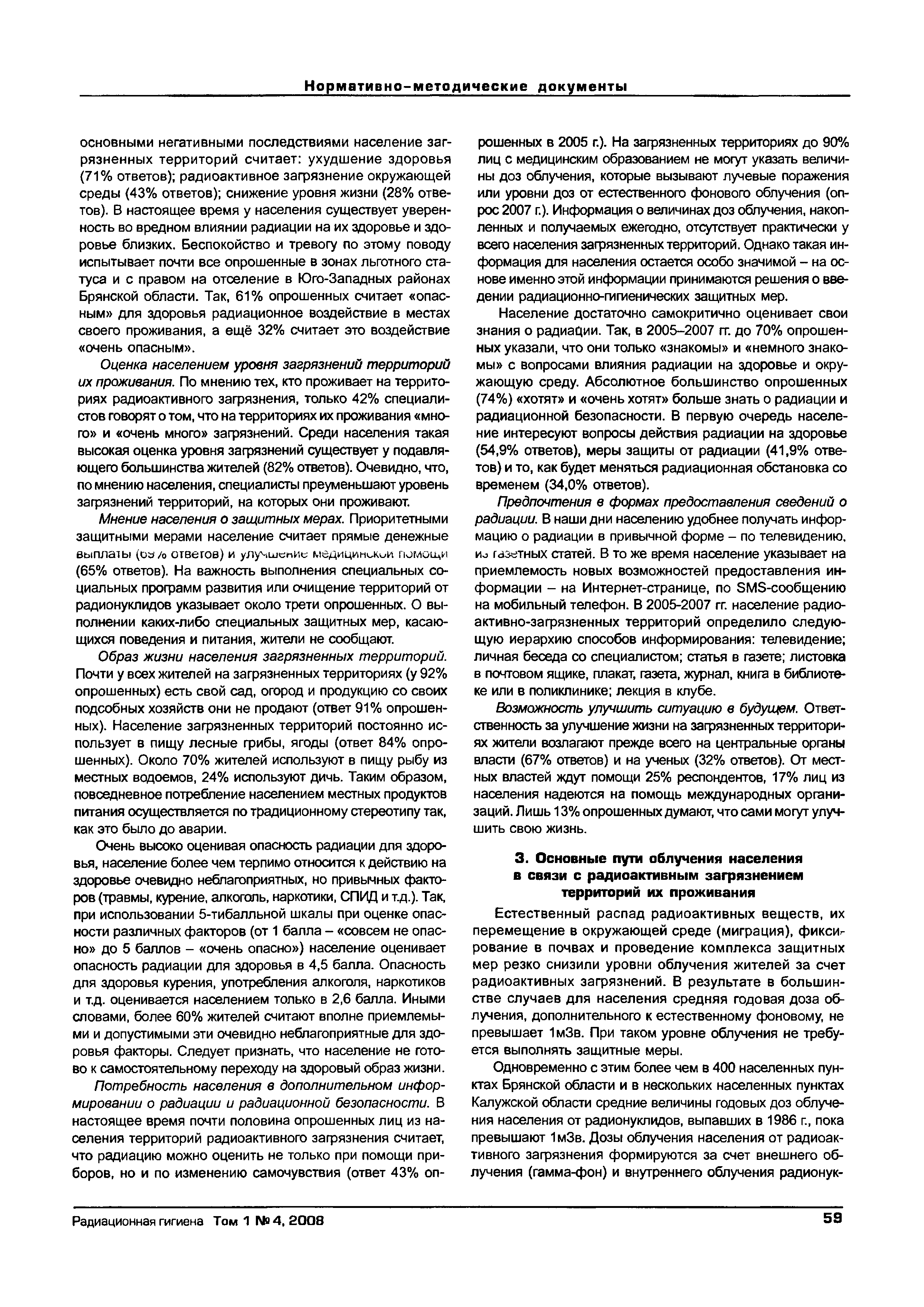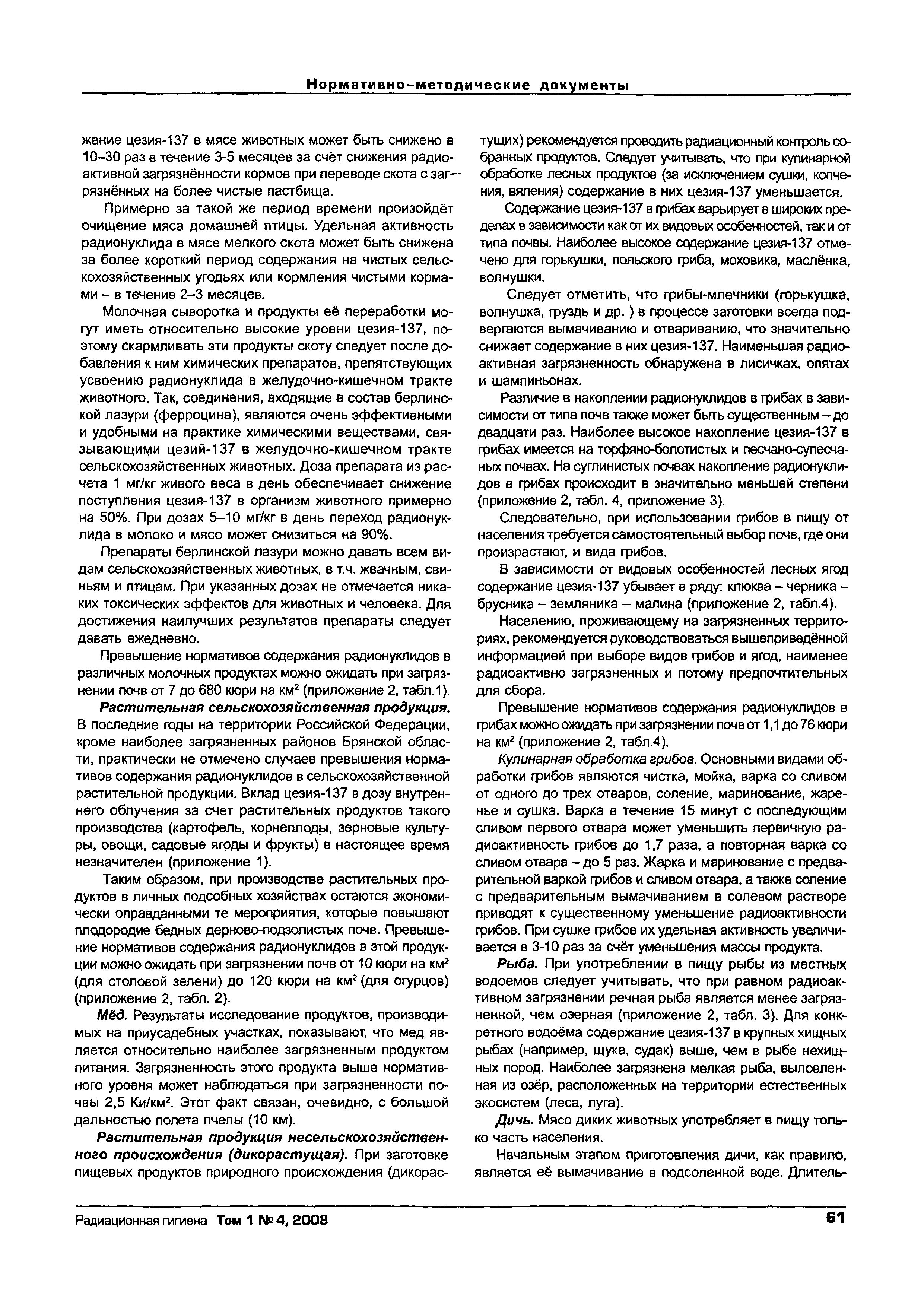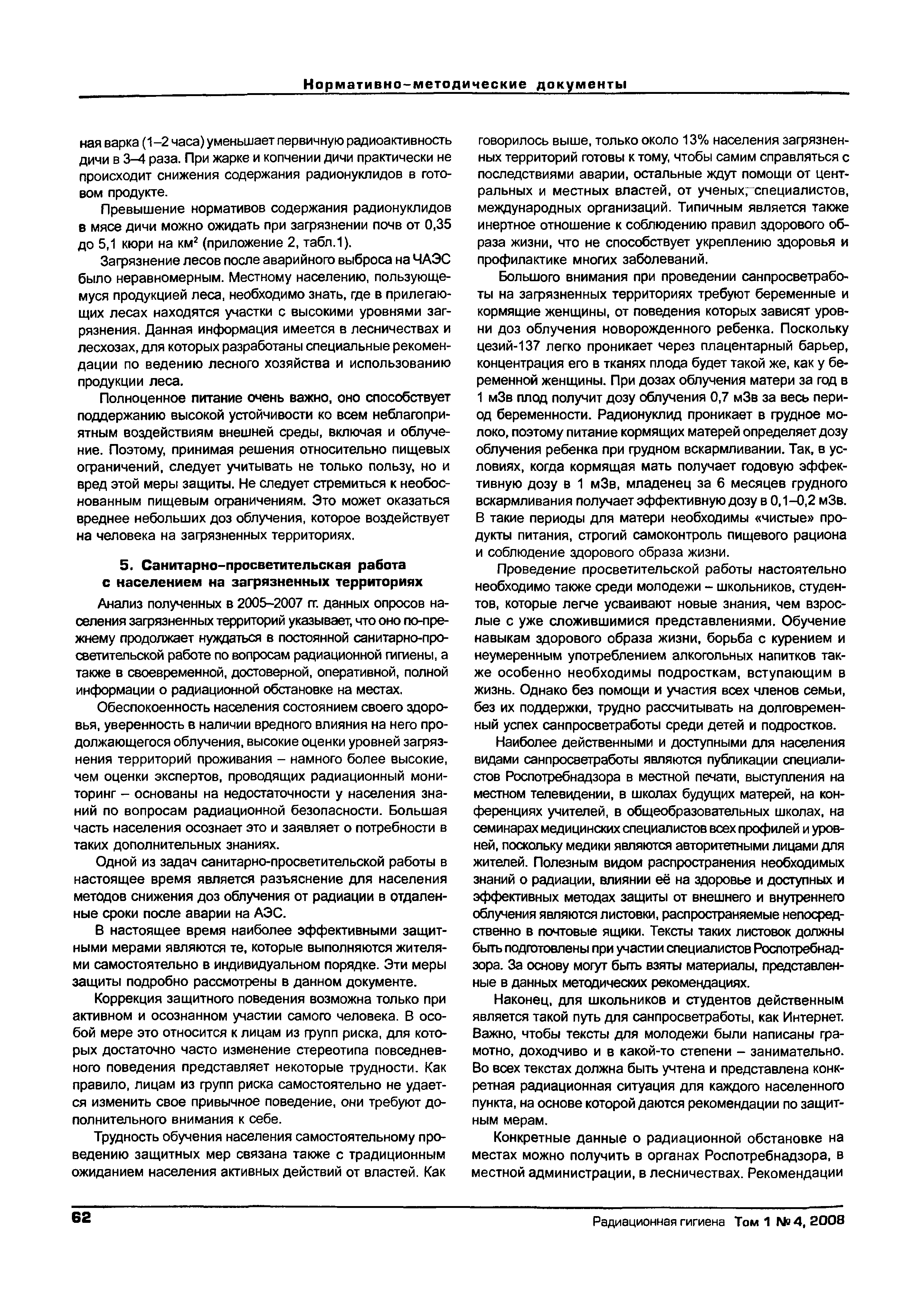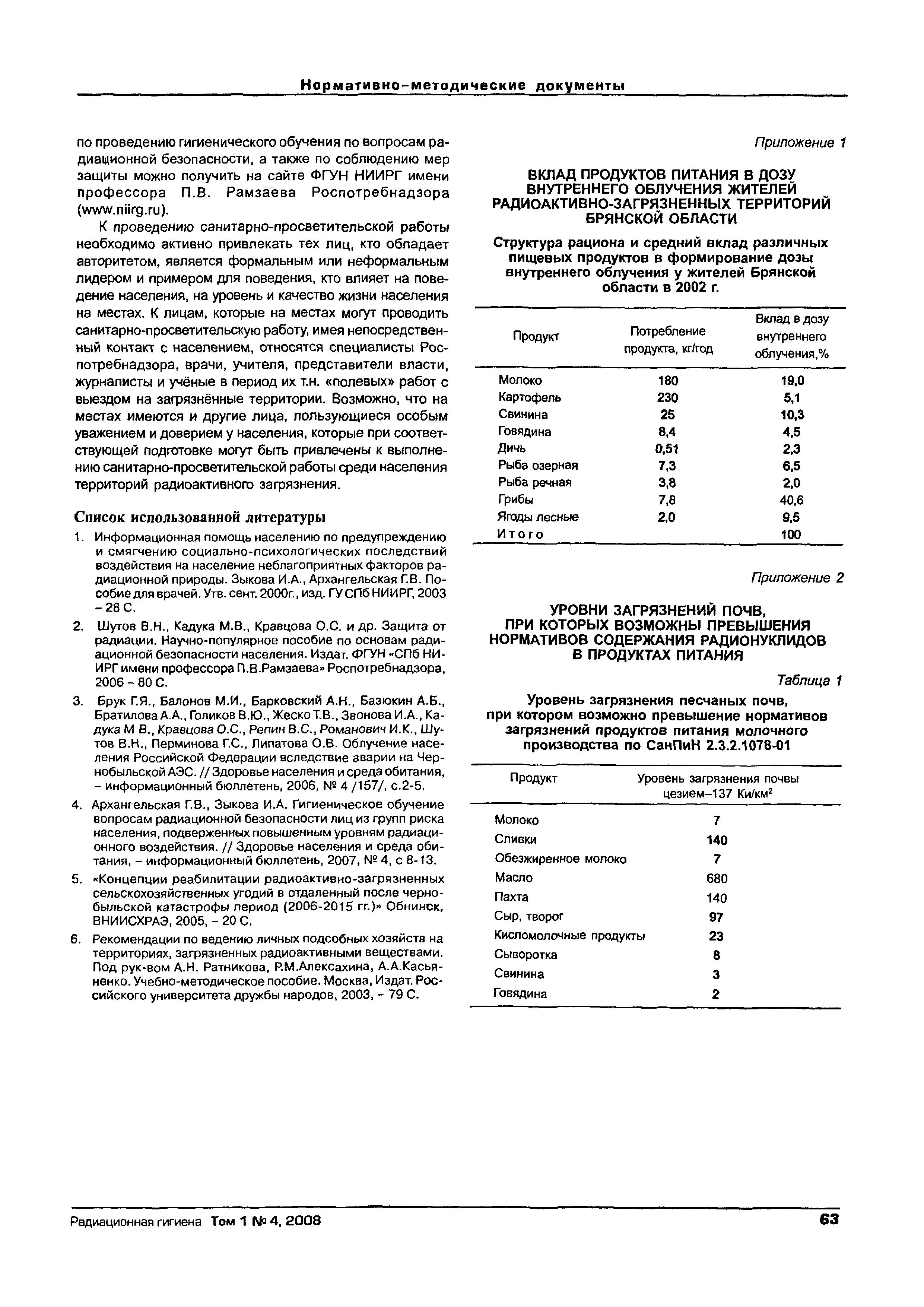В документе изложена информация о радиационной обстановке на местах, необходимая для проведения санитарно-просветительской работы. Эта информация включает сведения об основных путях облучения населения, о наиболее доступных методах снижения доз дополнительного облучения, о наличии "критических" групп среди всего населения. Рассматриваются факторы и условия, влияющие на восприятие информации об опасности радиации, приводятся сведения об информационных потребностях лиц из групп риска населения | | Оглавление: | 1. Введение 2. Отношение населения к радиоактивному загрязнению окружающей среды и к защитным мерам 3. Основные пути облучения населения в связи с радиоактивным загрязнением территорий их проживания 4. Рекомендации по снижению доз облучения населения на загрязненных территориях 5. Санитарно-просветительская работа с населением на загрязненных территориях Список использованной литературы Приложение 1. Вклад продуктов питания в дозу внутреннего облучения жителей радиоактивно-загрязненных территорий Брянской области Приложение 2. Уровни загрязнений почв, при которых возможны превышения нормативов содержания радионуклидов в продуктах питания Приложение 3. Особенности перехода радионуклидов в грибы в зависимости от типа почв | | Разработан: | Федеральная служба по надзору в сфере защиты прав потребителей и благополучия человека