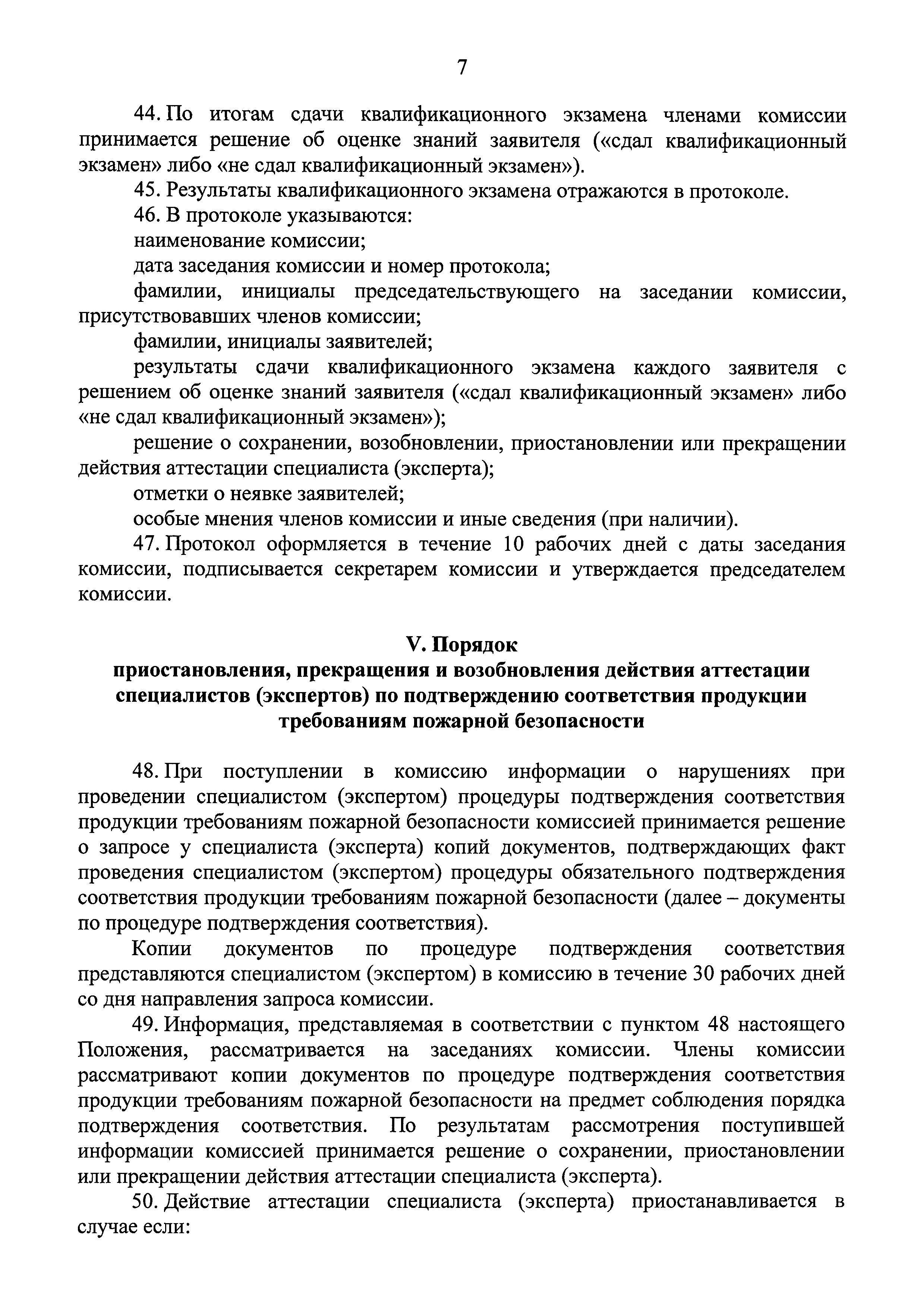 | Оглавление: | I. Общие положения II. Комиссия по аттестации специалистов (экспертов) по подтверждению соответствия продукции требованиям пожарной безопасности III. Правила проведения аттестации специалистов (экспертов) по подтверждению соответствия продукции требованиям пожарной безопасности IV. Порядок проведения квалификационного экзамена специалистов (экспертов) по подтверждению соответствия продукции требованиям пожарной безопасности V. Порядок приостановления, прекращения и возобновления действия аттестации специалистов (экспертов) по подтверждению соответствия продукции требованиям пожарной безопасности |