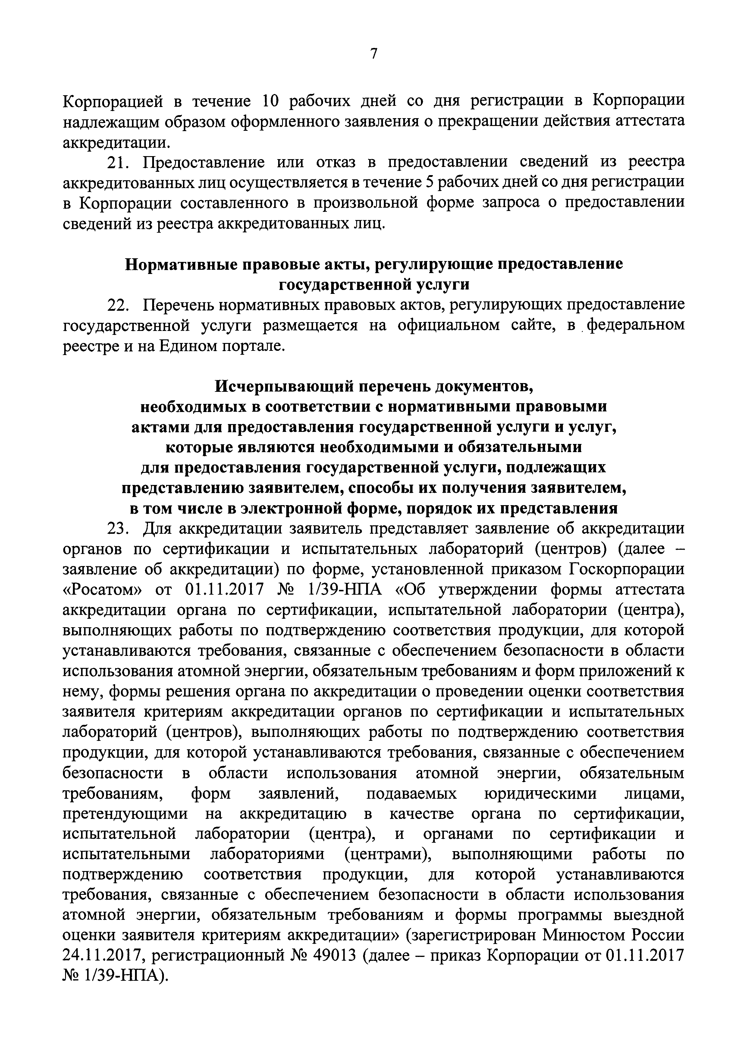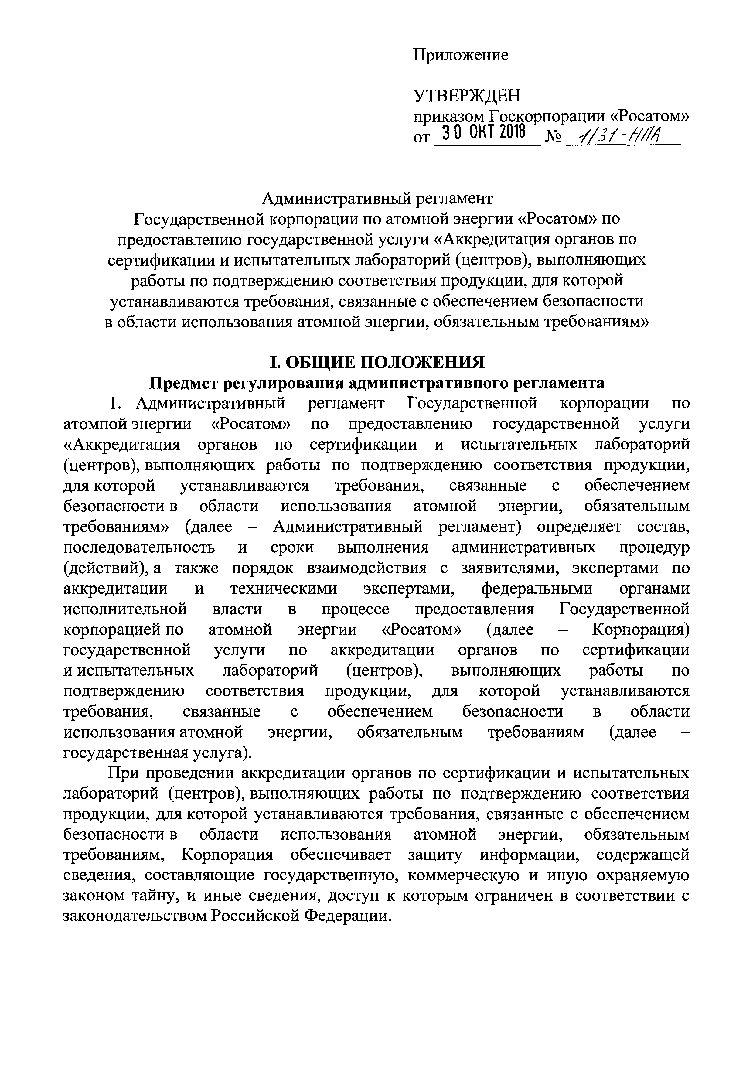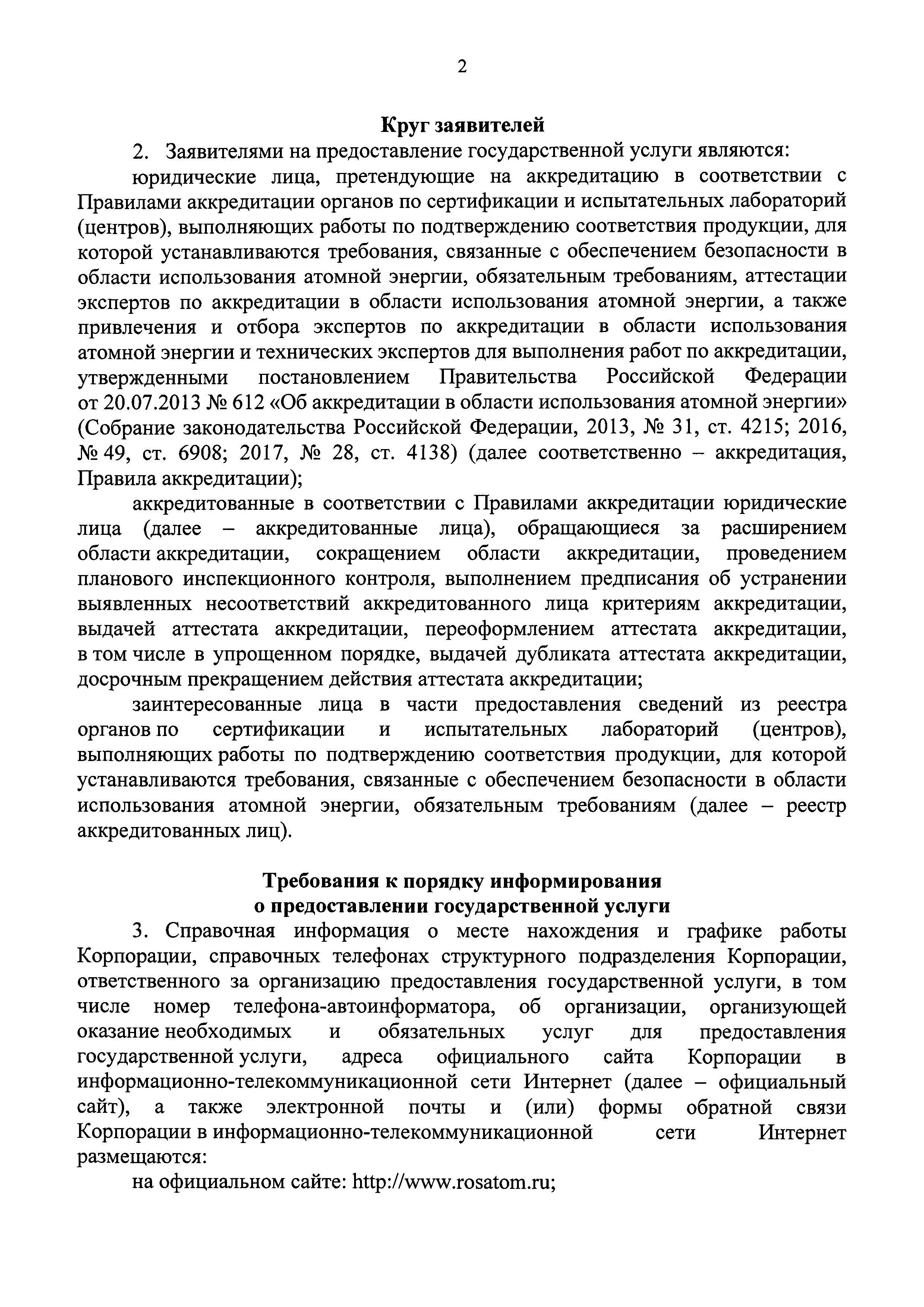| | Нормативные ссылки: |   Федеральный закон 181-ФЗ «О социальной защите инвалидов в Российской Федерации» Постановление 373 «О разработке и утверждении административных регламентов осуществления государственного контроля (надзора) и административных регламентов предоставления государственных услуг»  Федеральный закон 317-ФЗ «О Государственной корпорации по атомной энергии "Росатом"»  Федеральный закон 210-ФЗ «Об организации предоставления государственных и муниципальных услуг» «Методика учета факторов, влияющих на отбор экспертов по аккредитации и технических экспертов в области использования атомной энергии» «Правила аккредитации органов по сертификации и испытательных лабораторий (центров), выполняющих работы по подтверждению соответствия продукции, для которой устанавливаются требования, связанные с обеспечением безопасности в области использования атомной энергии, обязательным требованиям, аттестации экспертов по аккредитации в области использования атомной энергии, а также привлечения и отбора экспертов по аккредитации в области использования атомной энергии и технических экспертов для выполнения работ по аккредитации»  Постановление 760 «О внесении изменений в некоторые акты Правительства Российской Федерации» «Правила подачи и рассмотрения жалоб на решения и действия (бездействие) федеральных органов исполнительной власти и их должностных лиц, федеральных государственных служащих, должностных лиц государственных внебюджетных фондов Российской Федерации, государственных корпораций, наделенных в соответствии с федеральными законами полномочиями по предоставлению государственных услуг в установленной сфере деятельности, и их должностных лиц, организаций, предусмотренных частью 1.1 статьи 16 Федерального закона "Об организации предоставления государственных и муниципальных услуг", и их работников, а также многофункциональных центров предоставления государственных и муниципальных услуг и их работников» Приказ 1/39-НПА «Об утверждении формы аттестата аккредитации органа по сертификации, испытательной лаборатории (центра), выполняющих работы по подтверждению соответствия продукции, для которой устанавливаются требования, связанные с обеспечением безопасности в области использования атомной энергии, обязательным требованиям и форм приложений к нему, формы решения органа по аккредитации о проведении оценки соответствия заявителя критериям аккредитации органов по сертификации и испытательных лабораторий (центров), выполняющих работы по подтверждению соответствия продукции, для которой устанавливаются требования, связанные с обеспечением безопасности в области использования атомной энергии, обязательным требованиям, форм заявлений, подаваемых юридическими лицами, претендующими на аккредитацию в качестве органа по сертификации, испытательной лаборатории (центра), и органами по сертификации и испытательными лабораториями (центрами), выполняющими работы по подтверждению соответствия продукции, для которой устанавливаются требования, связанные с обеспечением безопасности в области использования атомной энергии, обязательным требованиям и формы программы выездной оценки заявителя критериям аккредитации» «Положение о деятельности экспертной комиссии по оценке соответствия за