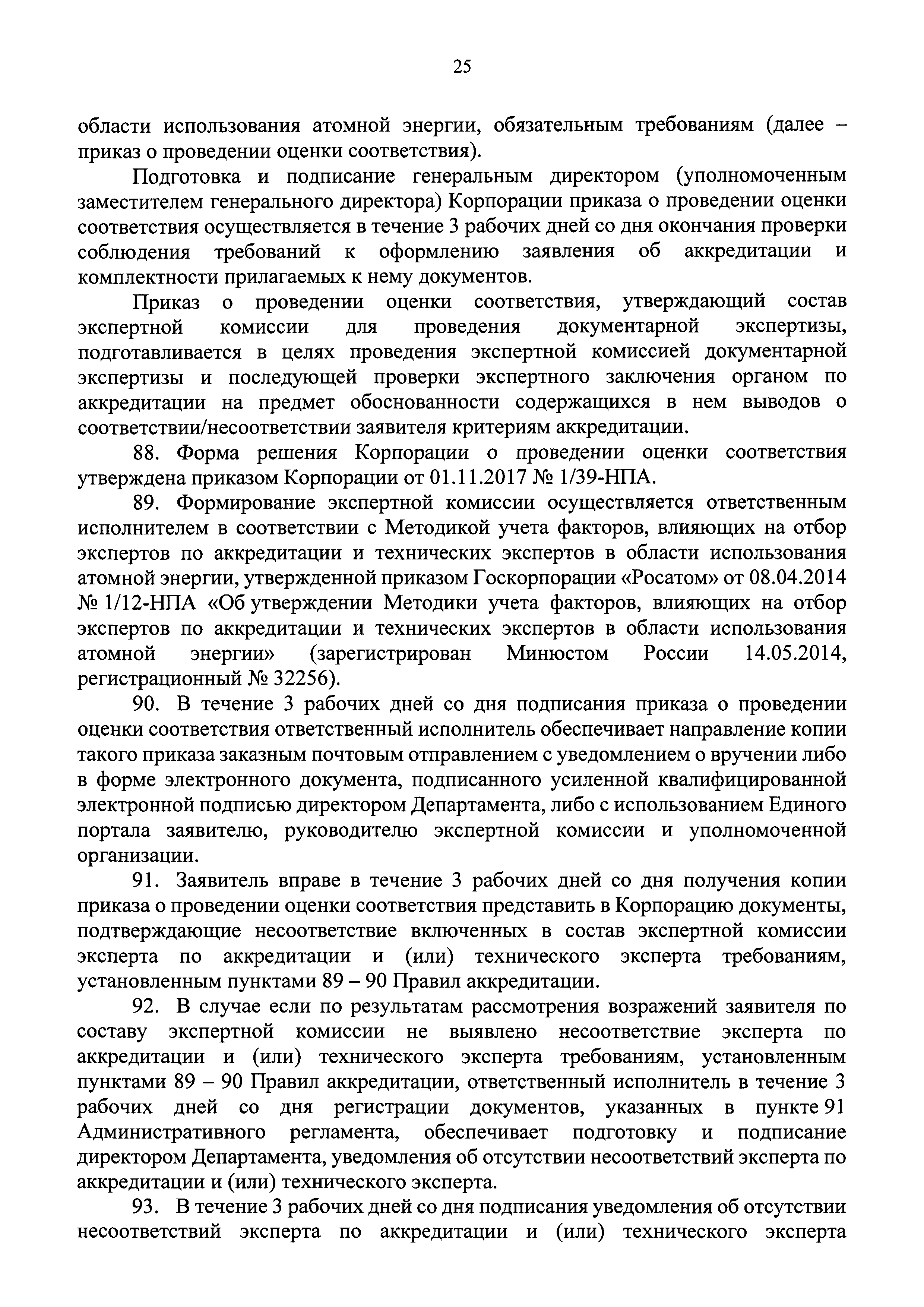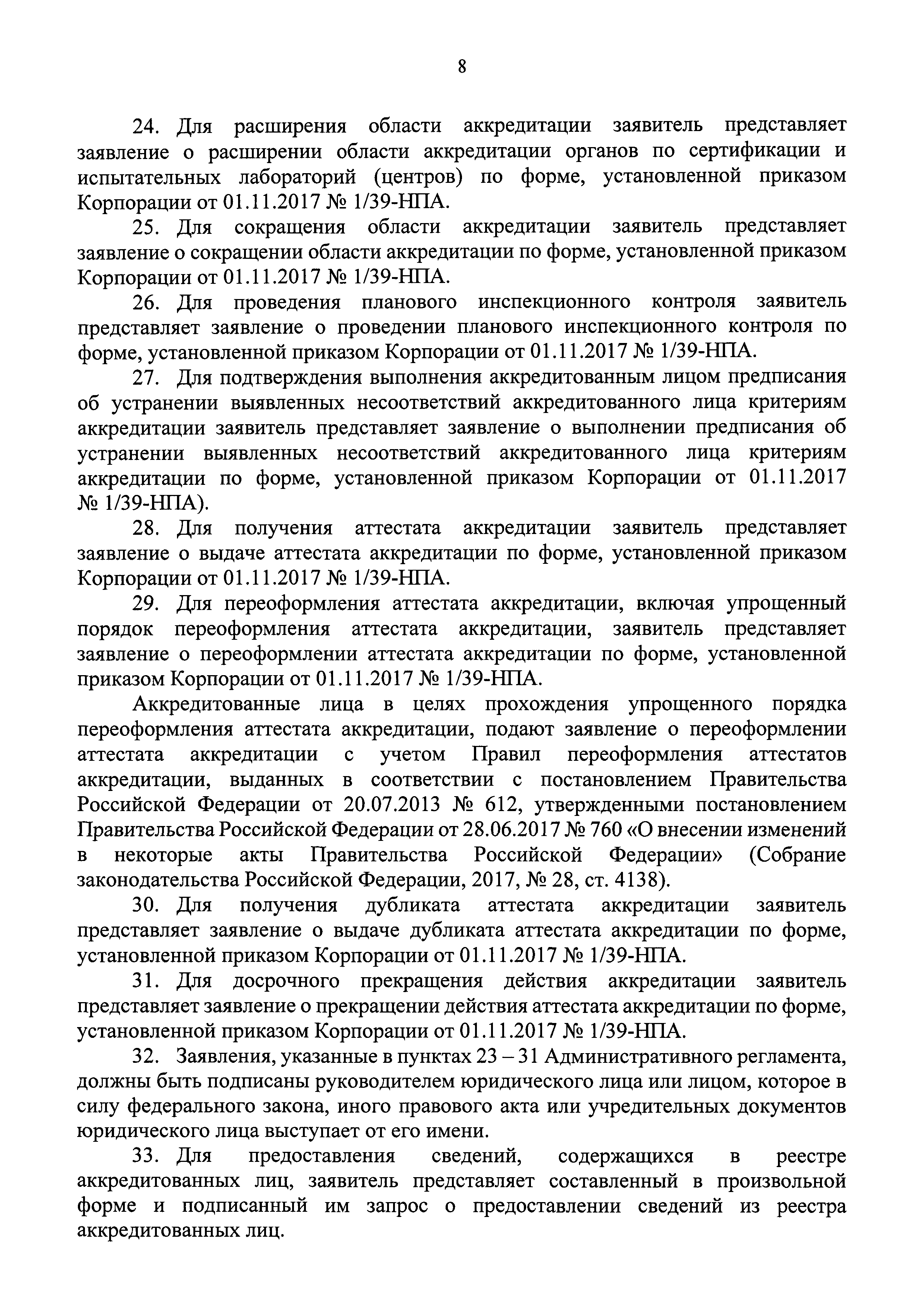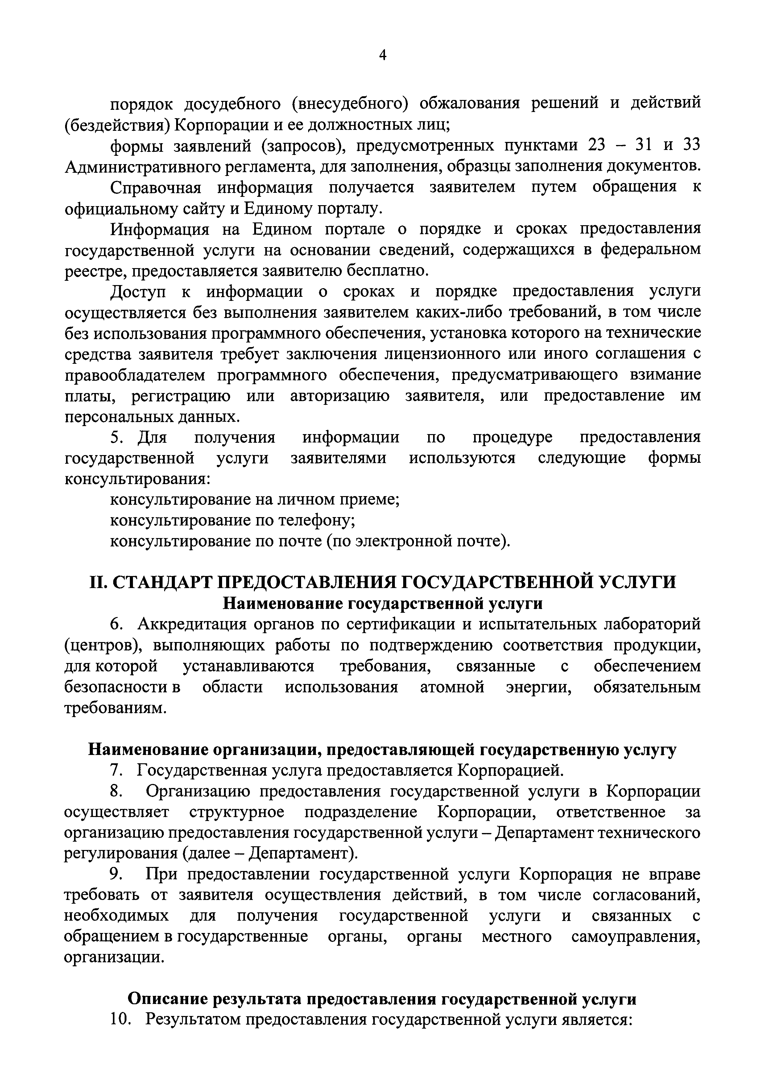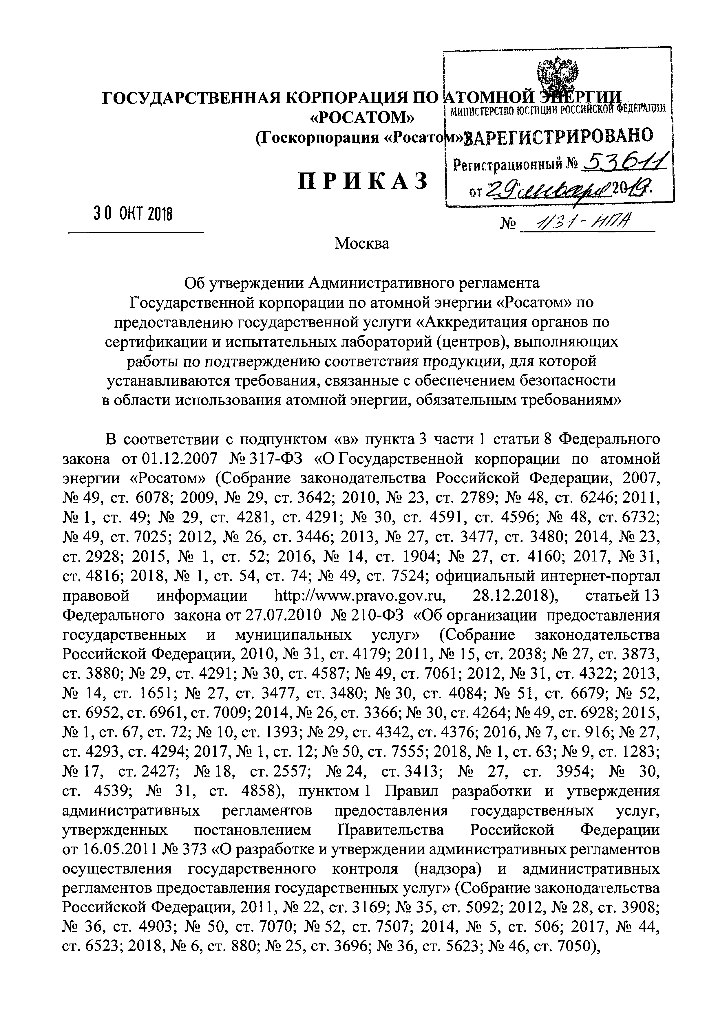 | | Нормативные ссылки: |   Федеральный закон 181-ФЗ «О социальной защите инвалидов в Российской Федерации» Постановление 373 «О разработке и утверждении административных регламентов осуществления государственного контроля (надзора) и административных регламентов предоставления государственных услуг»  Федеральный закон 317-ФЗ «О Государственной корпорации по атомной энергии "Росатом"»  Федеральный закон 210-ФЗ «Об организации предоставления государственных и муниципальных услуг» «Методика учета факторов, влияющих на отбор экспертов по аккредитации и технических экспертов в области использования атомной энергии» «Правила аккредитации органов по сертификации и испытательных лабораторий (центров), выполняющих работы по подтверждению соответствия продукции, для которой устанавливаются требования, связанные с обеспечением безопасности в области использования атомной энергии, обязательным требованиям, аттестации экспертов по аккредитации в области использования атомной энергии, а также привлечения и отбора экспертов по аккредитации в области использования атомной энергии и технических экспертов для выполнения работ по аккредитации»  Постановление 760 «О внесении изменений в некоторые акты Правительства Российской Федерации» «Правила подачи и рассмотрения жалоб на решения и действия (бездействие) федеральных органов исполнительной власти и их должностных лиц, федеральных государственных служащих, должностных лиц государственных внебюджетных фондов Российской Федерации, государственных корпораций, наделенных в соответствии с федеральными законами полномочиями по предоставлению государственных услуг в установленной сфере деятельности, и их должностных лиц, организаций, предусмотренных частью 1.1 статьи 16 Федерального закона "Об организации предоставления государственных и муниципальных услуг", и их работников, а также многофункциональных центров предоставления государственных и муниципальных услуг и их работников» Приказ 1/39-НПА «Об утверждении формы аттестата аккредитации органа по сертификации, испытательной лаборатории (центра), выполняющих работы по подтверждению соответствия продукции, для которой устанавливаются требования, связанные с обеспечением безопасности в области использования атомной энергии, обязательным требованиям и форм приложений к нему, формы решения органа по аккредитации о проведении оценки соответствия заявителя критериям аккредитации органов по сертификации и испытательных лабораторий (центров), выполняющих работы по подтверждению соответствия продукции, для которой устанавливаются требования, связанные с обеспечением безопасности в области использования атомной энергии, обязательным требованиям, форм заявлений, подаваемых юридическими лицами, претендующими на аккредитацию в качестве органа по сертификации, испытательной лаборатории (центра), и органами по сертификации и испытательными лабораториями (центрами), выполняющими работы по подтверждению соответствия продукции, для которой устанавливаются требования, связанные с обеспечением безопасности в области использования атомной энергии, обязательным требованиям и формы программы выездной оценки заявителя критериям аккредитации» «Положение о деятельности экспертной комиссии по оценке соответствия за