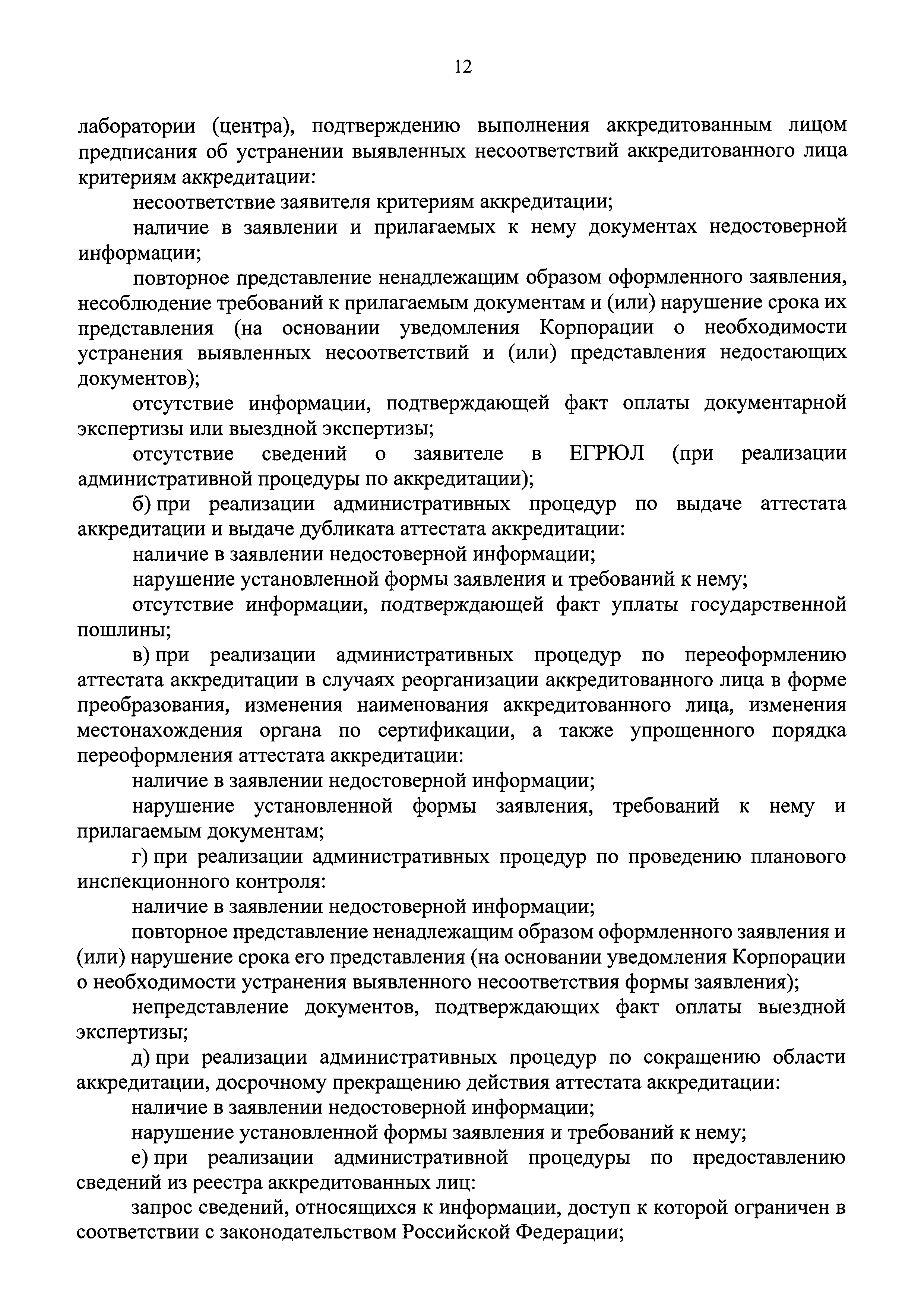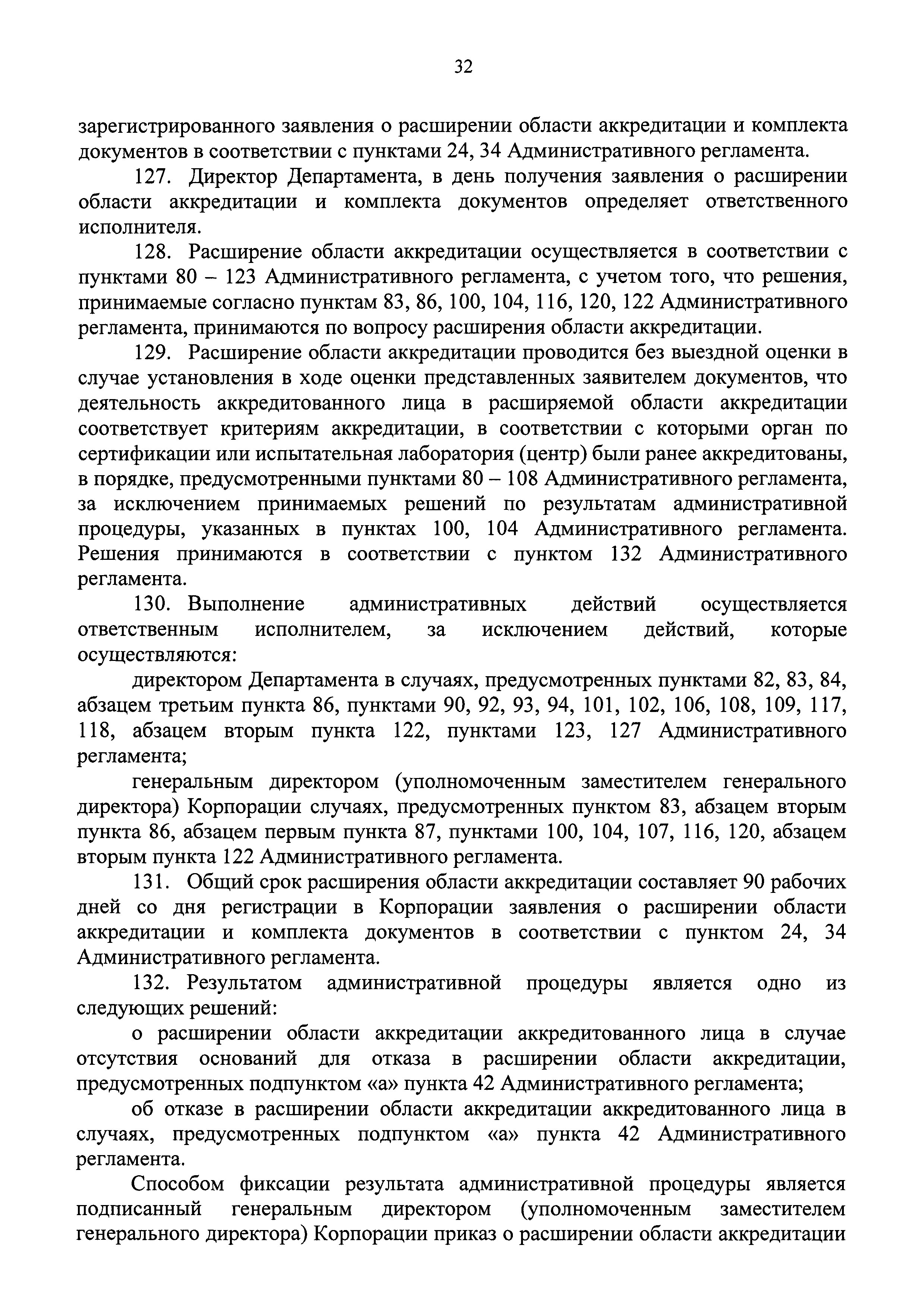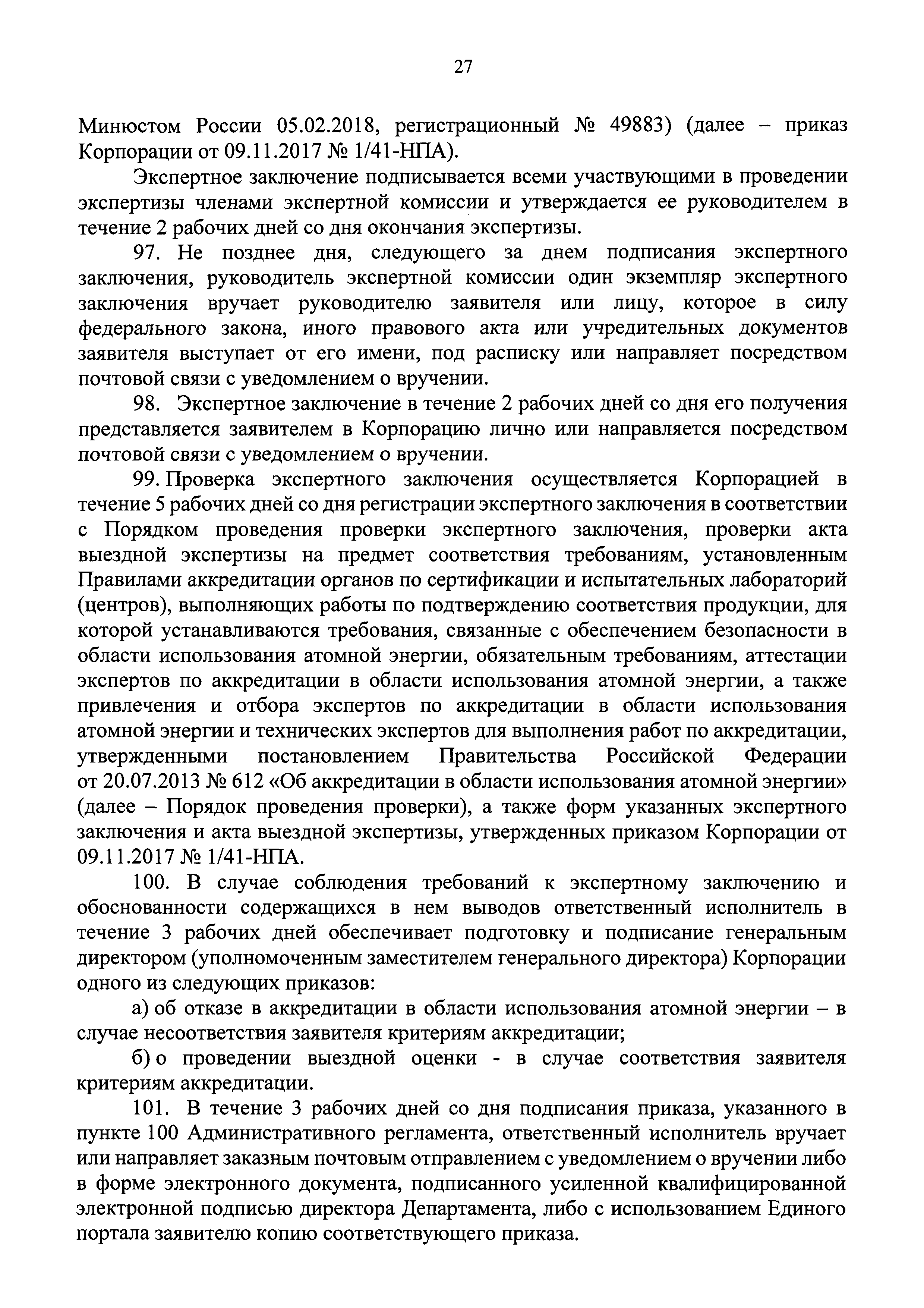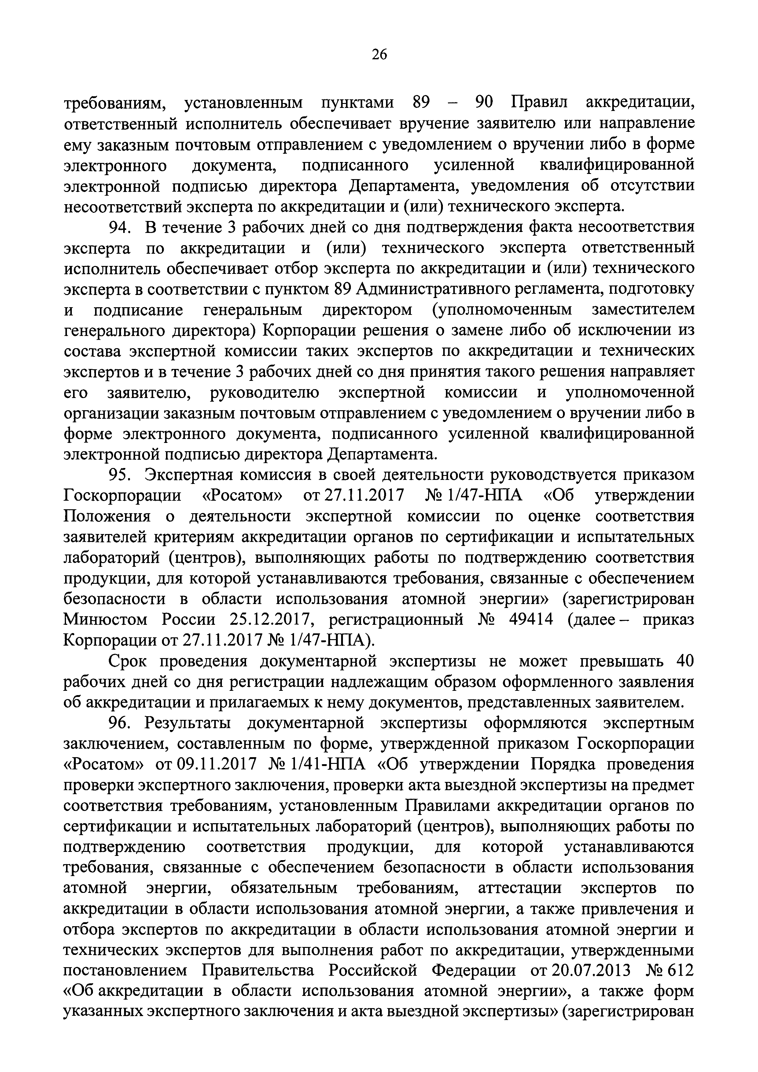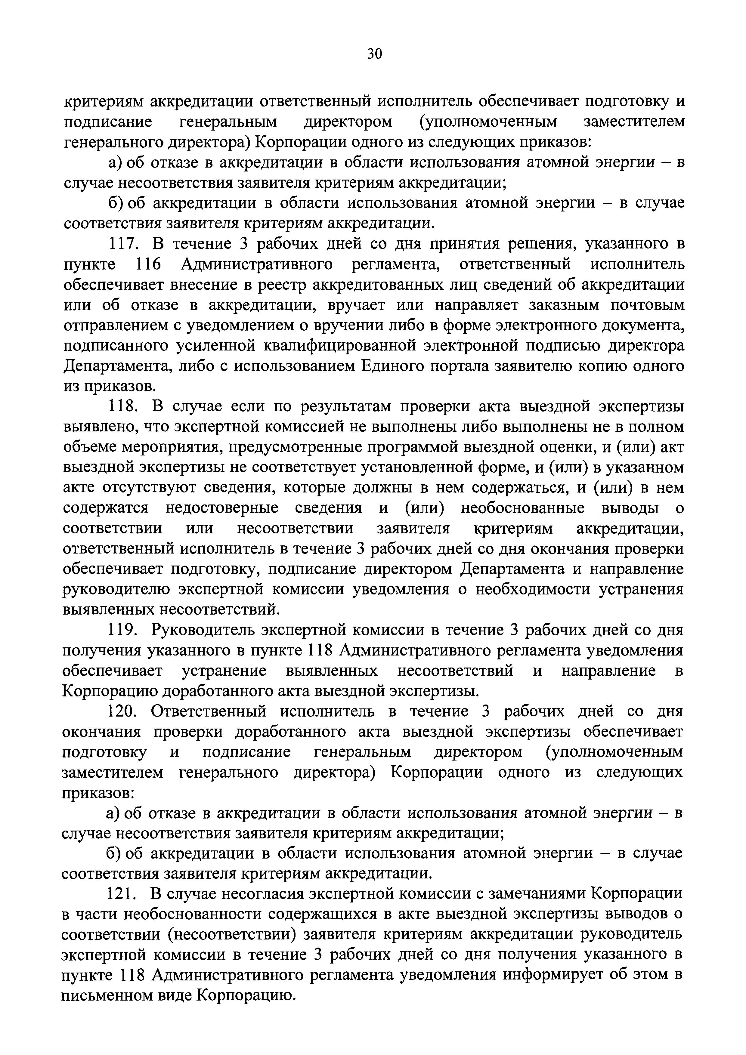 Административный регламент Государственной корпорации по атомной энергии "Росатом" по предоставлению государственной услуги "Аккредитация органов по сертификации и испытательных лабораторий (центров), выполняющих работы по подтверждению соответствия продукции, для которой устанавливаются требования, связанные с обеспечением безопасности в области использования атомной энергии, обязательным требованиям"| Статус: | действует | | Название рус.: | Административный регламент Государственной корпорации по атомной энергии "Росатом" по предоставлению государственной услуги "Аккредитация органов по сертификации и испытательных лабораторий (центров), выполняющих работы по подтверждению соответствия продукции, для которой устанавливаются требования, связанные с обеспечением безопасности в области использования атомной энергии, обязательным требованиям" | | Дата добавления в базу: | 01.02.2020 | | Дата актуализации: | 01.01.2021 | | Дата введения: | 11.02.2019 | | Область применения: | Административный регламент Государственной корпорации по атомной энергии "Росатом" по предоставлению государственной услуги "Аккредитация органов по сертификации и испытательных лабораторий (центров), выполняющих работы по подтверждению соответствия продукции, для которой устанавливаются требования, связанные с обеспечением безопасности в области использования атомной энергии, обязательным требованиям" определяет состав, последовательность и сроки выполнения административных процедур (действий), а также порядок взаимодействия с заявителями, экспертами по аккредитации и техническими экспертами, федеральными органами исполнительной власти в процессе предоставления Государственной корпорацией по атомной энергии "Росатом" государственной услуги по аккредитации органов по сертификации и испытательных лабораторий (центров), выполняющих работы по подтверждению соответствия продукции, для которой устанавливаются требования, связанные с обеспечением безопасности в области использования атомной энергии, обязательным требованиям | | Оглавление: | I. Общие положения II. Стандарт предоставления государственной услуги III. Состав, последовательность и сроки выполнения административных процедур (действий), требования к порядку их выполнения, в том числе особенности выполнения административных процедур (действий) в электронной форме IV. Формы контроля за исполнением Административного регламента V. Досудебный (внесудебный) порядок обжалования решений и действий (бездействия) Корпорации, а также должностных лиц Корпорации | | Утверждён: | 30.10.2018 Государственная корпорация по атомной энергии РОСАТОМ (1/31-НПА)
