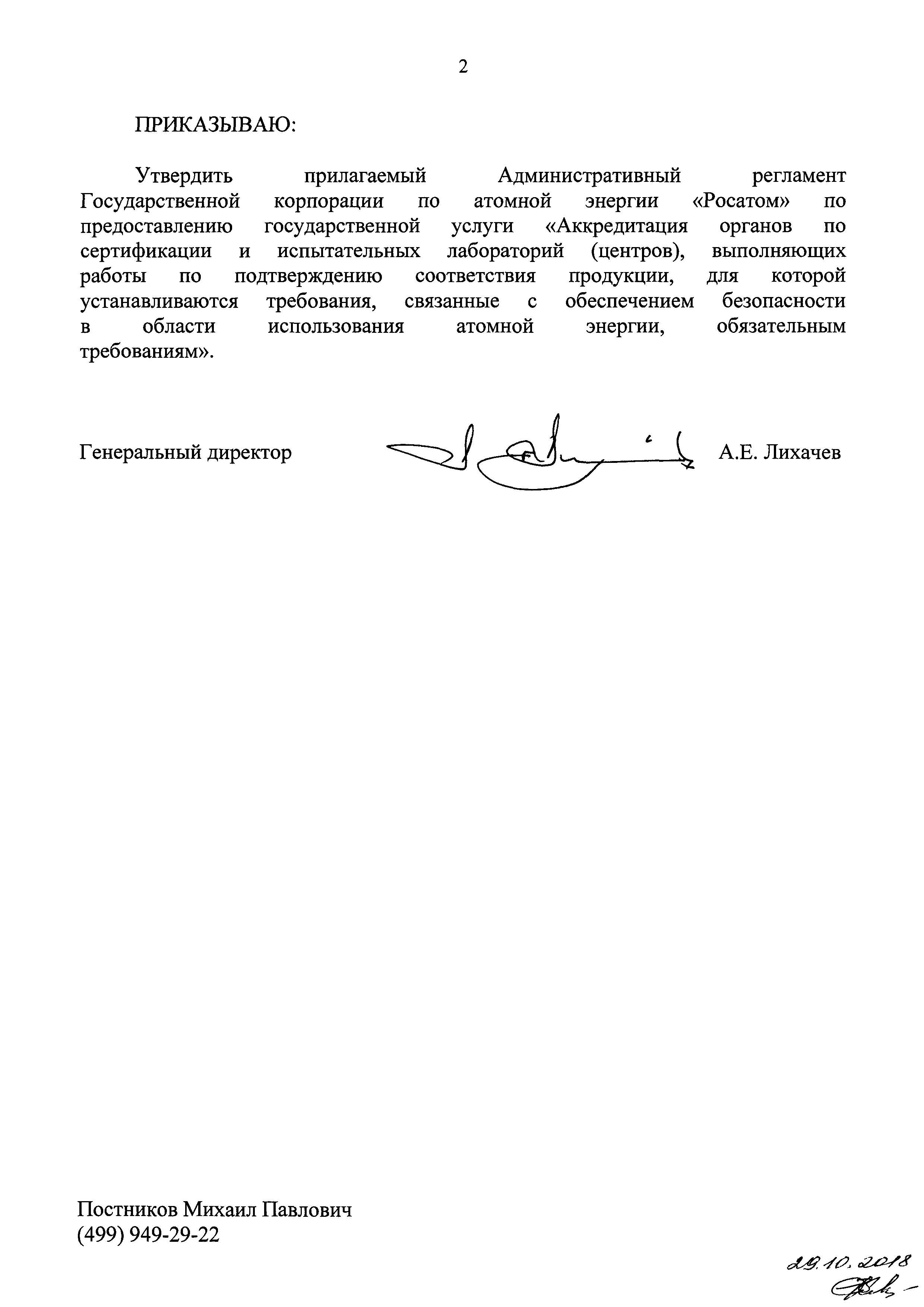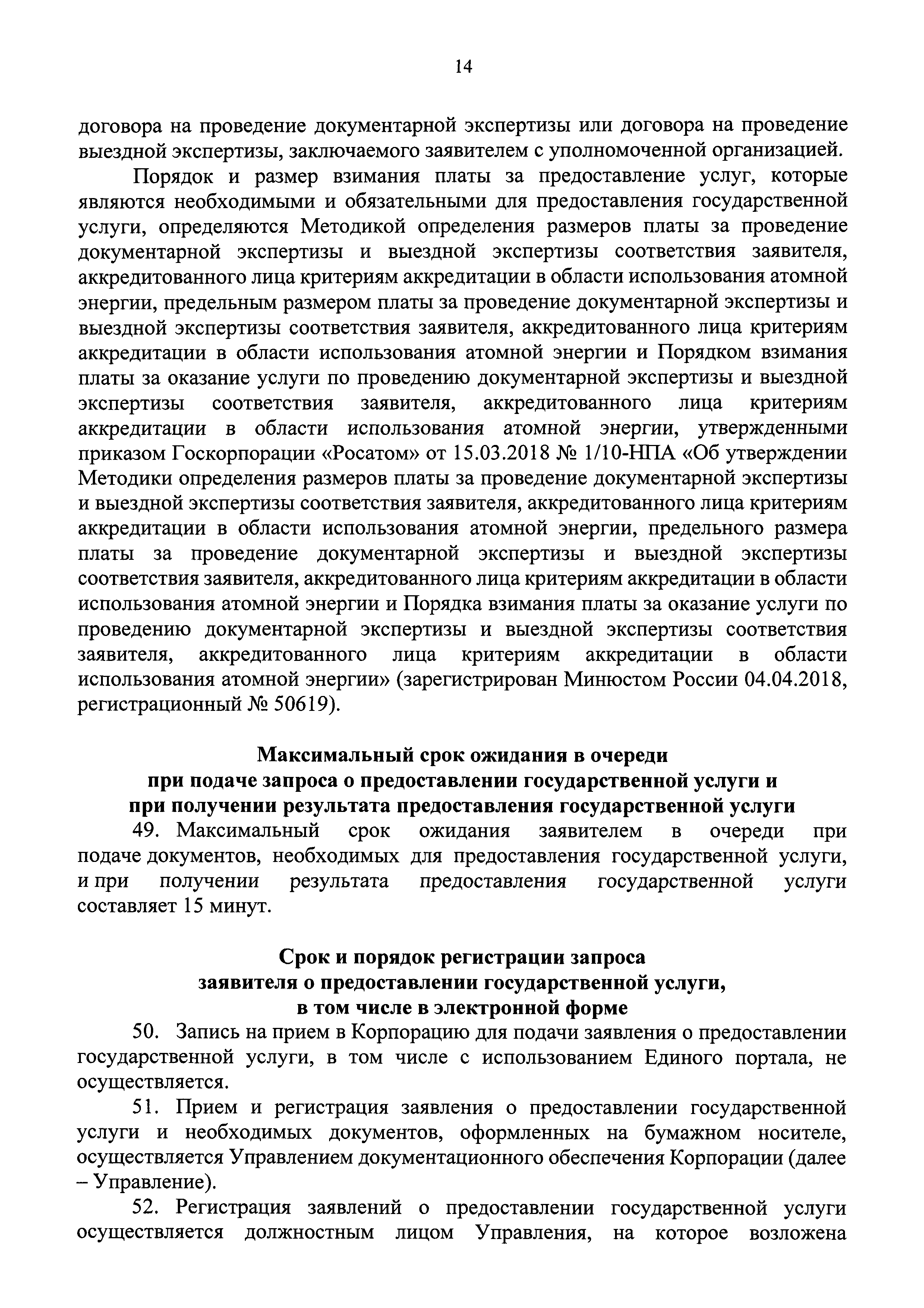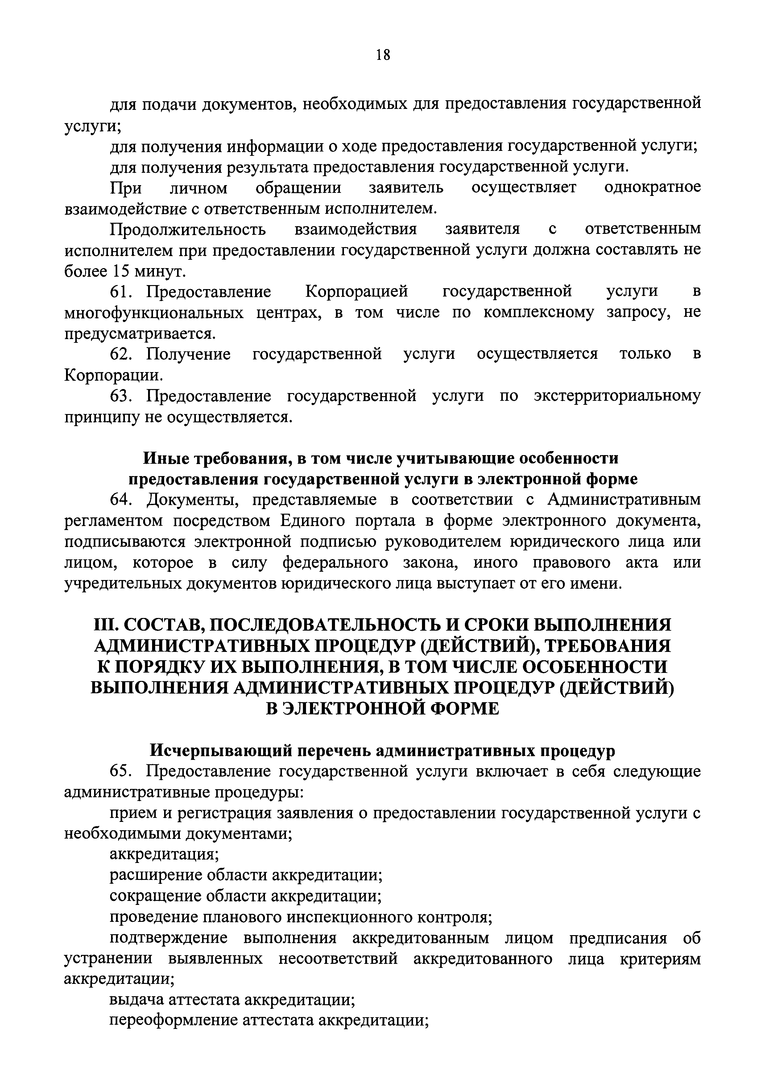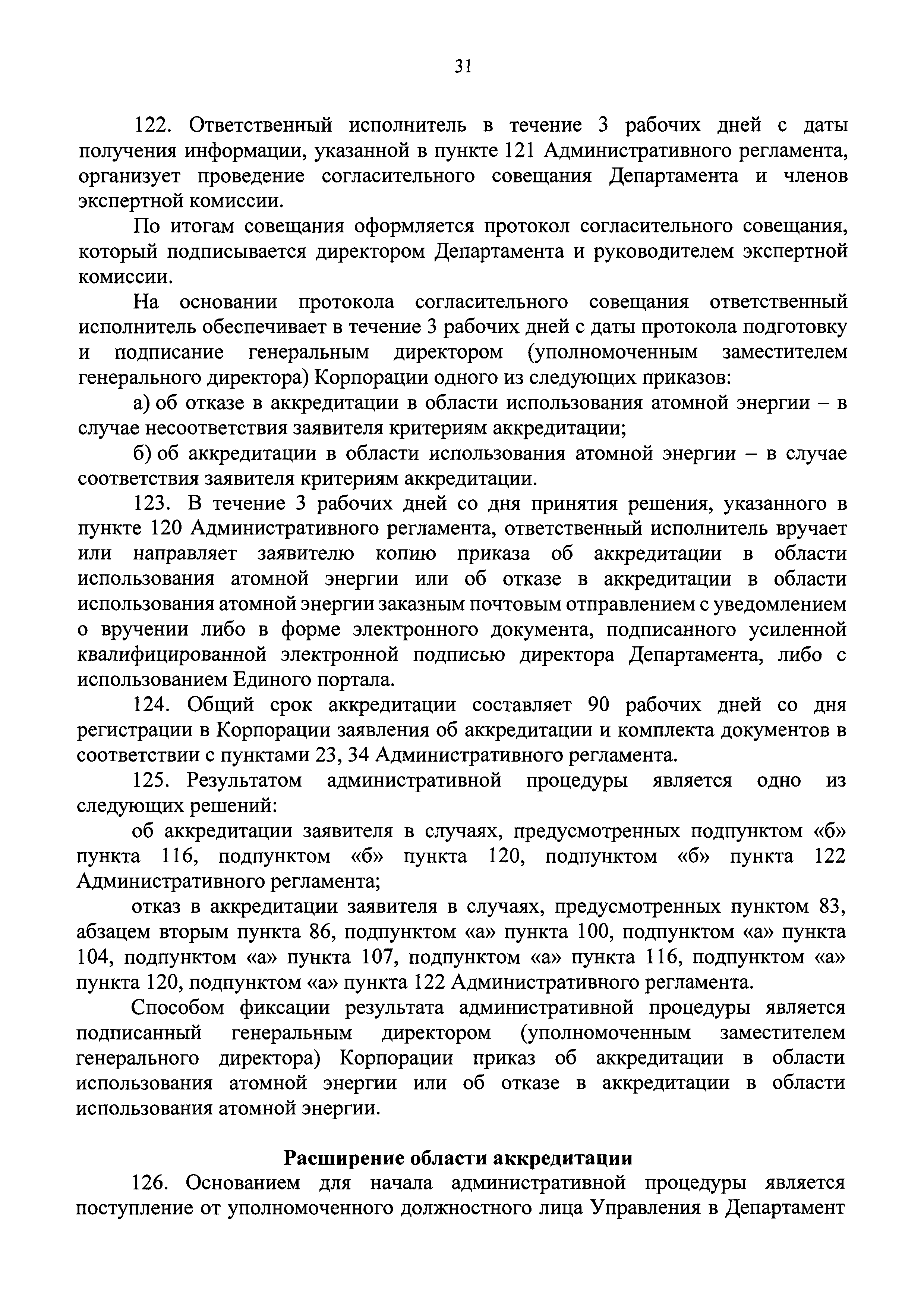 Административный регламент Государственной корпорации по атомной энергии "Росатом" по предоставлению государственной услуги "Аккредитация органов по сертификации и испытательных лабораторий (центров), выполняющих работы по подтверждению соответствия продукции, для которой устанавливаются требования, связанные с обеспечением безопасности в области использования атомной энергии, обязательным требованиям"| Статус: | действует | | Название рус.: | Административный регламент Государственной корпорации по атомной энергии "Росатом" по предоставлению государственной услуги "Аккредитация органов по сертификации и испытательных лабораторий (центров), выполняющих работы по подтверждению соответствия продукции, для которой устанавливаются требования, связанные с обеспечением безопасности в области использования атомной энергии, обязательным требованиям" | | Дата добавления в базу: | 01.02.2020 | | Дата актуализации: | 01.01.2021 | | Дата введения: | 11.02.2019 | | Область применения: | Административный регламент Государственной корпорации по атомной энергии "Росатом" по предоставлению государственной услуги "Аккредитация органов по сертификации и испытательных лабораторий (центров), выполняющих работы по подтверждению соответствия продукции, для которой устанавливаются требования, связанные с обеспечением безопасности в области использования атомной энергии, обязательным требованиям" определяет состав, последовательность и сроки выполнения административных процедур (действий), а также порядок взаимодействия с заявителями, экспертами по аккредитации и техническими экспертами, федеральными органами исполнительной власти в процессе предоставления Государственной корпорацией по атомной энергии "Росатом" государственной услуги по аккредитации органов по сертификации и испытательных лабораторий (центров), выполняющих работы по подтверждению соответствия продукции, для которой устанавливаются требования, связанные с обеспечением безопасности в области использования атомной энергии, обязательным требованиям | | Оглавление: | I. Общие положения II. Стандарт предоставления государственной услуги III. Состав, последовательность и сроки выполнения административных процедур (действий), требования к порядку их выполнения, в том числе особенности выполнения административных процедур (действий) в электронной форме IV. Формы контроля за исполнением Административного регламента V. Досудебный (внесудебный) порядок обжалования решений и действий (бездействия) Корпорации, а также должностных лиц Корпорации | | Утверждён: | 30.10.2018 Государственная корпорация по атомной энергии РОСАТОМ (1/31-НПА)