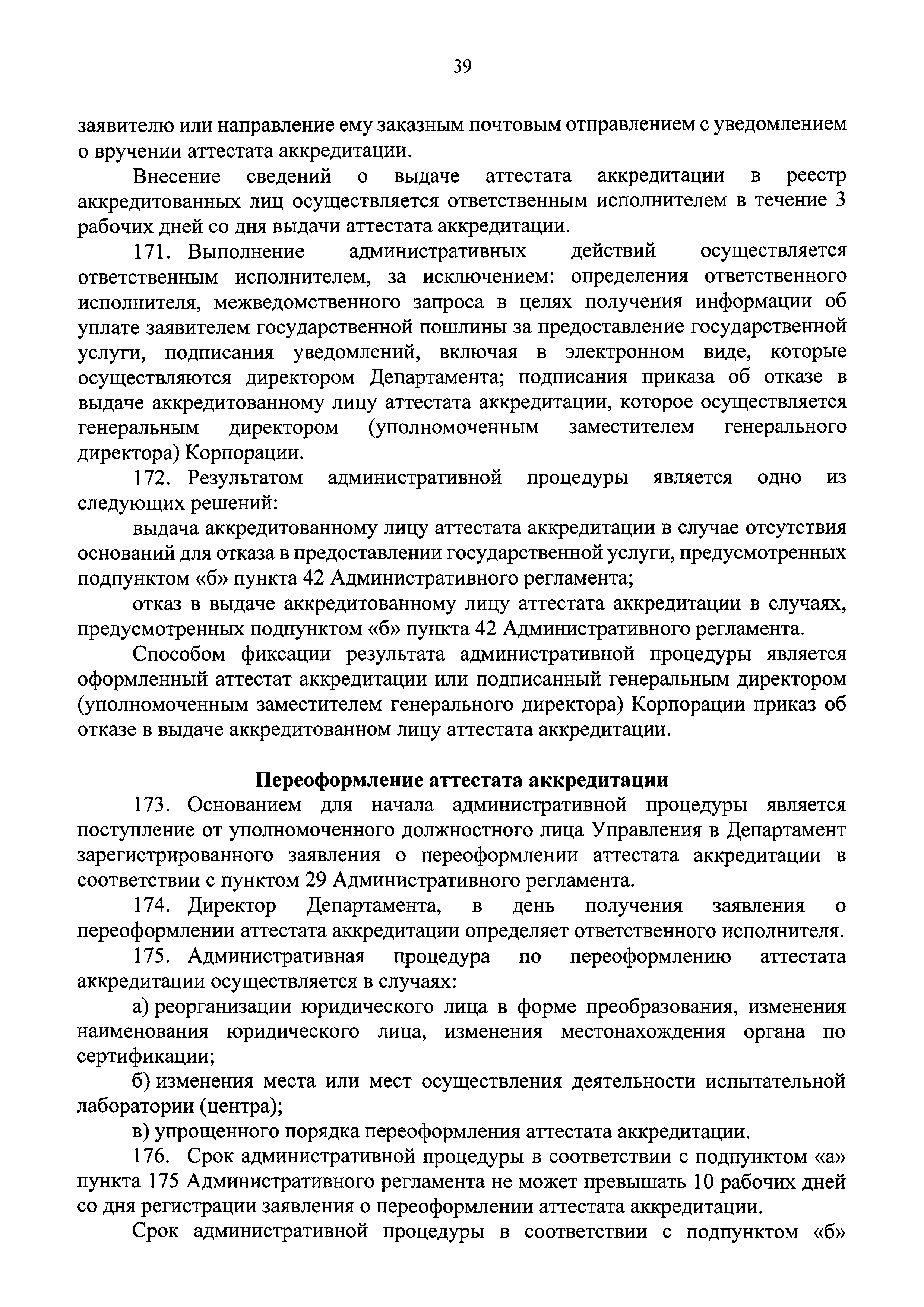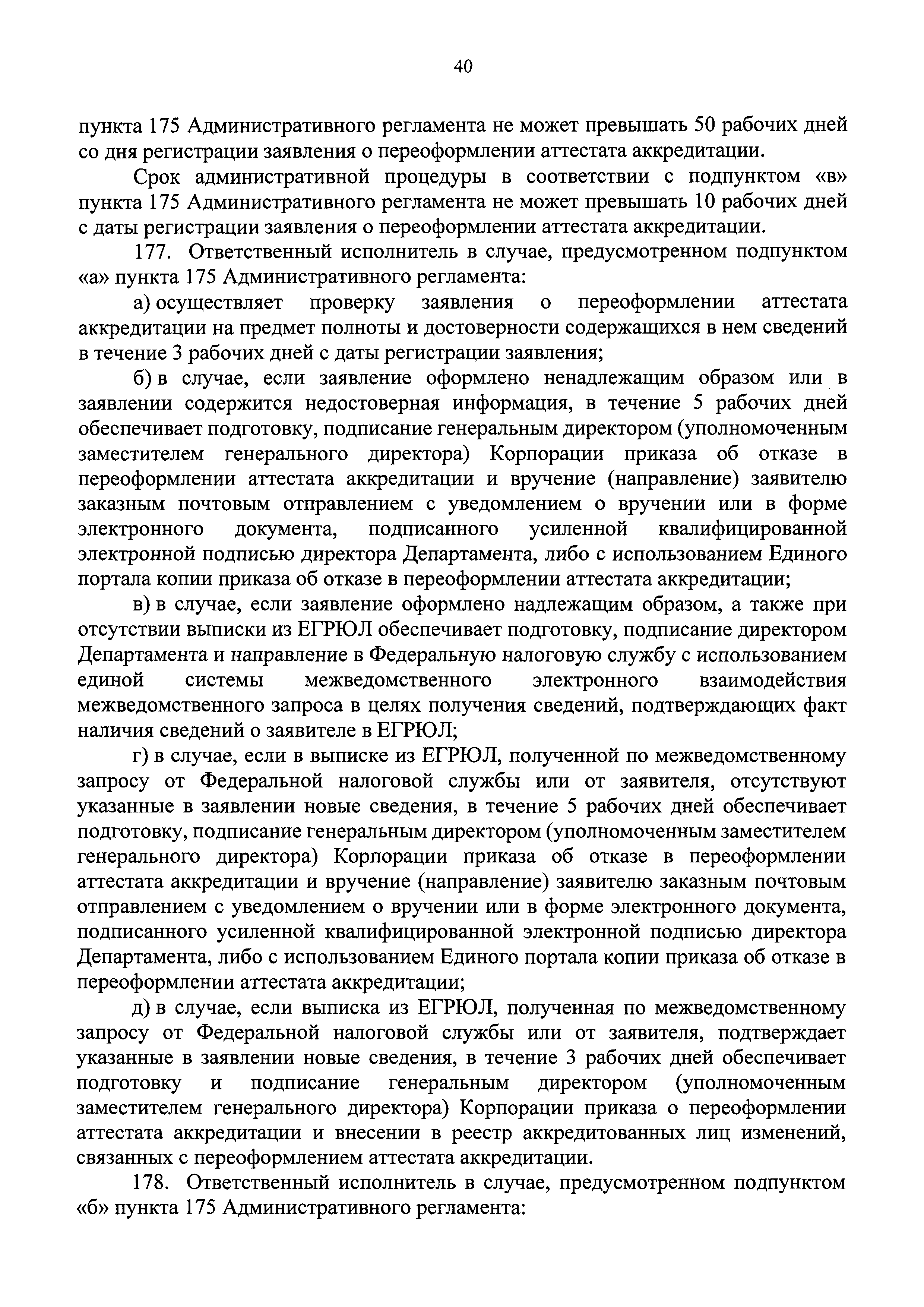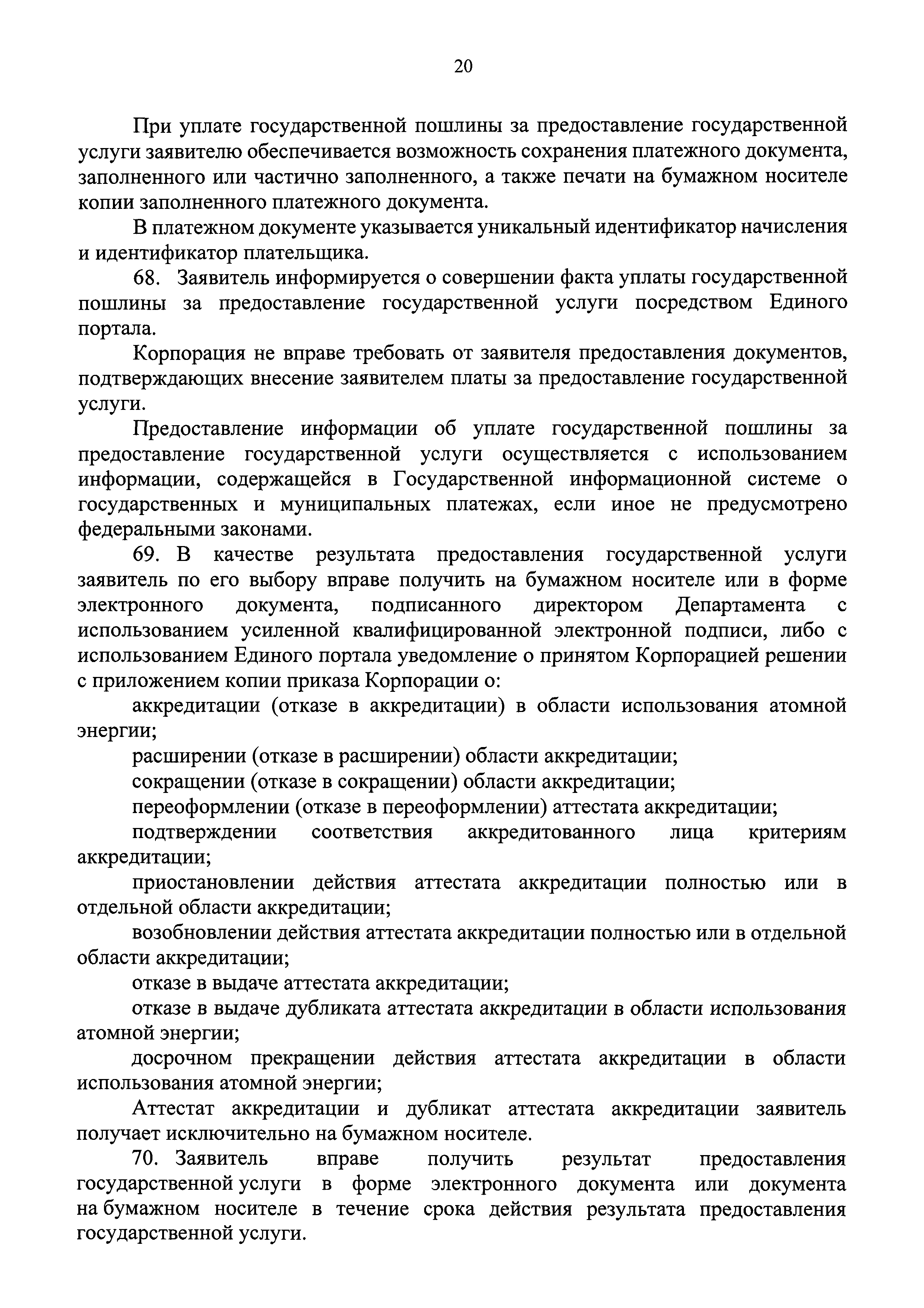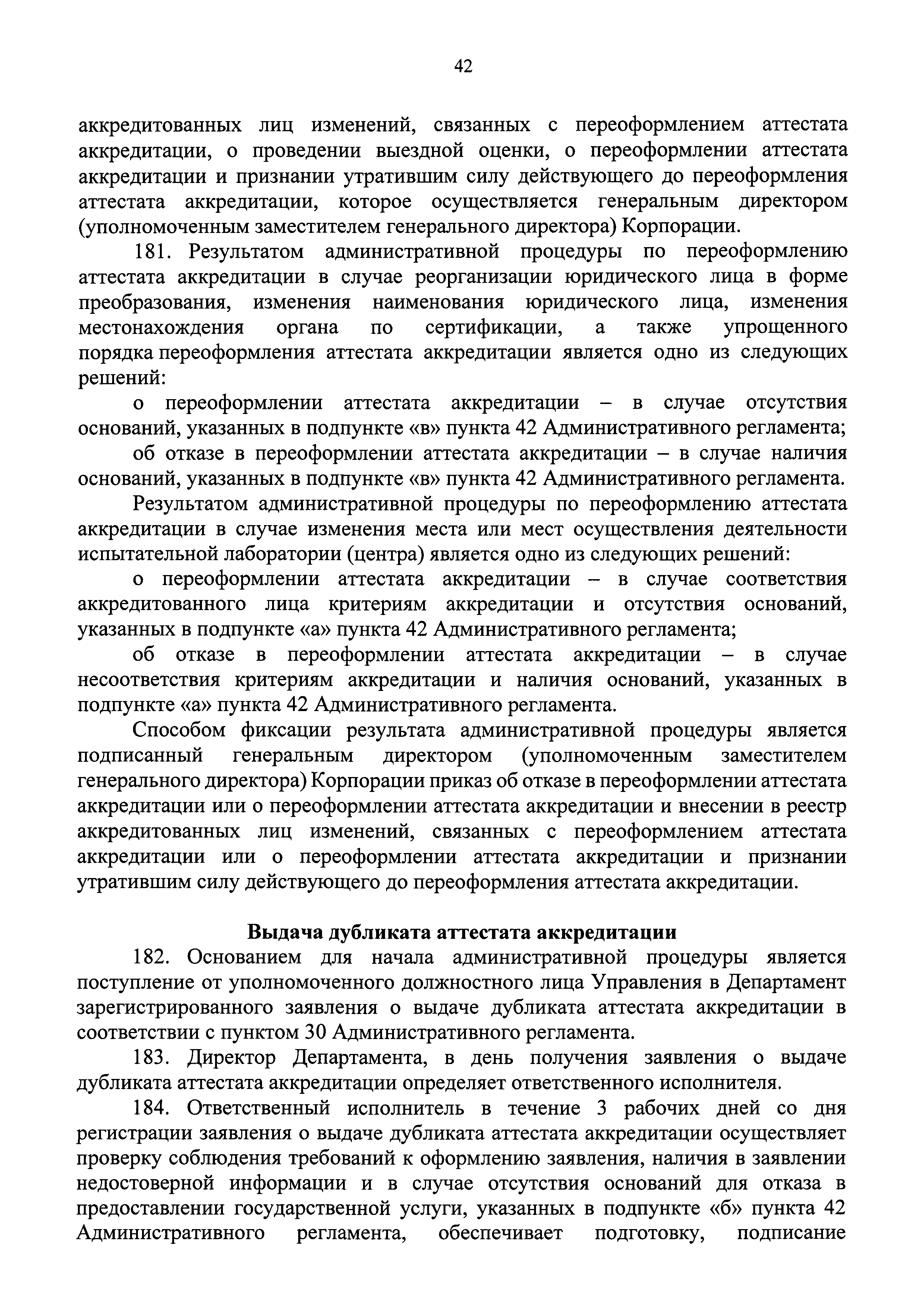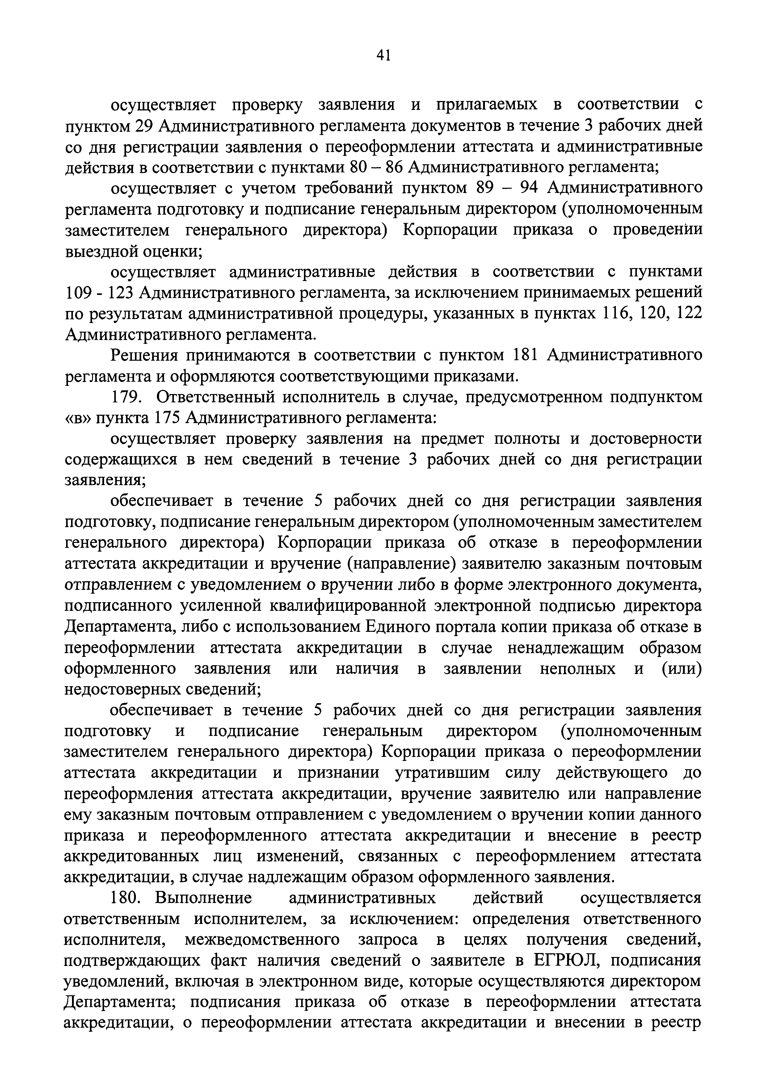 Административный регламент Государственной корпорации по атомной энергии "Росатом" по предоставлению государственной услуги "Аккредитация органов по сертификации и испытательных лабораторий (центров), выполняющих работы по подтверждению соответствия продукции, для которой устанавливаются требования, связанные с обеспечением безопасности в области использования атомной энергии, обязательным требованиям"| Статус: | действует | | Название рус.: | Административный регламент Государственной корпорации по атомной энергии "Росатом" по предоставлению государственной услуги "Аккредитация органов по сертификации и испытательных лабораторий (центров), выполняющих работы по подтверждению соответствия продукции, для которой устанавливаются требования, связанные с обеспечением безопасности в области использования атомной энергии, обязательным требованиям" | | Дата добавления в базу: | 01.02.2020 | | Дата актуализации: | 01.01.2021 | | Дата введения: | 11.02.2019 | | Область применения: | Административный регламент Государственной корпорации по атомной энергии "Росатом" по предоставлению государственной услуги "Аккредитация органов по сертификации и испытательных лабораторий (центров), выполняющих работы по подтверждению соответствия продукции, для которой устанавливаются требования, связанные с обеспечением безопасности в области использования атомной энергии, обязательным требованиям" определяет состав, последовательность и сроки выполнения административных процедур (действий), а также порядок взаимодействия с заявителями, экспертами по аккредитации и техническими экспертами, федеральными органами исполнительной власти в процессе предоставления Государственной корпорацией по атомной энергии "Росатом" государственной услуги по аккредитации органов по сертификации и испытательных лабораторий (центров), выполняющих работы по подтверждению соответствия продукции, для которой устанавливаются требования, связанные с обеспечением безопасности в области использования атомной энергии, обязательным требованиям | | Оглавление: | I. Общие положения II. Стандарт предоставления государственной услуги III. Состав, последовательность и сроки выполнения административных процедур (действий), требования к порядку их выполнения, в том числе особенности выполнения административных процедур (действий) в электронной форме IV. Формы контроля за исполнением Административного регламента V. Досудебный (внесудебный) порядок обжалования решений и действий (бездействия) Корпорации, а также должностных лиц Корпорации | | Утверждён: | 30.10.2018 Государственная корпорация по атомной энергии РОСАТОМ (1/31-НПА)