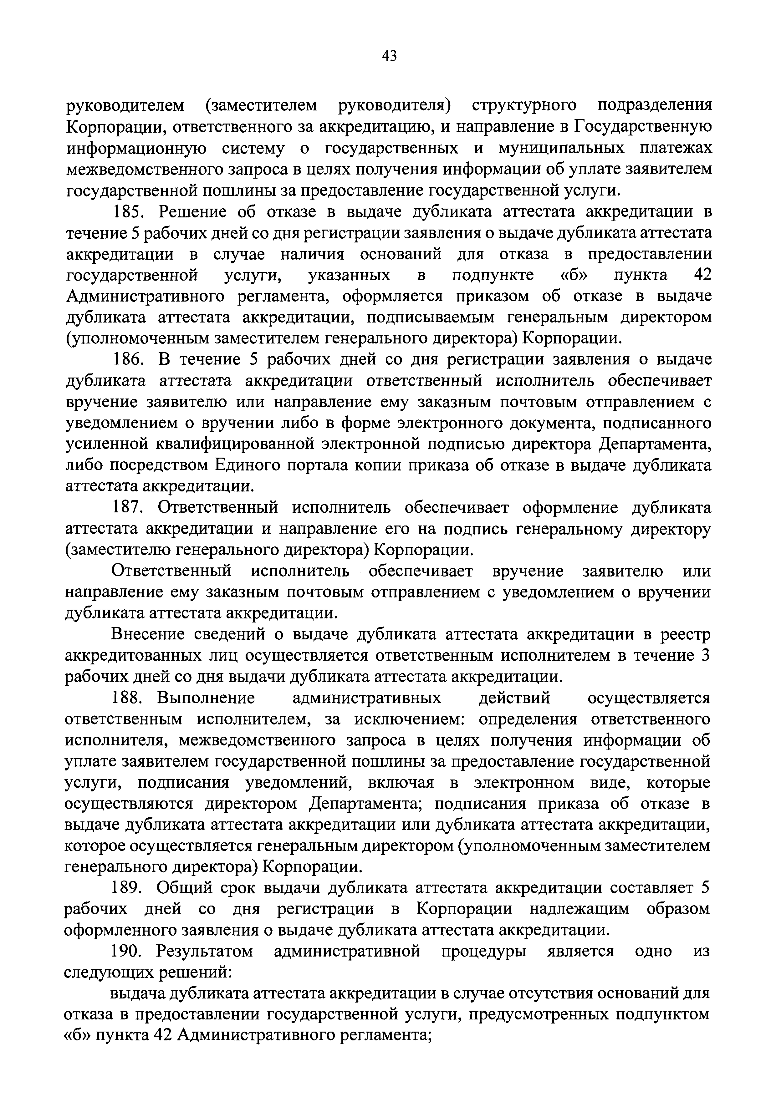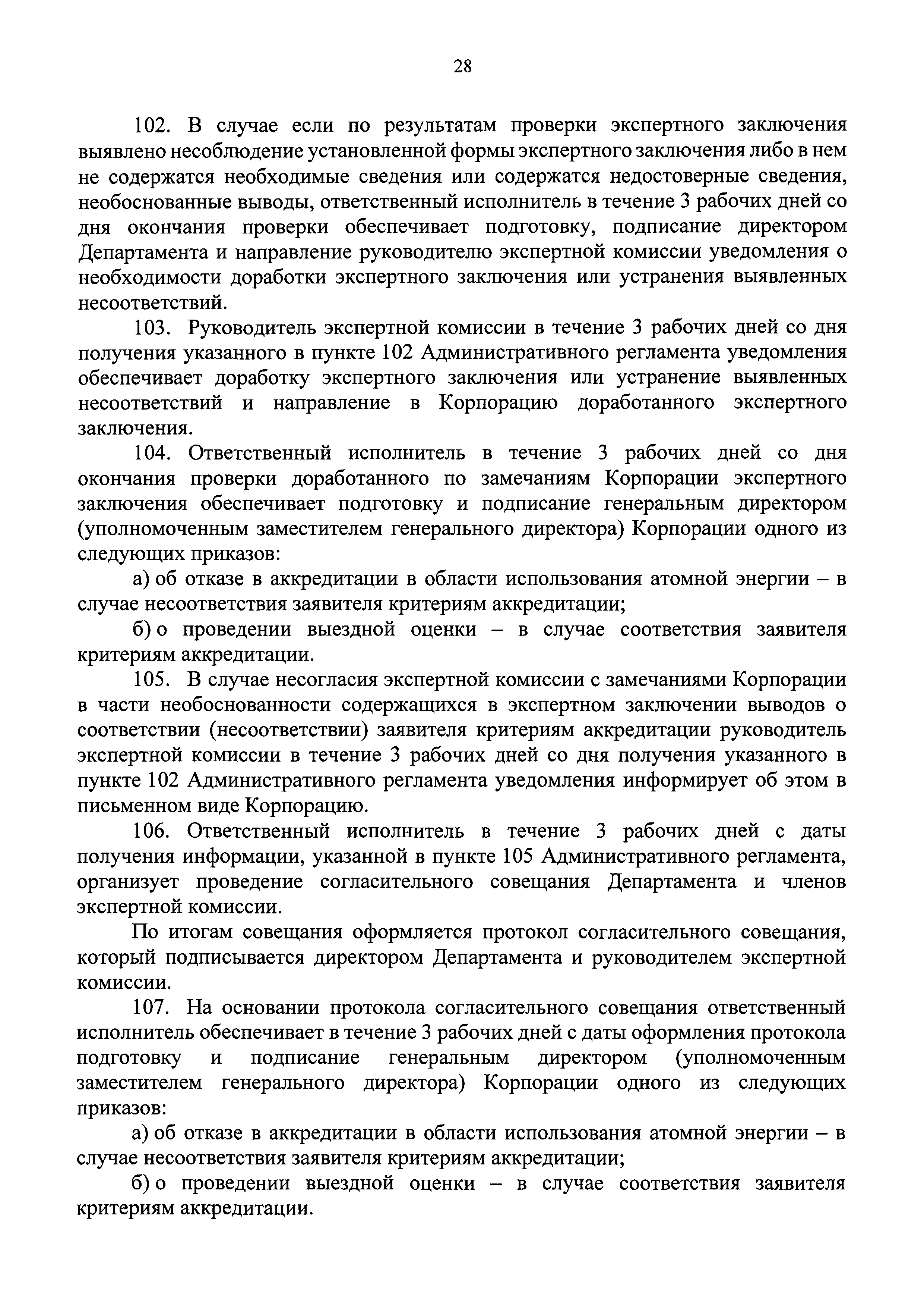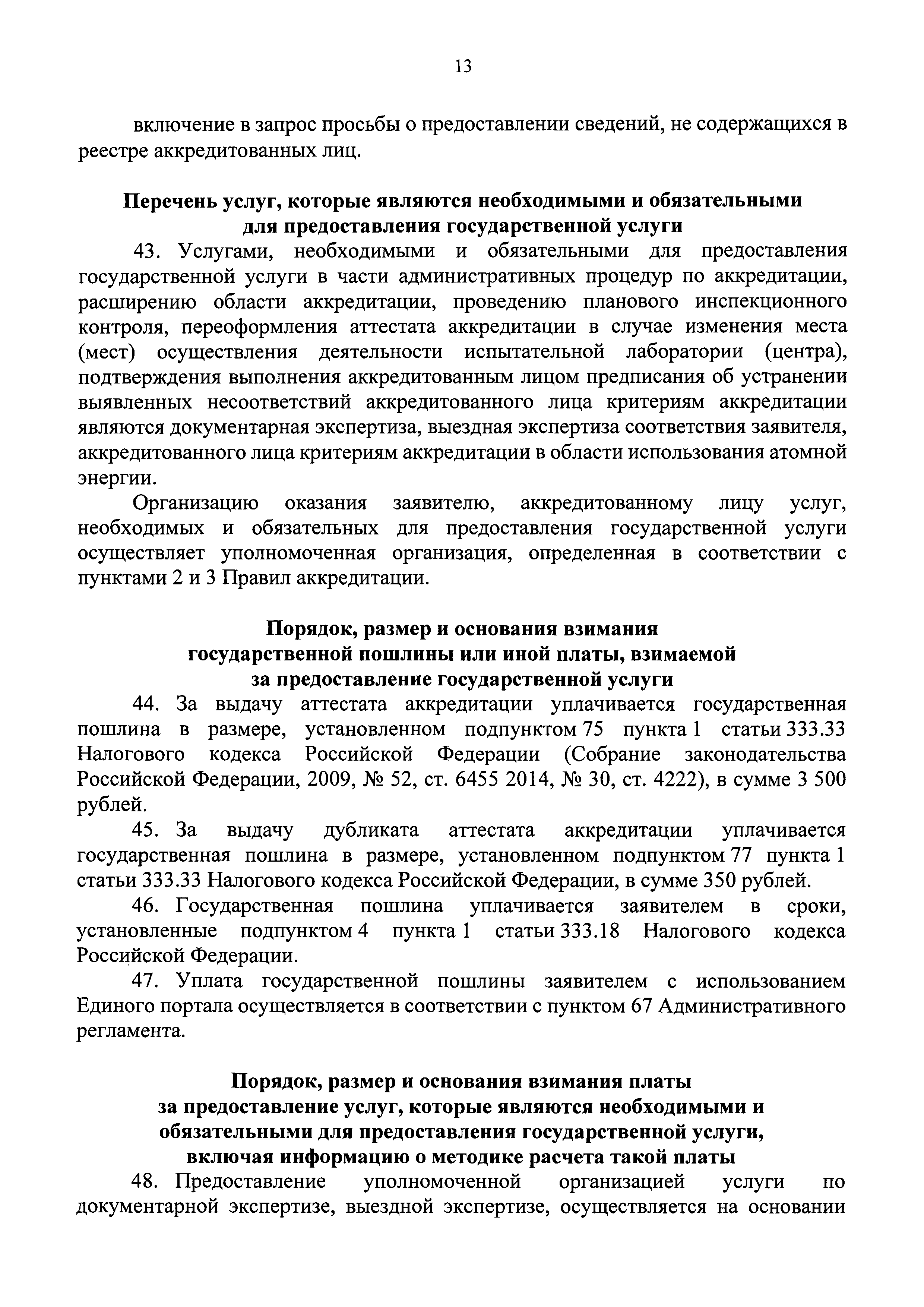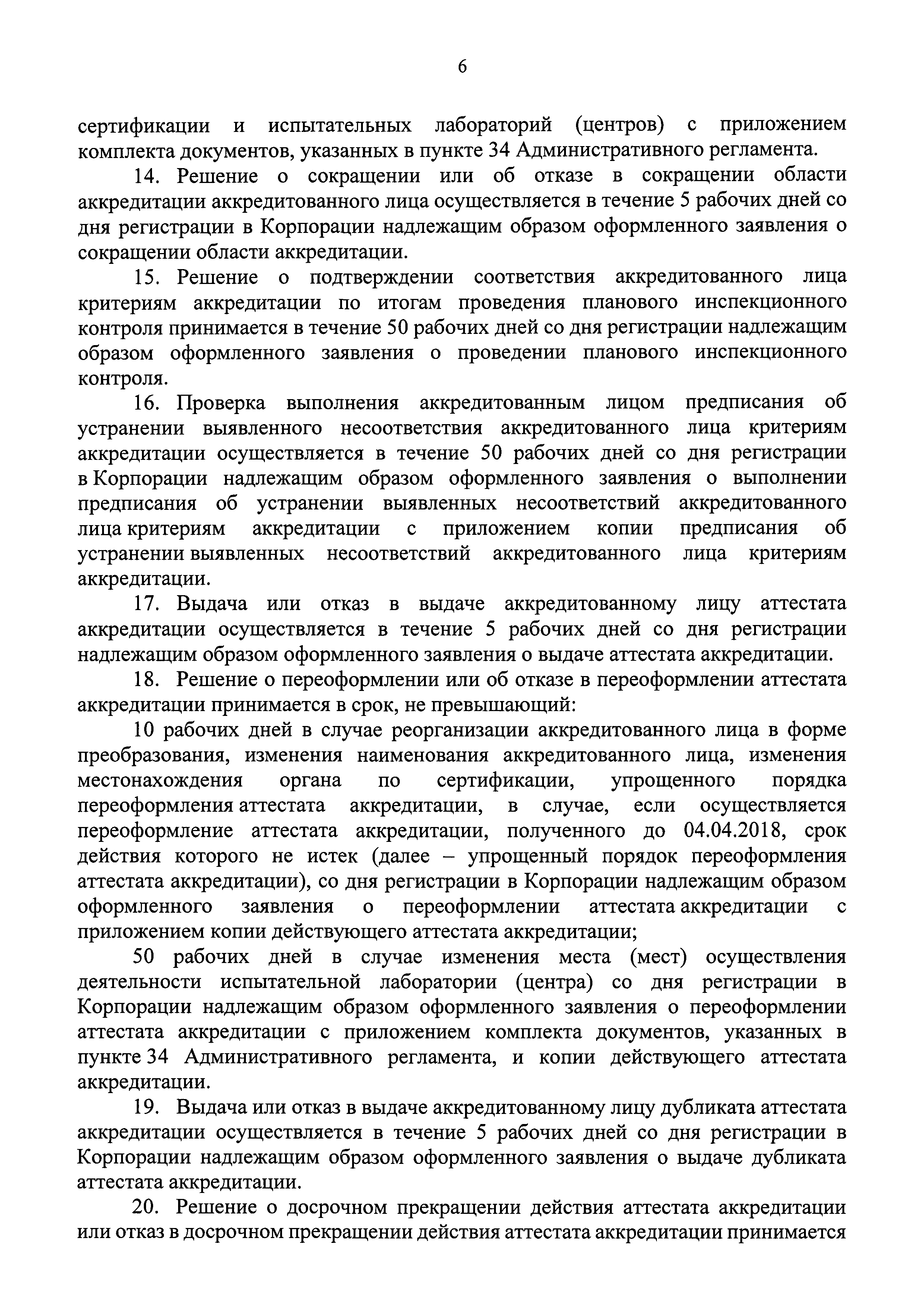 Административный регламент Государственной корпорации по атомной энергии "Росатом" по предоставлению государственной услуги "Аккредитация органов по сертификации и испытательных лабораторий (центров), выполняющих работы по подтверждению соответствия продукции, для которой устанавливаются требования, связанные с обеспечением безопасности в области использования атомной энергии, обязательным требованиям"| Статус: | действует | | Название рус.: | Административный регламент Государственной корпорации по атомной энергии "Росатом" по предоставлению государственной услуги "Аккредитация органов по сертификации и испытательных лабораторий (центров), выполняющих работы по подтверждению соответствия продукции, для которой устанавливаются требования, связанные с обеспечением безопасности в области использования атомной энергии, обязательным требованиям" | | Дата добавления в базу: | 01.02.2020 | | Дата актуализации: | 01.01.2021 | | Дата введения: | 11.02.2019 | | Область применения: | Административный регламент Государственной корпорации по атомной энергии "Росатом" по предоставлению государственной услуги "Аккредитация органов по сертификации и испытательных лабораторий (центров), выполняющих работы по подтверждению соответствия продукции, для которой устанавливаются требования, связанные с обеспечением безопасности в области использования атомной энергии, обязательным требованиям" определяет состав, последовательность и сроки выполнения административных процедур (действий), а также порядок взаимодействия с заявителями, экспертами по аккредитации и техническими экспертами, федеральными органами исполнительной власти в процессе предоставления Государственной корпорацией по атомной энергии "Росатом" государственной услуги по аккредитации органов по сертификации и испытательных лабораторий (центров), выполняющих работы по подтверждению соответствия продукции, для которой устанавливаются требования, связанные с обеспечением безопасности в области использования атомной энергии, обязательным требованиям | | Оглавление: | I. Общие положения II. Стандарт предоставления государственной услуги III. Состав, последовательность и сроки выполнения административных процедур (действий), требования к порядку их выполнения, в том числе особенности выполнения административных процедур (действий) в электронной форме IV. Формы контроля за исполнением Административного регламента V. Досудебный (внесудебный) порядок обжалования решений и действий (бездействия) Корпорации, а также должностных лиц Корпорации | | Утверждён: | 30.10.2018 Государственная корпорация по атомной энергии РОСАТОМ (1/31-НПА)