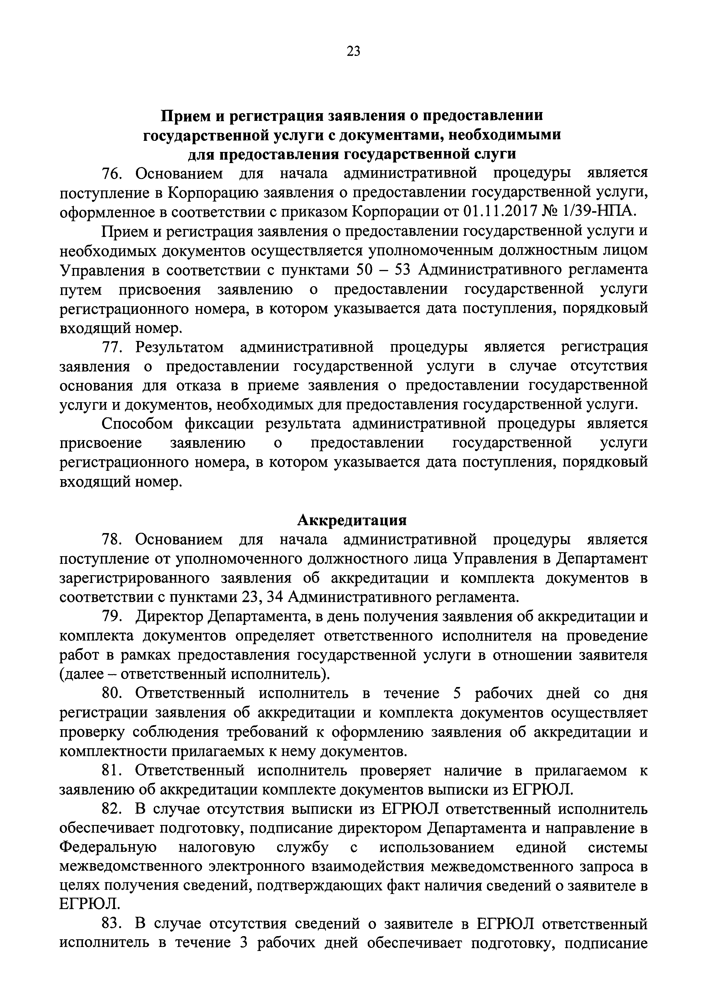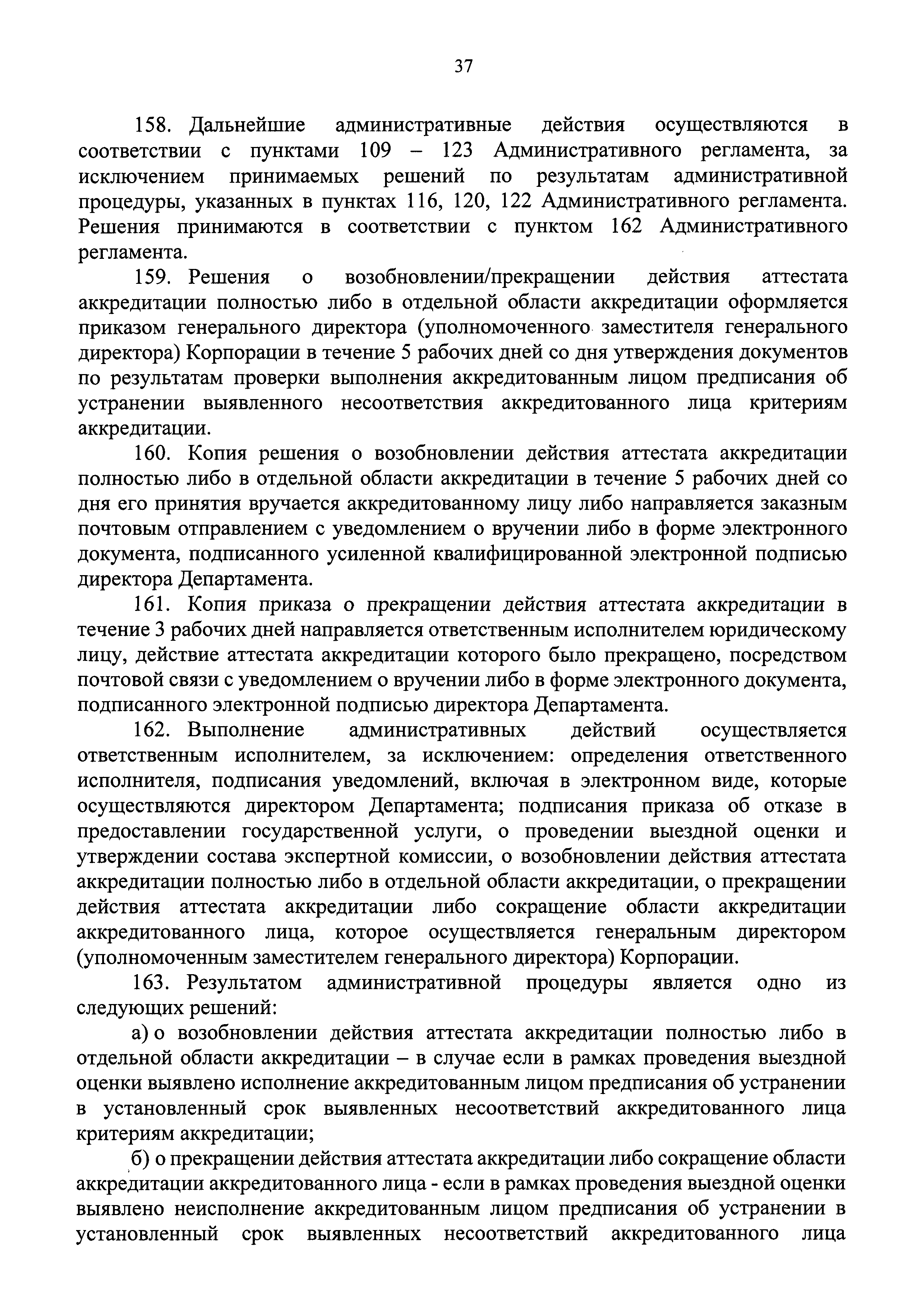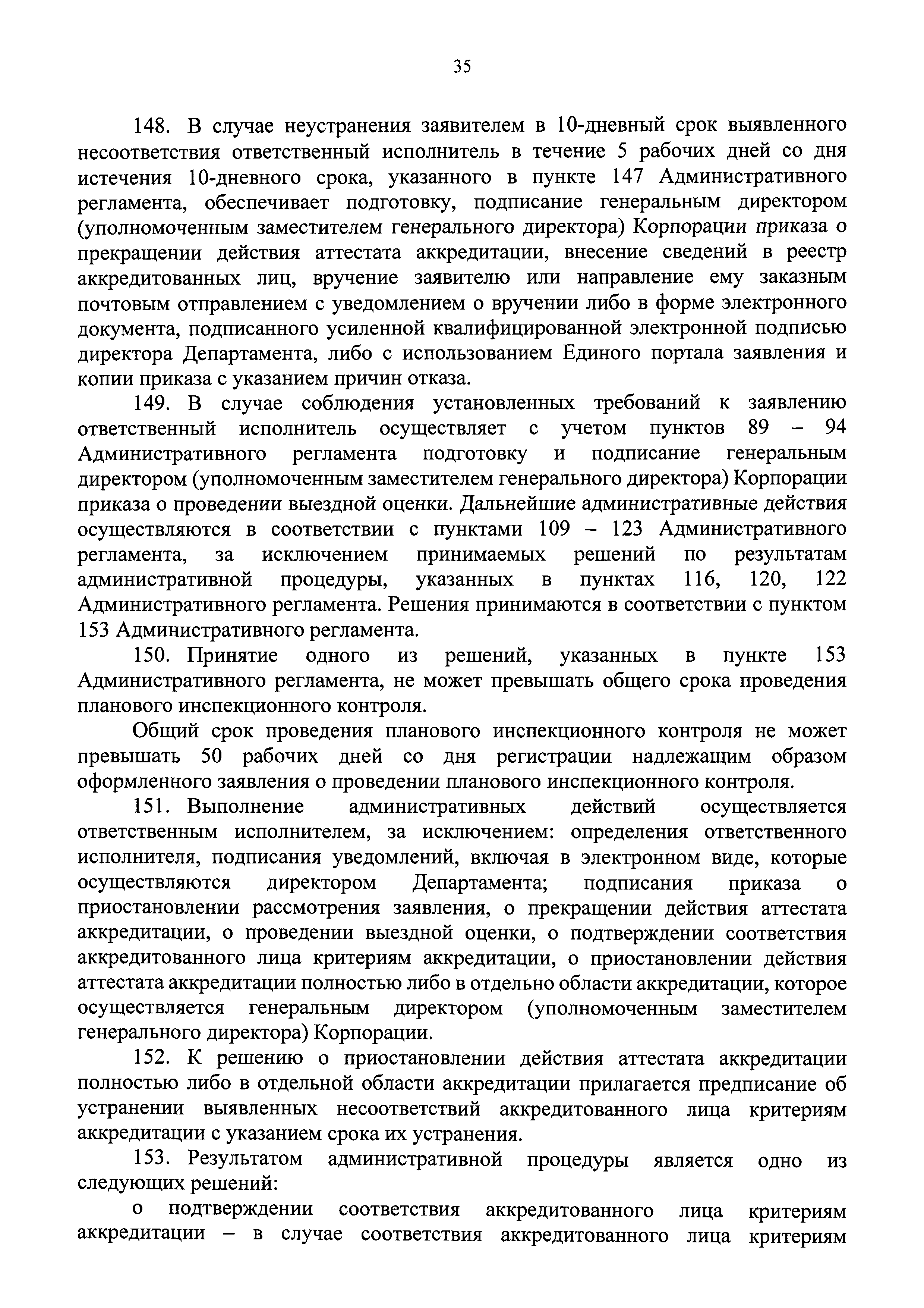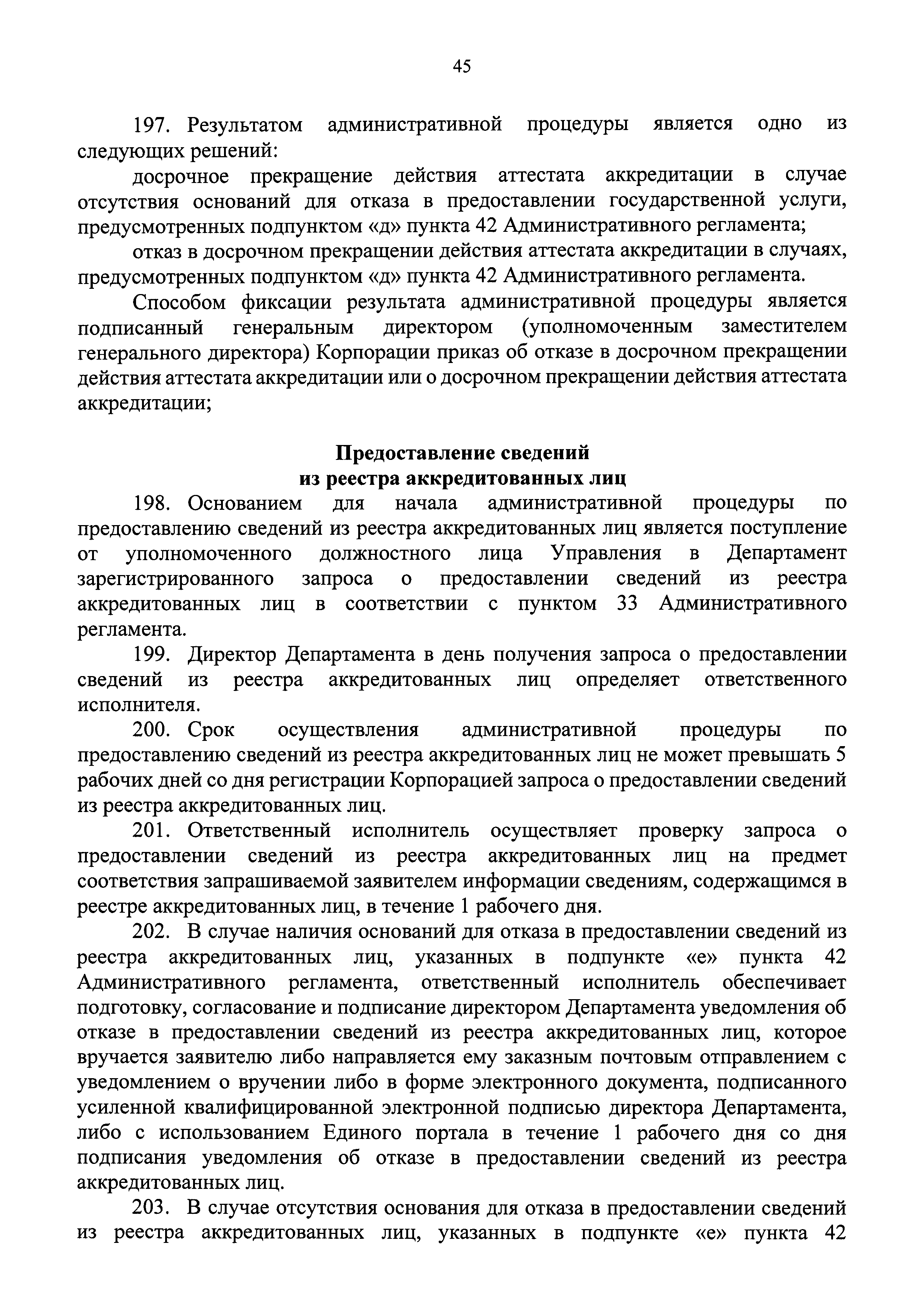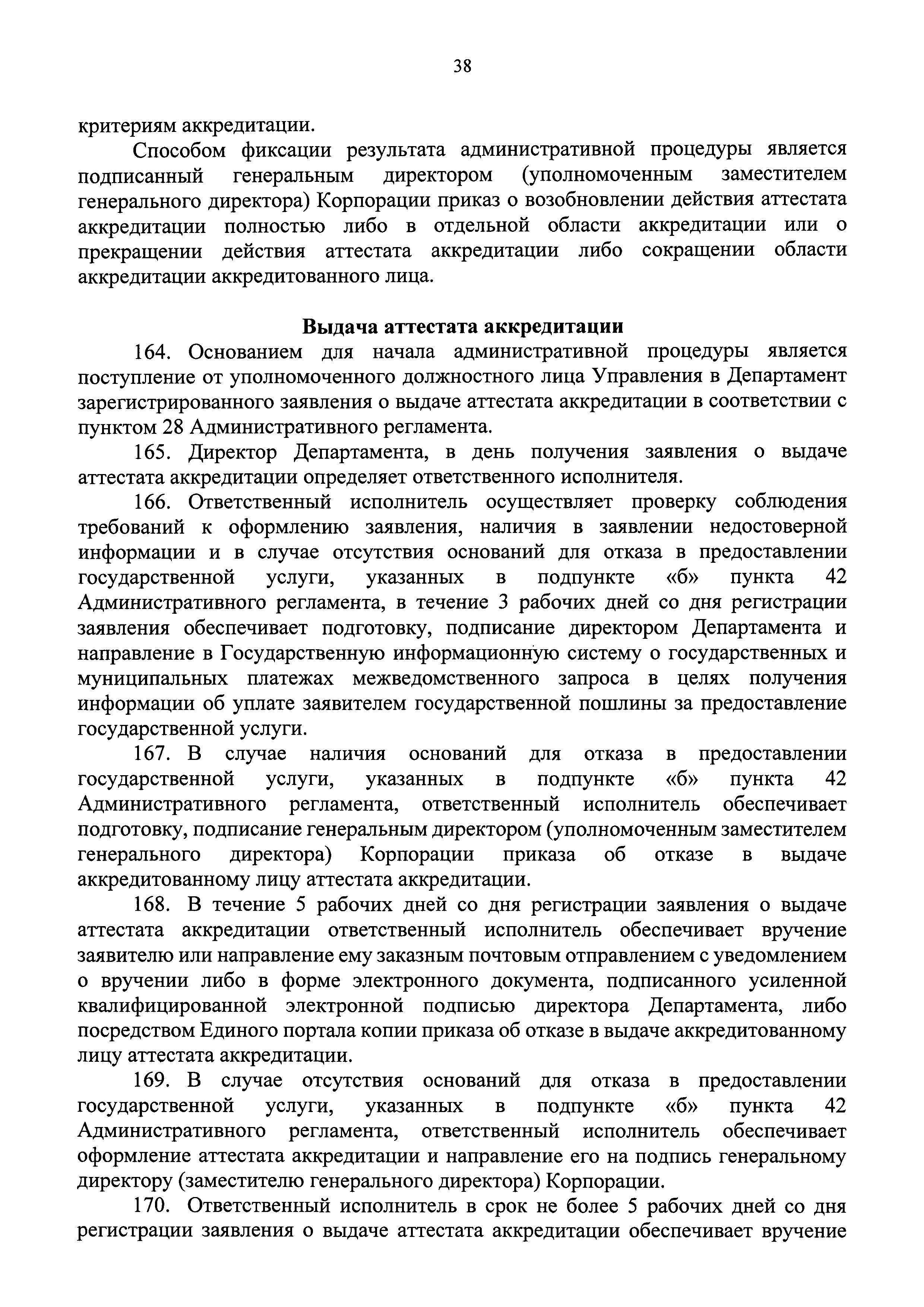 Административный регламент Государственной корпорации по атомной энергии "Росатом" по предоставлению государственной услуги "Аккредитация органов по сертификации и испытательных лабораторий (центров), выполняющих работы по подтверждению соответствия продукции, для которой устанавливаются требования, связанные с обеспечением безопасности в области использования атомной энергии, обязательным требованиям"| Статус: | действует | | Название рус.: | Административный регламент Государственной корпорации по атомной энергии "Росатом" по предоставлению государственной услуги "Аккредитация органов по сертификации и испытательных лабораторий (центров), выполняющих работы по подтверждению соответствия продукции, для которой устанавливаются требования, связанные с обеспечением безопасности в области использования атомной энергии, обязательным требованиям" | | Дата добавления в базу: | 01.02.2020 | | Дата актуализации: | 01.01.2021 | | Дата введения: | 11.02.2019 | | Область применения: | Административный регламент Государственной корпорации по атомной энергии "Росатом" по предоставлению государственной услуги "Аккредитация органов по сертификации и испытательных лабораторий (центров), выполняющих работы по подтверждению соответствия продукции, для которой устанавливаются требования, связанные с обеспечением безопасности в области использования атомной энергии, обязательным требованиям" определяет состав, последовательность и сроки выполнения административных процедур (действий), а также порядок взаимодействия с заявителями, экспертами по аккредитации и техническими экспертами, федеральными органами исполнительной власти в процессе предоставления Государственной корпорацией по атомной энергии "Росатом" государственной услуги по аккредитации органов по сертификации и испытательных лабораторий (центров), выполняющих работы по подтверждению соответствия продукции, для которой устанавливаются требования, связанные с обеспечением безопасности в области использования атомной энергии, обязательным требованиям | | Оглавление: | I. Общие положения II. Стандарт предоставления государственной услуги III. Состав, последовательность и сроки выполнения административных процедур (действий), требования к порядку их выполнения, в том числе особенности выполнения административных процедур (действий) в электронной форме IV. Формы контроля за исполнением Административного регламента V. Досудебный (внесудебный) порядок обжалования решений и действий (бездействия) Корпорации, а также должностных лиц Корпорации | | Утверждён: | 30.10.2018 Государственная корпорация по атомной энергии РОСАТОМ (1/31-НПА)