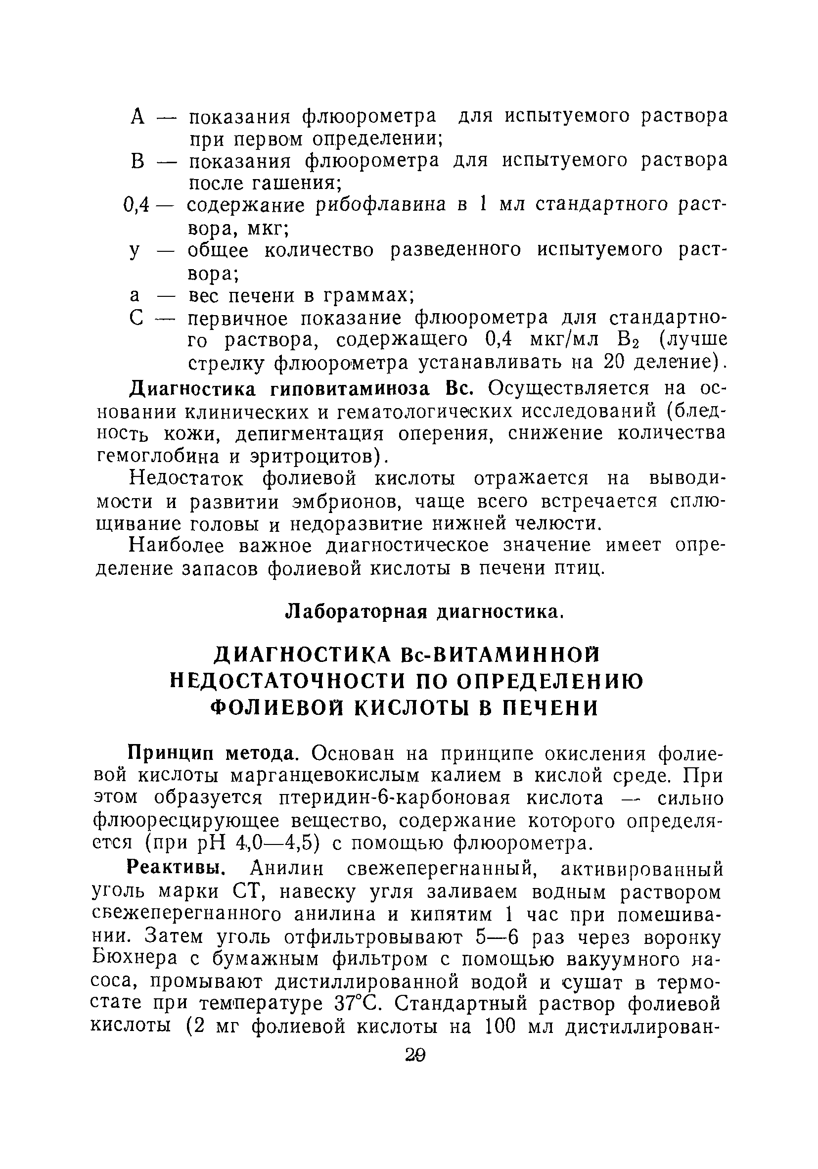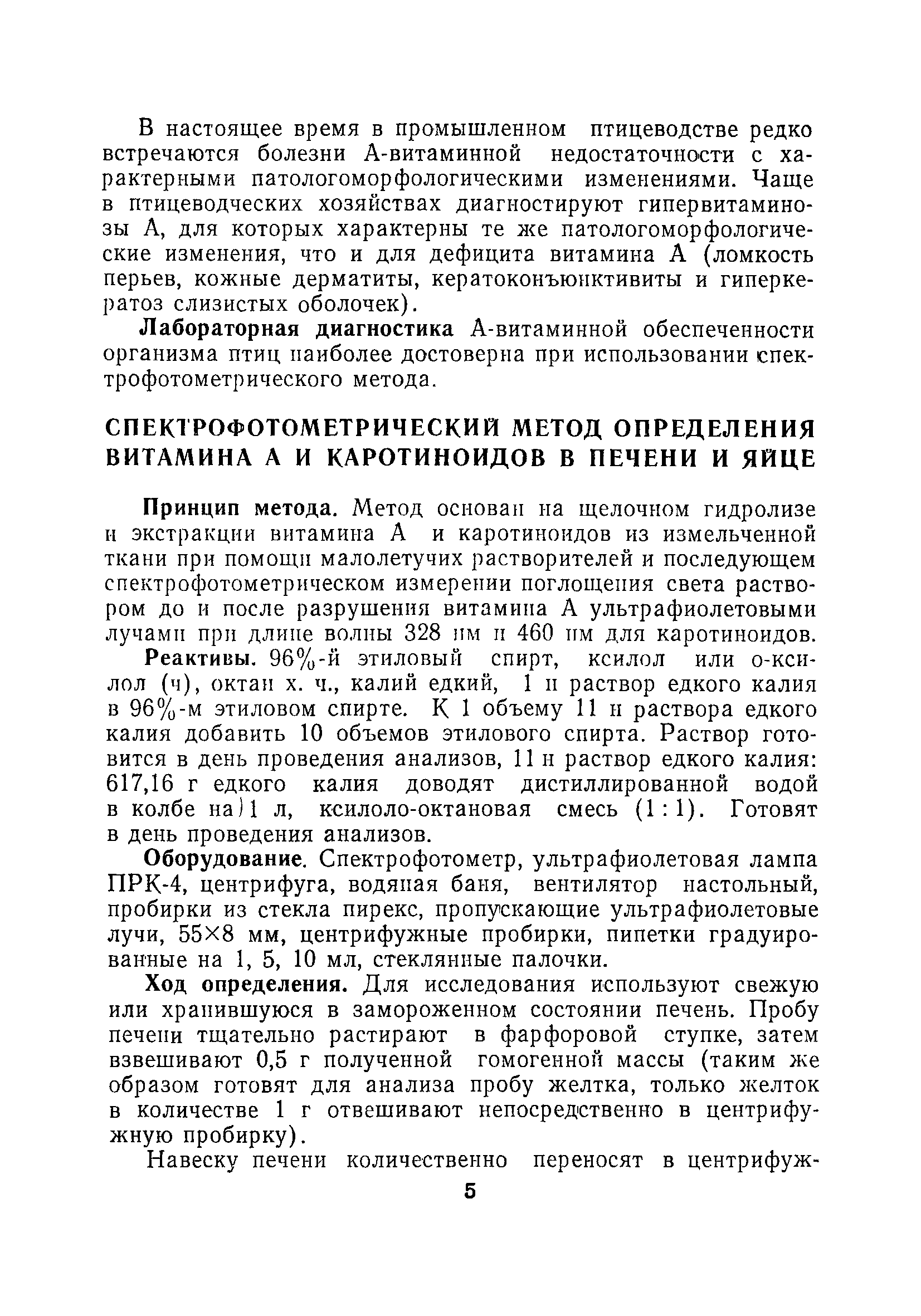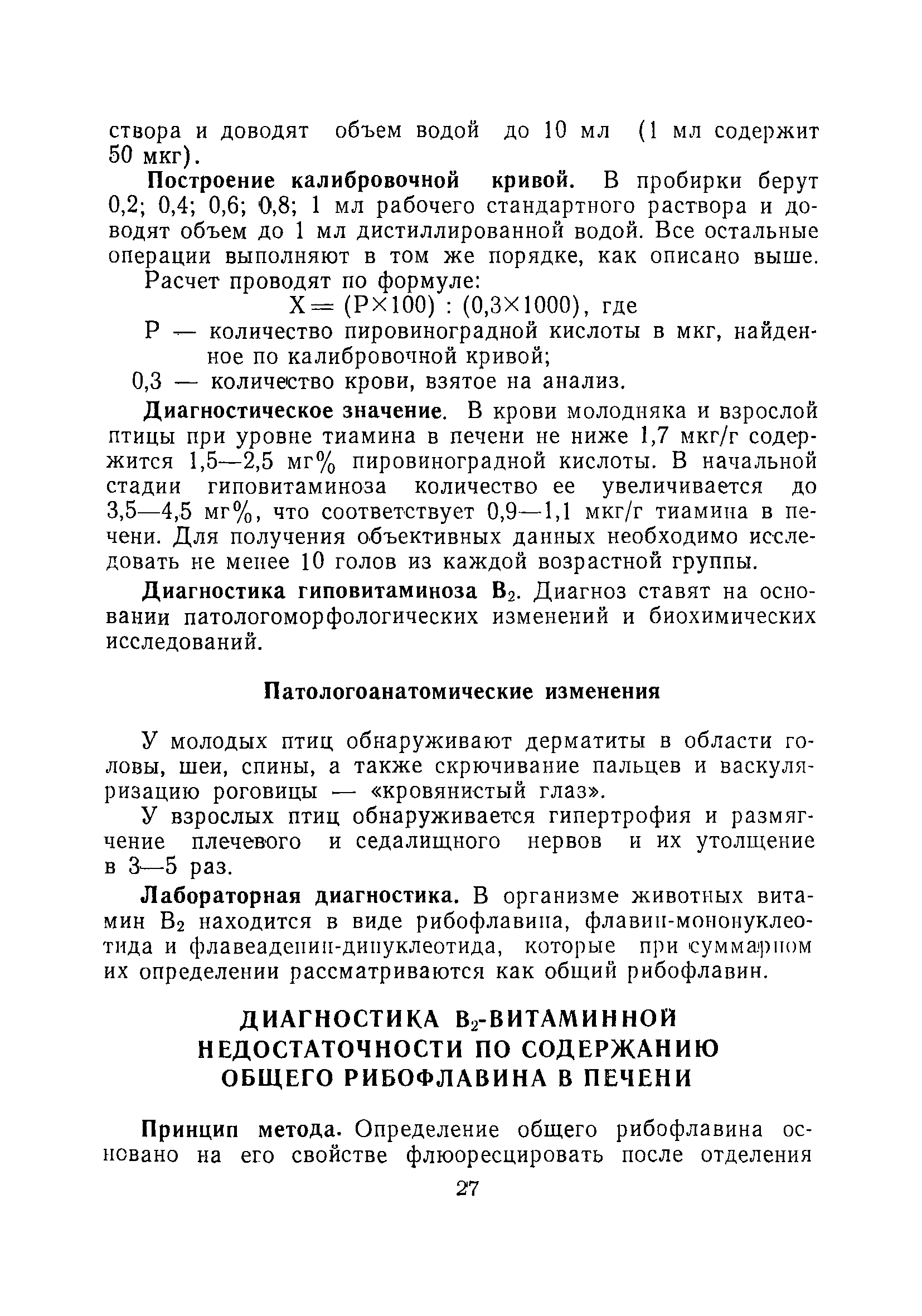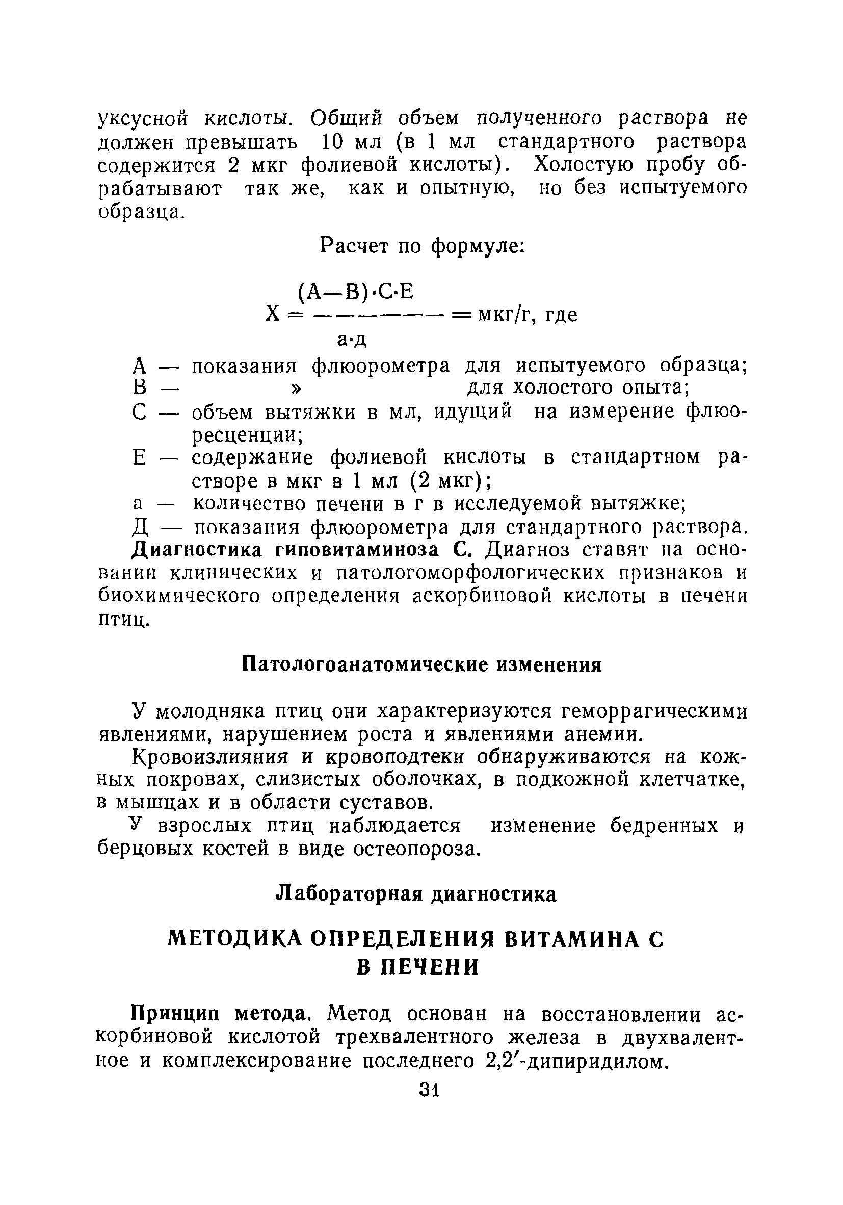 | Оглавление: | Общие вопросы Причины, обуславливающие гиповитаминозы Диагностика Спектрофотометрический метод определения витамина А и каротиноидов в печени и яйце Лабораторная диагностика Е-витаминной обеспеченности организма птиц Определение витамина Е в печени и яйце Определение витамина Е в сыворотке крови Построение калибровочной кривой Определение Е-витаминной недостаточности с помощью тест-гемолиза эритроцитов Патологоанатомические изменения Л абораторная диагностика Определение содержания витамина К в печени по методу Мееровича и Мартинсона Построение калибровочной кривой Диагностика К-витаминной недостаточности у птиц по протромбиновой активности крови Патоморфологические изменения Лабораторная диагностика Метод определения витамина Д в печени Диагностика Д-витаминной недостаточности по уровню лимонной кислоты в крови Построение калибровочной кривой Диагностика гиповитаминоза В1 Патологоморфологические изменения Определение В1-витаминной недостаточности по содержанию общего тиамина в печени Диагностика тиаминовой недостаточности по уровню пировиноградной кислоты в крови Патологоанатомические изменения Диагностика В2-витаминной недостаточности по содержанию общего рибофлавина в печени Лабораторная диагностика Диагностика Вс-витаминной недостаточности по определению фолиевой кислоты в печени Патологоанатомические изменения Лабораторная диагностика Методика определения витамина С в печени Профилактика болезней витаминной недостаточности Профилактика гиповитаминоза А Профилактика гиповитаминоза Е Профилактика гиповитаминоза К Профилактика гиповитаминоза Д Профилактика гиповитаминоза В1 Профилактика гиповитаминоза В2 Профилактика гиповитаминоза Вс Профилактика гиповитаминоза С Физиологические параметры содержания витаминов и селена у птиц Методика определений витамина А в масляном препарате Методика определения содержания селена в биологических объектах Приготовление стандартных растворов селена Флюорометрическое определение селена Обработка результатов Очистка органических растворителей от примесей |