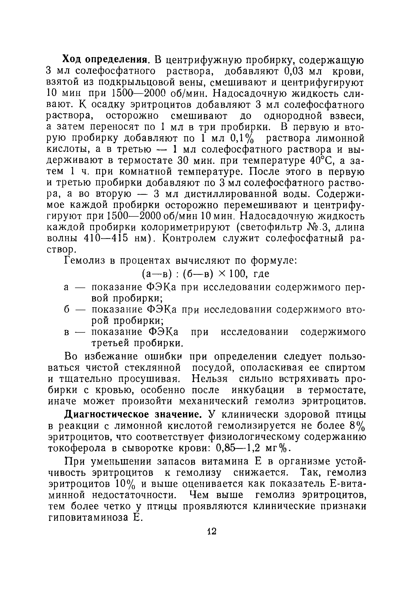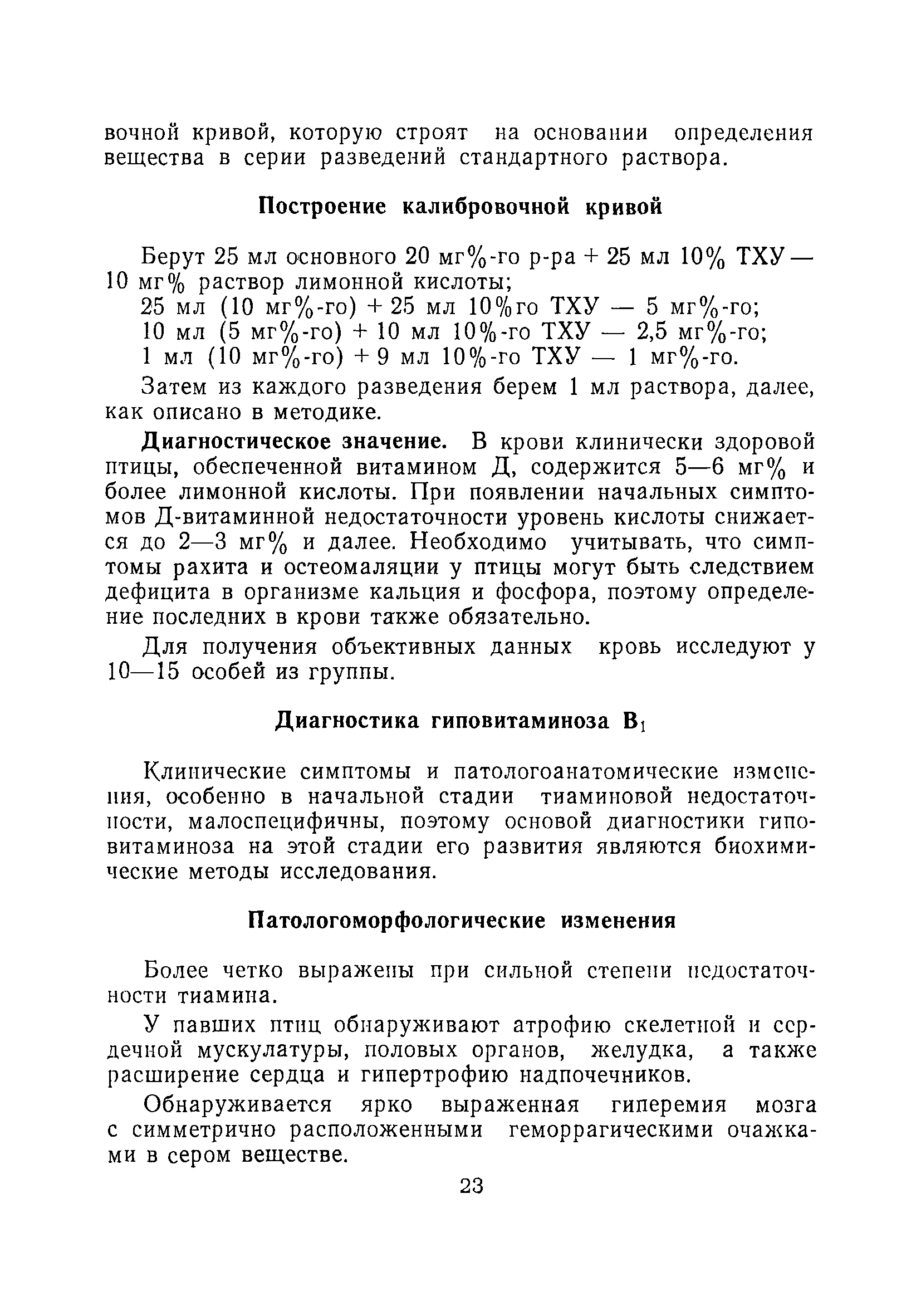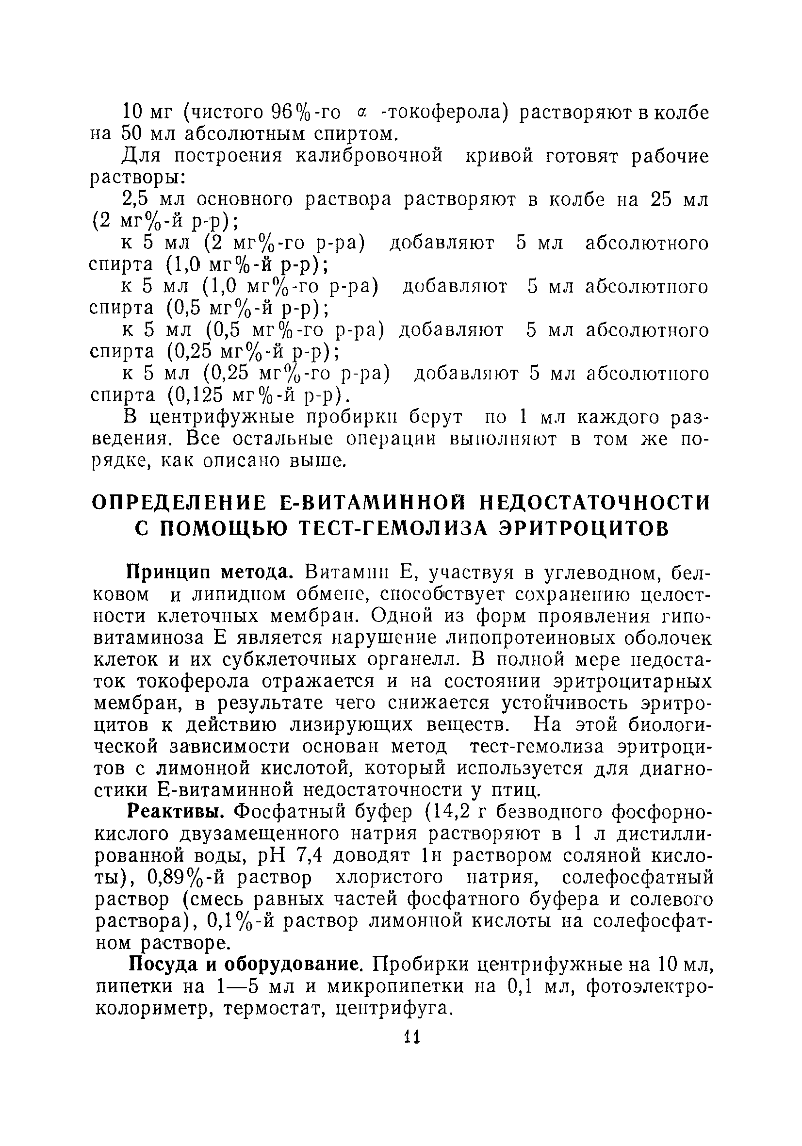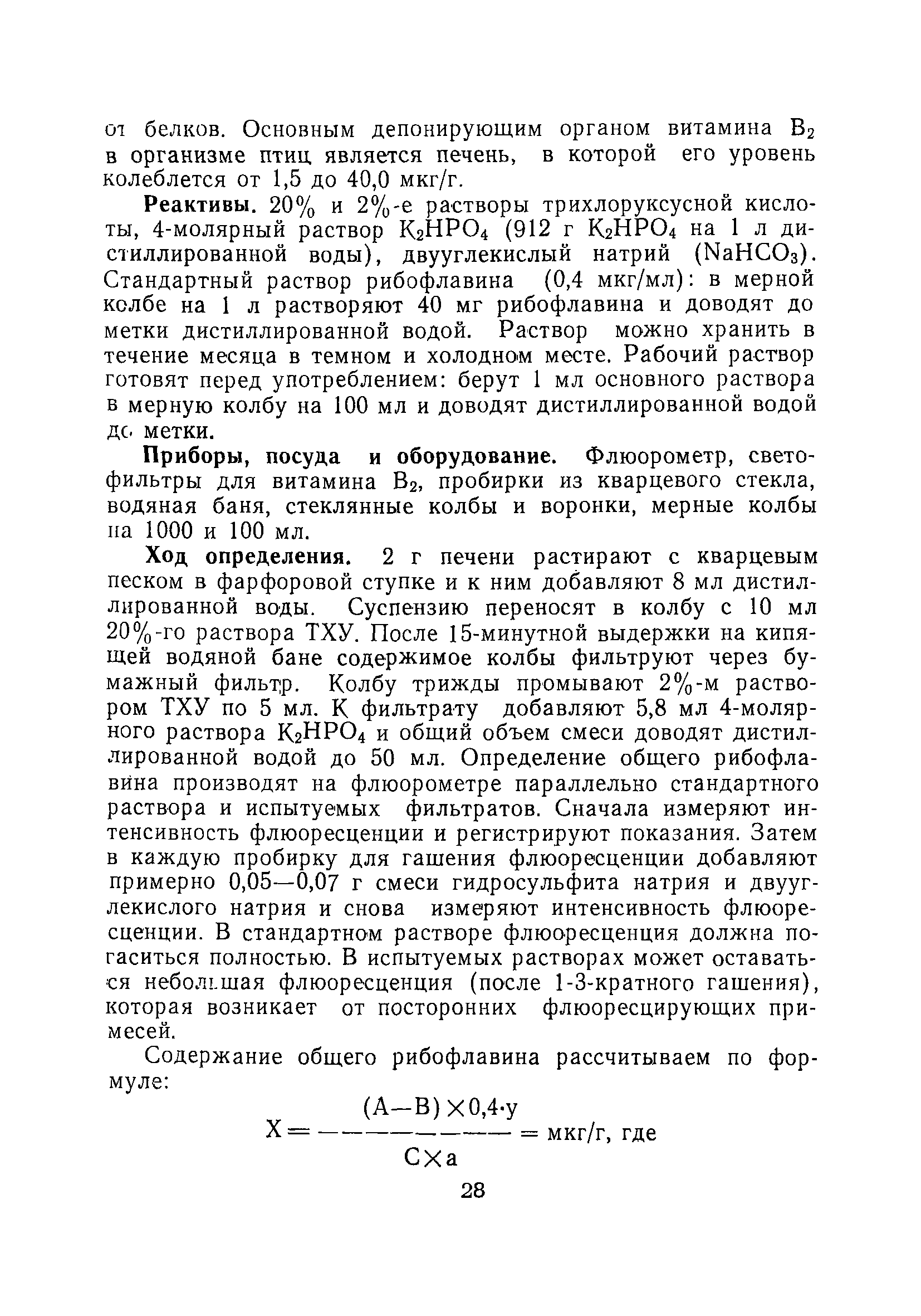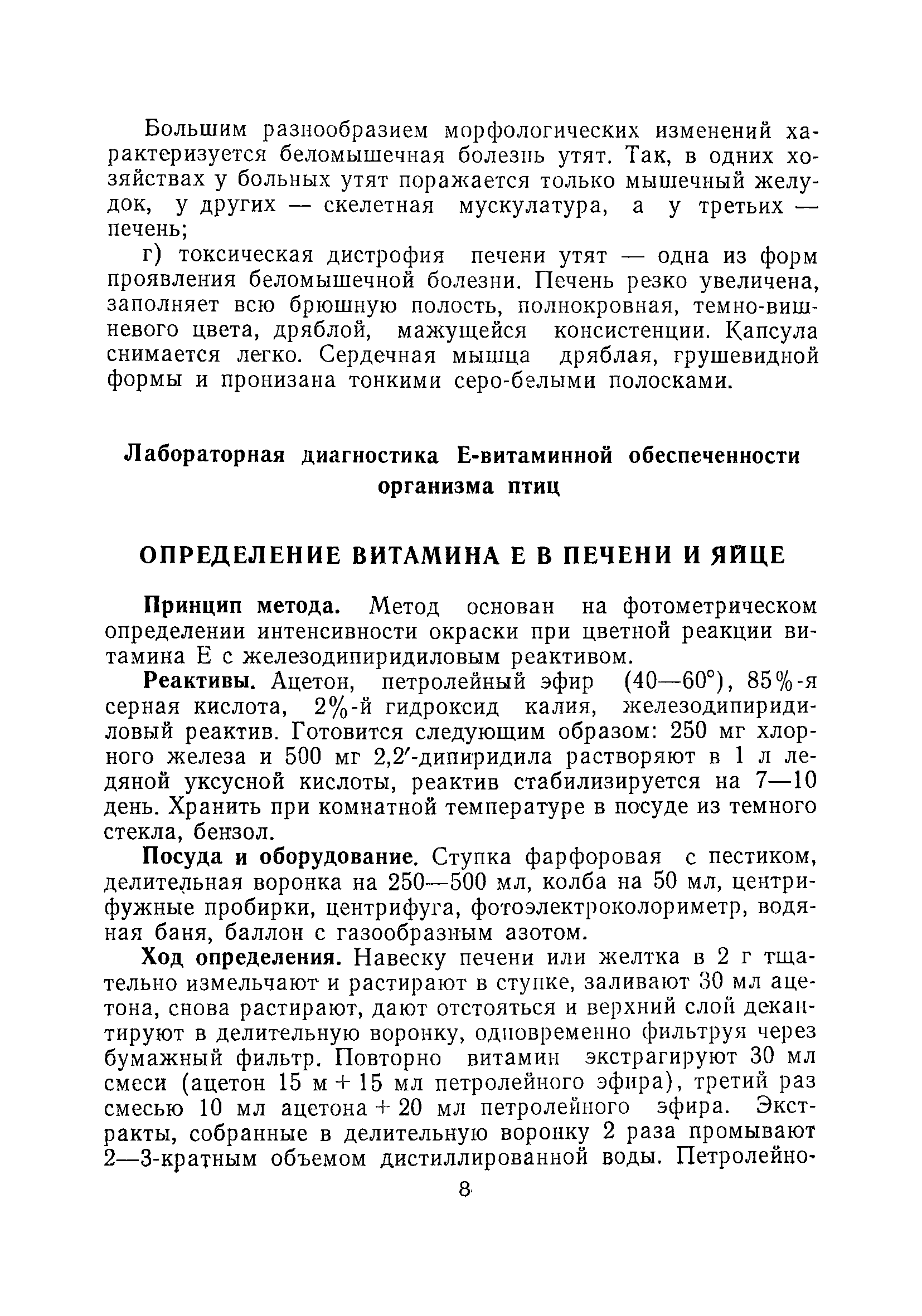 | Оглавление: | Общие вопросы Причины, обуславливающие гиповитаминозы Диагностика Спектрофотометрический метод определения витамина А и каротиноидов в печени и яйце Лабораторная диагностика Е-витаминной обеспеченности организма птиц Определение витамина Е в печени и яйце Определение витамина Е в сыворотке крови Построение калибровочной кривой Определение Е-витаминной недостаточности с помощью тест-гемолиза эритроцитов Патологоанатомические изменения Л абораторная диагностика Определение содержания витамина К в печени по методу Мееровича и Мартинсона Построение калибровочной кривой Диагностика К-витаминной недостаточности у птиц по протромбиновой активности крови Патоморфологические изменения Лабораторная диагностика Метод определения витамина Д в печени Диагностика Д-витаминной недостаточности по уровню лимонной кислоты в крови Построение калибровочной кривой Диагностика гиповитаминоза В1 Патологоморфологические изменения Определение В1-витаминной недостаточности по содержанию общего тиамина в печени Диагностика тиаминовой недостаточности по уровню пировиноградной кислоты в крови Патологоанатомические изменения Диагностика В2-витаминной недостаточности по содержанию общего рибофлавина в печени Лабораторная диагностика Диагностика Вс-витаминной недостаточности по определению фолиевой кислоты в печени Патологоанатомические изменения Лабораторная диагностика Методика определения витамина С в печени Профилактика болезней витаминной недостаточности Профилактика гиповитаминоза А Профилактика гиповитаминоза Е Профилактика гиповитаминоза К Профилактика гиповитаминоза Д Профилактика гиповитаминоза В1 Профилактика гиповитаминоза В2 Профилактика гиповитаминоза Вс Профилактика гиповитаминоза С Физиологические параметры содержания витаминов и селена у птиц Методика определений витамина А в масляном препарате Методика определения содержания селена в биологических объектах Приготовление стандартных растворов селена Флюорометрическое определение селена Обработка результатов Очистка органических растворителей от примесей |