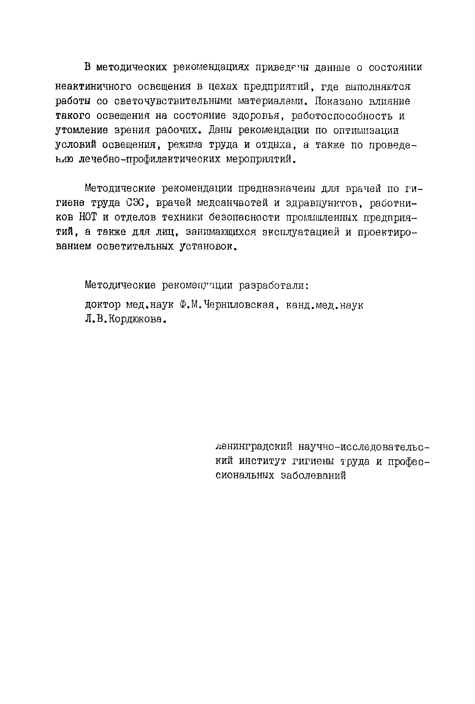 Методические рекомендации предназначены для врачей по гигиене труда СЭС, врачей медсанчастей и здравпунктов, работников НОТ и отделов техники безопасности промышленных предприятий, а также для лиц, занимающихся эксплуатацией и проектированием осветительных установок. |