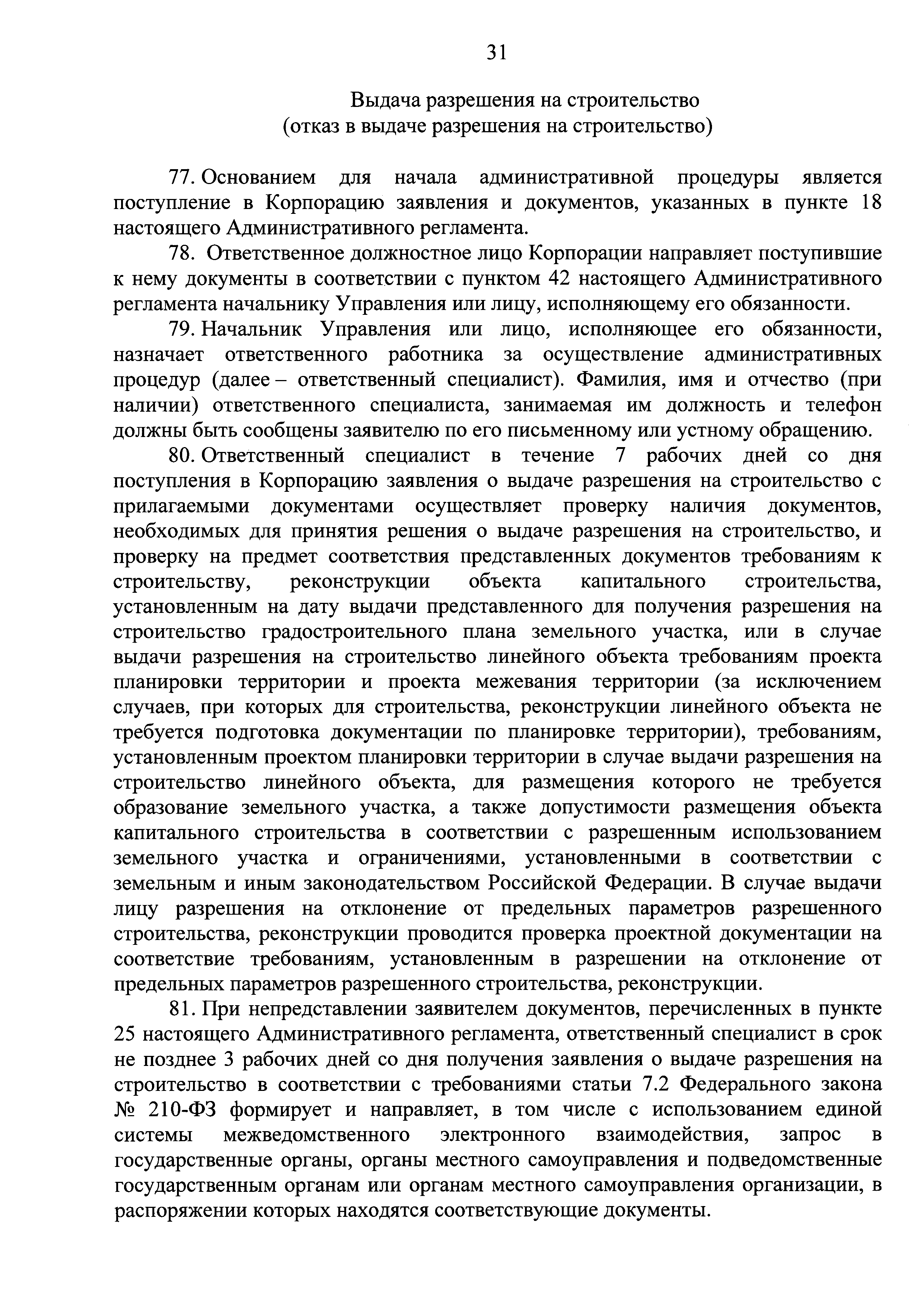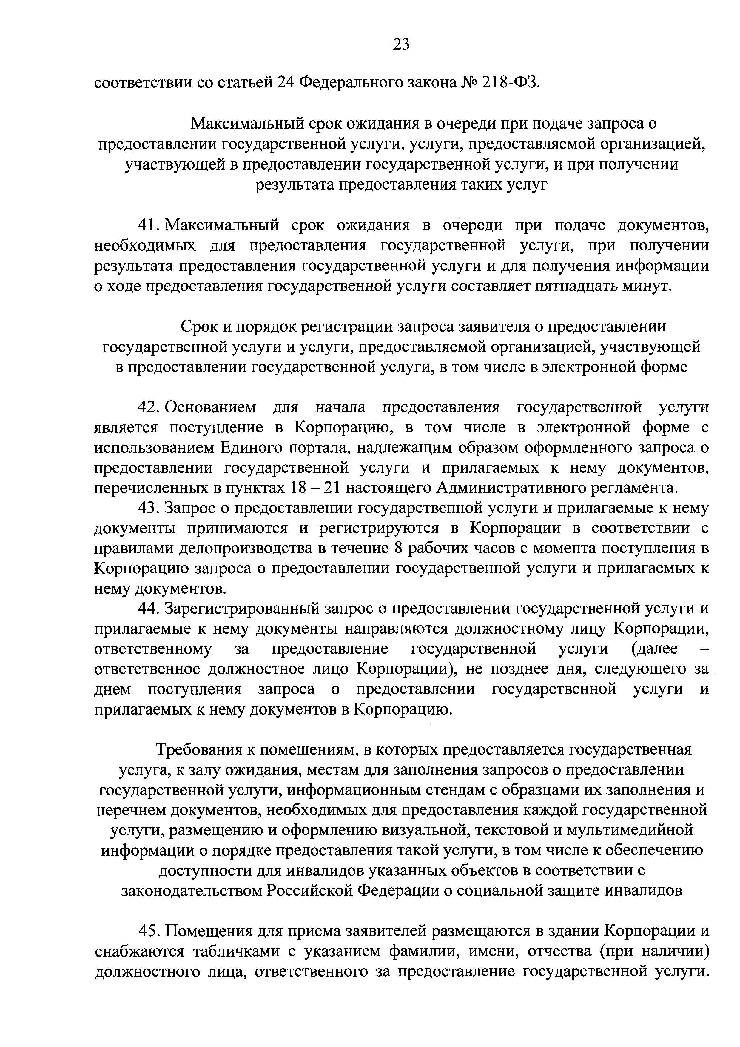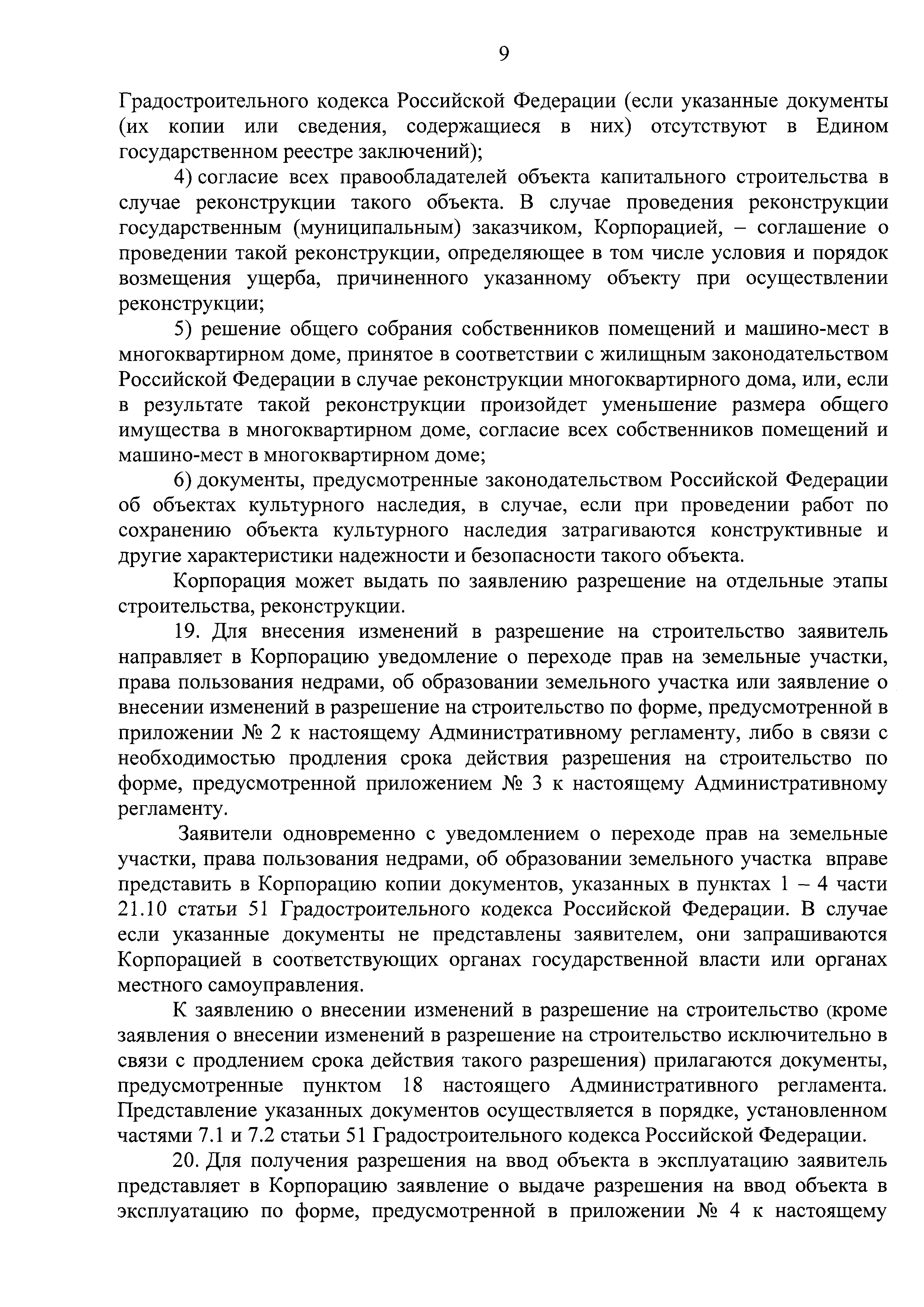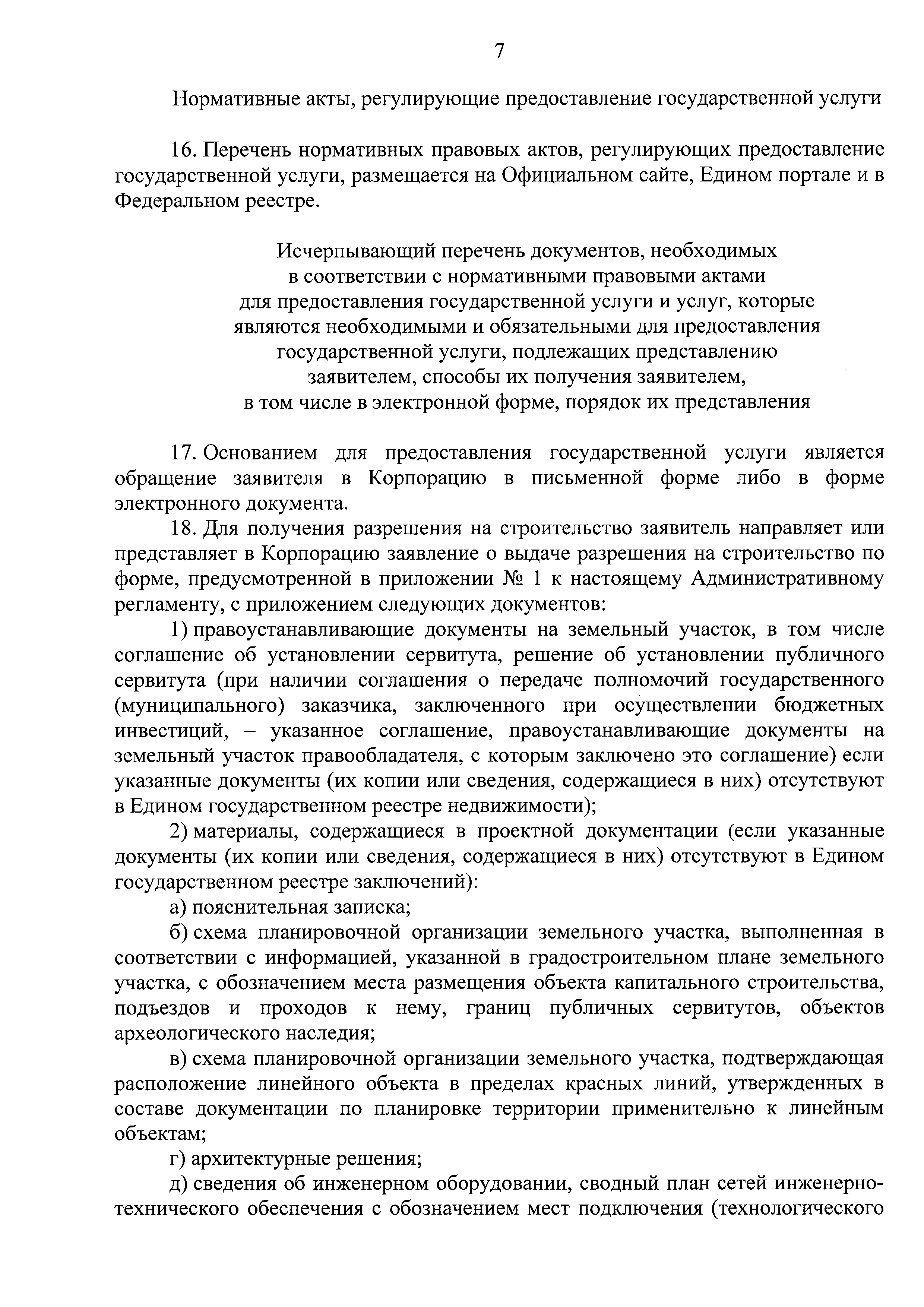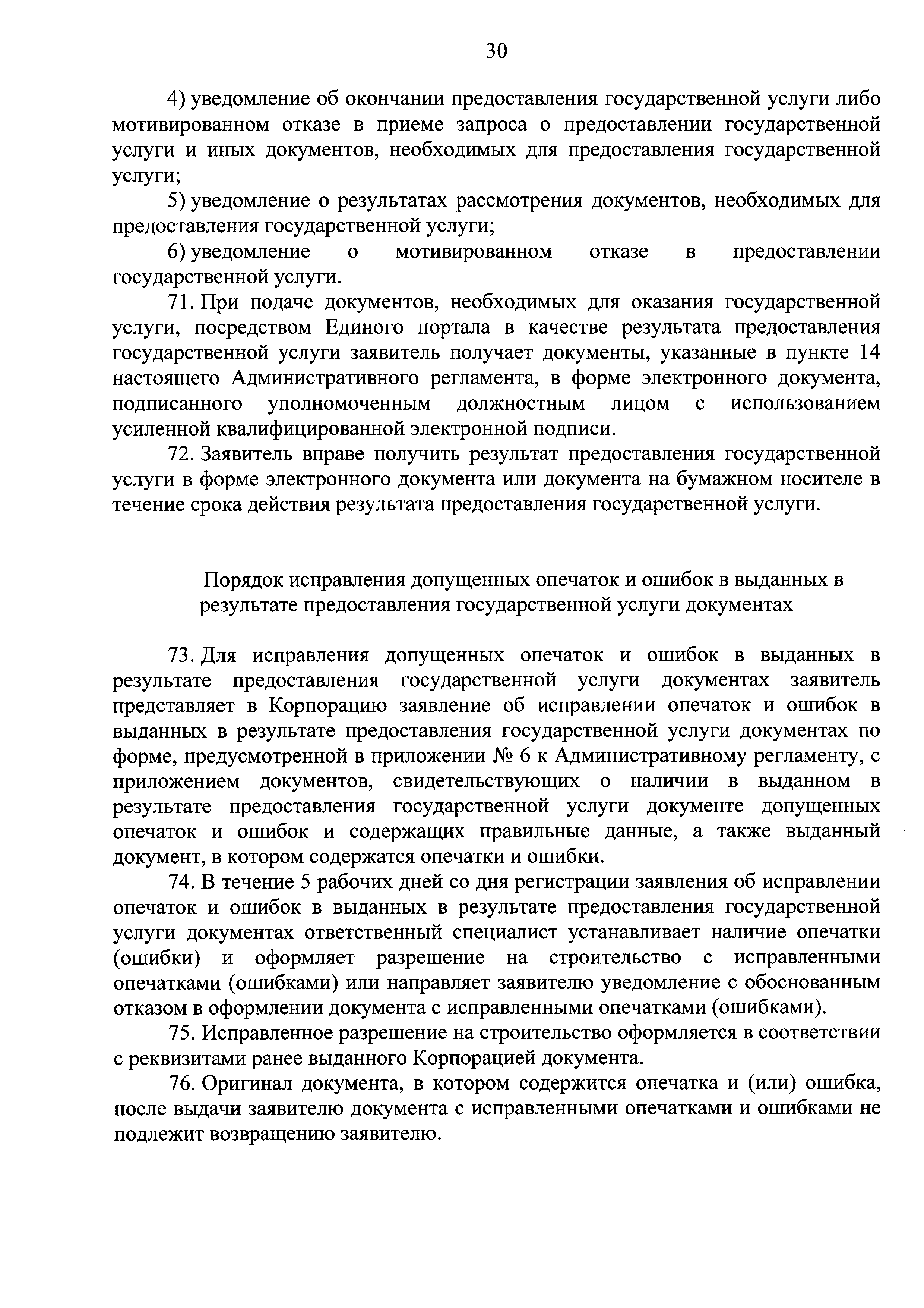 | Оглавление: | I. Общие положения II. Стандарт предоставления государственной услуги III. Состав, последовательность и сроки выполнения административных процедур (действий), требования к порядку их выполнения, в том числе особенности выполнения административных процедур (действий) в электронной форме IV. Формы контроля за предоставлением государственной услуги V. Досудебный (внесудебный) порядок обжалования решений и действий (бездействия) корпорации и должностных лиц корпорации, предоставляющих государственную услугу Приложение № 1. Заявление о выдаче разрешения на строительство Приложение № 2. Заявление о внесении изменений в разрешение на строительство Приложение № 3. Заявление о внесении изменения в разрешение на строительство в связи с необходимостью продления срока действия разрешения на строительство Приложение № 4. Заявление о выдаче разрешения на ввод объекта в эксплуатацию Приложение № 5. Заявление о выдаче дубликата разрешения на строительство, разрешения на ввод объекта в эксплуатацию Приложение № 6. Заявление об исправлении опечаток и ошибок в разрешении на строительство, разрешении на ввод объекта в эксплуатацию |