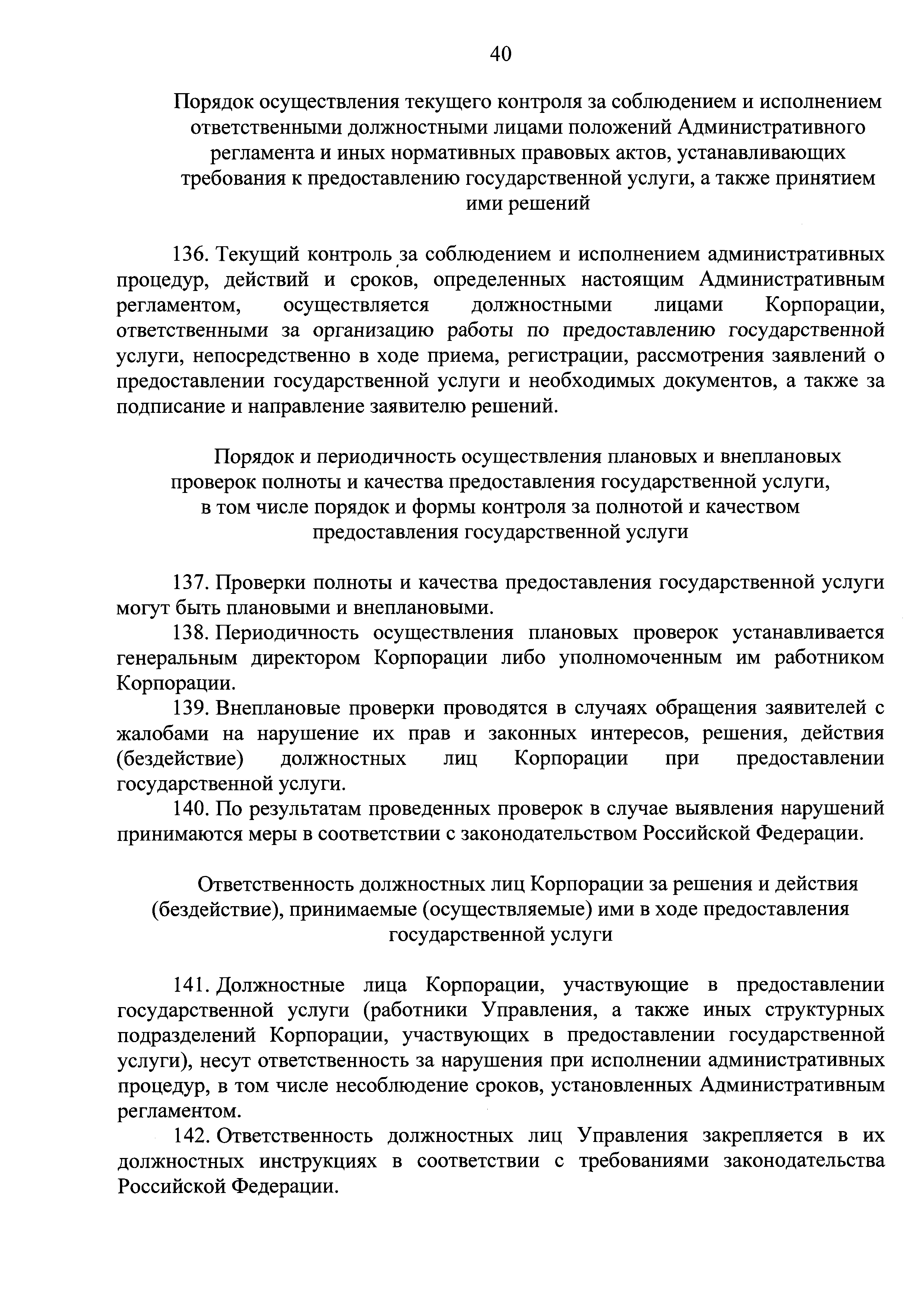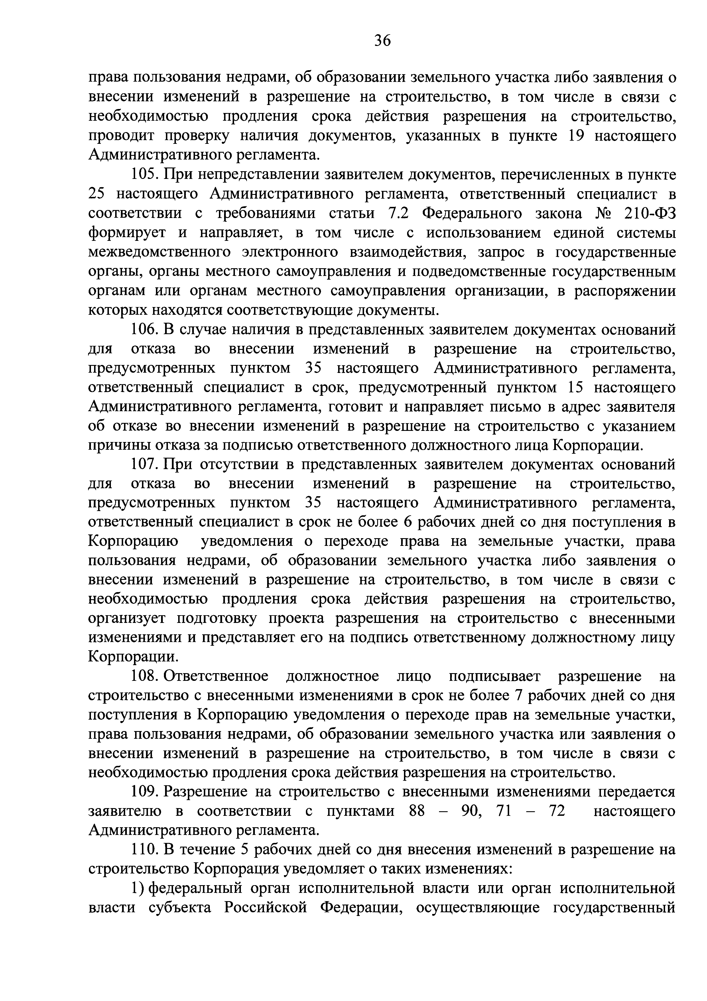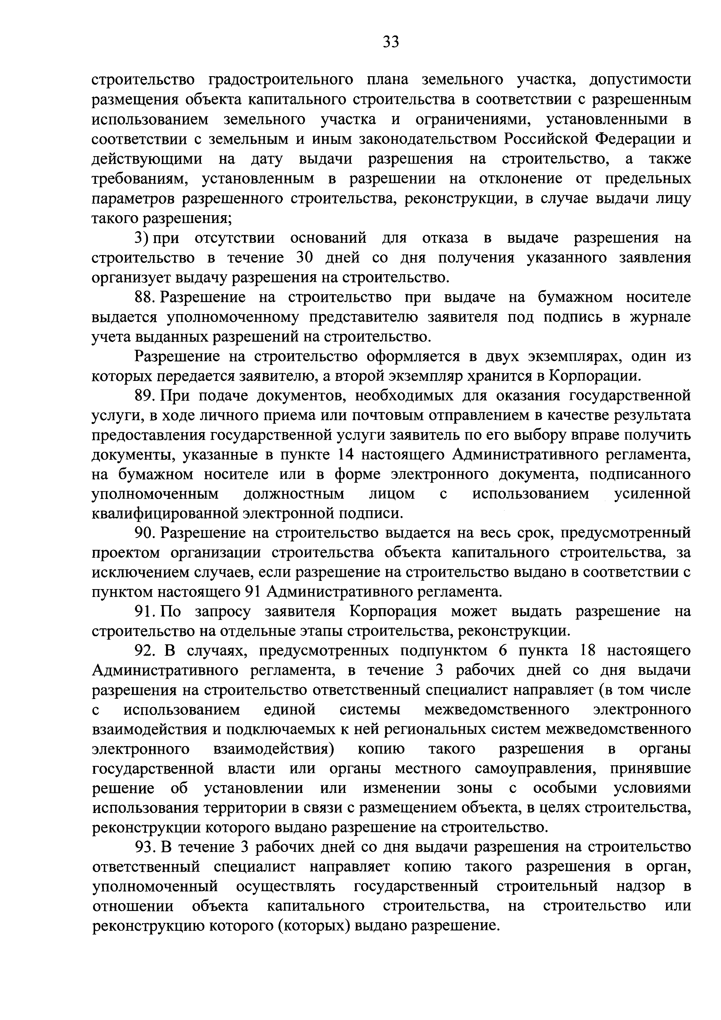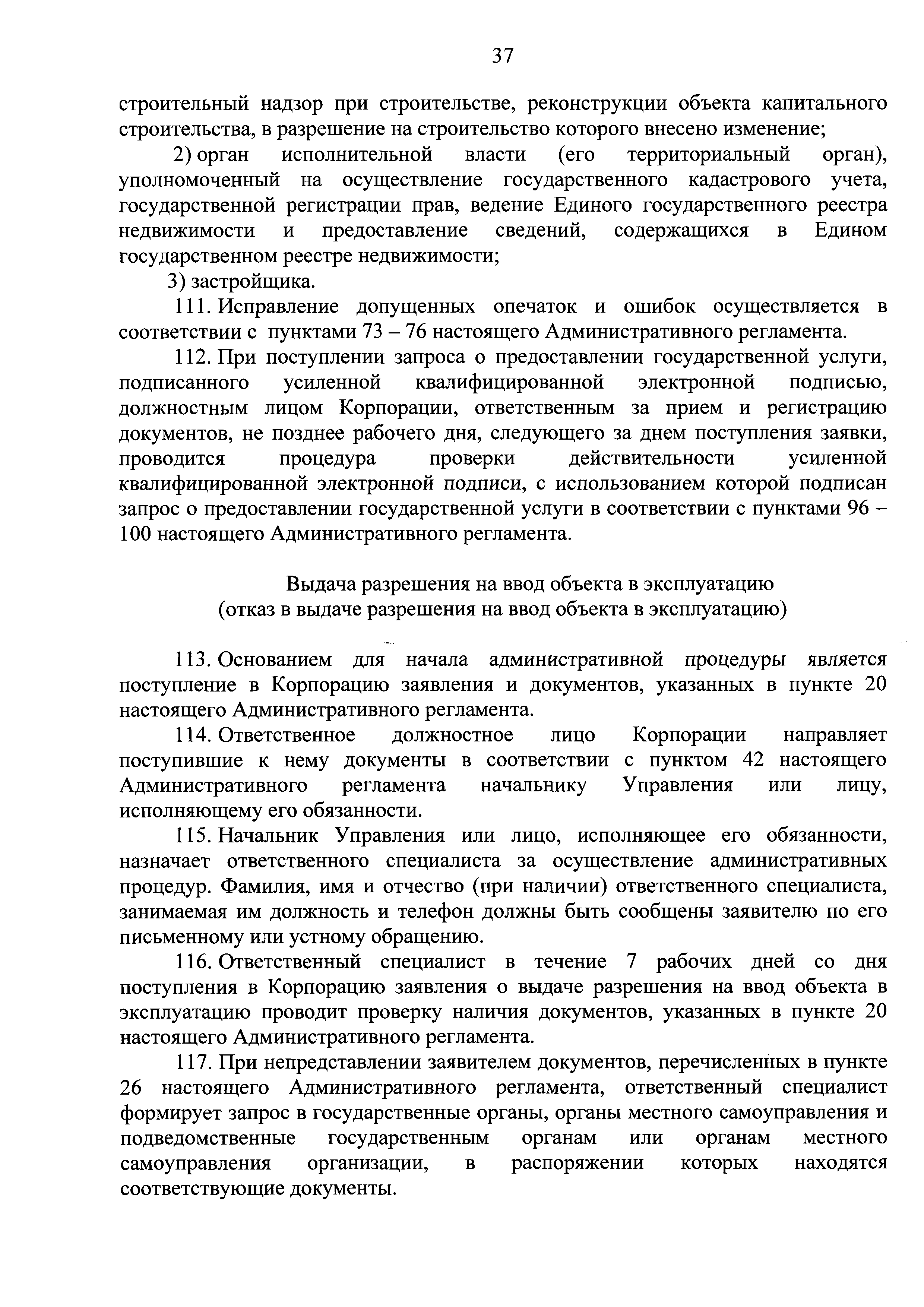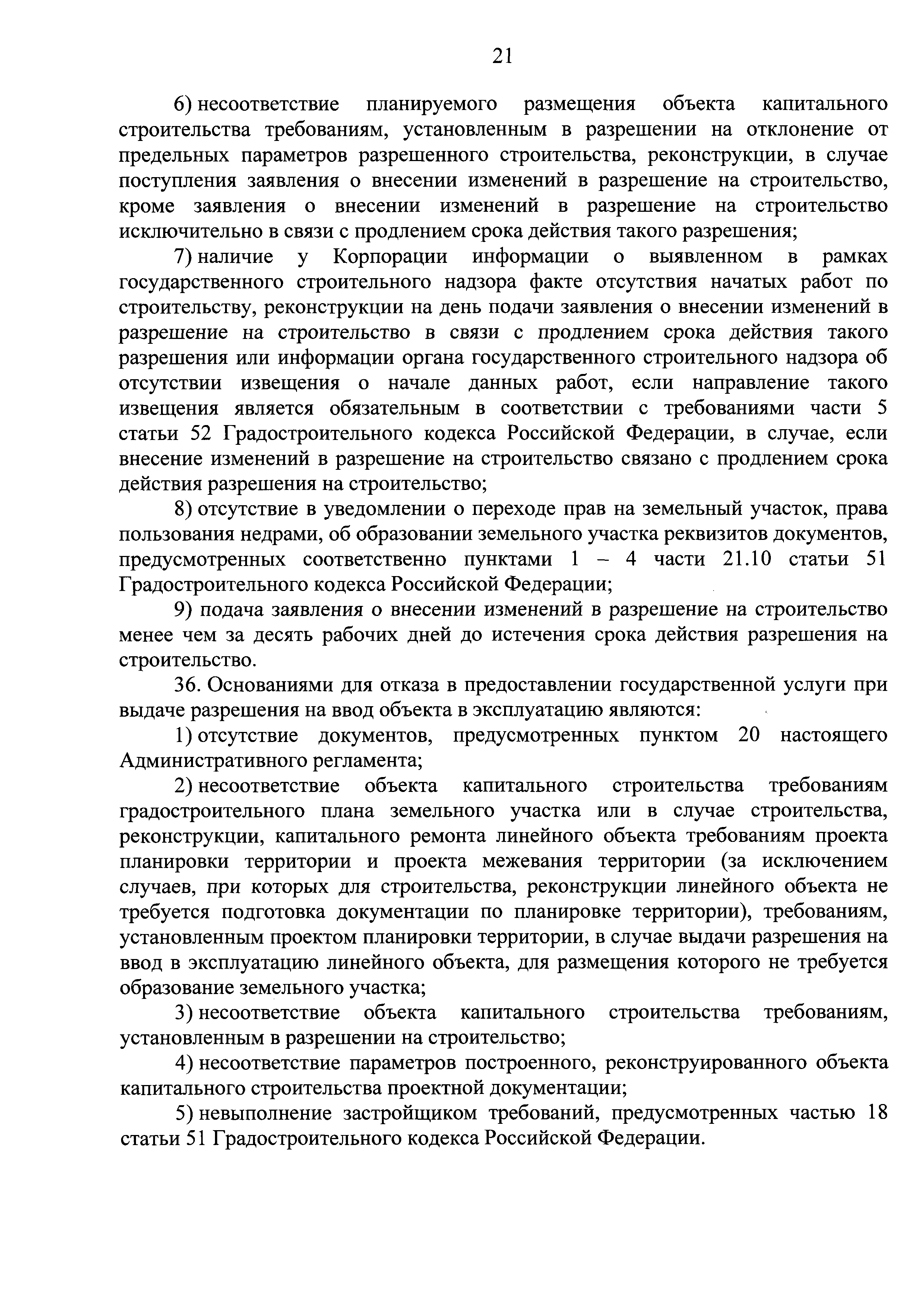 | Оглавление: | I. Общие положения II. Стандарт предоставления государственной услуги III. Состав, последовательность и сроки выполнения административных процедур (действий), требования к порядку их выполнения, в том числе особенности выполнения административных процедур (действий) в электронной форме IV. Формы контроля за предоставлением государственной услуги V. Досудебный (внесудебный) порядок обжалования решений и действий (бездействия) корпорации и должностных лиц корпорации, предоставляющих государственную услугу Приложение № 1. Заявление о выдаче разрешения на строительство Приложение № 2. Заявление о внесении изменений в разрешение на строительство Приложение № 3. Заявление о внесении изменения в разрешение на строительство в связи с необходимостью продления срока действия разрешения на строительство Приложение № 4. Заявление о выдаче разрешения на ввод объекта в эксплуатацию Приложение № 5. Заявление о выдаче дубликата разрешения на строительство, разрешения на ввод объекта в эксплуатацию Приложение № 6. Заявление об исправлении опечаток и ошибок в разрешении на строительство, разрешении на ввод объекта в эксплуатацию |