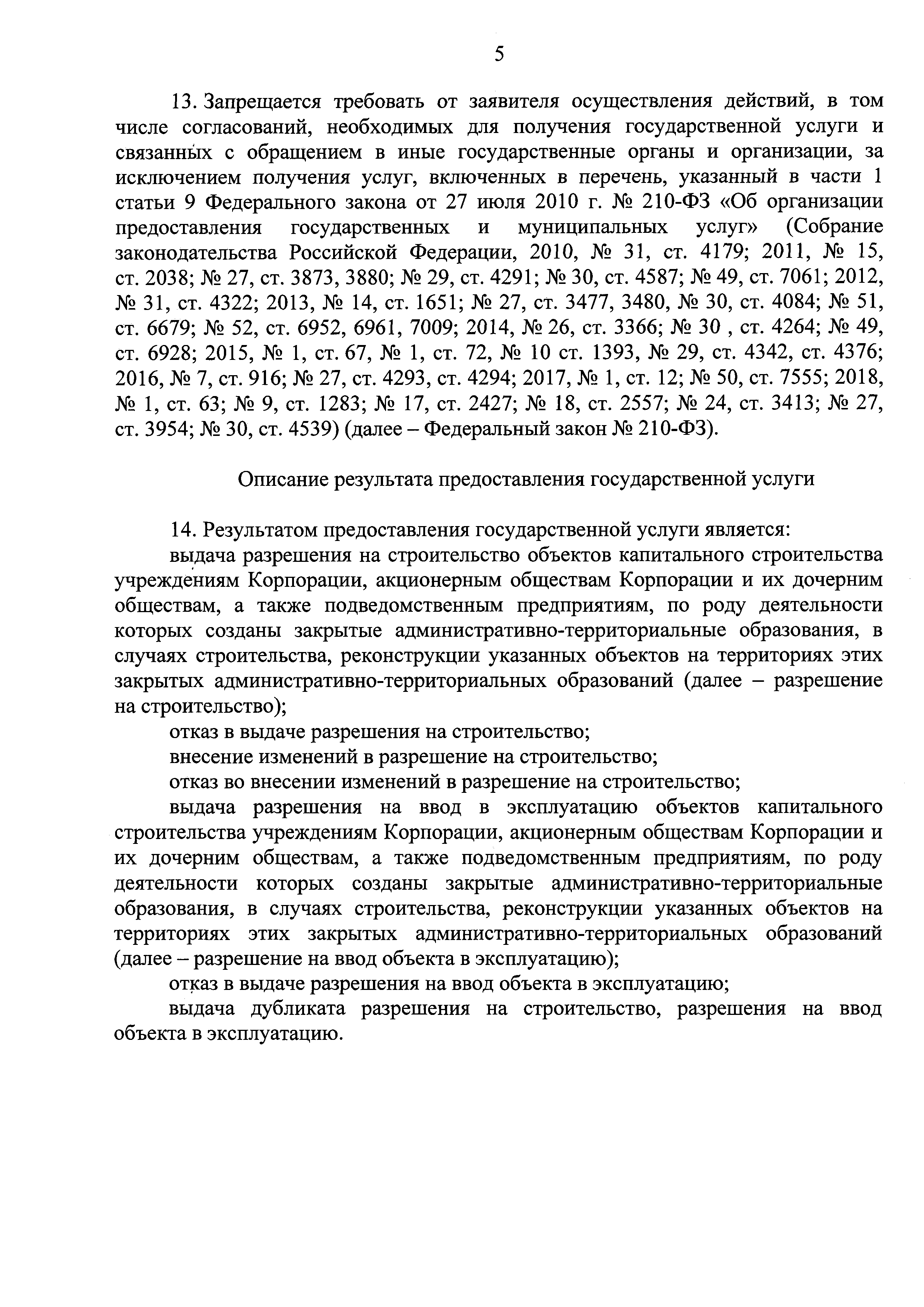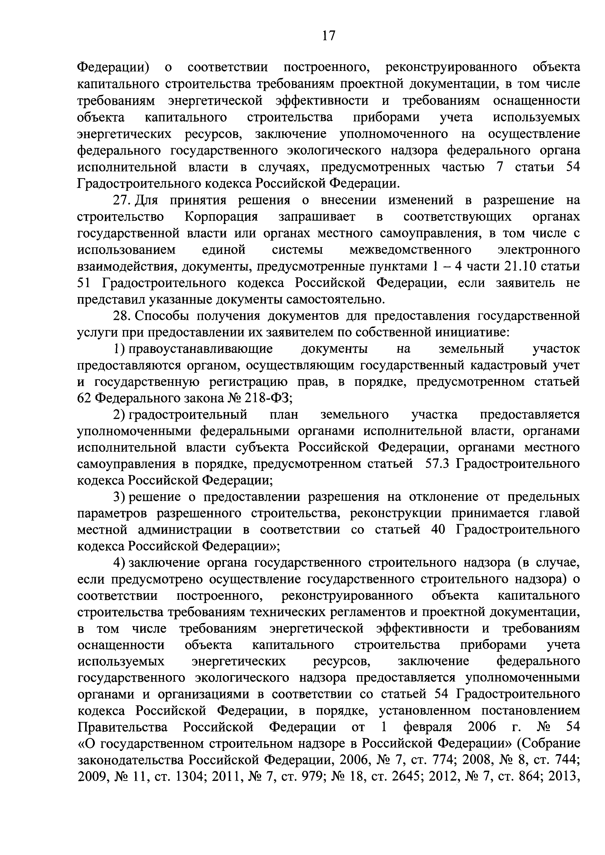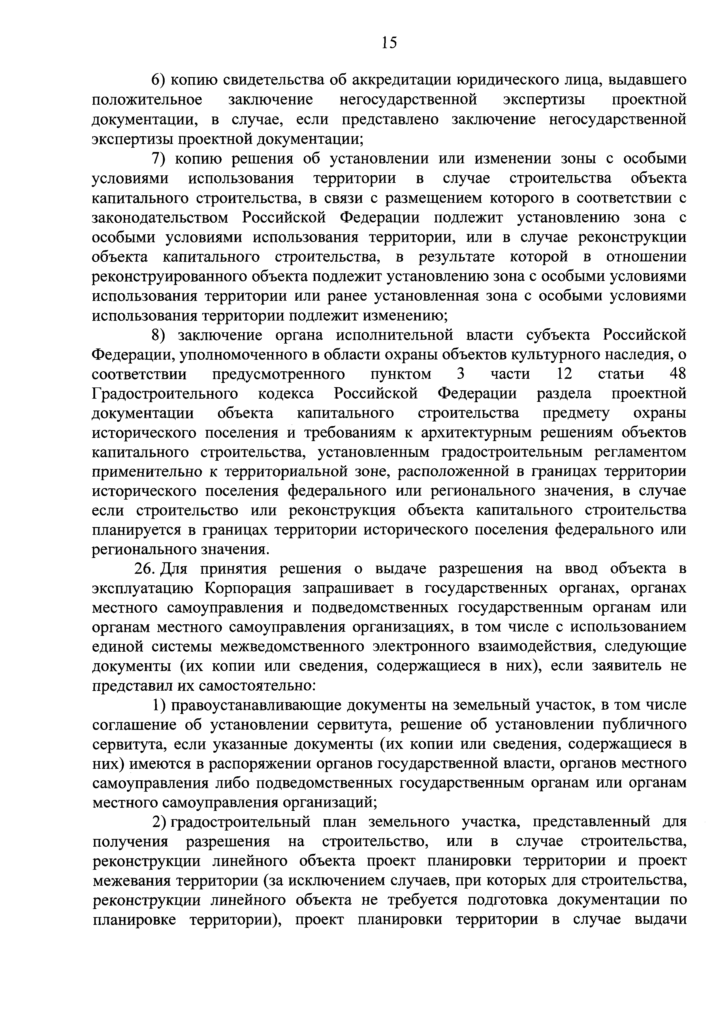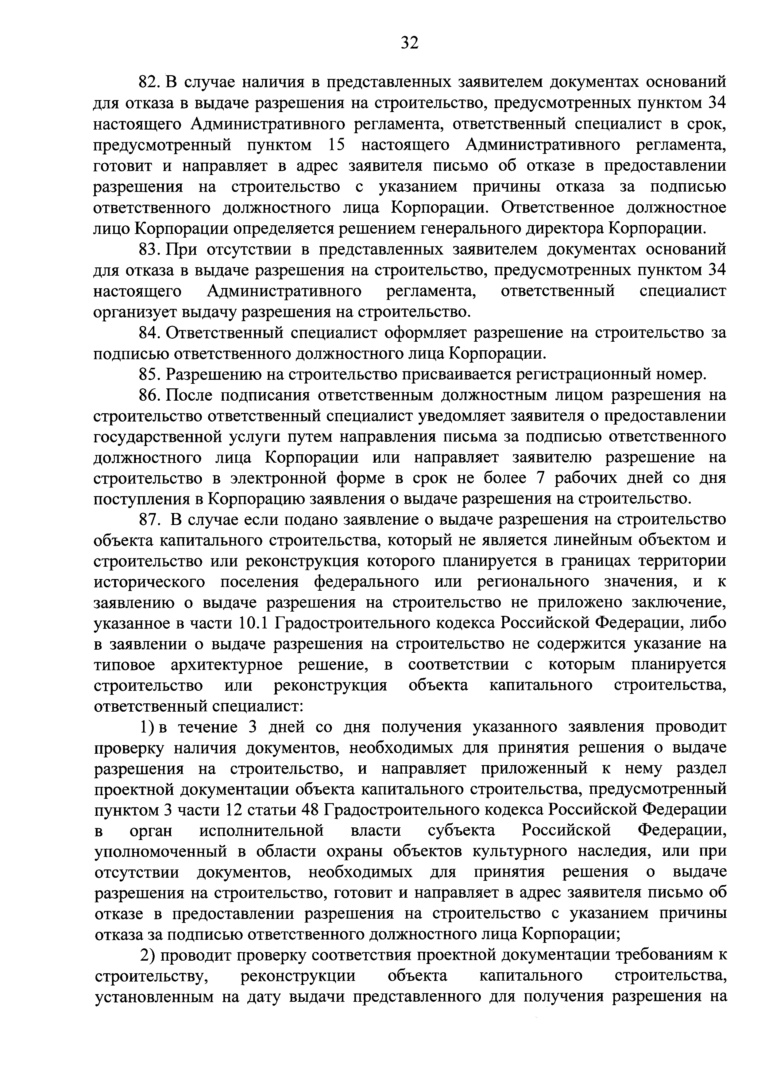 | Оглавление: | I. Общие положения II. Стандарт предоставления государственной услуги III. Состав, последовательность и сроки выполнения административных процедур (действий), требования к порядку их выполнения, в том числе особенности выполнения административных процедур (действий) в электронной форме IV. Формы контроля за предоставлением государственной услуги V. Досудебный (внесудебный) порядок обжалования решений и действий (бездействия) корпорации и должностных лиц корпорации, предоставляющих государственную услугу Приложение № 1. Заявление о выдаче разрешения на строительство Приложение № 2. Заявление о внесении изменений в разрешение на строительство Приложение № 3. Заявление о внесении изменения в разрешение на строительство в связи с необходимостью продления срока действия разрешения на строительство Приложение № 4. Заявление о выдаче разрешения на ввод объекта в эксплуатацию Приложение № 5. Заявление о выдаче дубликата разрешения на строительство, разрешения на ввод объекта в эксплуатацию Приложение № 6. Заявление об исправлении опечаток и ошибок в разрешении на строительство, разрешении на ввод объекта в эксплуатацию |