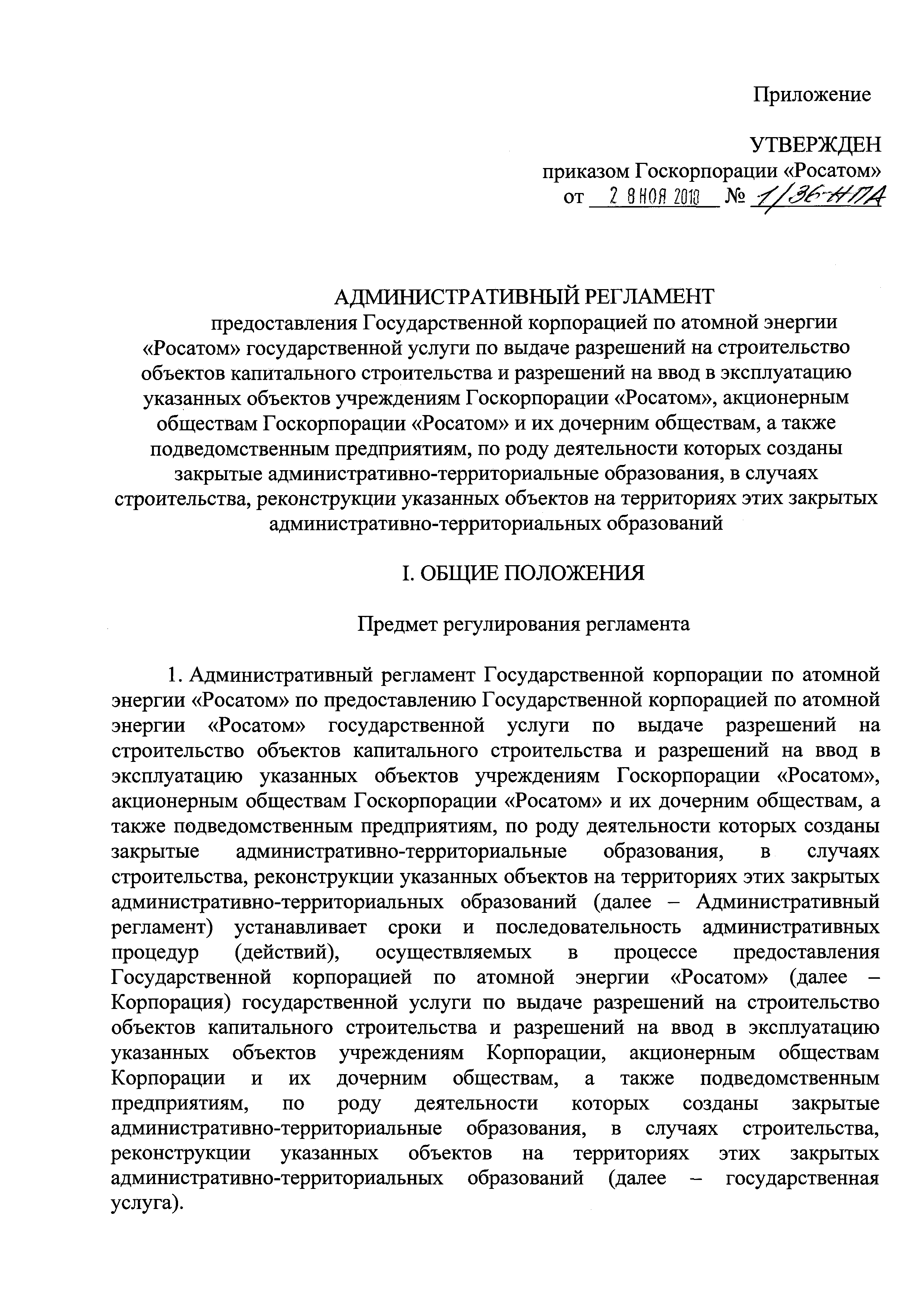 | Область применения: | Административный регламент Государственной корпорации по атомной энергии "Росатом" по предоставлению Государственной корпорацией по атомной энергии "Росатом" государственной услуги по выдаче разрешений на строительство объектов капитального строительства и разрешений на ввод в эксплуатацию указанных объектов учреждениям Госкорпорации "Росатом", акционерным обществам Госкорпорации "Росатом" и их дочерним обществам, а также подведомственным предприятиям, по роду деятельности которых созданы закрытые административно-территориальные образования, в случаях строительства, реконструкции указанных объектов на территориях этих закрытых административно-территориальных образований устанавливает сроки и последовательность административных процедур (действий), осуществляемых в процессе предоставления Государственной корпорацией по атомной энергии "Росатом" государственной услуги по выдаче разрешений на строительство объектов капитального строительства и разрешений на ввод в эксплуатацию указанных объектов учреждениям Корпорации, акционерным обществам Корпорации и их дочерним обществам, а также подведомственным предприятиям, по роду деятельности которых созданы закрытые административно-территориальные образования, в случаях строительства, реконструкции указанных объектов на территориях этих закрытых административно-территориальных образований |