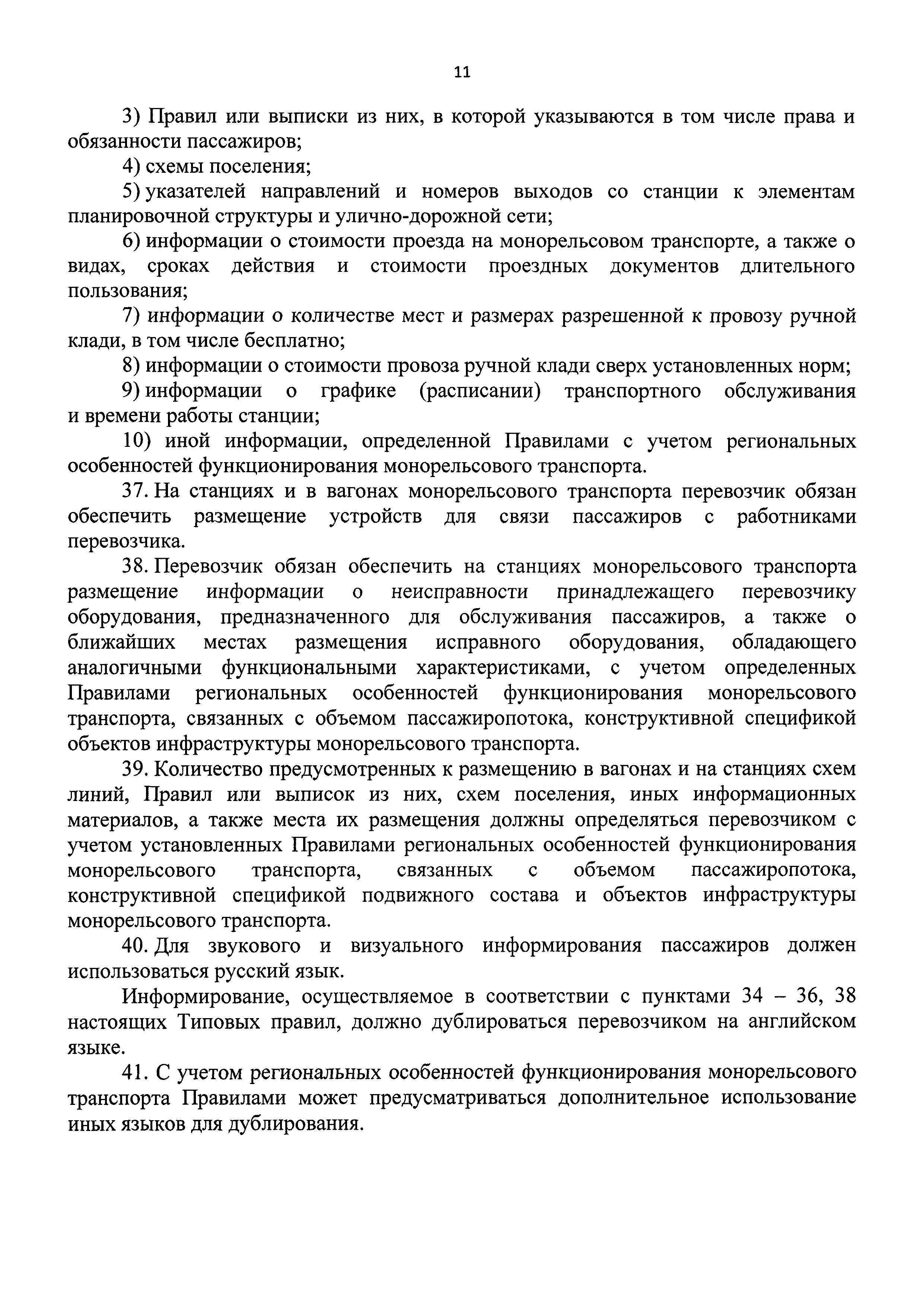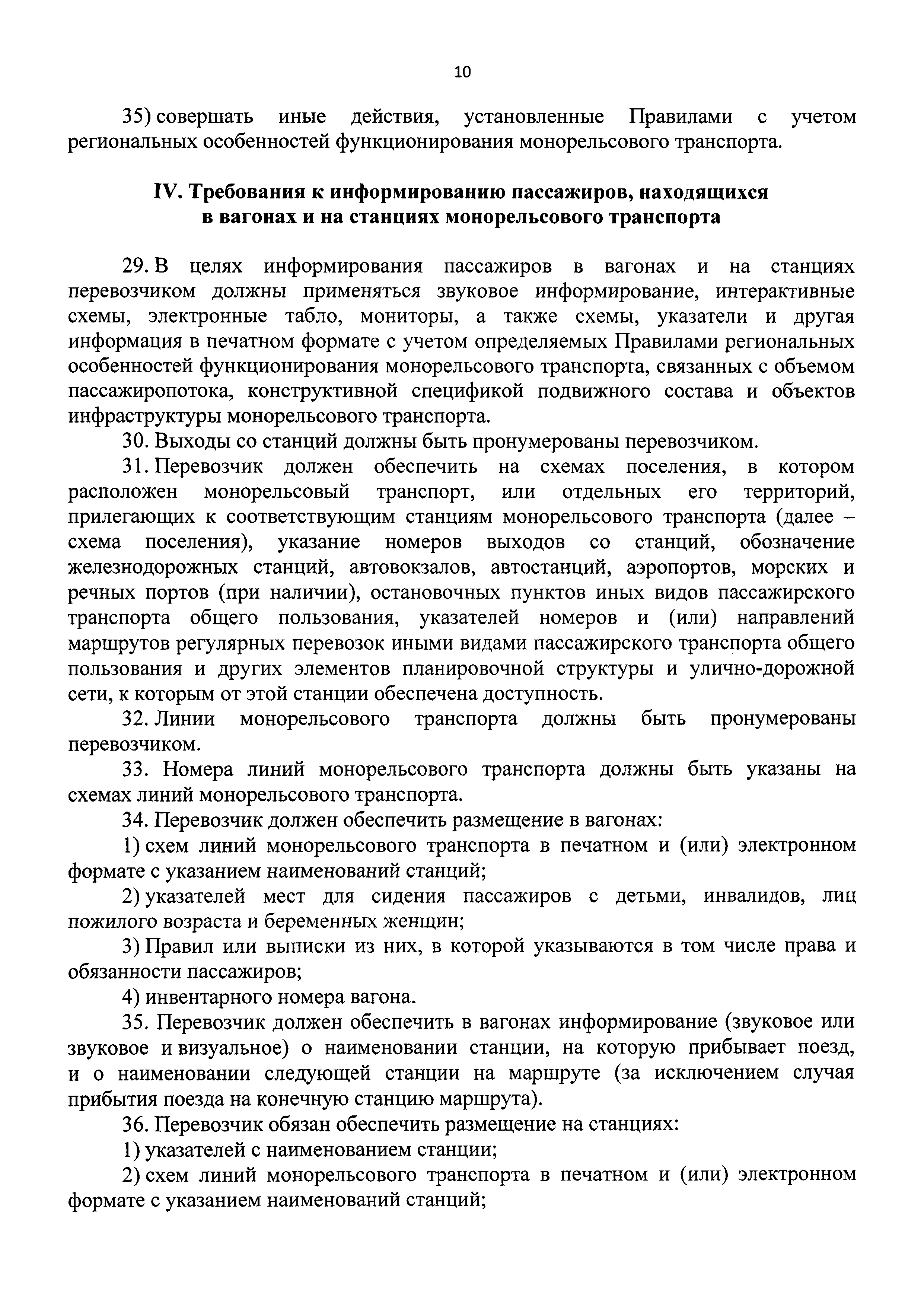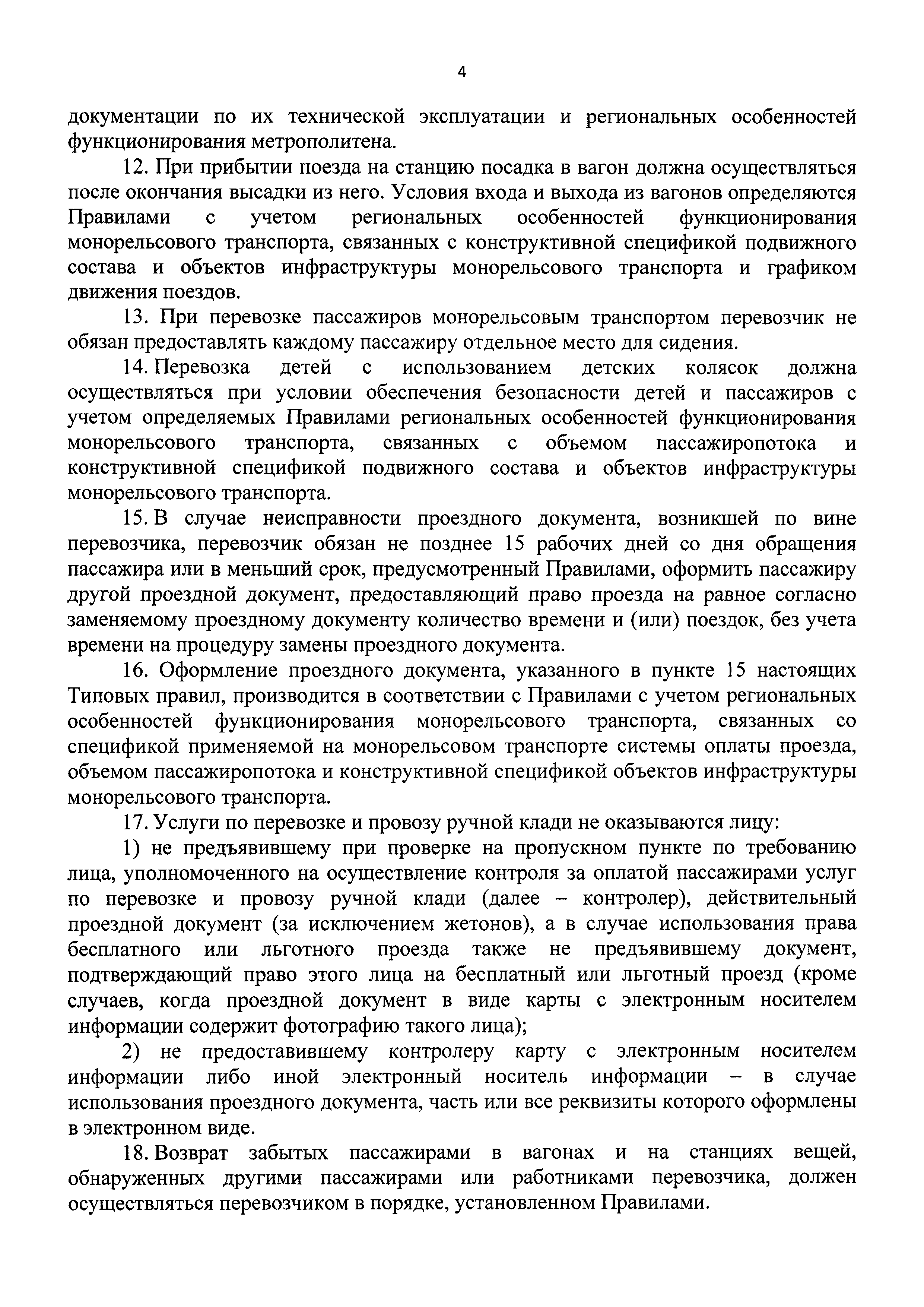 | Оглавление: | I. Общие положения II. Порядок организации перевозок пассажиров и провоза ручной клади монорельсовым транспортом III. Условия перевозок пассажиров и провоза ручной клади монорельсовым транспортом IV. Требования к информированию пассажиров, находящихся в вагонах и на станциях монорельсового транспорта |