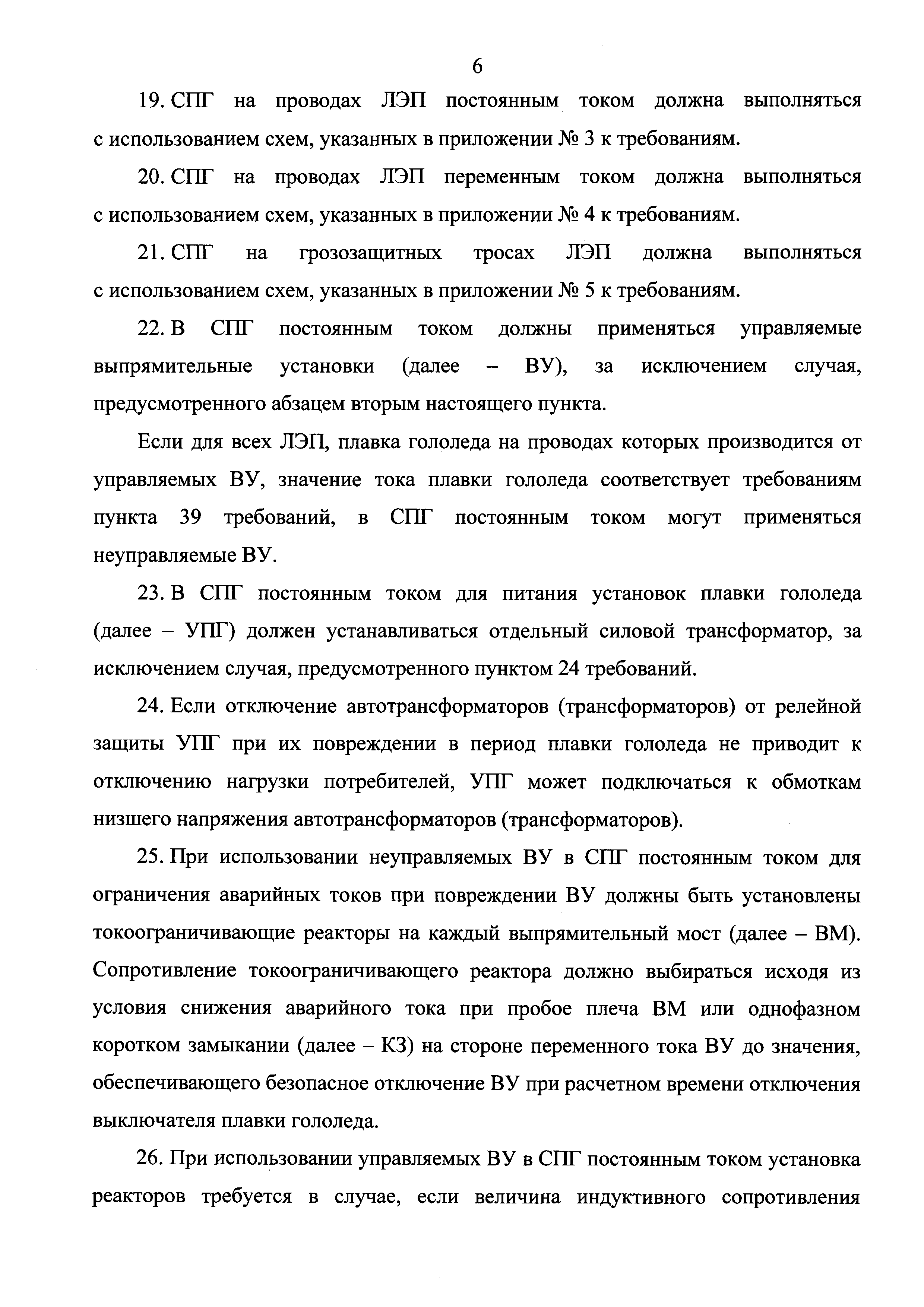 | Оглавление: | I. Общие положения II. Условия организации плавки гололеда на проводах и грозозащитных тросах ЛЭП III. Требования к определению СПГ и методов плавки гололеда IV. Требования к релейной защите СПГ V. Проведение расчетов параметров режима плавки гололеда VI. Требования к разработке инструкций и ППГ VII. Подготовка и проведение плавки гололеда Приложение № 1. Термины и определения, используемые в требованиях по плавке гололеда на проводах и грозозащитных тросах линий электропередачи Приложение № 2. Нормативная толщина стенки гололеда для различных гололедных районов Приложение № 3. Схемы плавки гололеда на проводах линий электропередачи постоянным током Приложение № 4. Схемы плавки гололеда на проводах линий электропередачи переменным током Приложение № 5. Схемы плавки гололеда на грозозащитных тросах линий электропередачи переменным и постоянным током Приложение № 6. Коэффициенты, учитывающие изменение толщины стенки гололеда в зависимости от высоты расположения приведенного центра тяжести провода (грозозащитного троса) над поверхностью земли и от диаметра провода (грозозащитного троса) |