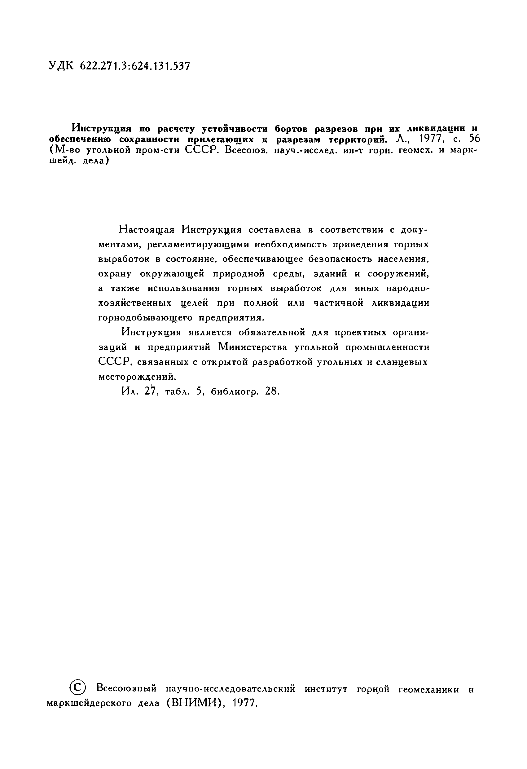 | Название рус.: | Инструкция по расчету устойчивости бортов разрезов при их ликвидации и обеспечению сохранности прилегающих к разрезам территорий |