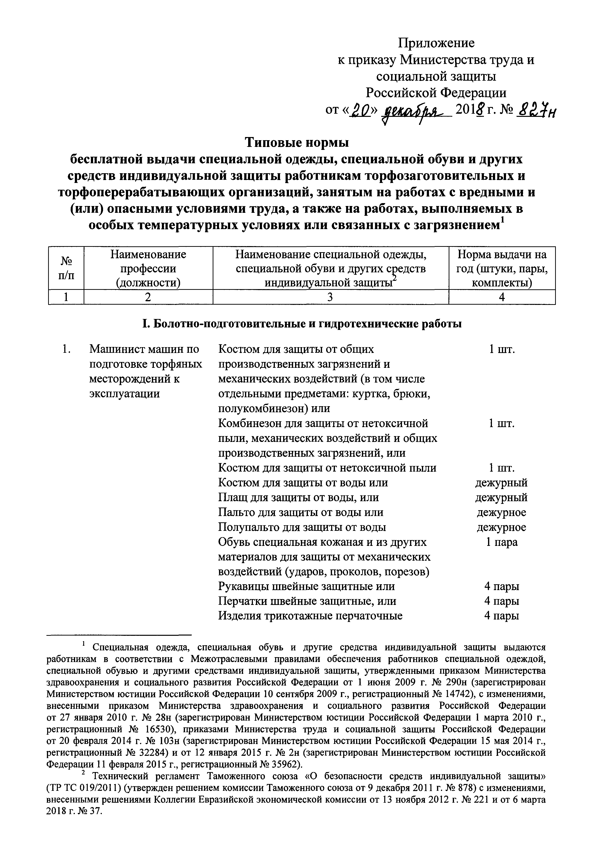 Типовые нормы бесплатной выдачи специальной одежды, специальной обуви и других средств индивидуальной защиты работникам торфозаготовительных и торфоперерабатывающих организаций, занятым на работах с вредными и (или) опасными условиями труда, а также на работах, выполняемых в особых температурных условиях или связанных с загрязнением| Статус: | действует | | Название рус.: | Типовые нормы бесплатной выдачи специальной одежды, специальной обуви и других средств индивидуальной защиты работникам торфозаготовительных и торфоперерабатывающих организаций, занятым на работах с вредными и (или) опасными условиями труда, а также на работах, выполняемых в особых температурных условиях или связанных с загрязнением | | Дата добавления в базу: | 01.02.2020 | | Дата актуализации: | 01.01.2021 | | Дата введения: | 21.03.2019 | | Утверждён: | 20.12.2018 Министерство труда и социальной защиты РФ (827н)