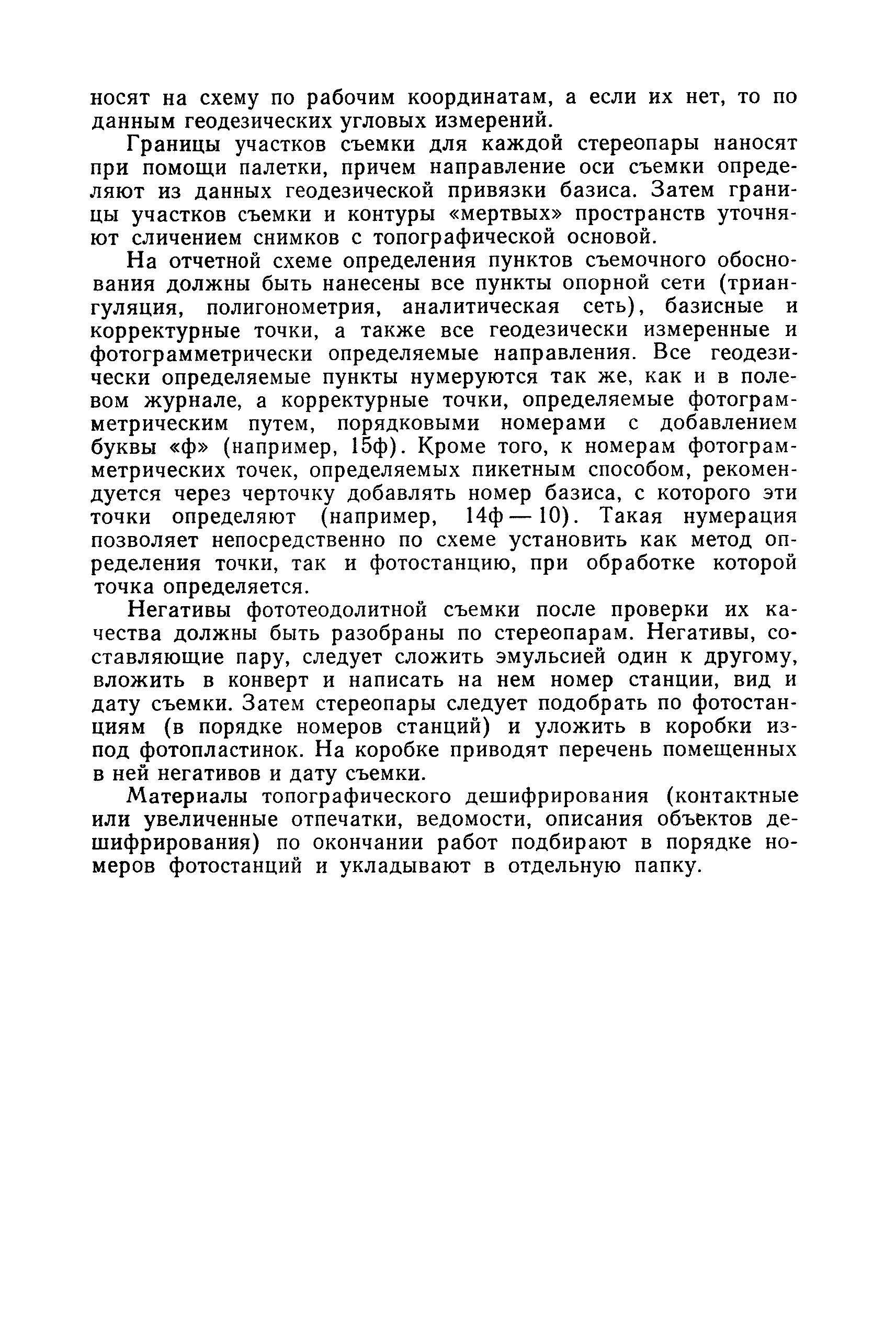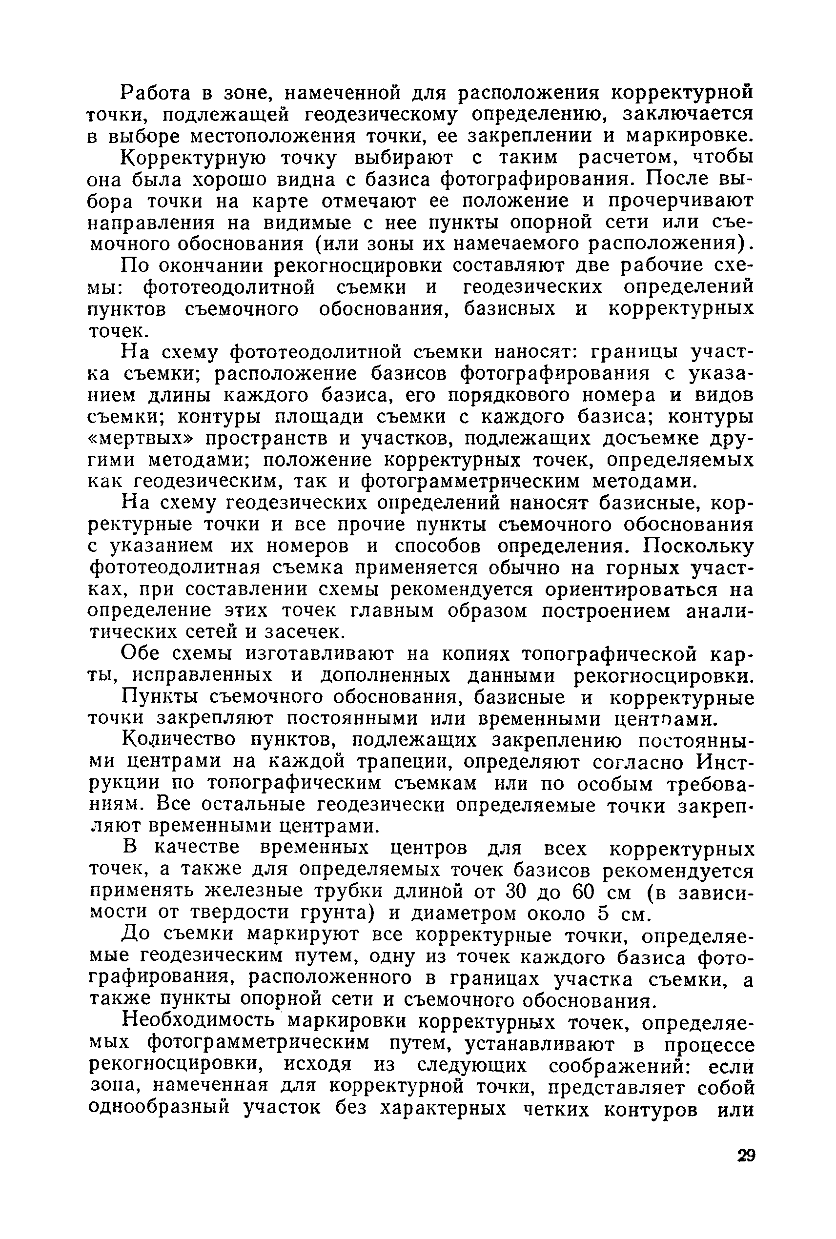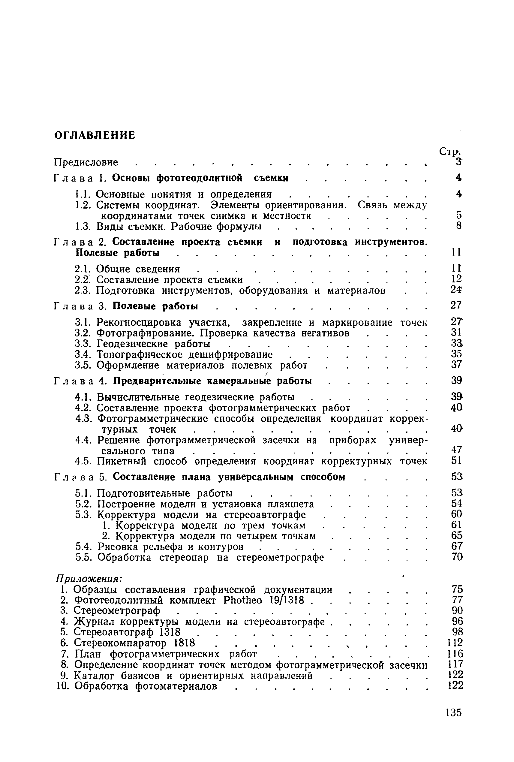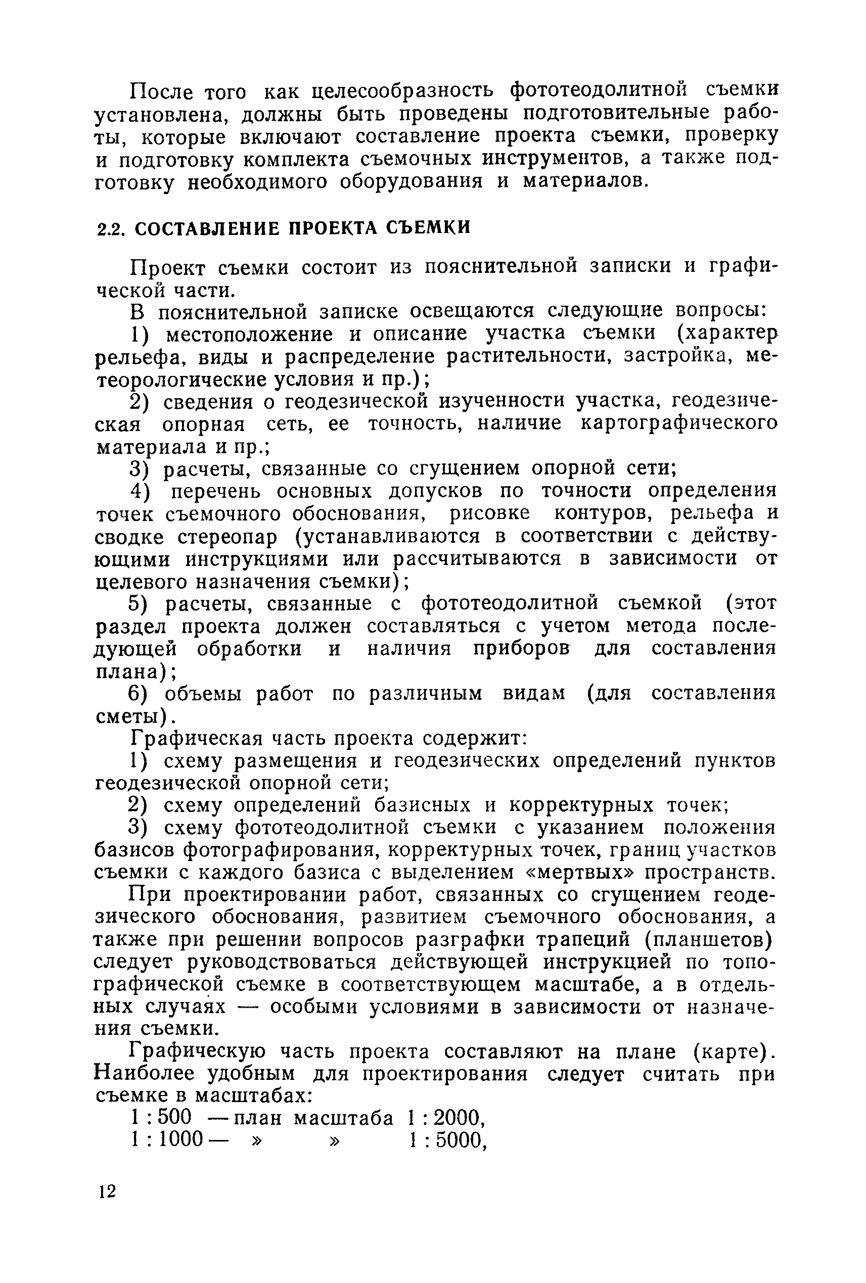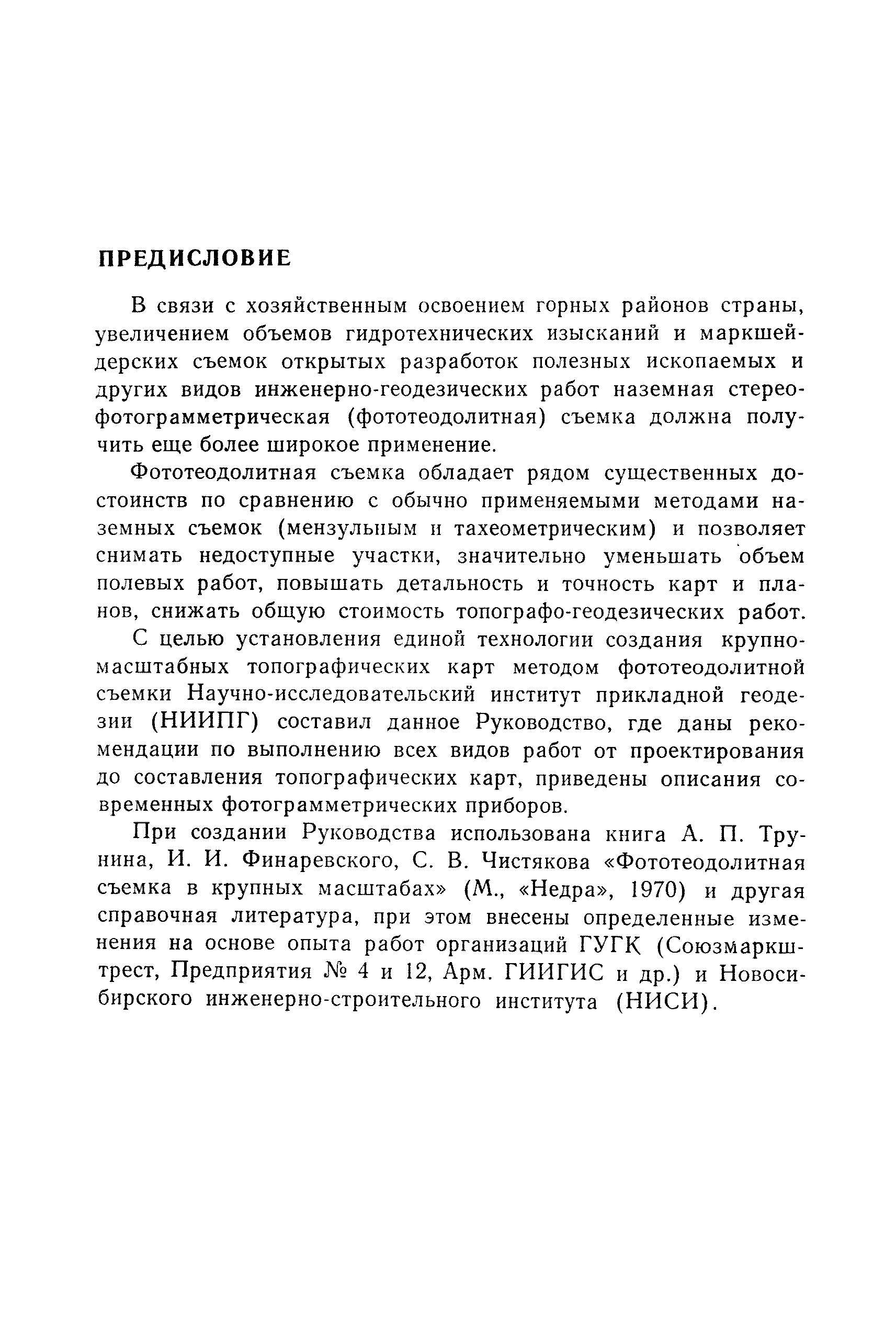 Руководство по топографическим съемкам в масштабах 1:5000, 1:2000, 1:1000, 1:500. Фототеодолитная съемка| Статус: | справочные материалы, мп, тпр | | Название рус.: | Руководство по топографическим съемкам в масштабах 1:5000, 1:2000, 1:1000, 1:500. Фототеодолитная съемка | | Дата добавления в базу: | 01.02.2020 | | Дата актуализации: | 01.01.2021 | | Область применения: | Руководство предназначено для предприятий и организаций всех ведомств, занимающихся топографической съемкой. | | Оглавление: | Глава 1. Основы фототеодолитной съемки 1.1. Основные понятия и определения 1.2. Системы координат. Элементы ориентирования. Связь между координатами точек снимка и местности 1.3. Виды съемки. Рабочие формулы Глава 2. Составление проекта съемки и подготовка инструментов. Полевые работы 2.1. Общие сведения 2.2. Составление проекта съемки 2.3. Подготовка инструментов, оборудования и материалов Глава 3. Полевые работы 3.1. Рекогносцировка участка, закрепление и маркирование точек 3.2. Фотографирование. Проверка качества негативов 3.3. Геодезические работы 3.4. Топографическое дешифрирование 3.5. Оформление материалов полевых работ Глава 4. Предварительные камеральные работы 4.1. Вычислительные геодезические работы 4.2. Составление проекта фотограмметрических работ 4.3. Фотограмметрические способы определения координат корректурных точек 4.4. Решение фотограмметрической засечки на приборах универсального типа 4.5. Пикетный способ определения координат корректурных точек Глава 5. Составление плана универсальным способом 5.1. Подготовительные работы 5.2. Построение модели и установка планшета 5.3. Корректура модели на стереоавтографе 5.4. Рисовка рельефа и контуров 5.5. Обработка стереопар на стереометрографе Приложение 1. Образцы составления графической документации Приложение 2. Фототеодолитный комплект Photheo 19/1318 Приложение 3. Стереометрограф Приложение 4. Журнал корректуры модели на стереоавтографе Приложение 5. Стереоавтограф 1318 Приложение 6. Стереокомпаратор 1818 Приложение 7. План фотограмметрических работ Приложение 8. Определение координат точек методом фотограмметрической засечки Приложение 9. Каталог базисов и ориентирных направлений Приложение 10. Обработка фотоматериалов | | Разработан: | НИИПГ