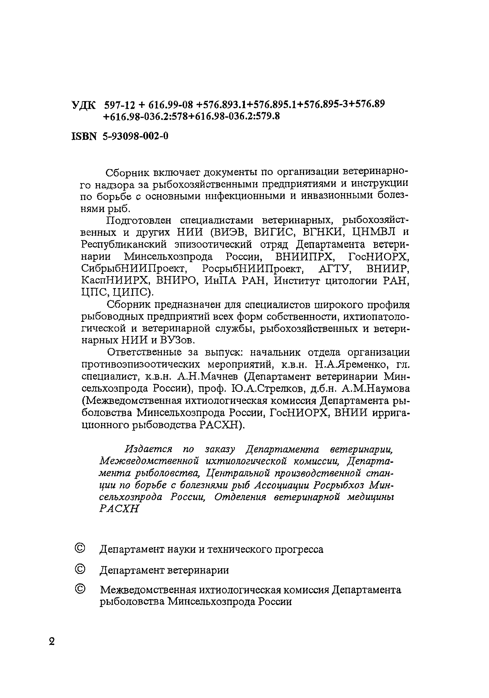 | Разработан: | ВИГИС ВИЭВ ВНИРО ВНИИПРХ ГОСНИОРХ ВНИИР ВГНКИ ЦНМВЛ Республиканский эпизоотический отряд департамента ветеринарии Минсельхозпрода России СибрыбНИИПроект РосрыбНИИПроект АГТУ КаспНИИРХ ИнПА РАН Институт цитологии РАН ЦПС ЦИПС