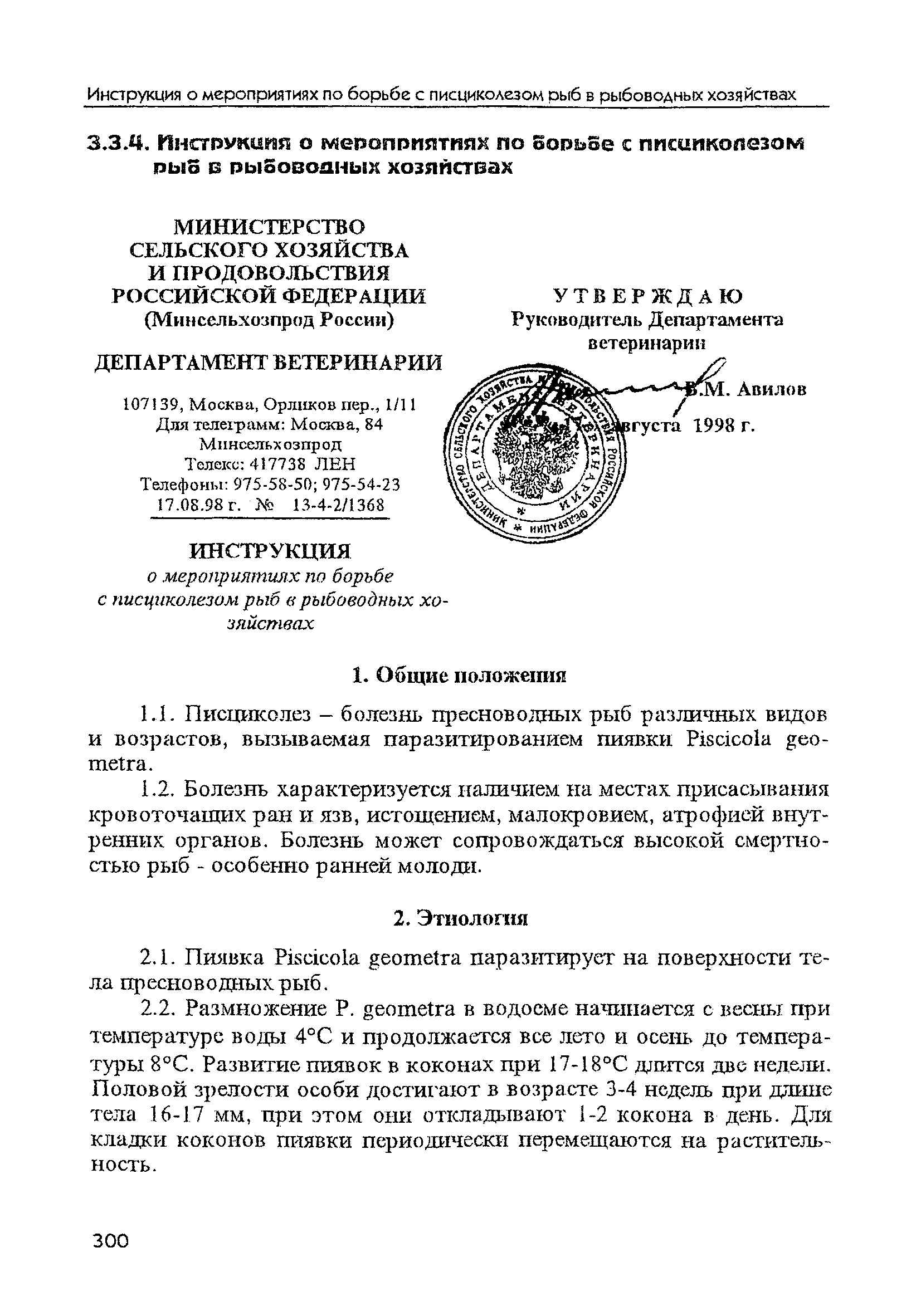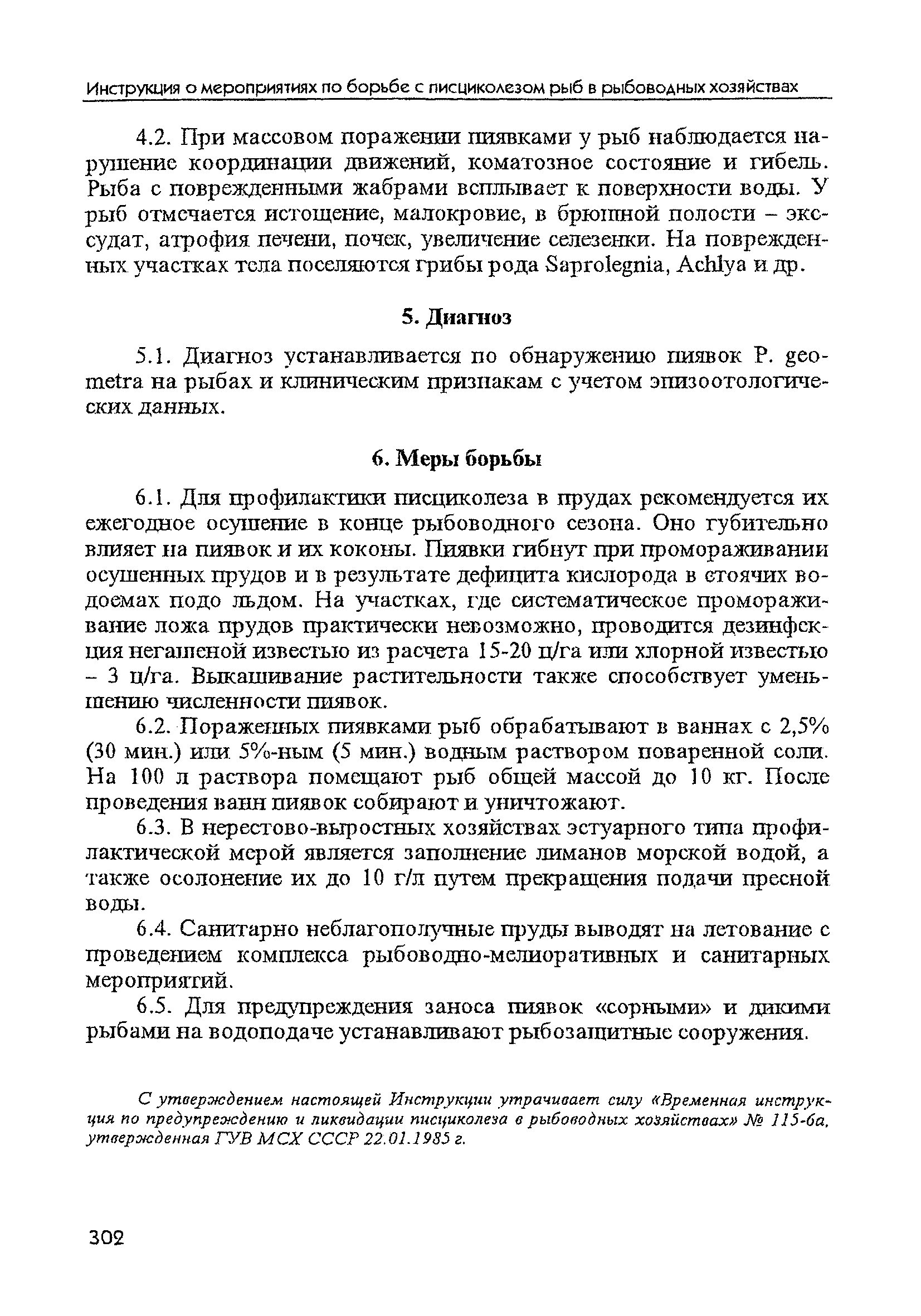 | Заменяет собой: | - «Временная инструкция по предупреждению и ликвидации писциколеза в рыбоводных хозяйствах»